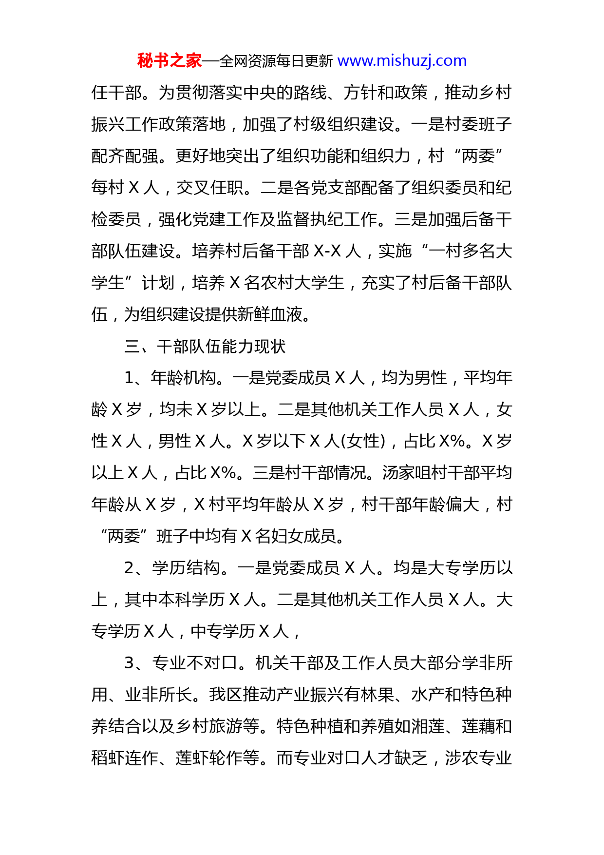 秘书之家—全网资源每日更新www.mishuzj.com开发区干部队伍推进乡村振兴能力提升情况汇报X开发区按照X市委、市政府关于《X市国民经济和社会发展第十四个五年计划规划纲要》要求,我区X被列为乡村振兴示范区之一,经济发展由脱贫攻坚重点转向乡村振兴工作,重点抓好组织振兴、人才振兴、产业振兴、生态振兴,以X市X高质量发展区域和产业布局战略为引领,带领广大党员干部群众,众志成城,迎难而上,推进农村经济社会高质量发展。一、X开发区基本情况X生态农业开发区,下辖两个行政村、三个国有渔场,版土面积X平方公里,人口X余人。X年被X评为X,X年被X市命名为X,X年被X评为X。下辖X村X年被X推荐为全国“美丽乡村”创建单位。X年被省政府评定为“省级旅游名村”。X年被评为“X省宜居村庄”“X市级绿色示范村”等称号。X年被评为“国家森林乡村”。X年X月,被评为“X市抗击新冠肺炎疫情先进集体”。二、组织及干部队伍建设现状X开发区党委下设X个党支部(机关党支部、二个村党支部、三个渔场党支部),党员总人数X人,开发区机关工作人员共X人,党委成员X名(一正三副),其他X人为聘秘书之家—全网资源每日更新www.mishuzj.com任干部。为贯彻落实中央的路线、方针和政策,推动乡村振兴工作政策落地,加强了村级组织建设。一是村委班子配齐配强。更好地突出了组织功能和组织力,村“两委”每村X人,交叉任职。二是各党支部配备了组织委员和纪检委员,强化党建工作及监督执纪工作。三是加强后备干部队伍建设。培养村后备干部X-X人,实施“一村多名大学生”计划,培养X名农村大学生,充实了村后备干部队伍,为组织建设提供新鲜血液。三、干部队伍能力现状1、年龄机构。一是党委成员X人,均为男性,平均年龄X岁,均未X岁以上。二是其他机关工作人员X人,女性X人,男性X人。X岁以下X人(女性),占比X%。X岁以上X人,占比X%。三是村干部情况。汤家咀村干部平均年龄从X岁,X村平均年龄从X岁,村干部年龄偏大,村“两委”班子中均有X名妇女成员。2、学历结构。一是党委成员X人。均是大专学历以上,其中本科学历X人。二是其他机关工作人员X人。大专学历X人,中专学历X人,3、专业不对口。机关干部及工作人员大部分学非所用、业非所长。我区推动产业振兴有林果、水产和特色种养结合以及乡村旅游等。特色种植和养殖如湘莲、莲藕和稻虾连作、莲虾轮作等。而专业对口人才缺乏,涉农专业秘书之家—全网资源每日更新www.mishuzj.com人才较少,大部分干部相应的农业专业知识水平不高。四、干部队伍需求情况1、机制体制不顺畅。根据X文件精神,我区为X市政府派出机构,应设立内设机构X个,核定全额拨款事业编制X名。目前,机关工作人员共X人,全额拨款事业编制仅X名(党委成员),其他X人均为聘用人员。2、理顺机构机制。X电力光伏发电等项目落地以及美丽乡村建设的需要,当前需借助X电力参与乡村振兴项目平台,拟将我区更名为“X乡村振兴示范区管委会”,从体制上健全乡村振兴服务机构,与X电力指挥部联合办公,确保行政管理、经济管理以及公务员专业化管理等跟上经济社会发展的步伐。3、设立内设机构。根据X文件精神,我区应设立内设机构X个,即组织人事部、财务审计部、规划开发部、市场销售部和办公室。拟将原定编X人扩大到X人,以解决机关工作力量与业务力量不足问题。4、强化选人用人标准。坚持正确的选人用人导向,不断完善工作机制,坚持民主公开、公平公正、竞争择优的原则,我区今年面向社会招聘专业人才X人,主要涉及农业、林业、生产、土木工程以及财务等,将政治素质好、专业能力强的人才引进了,解决农业技术人才短缺问题。五、干部队伍培训情况秘书之家—全网资源每日更新www.mishuzj.com1、依托网络平台培训。按照市委组织部及党校培训安排,深入开展党史学习教育,推进脱贫攻坚与乡村振兴有效衔接,开展提升村“两委”干部、后备干部、“第一书记”及驻村工作队员政策水平和业务能力,多次举办党建引领乡村振兴专题培训班学习。2、依托支部主题党日学习平台。持续深化党支部主题党日学习活动,抓好党员教育管理,规范党员行为规范,通过主题党日、志愿者服务、群团组织活动等增强服务意识,努力打造学习型、服务型党支部。3、依托党委中心组理论学习平台。村场支部书记及主职干部列席开发区党委扩大会,党委会议前落实“首个议题”制度,认真学习习近平总书记的最新讲话精神及法律法规等,接受理想信念教育、法治教育、党规党纪和廉政教育,引导干部树立正确的世界观、人生观、价值观。六、关于提升基层公务员能力素质的建议1、把好政治关。严明党的政治纪律政治规矩,把讲政治要求贯穿全面从严治党过程中。深入开展对党忠诚教育,开展党章党纪党规知识学习。党员干部要在严守政治纪律和政治规矩上作表率,严格执行重大事项请示报告制度,始终在政治立场、政治方向、政治原则、政治道路上同以习近平同志为核心的党中央保持高度一致。2、把好能力关。领导干部作为党的各项路线、方针、秘书之家—全网资源每日更新www.mishuzj.com政策在农村的贯彻者和实施者,干部要成为在农村实施乡村振兴的中坚力量。开发区党委努力把乡村振兴一线干部培养成为政策上的明白人、工作上的专业人、事业上