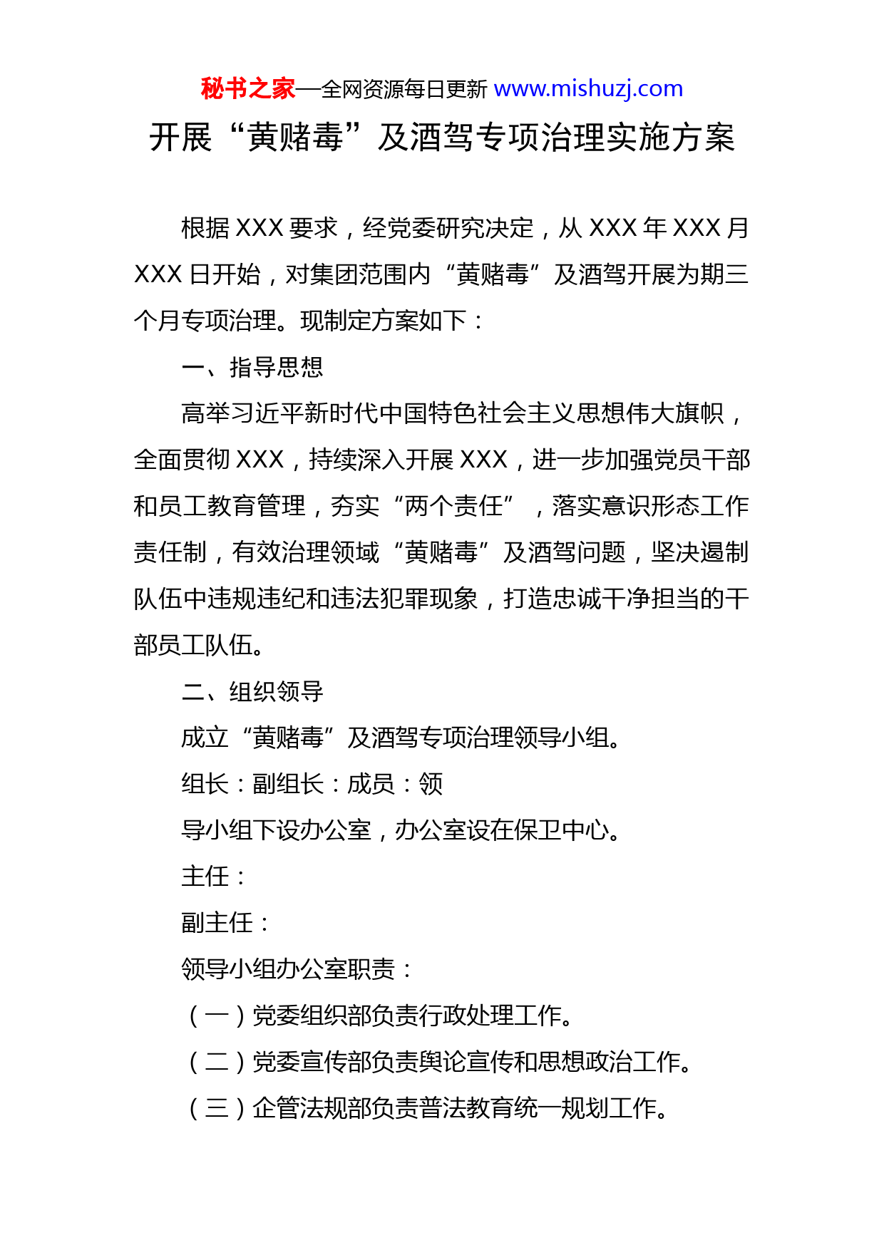 秘书之家—全网资源每日更新www.mishuzj.com开展“黄赌毒”及酒驾专项治理实施方案根据XXX要求,经党委研究决定,从XXX年XXX月XXX日开始,对集团范围内“黄赌毒”及酒驾开展为期三个月专项治理。现制定方案如下:一、指导思想高举习近平新时代中国特色社会主义思想伟大旗帜,全面贯彻XXX,持续深入开展XXX,进一步加强党员干部和员工教育管理,夯实“两个责任”,落实意识形态工作责任制,有效治理领域“黄赌毒”及酒驾问题,坚决遏制队伍中违规违纪和违法犯罪现象,打造忠诚干净担当的干部员工队伍。二、组织领导成立“黄赌毒”及酒驾专项治理领导小组。组长:副组长:成员:领导小组下设办公室,办公室设在保卫中心。主任:副主任:领导小组办公室职责:(一)党委组织部负责行政处理工作。(二)党委宣传部负责舆论宣传和思想政治工作。(三)企管法规部负责普法教育统一规划工作。秘书之家—全网资源每日更新www.mishuzj.com(四)安全环保部负责驾驶员的监督教育管理工作。(五)纪委办公室负责党纪处理和追责问责工作。(六)群团工作部负责教育引导工作。(七)保卫工作部负责牵头组织、协调推进、督导反馈工作。(八)各二级单位负责组织推进、自查整改、教育管理工作。三、工作安排专项治理按三个阶段推进:(一)调查摸底阶段(XXX月XXX日至XXX月XXX日)1.启动部署。各单位要认真落实专项治理有关要求,召开党委会,层层传达部署,认真研究制定符合本单位实际的具体实施方案,迅速启动专项治理工作。党委书记作为第一责任人负总责、把总关,主要领导要靠前指挥、抓好推进,分管领导、相关部门要各司其职、全力配合,切实履行好工作职责。2.自查自纠。要自查是否建立健全宣传教育、帮教转化、监督管理、考核评价工作机制,自查涉事员工是否依据党纪条规和规章制度做出处理,要剖析原因,掌握规律动态,制定整改措施,尽快补齐弱项短板,进一步深化落实“两个责任”。秘书之家—全网资源每日更新www.mishuzj.com(二)集中教育阶段(XXX月XXX日至XXX月XXX日)1.突出思想政治工作。各级党组织要切实抓好员工队伍教育管理,做好员工群众的思想教育引领工作,引导广大员工认清“黄赌毒”及酒驾对个人、对家庭、对企业、对社会的危害,倡导珍爱生命、珍惜岗位、感恩组织,坚决不做与集团标杆形象不相称的事情。要延伸管理触角,关注员工八小时以外,把管学习、管工作、管生活统一起来。2.全面加强法治教育。要落实公司“谁管理谁普法”责任制,构建企管法规统一规划、业务部门专业负责、所属单位主体承担的分级责任体系,明确各系统、各部门、各单位责任清单,把普法工作落实到位。要面向全员、全方位开展法律知识普及,分层次、多渠道开展普法活动,充分运用正反两方面教材,教育广大员工遵纪守法。3.强化重点教育管理。全面检视重点要害岗位的员工管理情况,凡涉及“黄赌毒”及酒驾人员,在做出相应处理的同时,对原有岗位做出相应调整。要持续跟踪“黄赌毒”及酒驾人员的帮教工作,落实包保责任和教育措施,坚决杜绝同类事件再度发生。(三)总结提升阶段(XXX月XXX日至XXX月XXX日)秘书之家—全网资源每日更新www.mishuzj.com1.制定整改措施。汇总整理各单位“黄赌毒”及酒驾问题,一一制定措施,推进问题整改,持续验证检验,确保相关问题整改到位。2.完善规章制度。相关部门、各单位要认真梳理现行制度存在的管理漏洞,补足短板,规范执行,确保制度发挥作用。各级党委要完善“黄赌毒”及酒驾问题管理制度,纪检部门要完善落实“两个责任”工作制度,宣传部门要完善意识形态工作责任制度,安全管理部门要完善驾驶员日常管理制度,进一步增强管理效能,做到用制度管人管事。3.建立长效机制。由业务主管部门研究探索消除“黄赌毒”及酒驾问题的长效机制,纳入企业生产经营绩效考核范畴,严考核、硬兑现,形成强力管控约束。4.做好系统总结。各单位要认真总结本单位专项治理工作情况、存在问题、整改措施、制度建设等情况。期间,领导小组办公室将成立督导组,不定期抽查专项治理情况,对落实不到位、存在问题突出的单位将进行考核和追责。四、几点要求(一)抬高站位,增强认识。集团队伍建设,要表现出高度的组织纪律性和过硬执行力,表现在知法、懂法、守法、用法的自觉性。深入开展专项治理,是加强法治教秘书之家—全网资源每日更新www.mishuzj.com育的具体体现,是新形势下落实“两个责任”、强化队伍管理的重要举措。各级党组织务必增强责任感、使命感和紧迫感,高站位推动,高标准落实,在思想和行动与上级要求保持一致。(二)精心组织,加强领导。各级党组织务必担负起专项治理领导责任,突出实效性、针对性、操作性,牵头抓总、推进落实。要将专项治理纳入党建工作重要指标、纳入党委巡察工作内容、纳入领导班子年度考评,努力形成党政工团齐抓共管、密切配合、推进有力的工作格局。(三)明确职能,各负其责。各级党组织要严格开展自查自纠,切实摸清底数,切实查明原因,切实制定措施,绝不能一抓了之、一判了之、一罚了之。相关业务部门要立足职能,加强监管,有力保障专项治理向前推进。各级纪委部门要履行监督责任,对发现的违规违纪问题一律严查到底,追根溯源,消除病灶。(四)认真总结,如实报告。各单位要
