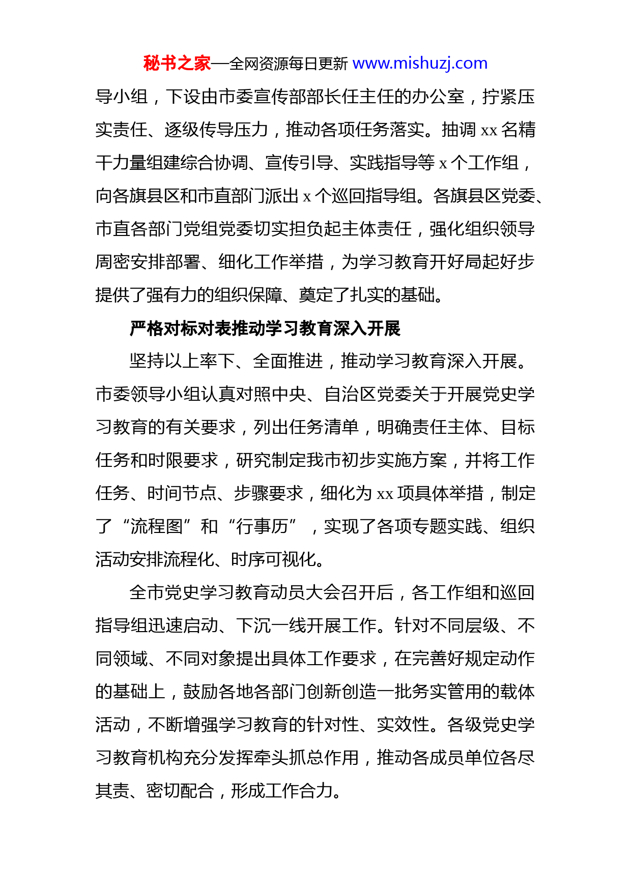 秘书之家—全网资源每日更新www.mishuzj.com开展党史学习教育工作汇报习近平总书记在党史学习教育动员大会上指出:“在庆祝我们党百年华诞的重大时刻,在‘两个一百年’奋斗目标历史交汇的关键节点,在全党集中开展党史学习教育正当其时、十分必要。”在新的历史条件下,党史部门和党史工作者要切实发挥好党史以史鉴今、资政育人的职能切实用党的伟大成就激励人,用党的优良传统教育人,用党的成功经验启迪人,用党的历史教训警示人。自中央决定开展党史学习教育以来,我市认真贯彻落实中央决策部署和自治区党委工作要求,从加强组织领导入手,注重调动全市党员干部的参与热情,重点提高党史学习教育质量,积极促进为群众办实事解难题的效果,大力推进党史学习教育迅速升温、全面铺开。提高政治站位强化责任担当市委将党史学习教育作为一项重大政治任务,及时召开市委常委会学习贯彻中央、自治区党委党史学习教育动员会议精神,研究安排工作任务。x月x日,市委召开党史学习教育动员会议,对全市党史学习教育进行全面系统动员部署。及时组建了由市委书记任组长、政府市长及市委有关领导任副组长、市直有关部门主要负责人为成员的领秘书之家—全网资源每日更新www.mishuzj.com导小组,下设由市委宣传部部长任主任的办公室,拧紧压实责任、逐级传导压力,推动各项任务落实。抽调xx名精干力量组建综合协调、宣传引导、实践指导等x个工作组,向各旗县区和市直部门派出x个巡回指导组。各旗县区党委、市直各部门党组党委切实担负起主体责任,强化组织领导周密安排部署、细化工作举措,为学习教育开好局起好步提供了强有力的组织保障、奠定了扎实的基础。严格对标对表推动学习教育深入开展坚持以上率下、全面推进,推动学习教育深入开展。市委领导小组认真对照中央、自治区党委关于开展党史学习教育的有关要求,列出任务清单,明确责任主体、目标任务和时限要求,研究制定我市初步实施方案,并将工作任务、时间节点、步骤要求,细化为xx项具体举措,制定了“流程图”和“行事历”,实现了各项专题实践、组织活动安排流程化、时序可视化。全市党史学习教育动员大会召开后,各工作组和巡回指导组迅速启动、下沉一线开展工作。针对不同层级、不同领域、不同对象提出具体工作要求,在完善好规定动作的基础上,鼓励各地各部门创新创造一批务实管用的载体活动,不断增强学习教育的针对性、实效性。各级党史学习教育机构充分发挥牵头抓总作用,推动各成员单位各尽其责、密切配合,形成工作合力。秘书之家—全网资源每日更新www.mishuzj.com科学统筹谋划确保各项工作落到实处为进一步扩大党史学习教育的广度深度,我市从高校、政策研究机构、各级党校精挑细选xx名政治素养高、政策理论功底扎实的专家教授讲师,组建专职市委党史学习教育宣讲团,加紧做好宣讲准备。充分兼顾党员干部自学和组织系统学,制定了党委(党组)理论学习中心组学习、读书班等计划方案。基层党组织结合“三会一课”和主题党日等,开展主题突出、特色鲜明、形式多样的学习活动确保党史学习教育全年不断线、持续往深走。在抓好党中央、自治区党委规定篇目学习的同时,针对领导干部和普通党员的不同特点和学习需求,列出学习推荐书目,不断激发党员干部的学习积极性和主动性。大力组织各级文艺文化工作者深入开展研究研讨、创作交流,力争推出一批优秀文艺作品。进一步强化正面宣传和舆论引导,积极引导干部群众正确认识、科学评价党史上的重大事件、重要人物、重要会议等,旗帜鲜明反对历史虚无主义,坚决抵制歪曲和丑化党的历史、宣扬狭隘民族主义等错误倾向和言行,树牢正确的历史观、民族观国家观、文化观。突出青少年群体、贴近青少年需求,制定了党史、新中国史、改革开放史、社会主义发展史宣传教育工作计划,引导他们听党话、感党恩、跟党走。以县处级以上干部为重点,将党史学习教育纳入党校秘书之家—全网资源每日更新www.mishuzj.com学习培训主体班次,发挥线上教育优势,开发制作一批易于传播的微党课、微网课,不断提升网络学习培训的引导力、影响力。用好革命遗址遗迹、党性教育基地等红色资源,将在清明节、“七一”、国庆节等重要时间节点,精心组织开展形式多样的爱党爱国爱社会主义教育活动,深化党员干部党史学习教育。坚持学习实践同步推进,把“我为群众办实事”实践活动贯穿学习教育全过程。近期我市将举办“我为群众办实事”暨全市“强党建、促振兴、惠三农”集中服务示范活动,立足各行业各单位实际,切实为群众办实事解难题把党的温暖送到人民群众心坎上。同时,让广大党员干部在实践中学、在为民服务中学,真正做到学有所思、学有所悟、学有所获,更加坚定理想信念,更好地把学习成果转化为干事创业的动力。下一步,我市将在自治区党委的领导下,紧紧依靠自治区党史学习教育巡回指导组的指导支持,牢牢把握党史学习教育目标方向,紧扣党史学习教育阶段要求、步骤安排、必学内容、规定动作,严把标准关、质量关,进一步加大统筹协调、指导督导力度,坚持不达标不放过、不见效不松手,切实把中央、自治区党委对党史学习教育的各项部署要求从严从实从细落到