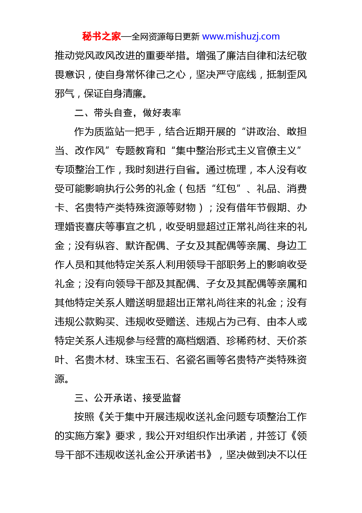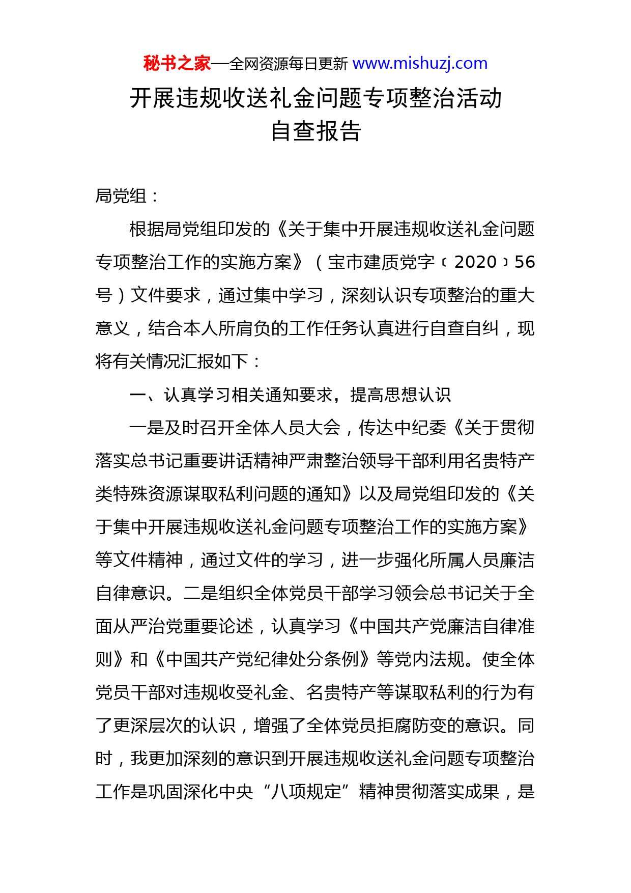 秘书之家—全网资源每日更新www.mishuzj.com开展违规收送礼金问题专项整治活动自查报告局党组:根据局党组印发的《关于集中开展违规收送礼金问题专项整治工作的实施方案》(宝市建质党字﹝202056﹞号)文件要求,通过集中学习,深刻认识专项整治的重大意义,结合本人所肩负的工作任务认真进行自查自纠,现将有关情况汇报如下:一、认真学习相关通知要求,提高思想认识一是及时召开全体人员大会,传达中纪委《关于贯彻落实总书记重要讲话精神严肃整治领导干部利用名贵特产类特殊资源谋取私利问题的通知》以及局党组印发的《关于集中开展违规收送礼金问题专项整治工作的实施方案》等文件精神,通过文件的学习,进一步强化所属人员廉洁自律意识。二是组织全体党员干部学习领会总书记关于全面从严治党重要论述,认真学习《中国共产党廉洁自律准则》和《中国共产党纪律处分条例》等党内法规。使全体党员干部对违规收受礼金、名贵特产等谋取私利的行为有了更深层次的认识,增强了全体党员拒腐防变的意识。同时,我更加深刻的意识到开展违规收送礼金问题专项整治工作是巩固深化中央“八项规定”精神贯彻落实成果,是秘书之家—全网资源每日更新www.mishuzj.com推动党风政风改进的重要举措。增强了廉洁自律和法纪敬畏意识,使自身常怀律己之心,坚决严守底线,抵制歪风邪气,保证自身清廉。二、带头自查,做好表率作为质监站一把手,结合近期开展的“讲政治、敢担当、改作风”专题教育和“集中整治形式主义官僚主义”专项整治工作,我时刻进行自省。通过梳理,本人没有收受可能影响执行公务的礼金(包括“红包”、礼品、消费卡、名贵特产类特殊资源等财物);没有借年节假期、办理婚丧喜庆等事宜之机,收受明显超过正常礼尚往来的礼金;没有纵容、默许配偶、子女及其配偶等亲属、身边工作人员和其他特定关系人利用领导干部职务上的影响收受礼金;没有向领导干部及其配偶、子女及其配偶等亲属和其他特定关系人赠送明显超出正常礼尚往来的礼金;没有违规公款购买、违规收受赠送、违规占为己有、由本人或特定关系人违规参与经营的高档烟酒、珍稀药材、天价茶叶、名贵木材、珠宝玉石、名瓷名画等名贵特产类特殊资源。三、公开承诺、接受监督按照《关于集中开展违规收送礼金问题专项整治工作的实施方案》要求,我公开对组织作出承诺,并签订《领导干部不违规收送礼金公开承诺书》,坚决做到决不以任秘书之家—全网资源每日更新www.mishuzj.com何理由、任何形式、任何渠道违规收受红包礼金等贵重物品谋取私利,自觉接受党组织和职工群众的监督;坚决做到率先垂范,从严自律,清清白白做人,干干净净做事,把一切违规收送礼金行为杜绝在高墙之外,营造风清气正的良好工作氛围。