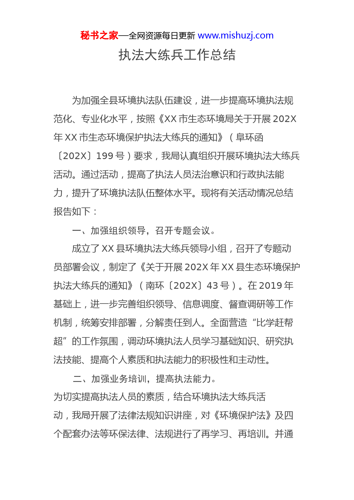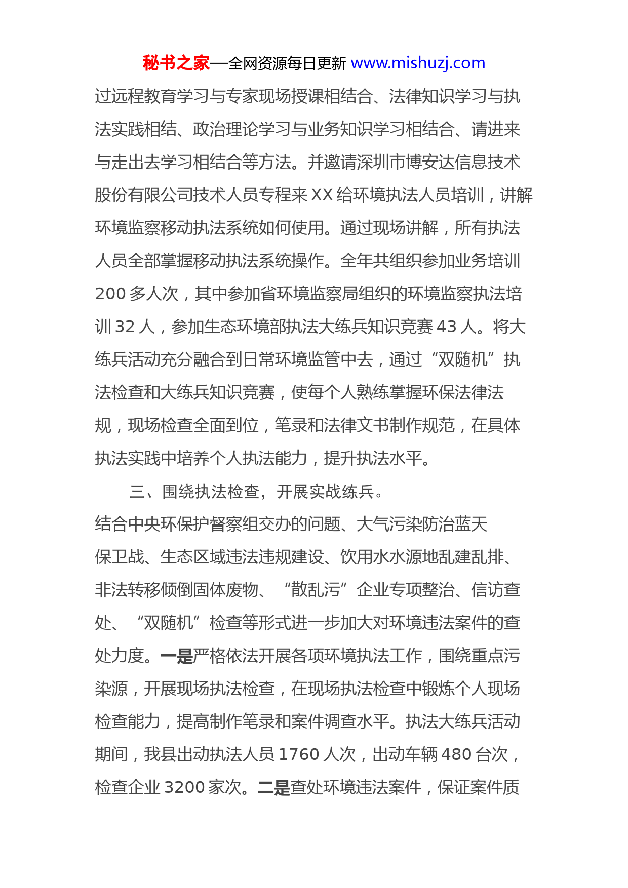 秘书之家—全网资源每日更新www.mishuzj.com执法大练兵工作总结为加强全县环境执法队伍建设,进一步提高环境执法规范化、专业化水平,按照《XX市生态环境局关于开展202X年XX市生态环境保护执法大练兵的通知》(阜环函〔202X〕199号)要求,我局认真组织开展环境执法大练兵活动。通过活动,提高了执法人员法治意识和行政执法能力,提升了环境执法队伍整体水平。现将有关活动情况总结报告如下:一、加强组织领导,召开专题会议。成立了XX县环境执法大练兵领导小组,召开了专题动员部署会议,制定了《关于开展202X年XX县生态环境保护执法大练兵的通知》(南环〔202X〕43号)。在2019年基础上,进一步完善组织领导、信息调度、督查调研等工作机制,统筹安排部署,分解责任到人。全面营造“比学赶帮超”的工作氛围,调动环境执法人员学习基础知识、研究执法技能、提高个人素质和执法能力的积极性和主动性。二、加强业务培训,提高执法能力。为切实提高执法人员的素质,结合环境执法大练兵活动,我局开展了法律法规知识讲座,对《环境保护法》及四个配套办法等环保法律、法规进行了再学习、再培训。并通秘书之家—全网资源每日更新www.mishuzj.com过远程教育学习与专家现场授课相结合、法律知识学习与执法实践相结、政治理论学习与业务知识学习相结合、请进来与走出去学习相结合等方法。并邀请深圳市博安达信息技术股份有限公司技术人员专程来XX给环境执法人员培训,讲解环境监察移动执法系统如何使用。通过现场讲解,所有执法人员全部掌握移动执法系统操作。全年共组织参加业务培训200多人次,其中参加省环境监察局组织的环境监察执法培训32人,参加生态环境部执法大练兵知识竞赛43人。将大练兵活动充分融合到日常环境监管中去,通过“双随机”执法检查和大练兵知识竞赛,使每个人熟练掌握环保法律法规,现场检查全面到位,笔录和法律文书制作规范,在具体执法实践中培养个人执法能力,提升执法水平。三、围绕执法检查,开展实战练兵。结合中央环保护督察组交办的问题、大气污染防治蓝天保卫战、生态区域违法违规建设、饮用水水源地乱建乱排、非法转移倾倒固体废物、“散乱污”企业专项整治、信访查处、“双随机”检查等形式进一步加大对环境违法案件的查处力度。一是严格依法开展各项环境执法工作,围绕重点污染源,开展现场执法检查,在现场执法检查中锻炼个人现场检查能力,提高制作笔录和案件调查水平。执法大练兵活动期间,我县出动执法人员1760人次,出动车辆480台次,检查企业3200家次。二是查处环境违法案件,保证案件质秘书之家—全网资源每日更新www.mishuzj.com量,重点对建设项目环境违法行进行查处,确保新环保法及其配套办法的使用落实到位。在环境保护大练兵的推动下,XX县严厉查处环境违法案件,立案14件,罚款金额79.3321万元,查封3家,下达环境监察通知书221份,取缔关闭“散乱污”企业8家。三是严格文明执法,执法人员现场检查时必须着统一制服、佩戴执法证件,使用文明用语、熟练掌握法律条文,做到宣传与预防结合、高效执法,同时注重解决影响群众健康和反映强烈的环境污染问题,维护群众合法环境权益,展示环保执法新形象。四是注重提升执法人员工作能力,通过环保大练兵活动带动执法人员多交流、多学习、开拓眼界,打消传统的惯性思维和僵化思维,提高了执法人员的思想认识和业务能力,夯实了执法队伍的业务基础,提升了整体业务水平。五是编写执法大练兵简报14期。四、加大执法力度,提升环境质量。坚持日常执法与强化监督相结合、理论学习与实战实操相结合、提升能力和加强保障相结合,着力解决执法工作中存在的不会查、不愿查、不敢查问题,着力解决群众身边的突出环境问题,着力改善生态环境质量,凝心聚力打赢污染防治攻坚战。(一)大气污染防治蓝天保卫战。1-10月份,我县空气质量PM2.5平均浓度45.2微克/立方米,同比下降19.6%,秘书之家—全网资源每日更新www.mishuzj.com完成本年度全市环境空气质量阶段性控制目标,居五县市第二位;优良天数223天,占比74.6%,与去年同期相比优良天气增加11天,优良率增加3.6个百分点。(二)水污染防治碧水攻坚战。1-9月份,国考谷河苗寺大桥断面、蒙河分洪道贾岗等3个市级考核断面水质符合上给考核要求,但是,谷河苗寺大桥断面、蒙河分洪道贾岗断面、润河贾楼断面水质都有月份超标。(三)突出生态环境问题整改。一是2017年中央环保督察和2018年中央环保督察“回头看”共转办群众信访件36件,全部完成整改并销号。二是省环保督察转办群众信访件43件,整改完成并销号42件,销号率97.67%,居全市第一位。三是“23+80+N”突出生态问题22个,第三批20件、第五批2件。目前完成整并改销号20件,正在市级验收1件,正在整改1件。全县27个乡镇政府驻地污水处理设施主体工程全部建设完毕,39个入河排污口全部完成整改。经开区集中供热二期工程建设完成,完成了省、市下达的任务。通过执法大练兵活动,我局执法人员的业务水平和素质得到了显著提高。既加强人员素质和机构制度建设,也完善执法车辆、执法装备等硬件建设;培养了一批善于钻研、能力突出的执法尖兵,全面打造了环境执法队伍。下一步,我局将继续按照生态环境部和省、市生态环境部门的要求,结秘