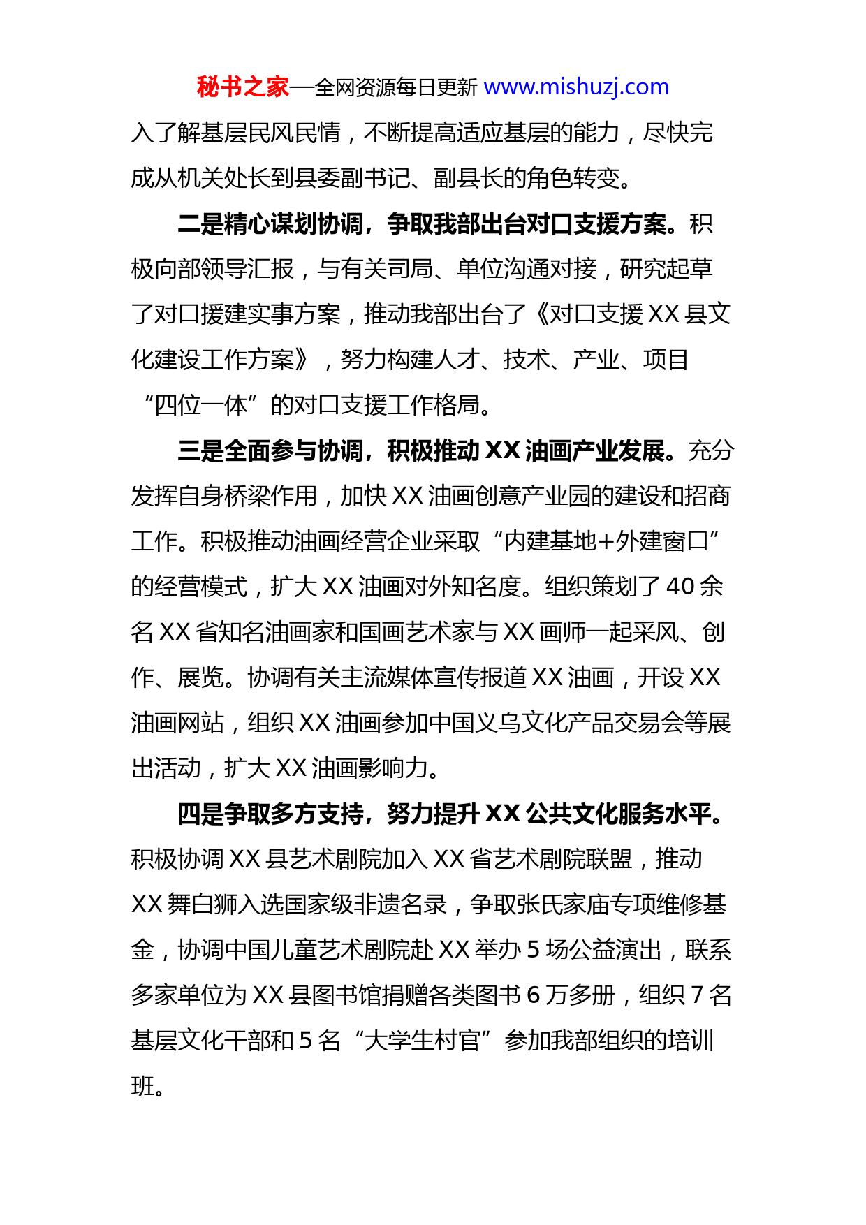 秘书之家—全网资源每日更新www.mishuzj.com挂职锻炼工作总结202X年1月,我有幸作为首批XX名中央部委派驻原XXX挂职锻炼干部的一员,来到XX县挂职县委副书记、副县长,开始了为期两年的挂职工作。到XX区挂职,深入基层工作学习,对我个人是一个非常难得的锻炼和洗礼的机会,也深感为苏区振兴发展的神圣使命和重大责任。来XX挂职锻炼一年来,我珍惜机遇,认真履职,积极主动融入XX经济社会发展,协调、争取、对接有关援建项目,为XX文化建设贡献绵薄之力,自身在思维方式、工作能力等方面都得到不同程度的锻炼。现将一年挂职锻炼工作情况和体会汇报如下。一、202X年挂职锻炼工作总结按照工作分工和XX的实际,我积极转变角色,主动开展工作,努力为XX振兴发展和基层群众踏踏实实做些实事、好事。一是深入学习调研,加快工作角色转变。深入领会国务院《关于支持赣南等原中央苏区振兴发展的若干意见》等文件精神,仔细研读《XX县志》等书籍史料,深入了解XX历史沿革和近现代社会、经济、文化发展,为进一步开展挂职和援建工作打好基础。积极参加县委、县政府召开的各类会议,熟悉议事程序,广泛接触基层干部群众,深秘书之家—全网资源每日更新www.mishuzj.com入了解基层民风民情,不断提高适应基层的能力,尽快完成从机关处长到县委副书记、副县长的角色转变。二是精心谋划协调,争取我部出台对口支援方案。积极向部领导汇报,与有关司局、单位沟通对接,研究起草了对口援建实事方案,推动我部出台了《对口支援XX县文化建设工作方案》,努力构建人才、技术、产业、项目“四位一体”的对口支援工作格局。三是全面参与协调,积极推动XX油画产业发展。充分发挥自身桥梁作用,加快XX油画创意产业园的建设和招商工作。积极推动油画经营企业采取“内建基地+外建窗口”的经营模式,扩大XX油画对外知名度。组织策划了40余名XX省知名油画家和国画艺术家与XX画师一起采风、创作、展览。协调有关主流媒体宣传报道XX油画,开设XX油画网站,组织XX油画参加中国义乌文化产品交易会等展出活动,扩大XX油画影响力。四是争取多方支持,努力提升XX公共文化服务水平。积极协调XX县艺术剧院加入XX省艺术剧院联盟,推动XX舞白狮入选国家级非遗名录,争取张氏家庙专项维修基金,协调中国儿童艺术剧院赴XX举办5场公益演出,联系多家单位为XX县图书馆捐赠各类图书6万多册,组织7名基层文化干部和5名“大学生村官”参加我部组织的培训班。秘书之家—全网资源每日更新www.mishuzj.com五是加强宣传推介,着力加快XX旅游产业发展升级。组织策划“八个一”旅游宣传营销活动,全面宣传推介XX旅游资源,邀请中国艺术摄影学会开展“黎明山川,梦里江南——中国摄影家走进XX采风活动”,策划邀请中国文联副主席陈晓光等知名词曲作家深入XX创作采风,创作出了十几首歌曲。积极推进旅游招商。二、感受和体会一年的挂职锻炼,我受益匪浅,感触颇多,主要有以下几点感受和体会:(一)挂职锻炼是机关干部深入基层、了解实情、接地气的重要方式。基层工作是国家各项工作的基础,国家部委的干部离基层比较远,虽然也会有一些到基层调研的机会,但经常也是时间短,了解掌握的情况不够深入、不够全面,这样制定的政策、出台的文件,有时到了基层就比较难操作、难实施,使国家制定政策的初衷打了折扣,使好的政策没有发挥更好的作用。而通过挂职锻炼,深入基层工作1-2年,每天接触到具体操作层面的工作,就能真正了解实情,了解问题的症结和基层的实际需求。(二)挂职锻炼是干部锻炼成长的重要渠道。到基层挂职锻炼,从国家部委的处长到基层党委政府的一名主要领导,财政、税收、土地、招商引资、拆迁、信访等各方面工作都会涉及到,所接触的工作内容、工作性质都有很秘书之家—全网资源每日更新www.mishuzj.com大不同,思考问题、处理问题的方式也会有很大不同。最突出的感受是每件事都直接关系到群众的切身利益,成就感更强,责任也更大。挂职锻炼一个人远离家人、朋友、同事及熟悉的工作、生活环境,对个人的意志、耐力、协调力、适应新环境的能力、开展工作的能力等都是很好的考验和锻炼。(三)对口援建,关键是增强当地文化建设的积极性、主动性。对口援建最重要的是解决当地文化建设的意识,增强当地的文化自觉、文化自信,使当地文化建设形成可持续发展的态势。我部对口支援建设极大调动了XX县加强文化建设的自觉性、主动性,加强文化建设、发展油画产业逐渐成为全县干部群众的共识。文化部对口支援方案出台后,XX省委书记强卫作出重要批示,要求“省有关部门和抚州市、XX县要认真抓好‘方案’的落实,力争XX县文化建设走在全省前列”。该县成立了以县委书记为组长的承接文化部对口支援领导小组,全面统筹协调全县对口支援工作,制定《XX县承接文化部对口支援力争文化建设走在全省前列工作方案》,明确了力争在深化文化体制改革、公共文化服务、特色文化提升、产业发展融合、文化发展投入等5个方面走在全省前列的奋斗目标。(四)坚持做事不做客,自律不特殊。挂职干部来自上级机关,由于角色特殊性,基层同志有可能在尊重的同秘书之家—全网资源每日更新www.mishuzj.com时过于客气。如果把握不好,就会“你做客,我当客”,让挂职时间