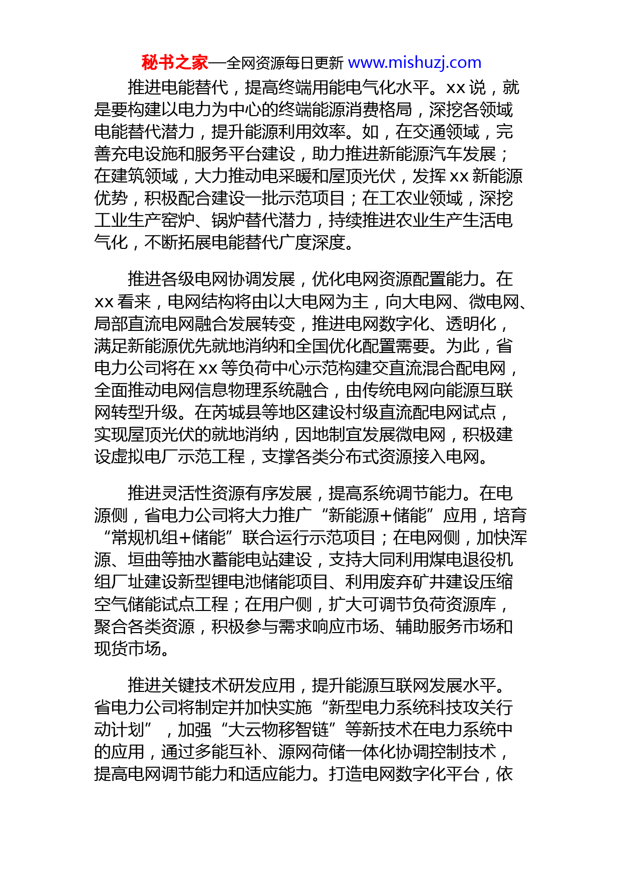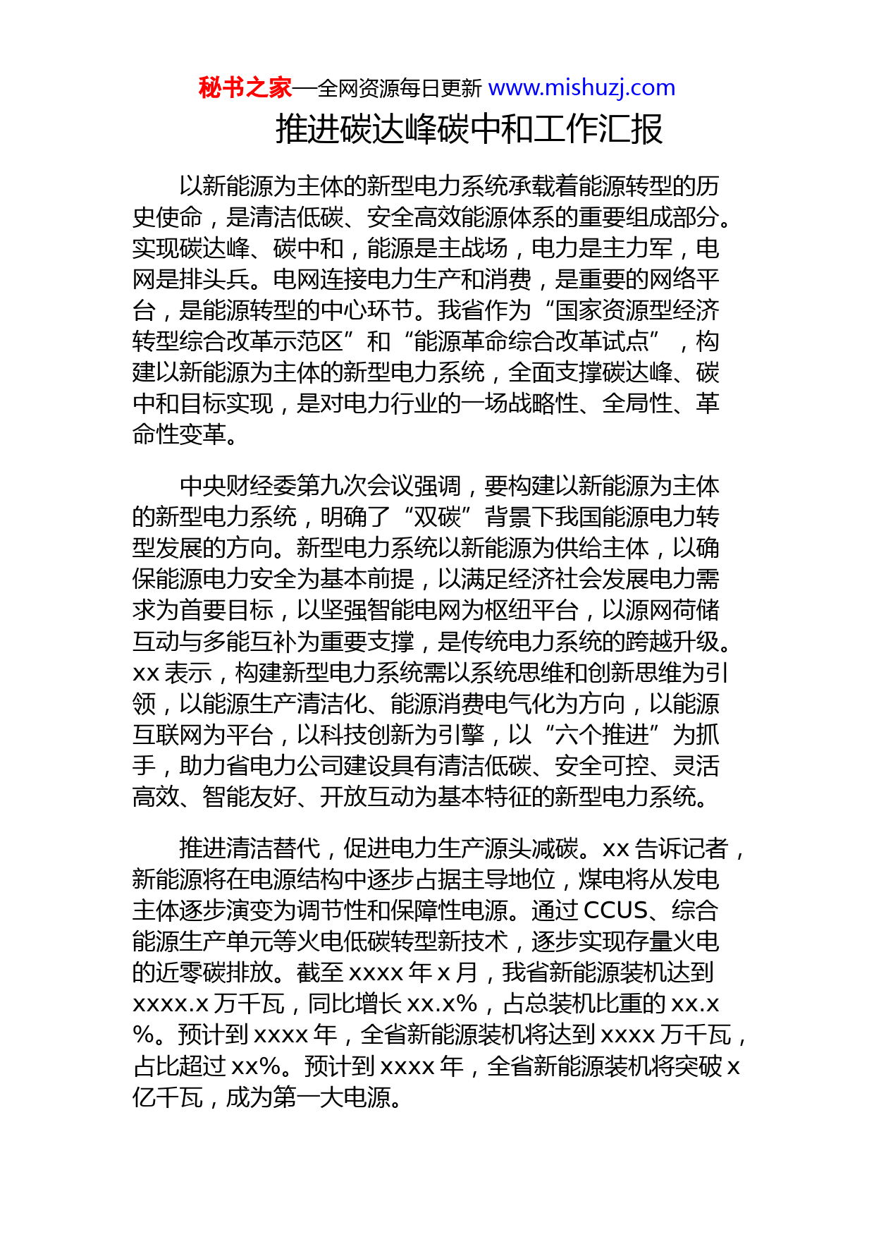 秘书之家—全网资源每日更新www.mishuzj.com推进碳达峰碳中和工作汇报以新能源为主体的新型电力系统承载着能源转型的历史使命,是清洁低碳、安全高效能源体系的重要组成部分。实现碳达峰、碳中和,能源是主战场,电力是主力军,电网是排头兵。电网连接电力生产和消费,是重要的网络平台,是能源转型的中心环节。我省作为“国家资源型经济转型综合改革示范区”和“能源革命综合改革试点”,构建以新能源为主体的新型电力系统,全面支撑碳达峰、碳中和目标实现,是对电力行业的一场战略性、全局性、革命性变革。中央财经委第九次会议强调,要构建以新能源为主体的新型电力系统,明确了“双碳”背景下我国能源电力转型发展的方向。新型电力系统以新能源为供给主体,以确保能源电力安全为基本前提,以满足经济社会发展电力需求为首要目标,以坚强智能电网为枢纽平台,以源网荷储互动与多能互补为重要支撑,是传统电力系统的跨越升级。xx表示,构建新型电力系统需以系统思维和创新思维为引领,以能源生产清洁化、能源消费电气化为方向,以能源互联网为平台,以科技创新为引擎,以“六个推进”为抓手,助力省电力公司建设具有清洁低碳、安全可控、灵活高效、智能友好、开放互动为基本特征的新型电力系统。推进清洁替代,促进电力生产源头减碳。xx告诉记者,新能源将在电源结构中逐步占据主导地位,煤电将从发电主体逐步演变为调节性和保障性电源。通过CCUS、综合能源生产单元等火电低碳转型新技术,逐步实现存量火电的近零碳排放。截至xxxx年x月,我省新能源装机达到xxxx.x万千瓦,同比增长xx.x%,占总装机比重的xx.x%。预计到xxxx年,全省新能源装机将达到xxxx万千瓦,占比超过xx%。预计到xxxx年,全省新能源装机将突破x亿千瓦,成为第一大电源。秘书之家—全网资源每日更新www.mishuzj.com推进电能替代,提高终端用能电气化水平。xx说,就是要构建以电力为中心的终端能源消费格局,深挖各领域电能替代潜力,提升能源利用效率。如,在交通领域,完善充电设施和服务平台建设,助力推进新能源汽车发展;在建筑领域,大力推动电采暖和屋顶光伏,发挥xx新能源优势,积极配合建设一批示范项目;在工农业领域,深挖工业生产窑炉、锅炉替代潜力,持续推进农业生产生活电气化,不断拓展电能替代广度深度。推进各级电网协调发展,优化电网资源配置能力。在xx看来,电网结构将由以大电网为主,向大电网、微电网、局部直流电网融合发展转变,推进电网数字化、透明化,满足新能源优先就地消纳和全国优化配置需要。为此,省电力公司将在xx等负荷中心示范构建交直流混合配电网,全面推动电网信息物理系统融合,由传统电网向能源互联网转型升级。在芮城县等地区建设村级直流配电网试点,实现屋顶光伏的就地消纳,因地制宜发展微电网,积极建设虚拟电厂示范工程,支撑各类分布式资源接入电网。推进灵活性资源有序发展,提高系统调节能力。在电源侧,省电力公司将大力推广“新能源+储能”应用,培育“常规机组+储能”联合运行示范项目;在电网侧,加快浑源、垣曲等抽水蓄能电站建设,支持大同利用煤电退役机组厂址建设新型锂电池储能项目、利用废弃矿井建设压缩空气储能试点工程;在用户侧,扩大可调节负荷资源库,聚合各类资源,积极参与需求响应市场、辅助服务市场和现货市场。推进关键技术研发应用,提升能源互联网发展水平。省电力公司将制定并加快实施“新型电力系统科技攻关行动计划”,加强“大云物移智链”等新技术在电力系统中的应用,通过多能互补、源网荷储一体化协调控制技术,提高电网调节能力和适应能力。打造电网数字化平台,依秘书之家—全网资源每日更新www.mishuzj.com托能源云等电网平台,与地方政府共同打造xx能源大数据中心,加大数据共享和价值挖掘,拓展新业务新业态新模式,构建能源互联网生态圈。推进电力体制改革,构建新型电力市场体系。xx认为,要加快推动建设竞争充分、开放有序的省级电力市场,实现xx富余新能源发电量在全国范围内的自由流通和优化配置。完善中长期、现货和辅助服务衔接机制,探索容量市场交易机制,开展绿色电力交易,大力推动绿色能源跨区输送。主动参与碳市场建设,持续推进市场体制机制创新,研究电力市场和碳市场协同机制、碳价格与电价联动机制,激发全社会减排动力。构建新型电力系统,是一项极具开创性、挑战性的系统工程。省电力公司将坚持改革创新,加快构建以新能源为主体的新型电力系统,在推动能源低碳转型和高质量发展中勇当引领者、推动者和先行者,为实现碳达峰、碳中和贡献xx力量。