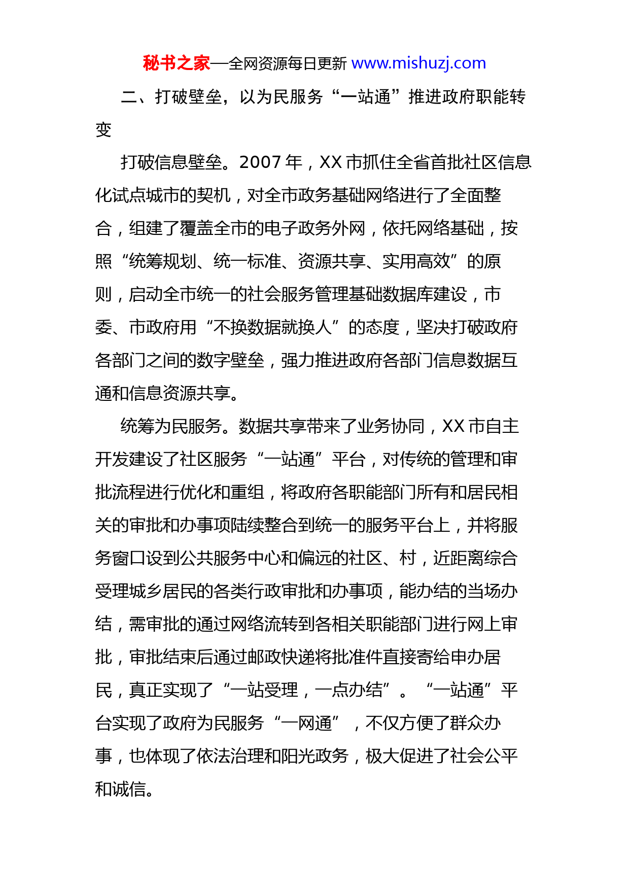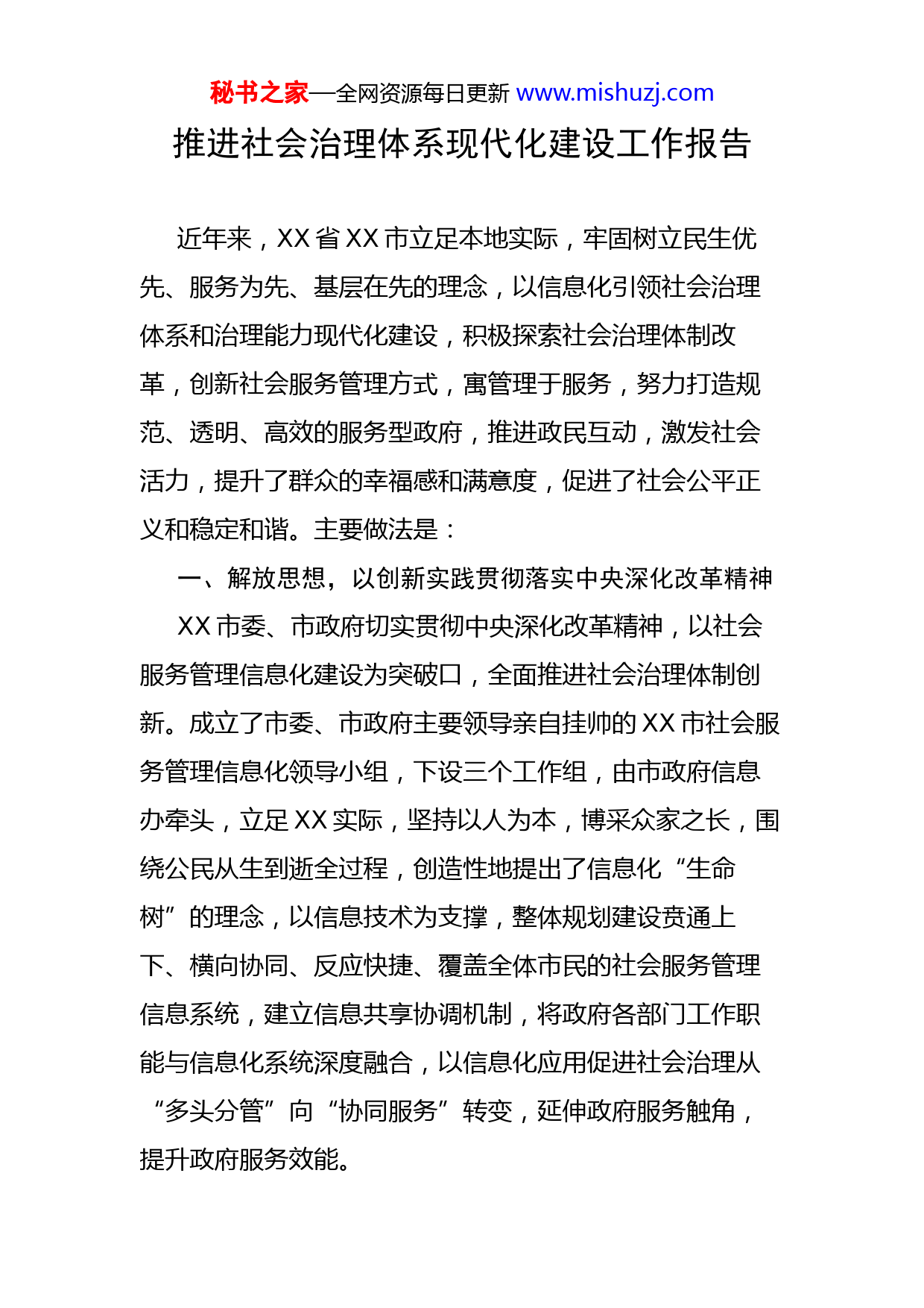秘书之家—全网资源每日更新www.mishuzj.com推进社会治理体系现代化建设工作报告近年来,XX省XX市立足本地实际,牢固树立民生优先、服务为先、基层在先的理念,以信息化引领社会治理体系和治理能力现代化建设,积极探索社会治理体制改革,创新社会服务管理方式,寓管理于服务,努力打造规范、透明、高效的服务型政府,推进政民互动,激发社会活力,提升了群众的幸福感和满意度,促进了社会公平正义和稳定和谐。主要做法是:一、解放思想,以创新实践贯彻落实中央深化改革精神XX市委、市政府切实贯彻中央深化改革精神,以社会服务管理信息化建设为突破口,全面推进社会治理体制创新。成立了市委、市政府主要领导亲自挂帅的XX市社会服务管理信息化领导小组,下设三个工作组,由市政府信息办牵头,立足XX实际,坚持以人为本,博采众家之长,围绕公民从生到逝全过程,创造性地提出了信息化“生命树”的理念,以信息技术为支撑,整体规划建设贲通上下、横向协同、反应快捷、覆盖全体市民的社会服务管理信息系统,建立信息共享协调机制,将政府各部门工作职能与信息化系统深度融合,以信息化应用促进社会治理从“多头分管”向“协同服务”转变,延伸政府服务触角,提升政府服务效能。秘书之家—全网资源每日更新www.mishuzj.com二、打破壁垒,以为民服务“一站通”推进政府职能转变打破信息壁垒。2007年,XX市抓住全省首批社区信息化试点城市的契机,对全市政务基础网络进行了全面整合,组建了覆盖全市的电子政务外网,依托网络基础,按照“统筹规划、统一标准、资源共享、实用高效”的原则,启动全市统一的社会服务管理基础数据库建设,市委、市政府用“不换数据就换人”的态度,坚决打破政府各部门之间的数字壁垒,强力推进政府各部门信息数据互通和信息资源共享。统筹为民服务。数据共享带来了业务协同,XX市自主开发建设了社区服务“一站通”平台,对传统的管理和审批流程进行优化和重组,将政府各职能部门所有和居民相关的审批和办事项陆续整合到统一的服务平台上,并将服务窗口设到公共服务中心和偏远的社区、村,近距离综合受理城乡居民的各类行政审批和办事项,能办结的当场办结,需审批的通过网络流转到各相关职能部门进行网上审批,审批结束后通过邮政快递将批准件直接寄给申办居民,真正实现了“一站受理,一点办结”。“一站通”平台实现了政府为民服务“一网通”,不仅方便了群众办事,也体现了依法治理和阳光政务,极大促进了社会公平和诚信。秘书之家—全网资源每日更新www.mishuzj.com三、重心下移,以城乡社区网格化管理提升源头治理能力推行网格化管理。依托自主开发建设的网格化社会服务管理信息平台,XX市在全市城乡社区全面推行网格化管理,通过网格精细化管理,提升源头治理的能力。按照“任务相当、方便管理、界定清晰”原则,根据区域地形特点和居住人口密度合理设置网格。对全市民政、计生、人社等基层社工进行整合,按城区每500户左右配备一名网格员,农村以自然村为单位配备一名网格员。网格员作为政府管理的神经末梢,统一配备“社管通”手机终端,通过“网格化管理平台”对网格内“人、地、物、事、组织”信息进行采集上报和核查,准确掌握网格内的民情民意、事故隐患和突发事件,完成网格内的社会服务管理事项。通过语音识别技术,网格员可以通过语音方式在“社管通”终端进行信息录入,极大提高了工作效率。建立联动机制。为确保网格员上报的各类群众诉求和事件能得到及时响应和处置,XX市将网格化监督管理工作交由各级综治办负责,抽调专人对网格化管理工作进行协调、指挥、调度和监督考核,建立了“有人巡查、有人报告、有人负责、有人解决、有人督查”的“五有”运行机制,与市、县(区)各职能部门联动,对交办事项实行电秘书之家—全网资源每日更新www.mishuzj.com子监察,做到事事有人办、件件有落实,利用“网格化管理平台”实现紧密联系群众和社会矛盾化解的方式创新。四、信息惠民,以信息化应用引导社会协同和公众参与XX市积极拓展公共服务,自主开发建设了“一户一网站综合信息服务平台(易户网)”,即为每一户居民家庭定制一个服务网页,提供多项自助服务功能。和各个公共服务部门对接,将居民家庭的水、电、气、电视、电话、公积金、社保、车驾管等各类公共服务信息推送到居民网页上,方便居民及时了解相关信息。设立办事栏目,将政府的办事窗口延伸到居民家中,居民可以直接通过自家网页向政府提交办事项申请,系统自动流转到居民所在社区(村)受理。不断开发智能交通、票据管家、社区支付通等贴近居民生活需求的特色信息化公益服务项目,让群众生活更加便捷。引入社会服务资源,将服务领域拓展到衣、食、住、行、娱购、游、家政等各类个性化服务,响应居民的各类服务需求。“易户网”拉近了市民与政府的距离,市民可以登录自己的网页随时查询自己在社区申办事项的进程,向政府提出意见建议,社区工作者也可以通过网络向市民发出事项办结的温馨提示以及各类社区公告,搭建了政府与市民零距离沟通的桥梁。秘书之家—全网资源每日更新www.mishuzj.com