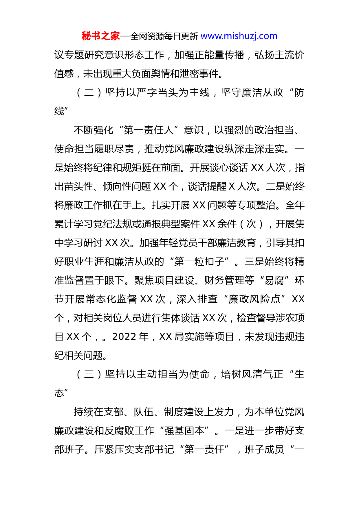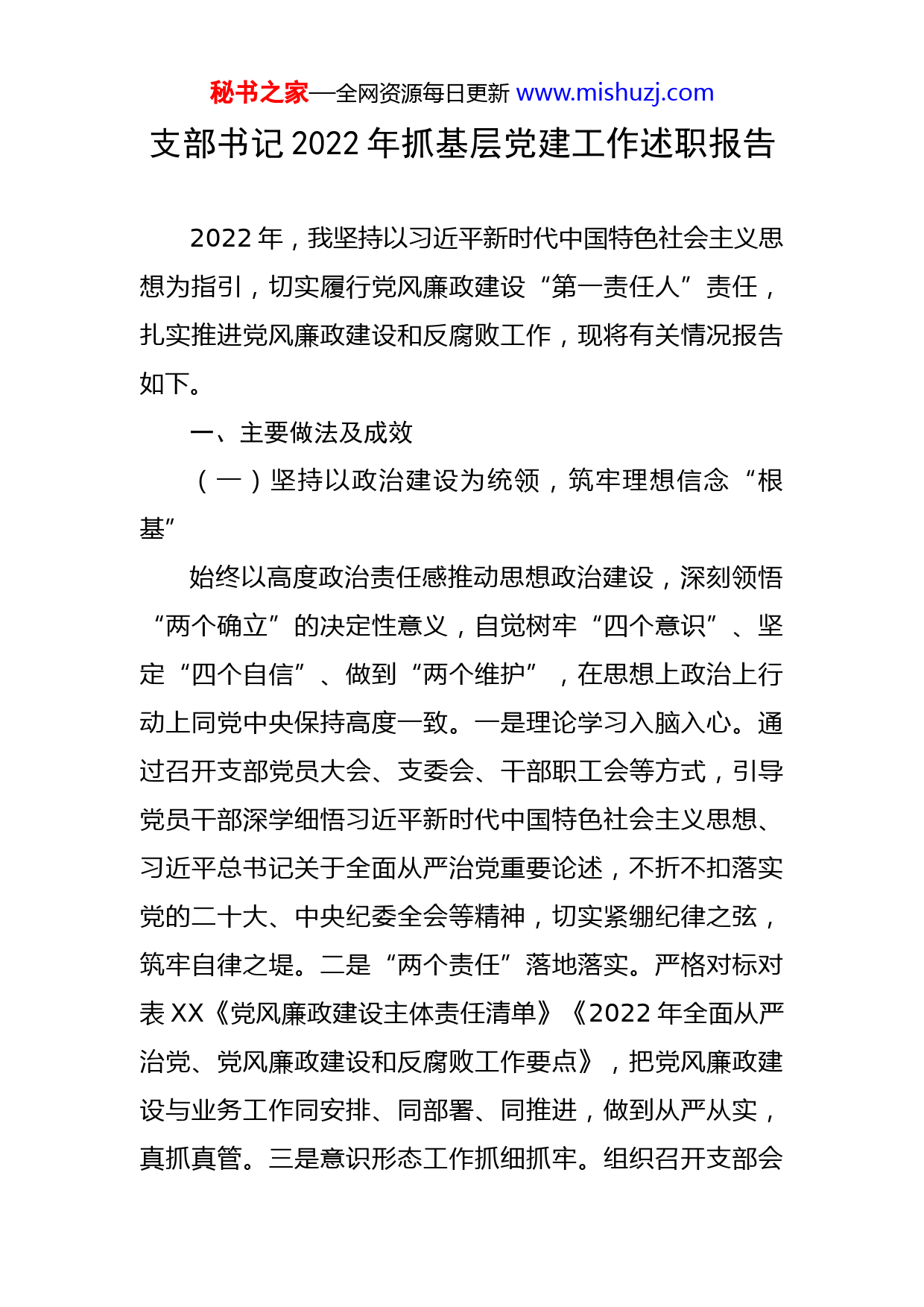 秘书之家—全网资源每日更新www.mishuzj.com支部书记2022年抓基层党建工作述职报告2022年,我坚持以习近平新时代中国特色社会主义思想为指引,切实履行党风廉政建设“第一责任人”责任,扎实推进党风廉政建设和反腐败工作,现将有关情况报告如下。一、主要做法及成效(一)坚持以政治建设为统领,筑牢理想信念“根基”始终以高度政治责任感推动思想政治建设,深刻领悟“两个确立”的决定性意义,自觉树牢“四个意识”、坚定“四个自信”、做到“两个维护”,在思想上政治上行动上同党中央保持高度一致。一是理论学习入脑入心。通过召开支部党员大会、支委会、干部职工会等方式,引导党员干部深学细悟习近平新时代中国特色社会主义思想、习近平总书记关于全面从严治党重要论述,不折不扣落实党的二十大、中央纪委全会等精神,切实紧绷纪律之弦,筑牢自律之堤。二是“两个责任”落地落实。严格对标对表XX《党风廉政建设主体责任清单》《2022年全面从严治党、党风廉政建设和反腐败工作要点》,把党风廉政建设与业务工作同安排、同部署、同推进,做到从严从实,真抓真管。三是意识形态工作抓细抓牢。组织召开支部会秘书之家—全网资源每日更新www.mishuzj.com议专题研究意识形态工作,加强正能量传播,弘扬主流价值感,未出现重大负面舆情和泄密事件。(二)坚持以严字当头为主线,坚守廉洁从政“防线”不断强化“第一责任人”意识,以强烈的政治担当、使命担当履职尽责,推动党风廉政建设纵深走深走实。一是始终将纪律和规矩挺在前面。开展谈心谈话XX人次,指出苗头性、倾向性问题XX个,谈话提醒X人次。二是始终将廉政工作抓在手上。扎实开展XX问题等专项整治。全年累计学习党纪法规或通报典型案件XX余件(次),开展集中学习研讨XX次。加强年轻党员干部廉洁教育,引导其扣好职业生涯和廉洁从政的“第一粒扣子”。三是始终将精准监督置于眼下。聚焦项目建设、财务管理等“易腐”环节开展常态化监督XX次,深入排查“廉政风险点”XX个,对相关岗位人员进行集体谈话XX次,检查督导涉农项目XX个,。2022年,XX局实施等项目,未发现违规违纪相关问题。(三)坚持以主动担当为使命,培树风清气正“生态”持续在支部、队伍、制度建设上发力,为本单位党风廉政建设和反腐败工作“强基固本”。一是进一步带好支部班子。压紧压实支部书记“第一责任”,班子成员“一秘书之家—全网资源每日更新www.mishuzj.com岗双责”,做到知责、尽责、负责。严格落实民主集中制,重要项目安排、大额资金使用等重大事项均由集体讨论决定。二是进一步锻造干部队伍。以“作风能力专项提升行动”为抓手,建强党员干部队伍,组织观看XX等廉政警示教育片X部,举办廉政微党课XX次,赴XX开展廉政现场教学1次,组织学习《XX》,通过学廉、倡廉、促廉,不断熏陶干部,实现“百毒不侵”。三是进一步扎牢制度笼子。坚持用制度管人、管事、管权,进一步修订完善《XX管理办法》等XX项管理规定,织密廉洁履职“防护网”,防范涉廉风险。同时,在生活和工作中,我始终遵章守纪,严守底线,不越红线,自觉净化“三圈”,抵制“四风”,严格执行中央八项规定和省、市十项规定及其实施细则,没有违规插手干预单位重大事项。二、存在的主要问题一是抓具体业务与抓党风廉政建设的紧密结合、有机融合还不够,开展党风廉政建设的形式还比较单一,载体还够不丰富;二是在工作中对党员干部的教育管理上还不够严格。坚持刀刃向内、动真碰硬不够,纠治“四风”不够严,追责问责存在不到位的问题。开展批评教育还未达不到真正触及灵魂的力度和深度。三、2023年工作打算秘书之家—全网资源每日更新www.mishuzj.com一是持续强化政治担当。准确把握党的二十大对全面从严治党提出的新要求,进一步严明党的政治纪律和政治规矩,推动上级各项决策部署在XX落地生根、开花结果;二是持之以恒促廉政。坚持全覆盖、多方位、深层次开展党风廉政教育,不断强化本单位干部职工遵纪守法观念;三是做深做实日常监督。坚持问题导向,持续紧盯关键岗位和重要领域,不断提升“三不”一体推进治理效能,对相关倾向性、苗头性问题打早打小;四是锻造党员干部队伍。推进干部队伍“作风能力专项提升行动”,着力打造一支忠诚、干净、担当的高素质干部队伍。