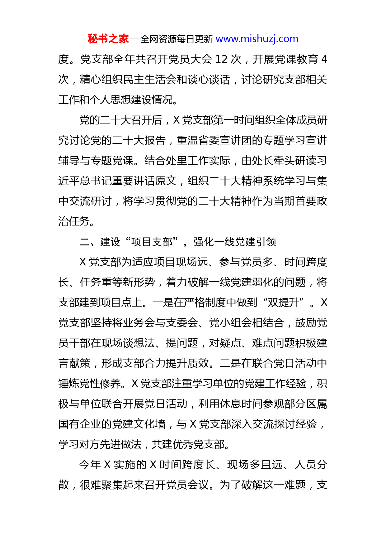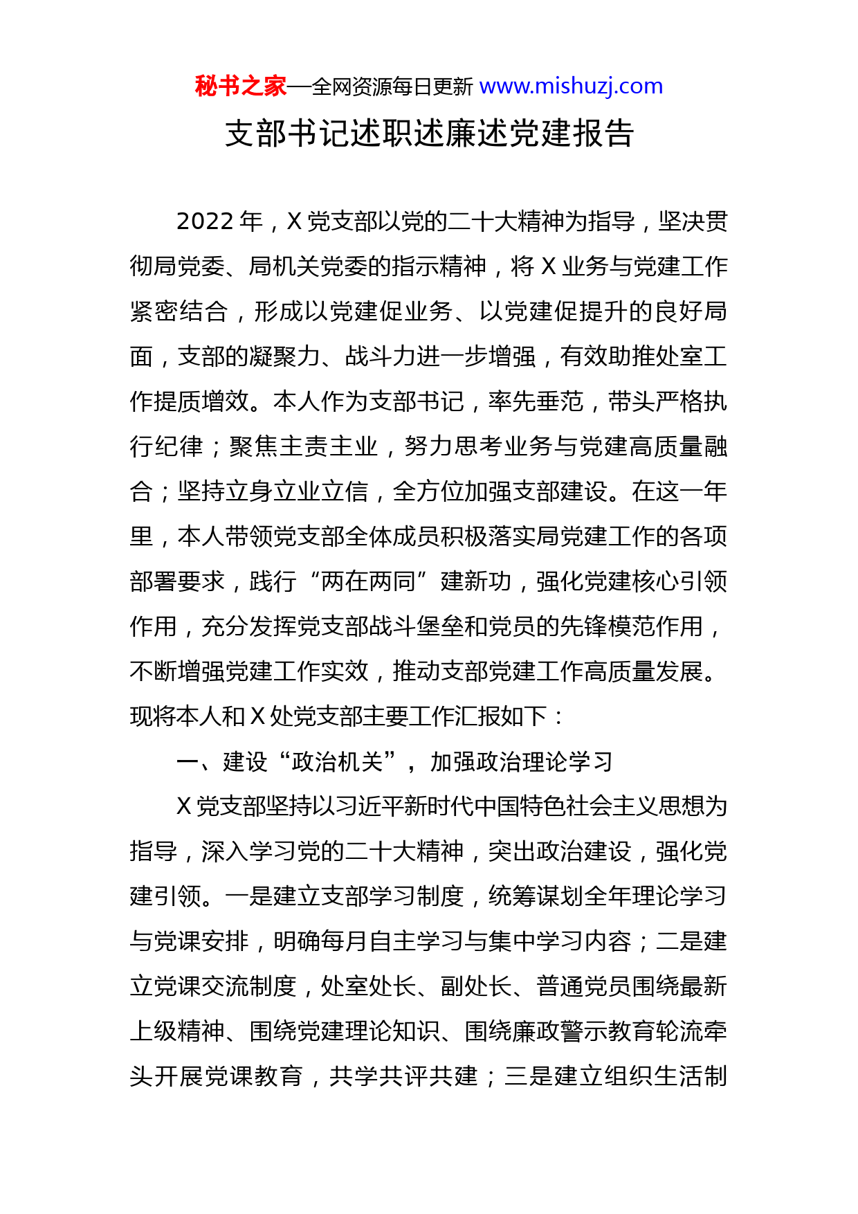 秘书之家—全网资源每日更新www.mishuzj.com支部书记述职述廉述党建报告2022年,X党支部以党的二十大精神为指导,坚决贯彻局党委、局机关党委的指示精神,将X业务与党建工作紧密结合,形成以党建促业务、以党建促提升的良好局面,支部的凝聚力、战斗力进一步增强,有效助推处室工作提质增效。本人作为支部书记,率先垂范,带头严格执行纪律;聚焦主责主业,努力思考业务与党建高质量融合;坚持立身立业立信,全方位加强支部建设。在这一年里,本人带领党支部全体成员积极落实局党建工作的各项部署要求,践行“两在两同”建新功,强化党建核心引领作用,充分发挥党支部战斗堡垒和党员的先锋模范作用,不断增强党建工作实效,推动支部党建工作高质量发展。现将本人和X处党支部主要工作汇报如下:一、建设“政治机关”,加强政治理论学习X党支部坚持以习近平新时代中国特色社会主义思想为指导,深入学习党的二十大精神,突出政治建设,强化党建引领。一是建立支部学习制度,统筹谋划全年理论学习与党课安排,明确每月自主学习与集中学习内容;二是建立党课交流制度,处室处长、副处长、普通党员围绕最新上级精神、围绕党建理论知识、围绕廉政警示教育轮流牵头开展党课教育,共学共评共建;三是建立组织生活制秘书之家—全网资源每日更新www.mishuzj.com度。党支部全年共召开党员大会12次,开展党课教育4次,精心组织民主生活会和谈心谈话,讨论研究支部相关工作和个人思想建设情况。党的二十大召开后,X党支部第一时间组织全体成员研究讨论党的二十大报告,重温省委宣讲团的专题学习宣讲辅导与专题党课。结合处里工作实际,由处长牵头研读习近平总书记重要讲话原文,组织二十大精神系统学习与集中交流研讨,将学习贯彻党的二十大精神作为当期首要政治任务。二、建设“项目支部”,强化一线党建引领X党支部为适应项目现场远、参与党员多、时间跨度长、任务重等新形势,着力破解一线党建弱化的问题,将支部建到项目点上。一是在严格制度中做到“双提升”。X党支部坚持将业务会与支委会、党小组会相结合,鼓励党员干部在现场谈想法、提问题,对疑点、难点问题积极建言献策,形成支部合力提升质效。二是在联合党日活动中锤炼党性修养。X党支部注重学习单位的党建工作经验,积极与单位联合开展党日活动,利用休息时间参观部分区属国有企业的党建文化墙,与X党支部深入交流探讨经验,学习对方先进做法,共建优秀党支部。今年X实施的X时间跨度长、现场多且远、人员分散,很难聚集起来召开党员会议。为了破解这一难题,支秘书之家—全网资源每日更新www.mishuzj.com部书记牵头着力建立“项目支部”,每个现场都有鲜艳的党旗在飘扬,视频网络会议成为了党员大会的另一种召开形式,保证支部全体人员都能够参与到支部党建生活里。三、建设“战斗堡垒”,丰富党建提升途径X党支部反思以往形式内容单一的党建生活,探索学习丰富的党建工作内容和形式,去糟取精,全面考虑支部年龄结构、业务重点,与X积极联系,着力建设由内而外、由点到面都经得起考验“战斗堡垒”。一是精心组织支部组织生活会,围绕项目质量、作风建设、廉政监督等方面,在开展批评与自我批评基础上,支部书记对项目开展情况进行点评,总结工作、肯定成绩、指出不足,明确下步努力方向,做到真点评、切中要害、红脸出汗,在严管厚爱干部中,确保工作任务高质量完成。二是“两在两同”本人带领X党支部以“学党史、悟思想、办实事、开新局”为主题,以“红红脸、出出汗”为目的,在深入学习习近平总书记在庆祝中国共产党成立100周年大会上的重要讲话等重要精神的基础上,对照党史学习教育目标要求,深入开展批评与自我批评活动。本人带头,全体党员干部本着对支部负责、对同志负责的态度,情真意切,指出每一位同志存在的不足并提出改进的建议,不断促进党员干部进一步坚定信念、增强历史自觉、弘扬优良传统、加强党性锤炼。秘书之家—全网资源每日更新www.mishuzj.comX党支部积极创新党史学习方式,不断丰富党建工作内容和形式,在南京禄口机场疫情爆发后,号召支部党员干部自觉履行防疫责任,担当志愿者,主动到疫情严重、群众需要的地方去,同人民想在一起、干在一起,在疫情防控和防汛防台中建立新功。在疫情防控阻击战,在“两在两同”建新功行动的疫情防控阻击战大考场中,以实际行动彰显责任和担当。支部党员干部在参与核酸检测无法工作。局党组紧急动员参与下沉X防疫支援者工作后,X立即召开党政联席会议动员部署。党员干部自愿报名,并被局党组选中下沉支援抗疫。此外,X处还承担了X工作,党员干部出色完成了任务。本人精心策划、认真选题,以学习百年党史、凝聚奋进力量为主题,开展《X》的微党课。本人作为主讲人,通过PPT的形式,以深入浅出的语言为支部党员干部上了一堂别开生面的党课。结合X工作情况,本人带领支部全体党员干部不断加强X,努力提升胜任力。根据宏观、中观、微观结合起来研究的思路,支部党员干部围绕防范风险任务,学习我国金融风险治理面临的新形势与新挑战基础上,分析我市存在的重风险。X党支部工作还存在以下不足:一是党建工作骨干还不多,需要加强对年轻党员培养锻炼,使之早日成为党建骨干