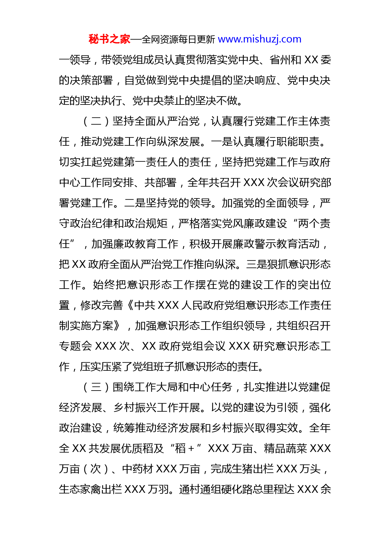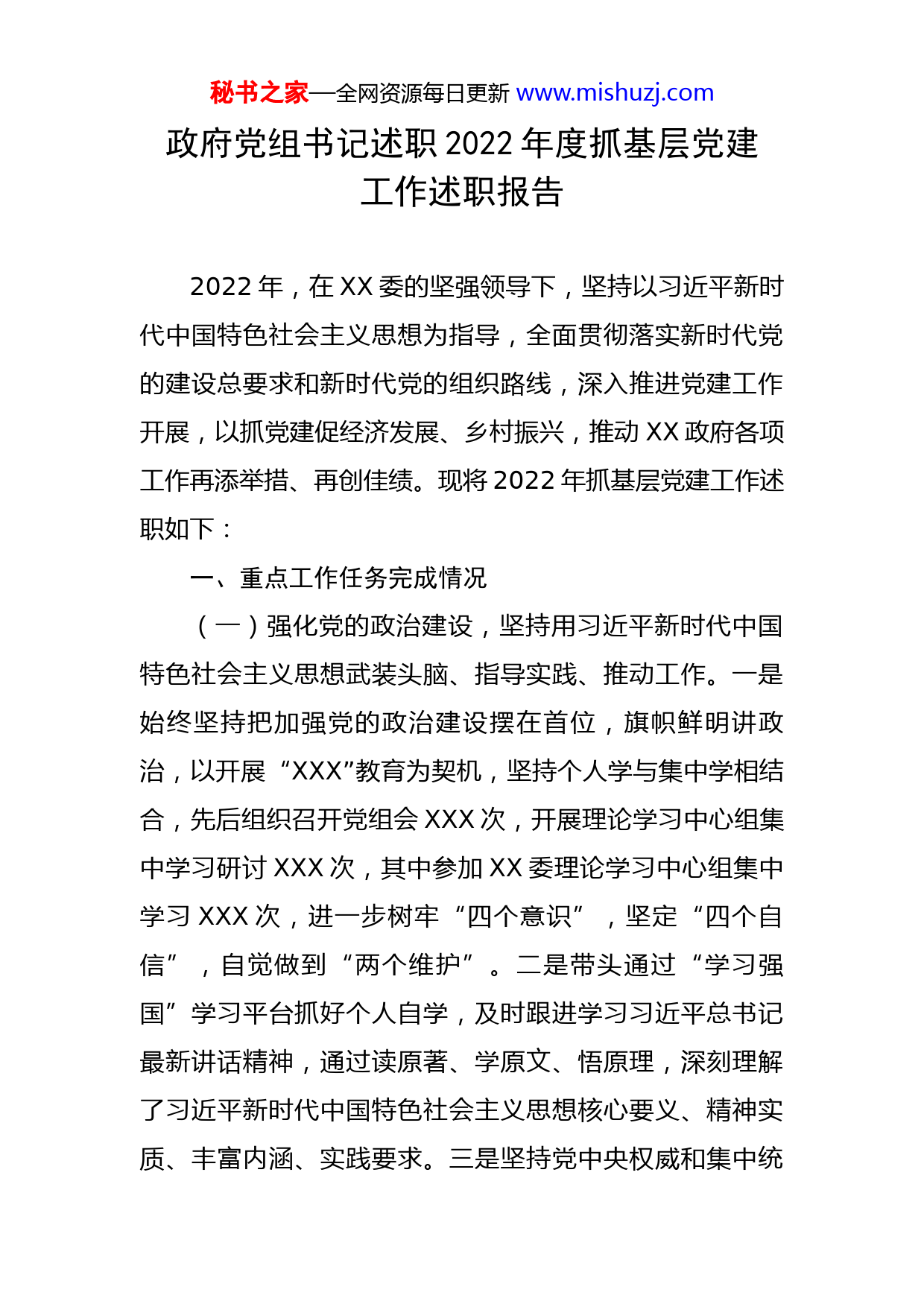 秘书之家—全网资源每日更新www.mishuzj.com政府党组书记述职2022年度抓基层党建工作述职报告2022年,在XX委的坚强领导下,坚持以习近平新时代中国特色社会主义思想为指导,全面贯彻落实新时代党的建设总要求和新时代党的组织路线,深入推进党建工作开展,以抓党建促经济发展、乡村振兴,推动XX政府各项工作再添举措、再创佳绩。现将2022年抓基层党建工作述职如下:一、重点工作任务完成情况(一)强化党的政治建设,坚持用习近平新时代中国特色社会主义思想武装头脑、指导实践、推动工作。一是始终坚持把加强党的政治建设摆在首位,旗帜鲜明讲政治,以开展“XXX”教育为契机,坚持个人学与集中学相结合,先后组织召开党组会XXX次,开展理论学习中心组集中学习研讨XXX次,其中参加XX委理论学习中心组集中学习XXX次,进一步树牢“四个意识”,坚定“四个自信”,自觉做到“两个维护”。二是带头通过“学习强国”学习平台抓好个人自学,及时跟进学习习近平总书记最新讲话精神,通过读原著、学原文、悟原理,深刻理解了习近平新时代中国特色社会主义思想核心要义、精神实质、丰富内涵、实践要求。三是坚持党中央权威和集中统秘书之家—全网资源每日更新www.mishuzj.com一领导,带领党组成员认真贯彻落实党中央、省州和XX委的决策部署,自觉做到党中央提倡的坚决响应、党中央决定的坚决执行、党中央禁止的坚决不做。(二)坚持全面从严治党,认真履行党建工作主体责任,推动党建工作向纵深发展。一是认真履行职能职责。切实扛起党建第一责任人的责任,坚持把党建工作与政府中心工作同安排、共部署,全年共召开XXX次会议研究部署党建工作。二是坚持党的领导。加强党的全面领导,严守政治纪律和政治规矩,严格落实党风廉政建设“两个责任”,加强廉政教育工作,积极开展廉政警示教育活动,把XX政府全面从严治党工作推向纵深。三是狠抓意识形态工作。始终把意识形态工作摆在党的建设工作的突出位置,修改完善《中共XXX人民政府党组意识形态工作责任制实施方案》,加强意识形态工作组织领导,共组织召开专题会XXX次、XX政府党组会议XXX研究意识形态工作,压实压紧了党组班子抓意识形态的责任。(三)围绕工作大局和中心任务,扎实推进以党建促经济发展、乡村振兴工作开展。以党的建设为引领,强化政治建设,统筹推动经济发展和乡村振兴取得实效。全年全XX共发展优质稻及“稻+”XXX万亩、精品蔬菜XXX万亩(次)、中药材XXX万亩,完成生猪出栏XXX万头,生态家禽出栏XXX万羽。通村通组硬化路总里程达XXX余秘书之家—全网资源每日更新www.mishuzj.com公里,实现XXX户以上自然村寨全覆盖;维修巩固农村饮水安全工程XXX处;农村危房改造实现全部清零;完成农村电网改造XXX公里。开展移民培训XXX人(次),户均就业达XXX人。累计发放教育精准扶贫资金XXX万元,惠及贫困学生XXX万人。建档立卡贫困人口应保尽保,补贴参合资金XXX万元,实现住院医疗费用基本医保、大病保险、医疗救助全覆盖。东西部扶贫协作有力有效,获帮扶资金XXX亿元,帮助贫困人口就业XXX人,推动XXX万吨农产品“XXX”。(四)以基层党建工作为重点,全面增强政治功能和组织力。一是强化党组建设。带头严格落实地方党组工作条例、支部工作条例、党员教育管理工作条例等有关党内法规,严格执行新形势下党内政治生活若干准则,严格按规矩按程序办事,工作中严格落实请示汇报制度,重大事项严格向XX委进行报告。2022年11月,XX政府两名XX长配齐后,党组班子战斗力得到进一步增强。二是推动支部建设向规范化、标准化迈进。坚持用标准引领工作开展,统筹制定《XXXX人民政府机关党支部标准化工作手册》,为支部工作开展提供了遵循。今年10月,XX政府机关第一支部成功创建为XXX星级党支部。三是加大党组织阵地建设力度。按照“有场所、有设施、有标志、有党旗、有书报、有制度”的六有标准,推进党员活动室建秘书之家—全网资源每日更新www.mishuzj.com设,完善制度上墙,配齐电脑、办公用桌等设施,设置党务公开栏、宣传栏,夯实党建工作硬件基础。(五)扎实抓好新冠肺炎疫情防控,坚决打好疫情防控阻击战。认真学习贯彻习近平总书记关于疫情防控工作的重要指示批示精神,按照省委省政府和州委州政府关于疫情防控工作的有关要求,始终坚持在岗在位,亲自研究安排部署、亲自一线督查调度,扎实抓好疫情防控各项工作。建立规上工业企业复工复产领导包保服务工作制,带头深入企业、项目一线检查指导疫情防控和复工复产,统筹做好疫情防控和经济社会秩序。二、存在的问题一年来,工作取得了一定的成绩,但离中央、省委、XXX和XX委的要求还有一定的差距。(一)抓XX政府机关党建工作示范不够好。对XX政府机关党建工作指导较少,落实双重组织生活制度不到位,与普通党员干部交流谈心不多,督促党组成员在言传身教、以上率下方面示范效应不明显,XXX政府机关党的建设工作规范化、标准化水平不高,XXX党支部工作推进不均衡,还有XXX党支部没有创建成为五星级支部。(二)抓意识形态工作政治敏锐性不够强。对政府工作各领域的意识形态工作重视不够,在新形势下应对网络舆情办法不多。秘书之家—全网资源每日更新www.mishuzj.com(三)抓政府职能转变不到位、工作效率不高。在放管服、简政放