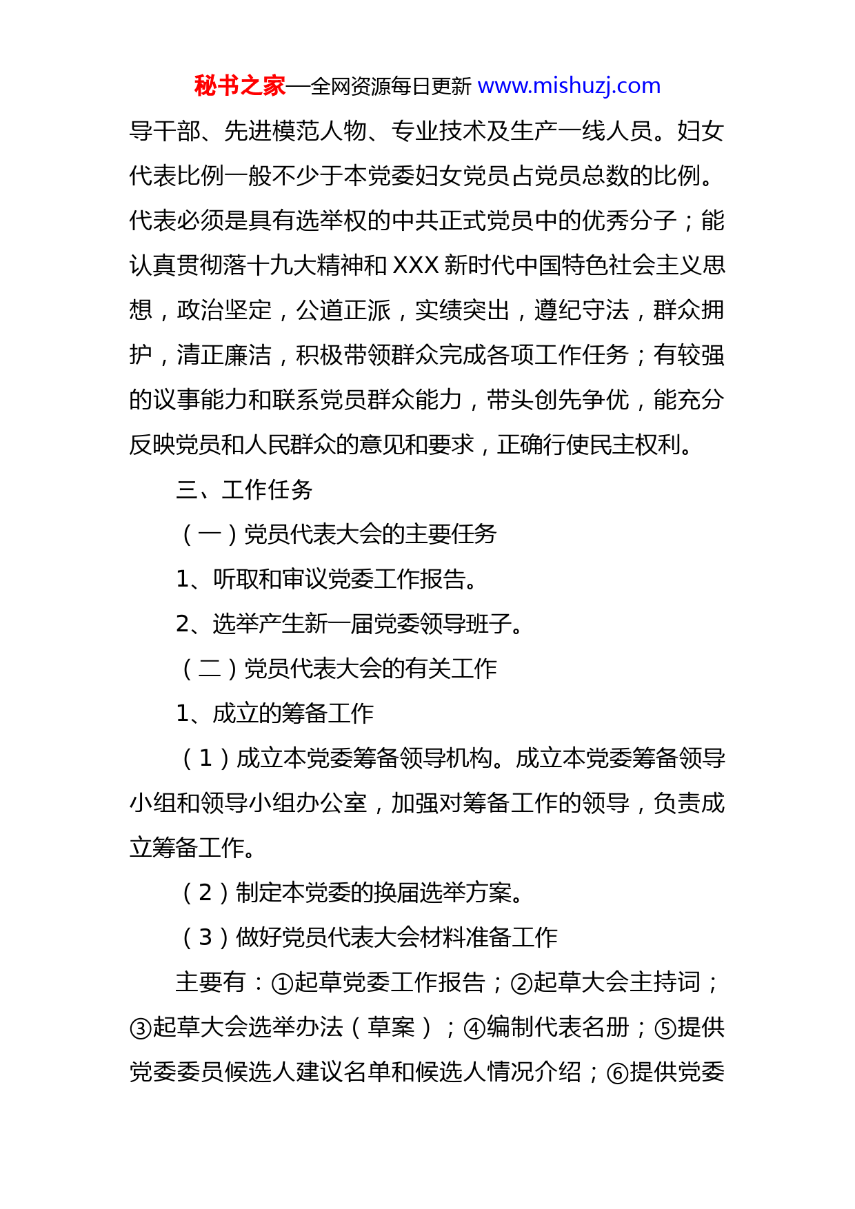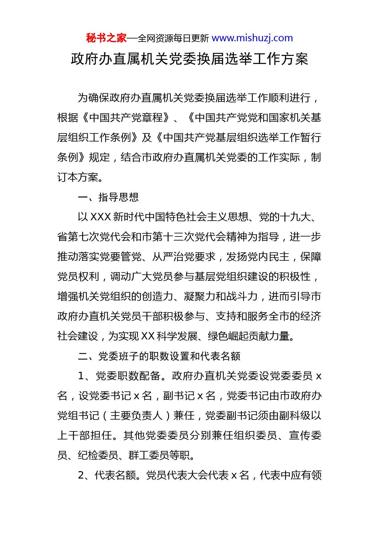 秘书之家—全网资源每日更新www.mishuzj.com政府办直属机关党委换届选举工作方案为确保政府办直属机关党委换届选举工作顺利进行,根据《中国共产党章程》、《中国共产党党和国家机关基层组织工作条例》及《中国共产党基层组织选举工作暂行条例》规定,结合市政府办直属机关党委的工作实际,制订本方案。一、指导思想以XXX新时代中国特色社会主义思想、党的十九大、省第七次党代会和市第十三次党代会精神为指导,进一步推动落实党要管党、从严治党要求,发扬党内民主,保障党员权利,调动广大党员参与基层党组织建设的积极性,增强机关党组织的创造力、凝聚力和战斗力,进而引导市政府办直机关党员干部积极参与、支持和服务全市的经济社会建设,为实现XX科学发展、绿色崛起贡献力量。二、党委班子的职数设置和代表名额1、党委职数配备。政府办直机关党委设党委委员x名,设党委书记x名,副书记x名,党委书记由市政府办党组书记(主要负责人)兼任,党委副书记须由副科级以上干部担任。其他党委委员分别兼任组织委员、宣传委员、纪检委员、群工委员等职。2、代表名额。党员代表大会代表x名,代表中应有领秘书之家—全网资源每日更新www.mishuzj.com导干部、先进模范人物、专业技术及生产一线人员。妇女代表比例一般不少于本党委妇女党员占党员总数的比例。代表必须是具有选举权的中共正式党员中的优秀分子;能认真贯彻落十九大精神和XXX新时代中国特色社会主义思想,政治坚定,公道正派,实绩突出,遵纪守法,群众拥护,清正廉洁,积极带领群众完成各项工作任务;有较强的议事能力和联系党员群众能力,带头创先争优,能充分反映党员和人民群众的意见和要求,正确行使民主权利。三、工作任务(一)党员代表大会的主要任务1、听取和审议党委工作报告。2、选举产生新一届党委领导班子。(二)党员代表大会的有关工作1、成立的筹备工作(1)成立本党委筹备领导机构。成立本党委筹备领导小组和领导小组办公室,加强对筹备工作的领导,负责成立筹备工作。(2)制定本党委的换届选举方案。(3)做好党员代表大会材料准备工作主要有:①起草党委工作报告;②起草大会主持词;③起草大会选举办法(草案);④编制代表名册;⑤提供党委委员候选人建议名单和候选人情况介绍;⑥提供党委秘书之家—全网资源每日更新www.mishuzj.com书记、副书记候选人建议名单及选举办法(草案);⑦提供选票式样和计票统计表、计票结果报告单、清点人数报告单式样。(4)培训骨干。召开各支部负责代表选举等工作有关人员参加的会议,以会代训,统一思想,统一步骤,做好代表选举等有关工作。2、代表的选举(1)划分选举单位。以支部(有总支的以总支)作为代表选举单位,整个党委划分为20个选举单位。(2)推选产生代表。首先由选举单位按照超出分配代表名额30%的人数,通过组织党员推荐和群众推荐相结合的方式酝酿提出代表候选人推荐人选,并与党委筹备领导小组沟通,提出代表候选人初步人选,在一定范围内进行公示。由选举单位召开支部委员会确定代表候选人预备人选,报党委筹备领导小组审查。最后由各选举单位召开党员大会选举产生代表,报党委筹备领导小组审批。代表选举差额比例为多于应选人数的20%。选举时,有选举权的到会人数必须超过应到会人数的80%,因年老体弱和长期生病生活不能自理的党员,经上级党组织同意,并经党员大会通过,可以不计算在应到会人数之内。根据分配名额,被选举人获得的赞成票超过到会有选举权人数的一半,始得当选。秘书之家—全网资源每日更新www.mishuzj.com3、党委候选人预备人选的呈报党委按照干部队伍“四化”方针和德才兼备、以德为先原则,召开支部书记会议,对新一届机关党委组成人员候选人初步人选进行全额定向推荐提名,集体研究提出初步人选报市直工委。党委派出考察组,对党委领导班子的初步人选进行考察。与市委组织部沟通后向市直工委呈报党委委员、书记、副书记候选人预备人选请示,并在一定范围内进行公示。党委委员候选人的差额比例不低于20%。请示一般在代表大会召开前10天呈报,市委批复后方可召开党员代表大会。4、大会的选举党委收到市委关于党委组成人员候选人预备人选的批复后,召开党员代表大会进行选举。召开党员代表大会进行换届选举,有选举权的到会人数必须超过应到会人数的80%,会议有效。党委委员由党员代表大会选举产生,党委书记、副书记由新产生的党委会第一次全体会议选举产生。5、选举结果的报批选举结束后,党委将选举结果上报市直属工委。同时,做好成立选举的总结工作和文件资料的收集、整理、归档工作。四、换届时间安排秘书之家—全网资源每日更新www.mishuzj.com市政府办直机关党委换届选举工作从20xx年x月x日开始,至x月中旬结束,时间1个半月,具体时间安排为:(一)x月x日前,制订党委成立选举工作方案。(二)x月x日前,完成党员代表大会工作报告的起草和有关筹备工作。(三)x月x日前,完成党员代表大会代表的选举及候选人初步人选确定工作。(四)x月中旬前,完成党委换届选举工作。五、工作要求(一)加强组织领导。为切实加强对党委换届选举工作的领导,成立党委筹备工作领导小组,负责指导、协调、统筹党委的成立选举工作。领导小组成员如下:组长:x副组