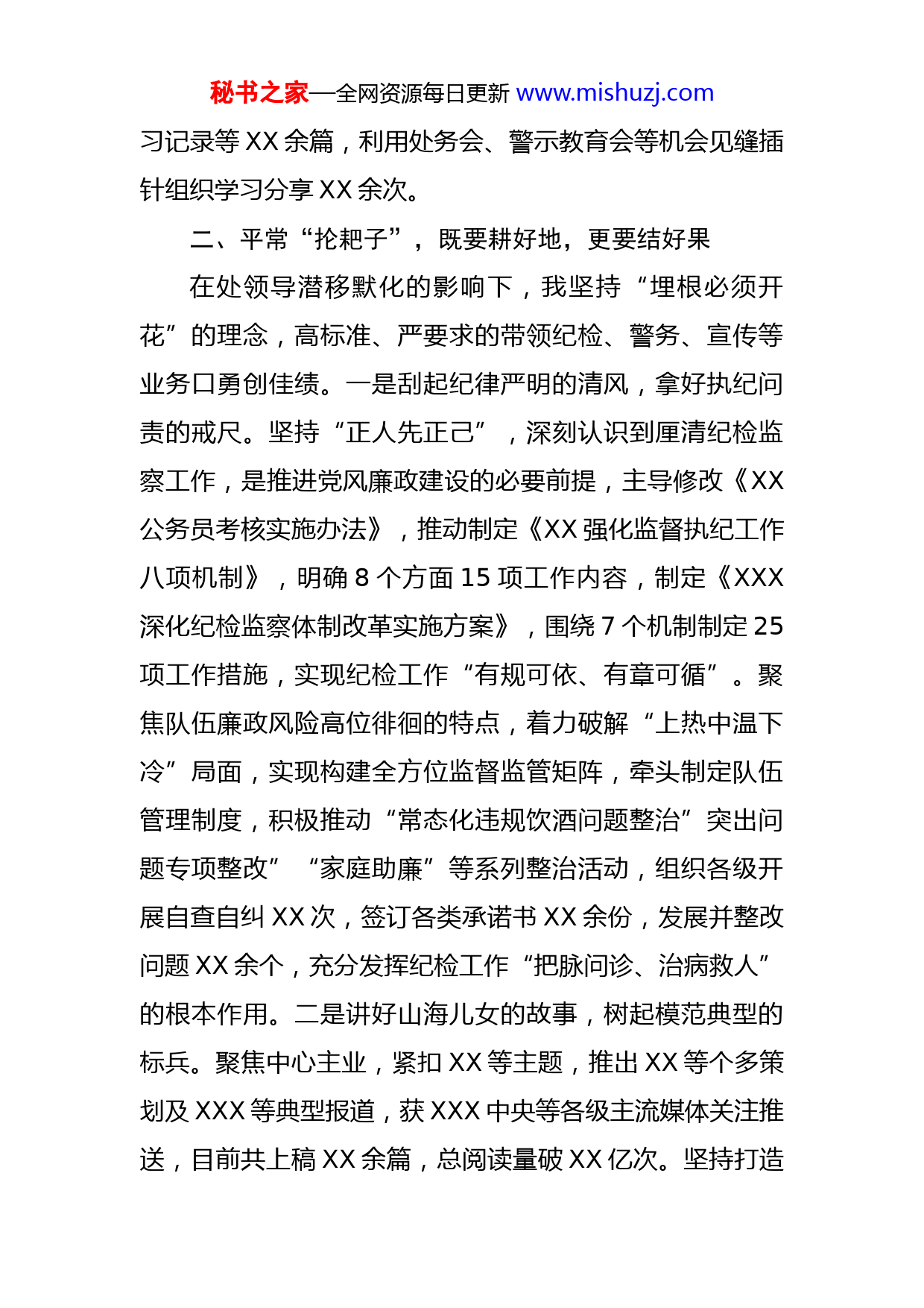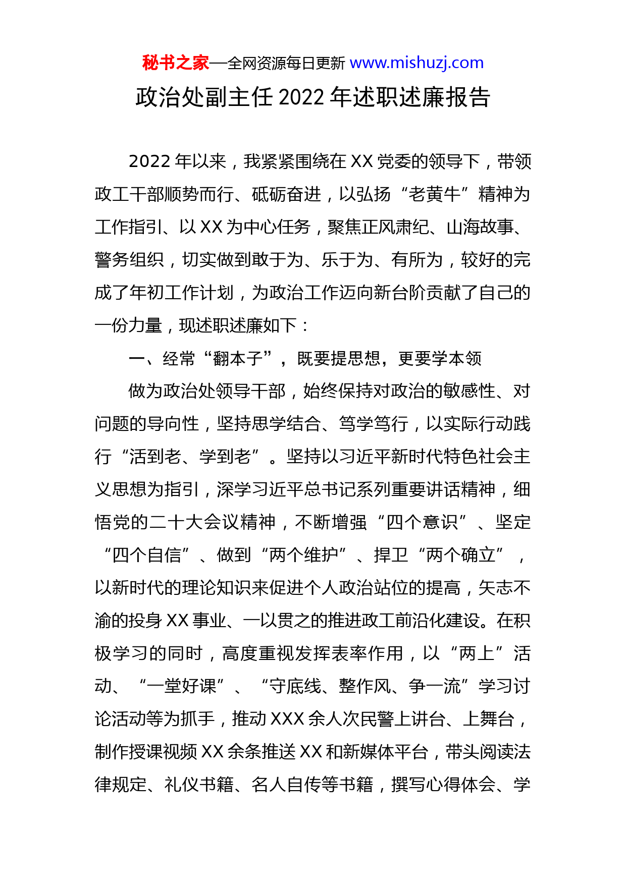 秘书之家—全网资源每日更新www.mishuzj.com政治处副主任2022年述职述廉报告2022年以来,我紧紧围绕在XX党委的领导下,带领政工干部顺势而行、砥砺奋进,以弘扬“老黄牛”精神为工作指引、以XX为中心任务,聚焦正风肃纪、山海故事、警务组织,切实做到敢于为、乐于为、有所为,较好的完成了年初工作计划,为政治工作迈向新台阶贡献了自己的一份力量,现述职述廉如下:一、经常“翻本子”,既要提思想,更要学本领做为政治处领导干部,始终保持对政治的敏感性、对问题的导向性,坚持思学结合、笃学笃行,以实际行动践行“活到老、学到老”。坚持以习近平新时代特色社会主义思想为指引,深学习近平总书记系列重要讲话精神,细悟党的二十大会议精神,不断增强“四个意识”、坚定“四个自信”、做到“两个维护”、捍卫“两个确立”,以新时代的理论知识来促进个人政治站位的提高,矢志不渝的投身XX事业、一以贯之的推进政工前沿化建设。在积极学习的同时,高度重视发挥表率作用,以“两上”活动、“一堂好课”、“守底线、整作风、争一流”学习讨论活动等为抓手,推动XXX余人次民警上讲台、上舞台,制作授课视频XX余条推送XX和新媒体平台,带头阅读法律规定、礼仪书籍、名人自传等书籍,撰写心得体会、学秘书之家—全网资源每日更新www.mishuzj.com习记录等XX余篇,利用处务会、警示教育会等机会见缝插针组织学习分享XX余次。二、平常“抡耙子”,既要耕好地,更要结好果在处领导潜移默化的影响下,我坚持“埋根必须开花”的理念,高标准、严要求的带领纪检、警务、宣传等业务口勇创佳绩。一是刮起纪律严明的清风,拿好执纪问责的戒尺。坚持“正人先正己”,深刻认识到厘清纪检监察工作,是推进党风廉政建设的必要前提,主导修改《XX公务员考核实施办法》,推动制定《XX强化监督执纪工作八项机制》,明确8个方面15项工作内容,制定《XXX深化纪检监察体制改革实施方案》,围绕7个机制制定25项工作措施,实现纪检工作“有规可依、有章可循”。聚焦队伍廉政风险高位徘徊的特点,着力破解“上热中温下冷”局面,实现构建全方位监督监管矩阵,牵头制定队伍管理制度,积极推动“常态化违规饮酒问题整治”突出问题专项整改”“家庭助廉”等系列整治活动,组织各级开展自查自纠XX次,签订各类承诺书XX余份,发展并整改问题XX余个,充分发挥纪检工作“把脉问诊、治病救人”的根本作用。二是讲好山海儿女的故事,树起模范典型的标兵。聚焦中心主业,紧扣XX等主题,推出XX等个多策划及XXX等典型报道,获XXX中央等各级主流媒体关注推送,目前共上稿XX余篇,总阅读量破XX亿次。坚持打造秘书之家—全网资源每日更新www.mishuzj.com“人文政工、温度政工、模范政工”,拍摄微电影XX获XX大赛优秀微电影奖,抖年内共XX个集体和XX名个人获各级表彰。三是吹起正规前进的号角,建好内务建设的台阶。紧跟XX专项活动脚步,推动XX落地生根、开花结果,牵头召开XX现场会,加强XX等第一批试点单位建设的带动作用,发挥XX新试点单位的引领作用,形成以点带面、层层递进、逐批推广。三、时常“照镜子”,既要守大节,更要慎小节在工作上,坚持做到“务必不忘初心、牢记使命”。自觉把党纪国法视为“高压线”,把党风廉政建设规定视为“警戒线”,积极参加专项整治活动、客观查摆不足,在权利运行的“大小山头”都自觉接受监督,积极对照各类案件通报、警示教育片、警示录书记对照检查;在生活上,坚持做到“务必谦虚谨慎、艰苦奋斗”。从不比排场、讲阔气,注重勤俭节约,崇尚简单朴素、简约健康的生活方式,严格遵守“八项规定”和廉洁从政制度,保持艰苦奋斗的作风,明大德、守公德、严私德。在交际上,坚持做到“务必敢于斗争、善于斗争”。积极履行党员监督职责,在原则问题上寸步不让、毫不动摇,坚持头脑清醒、立场坚定,不断加强思想淬炼、政治历练、实践锻炼,多捧“烫手山芋”,做到面对大是大非敢于亮剑斗争,面对歪风邪气敢于揭丑亮短。秘书之家—全网资源每日更新www.mishuzj.com不经一番寒彻骨,怎得梅花扑鼻香,一年的时间转瞬即逝,回想这一年中,工作虽有点滴收获,但还存在这一定不足,个人能力和水平的问题,还未完全达到自己的初衷和意愿。一是理论的学习滞后于工作的需要;二是知识的储备滞后于履职的需要;三是能力的提升滞后于发展的需要。下步,我将及时调整状态,重新审视自己的不足,勤勉自律、求真务实、树立“当标兵、走前列、创一流”的理念,高质量完成党委交予的各项工作任务。