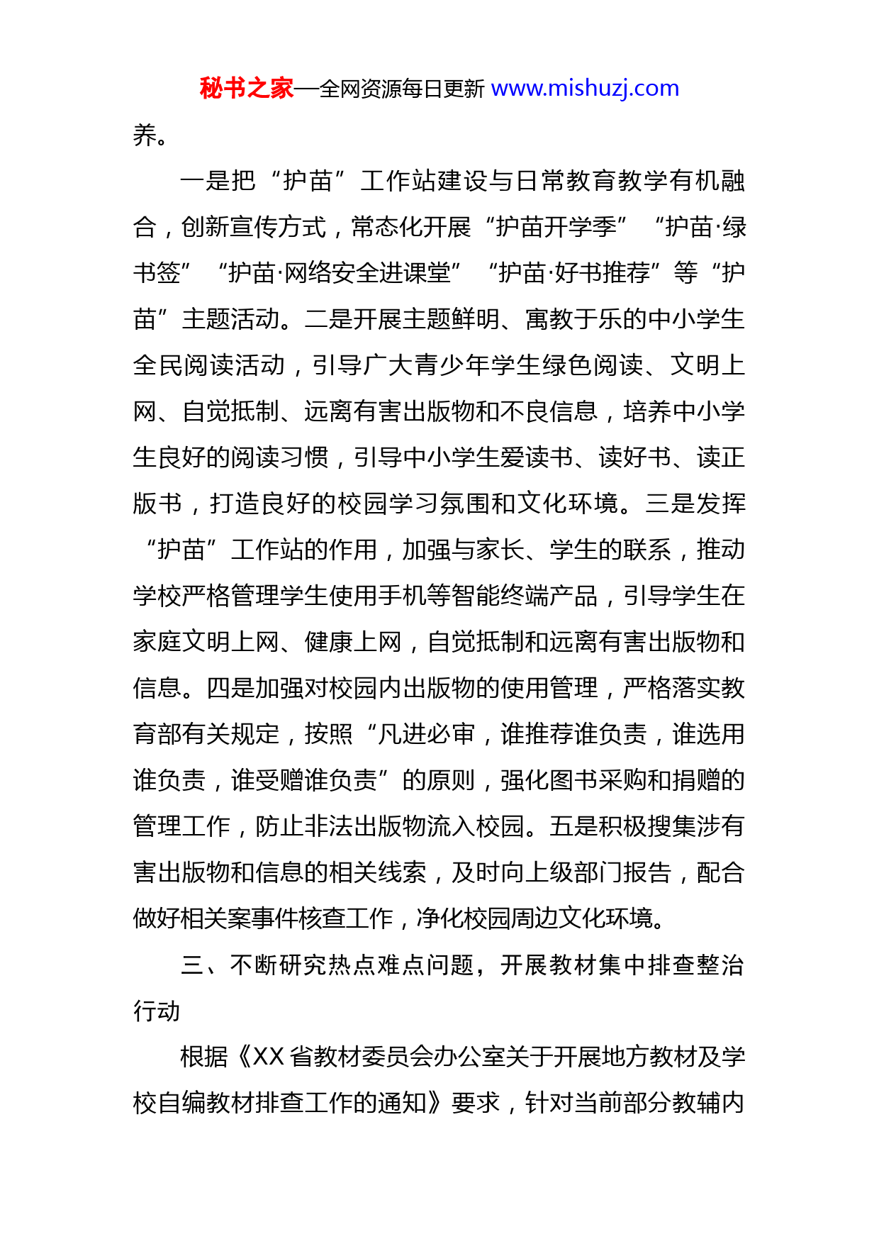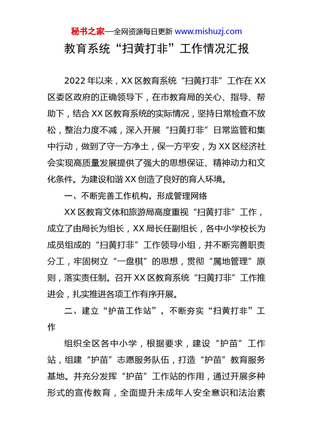 秘书之家—全网资源每日更新www.mishuzj.com教育系统“扫黄打非”工作情况汇报2022年以来,XX区教育系统“扫黄打非”工作在XX区委区政府的正确领导下,在市教育局的关心、指导、帮助下,结合XX区教育系统的实际情况,坚持日常检查不放松,整治力度不减,深入开展“扫黄打非”日常监管和集中行动,做到了守一方净土,保一方平安,为XX区经济社会实现高质量发展提供了强大的思想保证、精神动力和文化条件。为建设和谐XX创造了良好的育人环境。一、不断完善工作机构,形成管理网络XX区教育文体和旅游局高度重视“扫黄打非”工作,成立了由局长为组长,XX局长任副组长,各中小学校长为成员组成的“扫黄打非”工作领导小组,并不断完善职责分工,牢固树立“一盘棋”的思想,贯彻“属地管理”原则,落实责任制。召开XX区教育系统“扫黄打非”工作推进会,扎实推进各项工作有序开展。二、建立“护苗工作站”,不断夯实“扫黄打非”工作组织全区各中小学,根据要求,建设“护苗”工作站,组建“护苗”志愿服务队伍,打造“护苗”教育服务基地。并充分发挥“护苗”工作站的作用,通过开展多种形式的宣传教育,全面提升未成年人安全意识和法治素秘书之家—全网资源每日更新www.mishuzj.com养。一是把“护苗”工作站建设与日常教育教学有机融合,创新宣传方式,常态化开展“护苗开学季”“护苗·绿书签”“护苗·网络安全进课堂”“护苗·好书推荐”等“护苗”主题活动。二是开展主题鲜明、寓教于乐的中小学生全民阅读活动,引导广大青少年学生绿色阅读、文明上网、自觉抵制、远离有害出版物和不良信息,培养中小学生良好的阅读习惯,引导中小学生爱读书、读好书、读正版书,打造良好的校园学习氛围和文化环境。三是发挥“护苗”工作站的作用,加强与家长、学生的联系,推动学校严格管理学生使用手机等智能终端产品,引导学生在家庭文明上网、健康上网,自觉抵制和远离有害出版物和信息。四是加强对校园内出版物的使用管理,严格落实教育部有关规定,按照“凡进必审,谁推荐谁负责,谁选用谁负责,谁受赠谁负责”的原则,强化图书采购和捐赠的管理工作,防止非法出版物流入校园。五是积极搜集涉有害出版物和信息的相关线索,及时向上级部门报告,配合做好相关案事件核查工作,净化校园周边文化环境。三、不断研究热点难点问题,开展教材集中排查整治行动根据《XX省教材委员会办公室关于开展地方教材及学校自编教材排查工作的通知》要求,针对当前部分教辅内秘书之家—全网资源每日更新www.mishuzj.com容、插图等反映的问题读物线索,我区教育系统积极组织开展中小学教材、教辅以及中小学校园课外读物排查整改工作。经排查,我区没有自编出版的教材,不存在已列入本地本校课外读物推荐目录的问题读物,学校671707册藏书也不存在问题。四、不断加大宣传教育,营造“扫黄打非”的浓厚氛围XX区教育系统扎实开展2022年“绿书签行动”系列宣传活动。各校通过国旗下讲话、校园广播,张贴宣传海报,同时利用LED屏幕滚动宣传标语等方式讲解了“绿书签”的寓意,广泛宣传保护知识产权意识,增强了师生法律意识,坚持购买使用正版书籍,珍惜绿色读书环境,争做净化校园文化环境的先锋。组织开展“绿书签、伴成长”专题阅读交流活动,召开“护助少年儿童健康成长,拒绝有害出版物及信息”主题班会,组织收看“家庭教育护苗行动”大讲堂活动。据统计,2022年以来,我区教育系统运用LED显示屏滚动播放宣传标语5000分钟,张贴海报400张,师生参与人数达1万人次。推动了“护苗”行动更加深入、扎实开展,收到了良好的效果。五、下一步工作计划(一)坚持抓好“扫黄打非”工作。继续开展好“双随机、一公开”监管和日常监管工作,加强“扫黄打非”秘书之家—全网资源每日更新www.mishuzj.com工作宣传,营造良好的社会舆论氛围。督促各经营业主做好出版物经营许可证的办理,重点做好XX区委宣传部相关协调工作。继续加大非法经营新闻出版物的查处力度。(二)狠抓落实“打假治敲”工作。扎实推进“打假治敲”工作机制,强化网络舆情分析研判机制的落实,加强网络治理,强化网络舆论管理,及时研判涉我区假记者、假新闻情况,做好重要节点和敏感时期的舆论监管,加强分析研判有可能形成的假新闻、突发事件,抢占网络舆论先机。(三)强化“软件正版化”宣传。依据相关文件精神,进行版权执法、印刷企业巡查和软件正版化宣传,并对其中不完善之处逐步改善。组织干部职工学习软件正版化相关通知精神,进一步强化人员使用正版软件的意识。