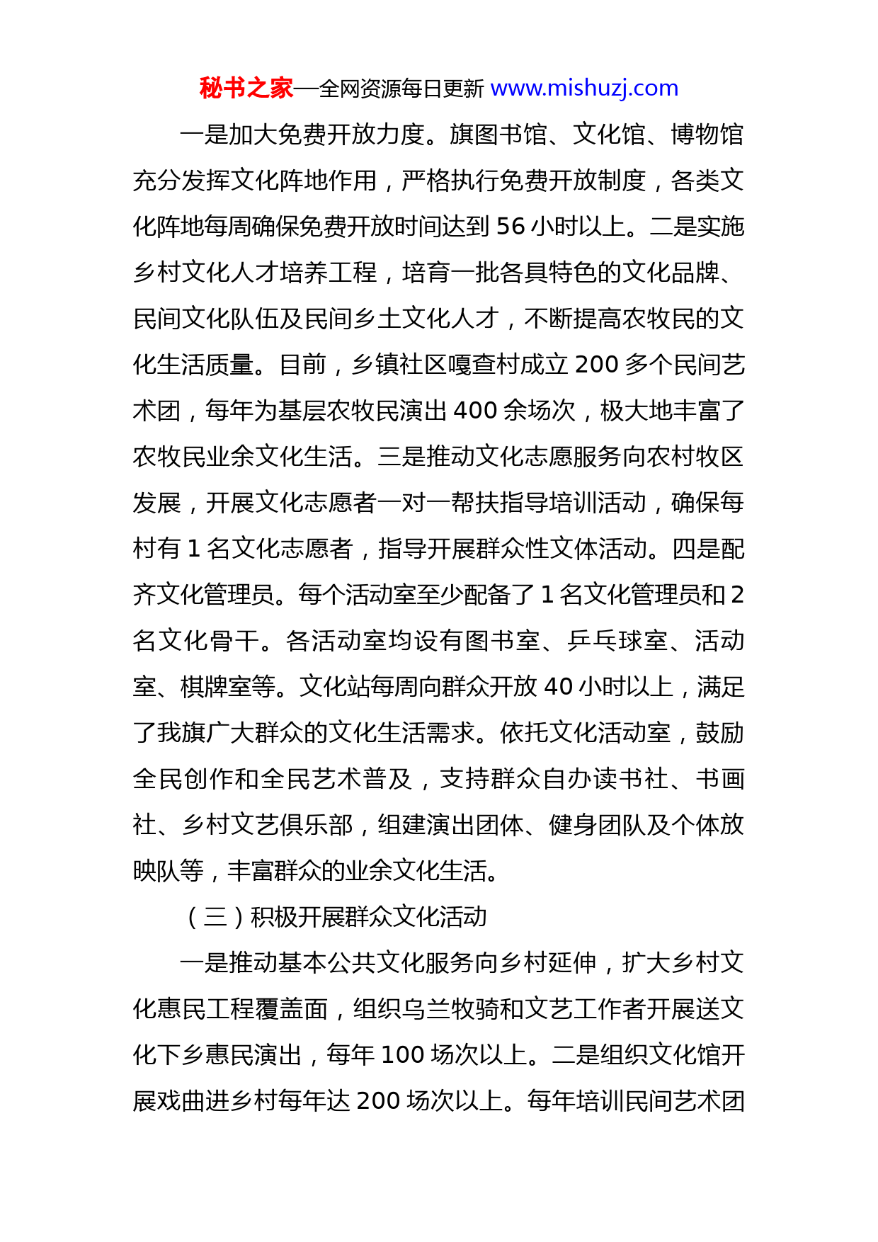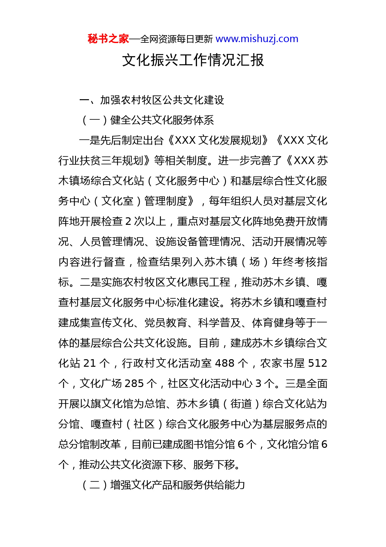 秘书之家—全网资源每日更新www.mishuzj.com文化振兴工作情况汇报一、加强农村牧区公共文化建设(一)健全公共文化服务体系一是先后制定出台《XXX文化发展规划》《XXX文化行业扶贫三年规划》等相关制度。进一步完善了《XXX苏木镇场综合文化站(文化服务中心)和基层综合性文化服务中心(文化室)管理制度》,每年组织人员对基层文化阵地开展检查2次以上,重点对基层文化阵地免费开放情况、人员管理情况、设施设备管理情况、活动开展情况等内容进行督查,检查结果列入苏木镇(场)年终考核指标。二是实施农村牧区文化惠民工程,推动苏木乡镇、嘎查村基层文化服务中心标准化建设。将苏木乡镇和嘎查村建成集宣传文化、党员教育、科学普及、体育健身等于一体的基层综合公共文化设施。目前,建成苏木乡镇综合文化站21个,行政村文化活动室488个,农家书屋512个,文化广场285个,社区文化活动中心3个。三是全面开展以旗文化馆为总馆、苏木乡镇(街道)综合文化站为分馆、嘎查村(社区)综合文化服务中心为基层服务点的总分馆制改革,目前已建成图书馆分馆6个,文化馆分馆6个,推动公共文化资源下移、服务下移。(二)增强文化产品和服务供给能力秘书之家—全网资源每日更新www.mishuzj.com一是加大免费开放力度。旗图书馆、文化馆、博物馆充分发挥文化阵地作用,严格执行免费开放制度,各类文化阵地每周确保免费开放时间达到56小时以上。二是实施乡村文化人才培养工程,培育一批各具特色的文化品牌、民间文化队伍及民间乡土文化人才,不断提高农牧民的文化生活质量。目前,乡镇社区嘎查村成立200多个民间艺术团,每年为基层农牧民演出400余场次,极大地丰富了农牧民业余文化生活。三是推动文化志愿服务向农村牧区发展,开展文化志愿者一对一帮扶指导培训活动,确保每村有1名文化志愿者,指导开展群众性文体活动。四是配齐文化管理员。每个活动室至少配备了1名文化管理员和2名文化骨干。各活动室均设有图书室、乒乓球室、活动室、棋牌室等。文化站每周向群众开放40小时以上,满足了我旗广大群众的文化生活需求。依托文化活动室,鼓励全民创作和全民艺术普及,支持群众自办读书社、书画社、乡村文艺俱乐部,组建演出团体、健身团队及个体放映队等,丰富群众的业余文化生活。(三)积极开展群众文化活动一是推动基本公共文化服务向乡村延伸,扩大乡村文化惠民工程覆盖面,组织乌兰牧骑和文艺工作者开展送文化下乡惠民演出,每年100场次以上。二是组织文化馆开展戏曲进乡村每年达200场次以上。每年培训民间艺术团秘书之家—全网资源每日更新www.mishuzj.com不少于50次、2000余人。三是定期开展送图书下乡活动。每年向农村牧区的草原书屋补充配送科普类、文学类、法律类、地情乡土文化类等农村实用、农民喜爱的图书月1万册。四是繁荣农村题材文艺作品。结合“深入生活、扎根人民”等主题实践活动,运用文化“三下乡”、文化进万家、送欢乐下基层等平台,积极开展文艺精品创作。近年来,以乡村振兴、铸牢中华民族共同体意识、党的百年奋斗历史等为主题创作文艺精品80余个。(四)繁荣发展乡村文旅产业一是将A级景区提档升级,带动周边村庄发展乡村旅游,促进村民增加收入。组织XXX文化旅游区创建国家5A级旅游景区,组织XXX草原旅游区、XXX遗址公园创建4A级旅游景区。我局对XXX草原旅游区、XXX公园相关申报材料已审核指导并上报市局,XXX文化旅游区正在推进前期工作。二是组织申报旅游小镇。组织申报花吐古拉镇、舍伯吐镇为旅游小镇,已向XXX文旅广电局提出申请,正在组织申报材料。景区提档升级和旅游小镇的申报都是为了吸引更多游客来此游玩,带动周边村庄发展乡村旅游,促进村民增加收入,促进XXX文旅融合。三是积极创建乡村旅游重点村。推进通辽市等嘎查村发展乡村旅游,支持民宿、农家乐等农旅服务设施建设,积极创建全国乡村旅游重点村,扩大特色乡村知名度。我旗有自治区4秘书之家—全网资源每日更新www.mishuzj.com星级乡村旅游接待户一家:胜利农家饭庄,3星级乡村旅游接待户一家:丰库休闲渔岛;正在组织牧民之家(位于XXXXXX牧场)申报3星级接待户。四是促进民族民间传统工艺产业发展,积极推进刺绣、版画等传统工艺生产和传习,力争走出一条社会效益和经济效益双赢之路。二、传承弘扬优秀传统文化(一)大力扶持中华优秀传统文化的传承和发展一是将保护传承弘扬中华优秀传统文化工作纳入XXX“十四五”总体规划,将保护传承弘扬中华优秀传统文化工作经费、文化宣传推广经费纳入经费预算,统筹文化保护传承等专项资金,为推动中华优秀传统文化传承发展提供有力支撑。二是积极推进文化品牌建设。充分发挥全旗文化资源优势,健全优秀传统文化传承体系,实现创造性转化、创新性发展,推进科尔沁草原文化品牌体系建设。目前,以XXX、哈民遗址、XXX草原旅游区等为依托,积极打造提升“8.18”赛马节、达尔罕赛牛节等体现民俗风情的群众文化活动品牌效应,着力打造一批具有左中地域特色的文化艺术名片。三是深入挖掘哈民史前聚落遗址文化价值,组织开展西辽河文明探源工程。通过与北京大学、内蒙古民族大学等高校进行研学合作,深入开展西辽河文明探源工程,将探索各民族融合发展的起源追溯到
