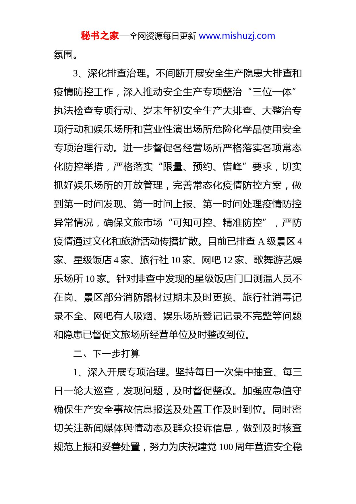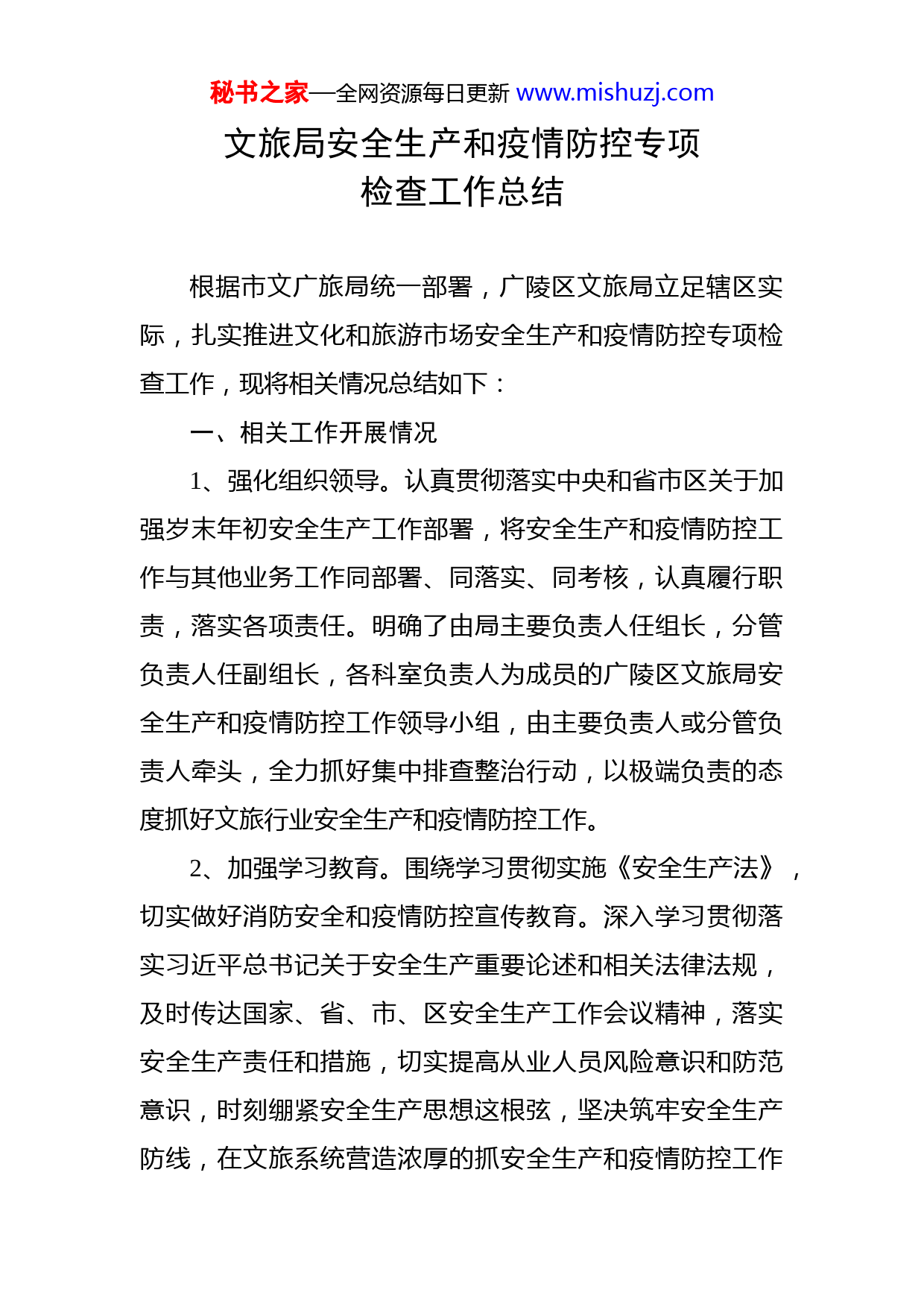 秘书之家—全网资源每日更新www.mishuzj.com文旅局安全生产和疫情防控专项检查工作总结根据市文广旅局统一部署,广陵区文旅局立足辖区实际,扎实推进文化和旅游市场安全生产和疫情防控专项检查工作,现将相关情况总结如下:一、相关工作开展情况1、强化组织领导。认真贯彻落实中央和省市区关于加强岁末年初安全生产工作部署,将安全生产和疫情防控工作与其他业务工作同部署、同落实、同考核,认真履行职责,落实各项责任。明确了由局主要负责人任组长,分管负责人任副组长,各科室负责人为成员的广陵区文旅局安全生产和疫情防控工作领导小组,由主要负责人或分管负责人牵头,全力抓好集中排查整治行动,以极端负责的态度抓好文旅行业安全生产和疫情防控工作。2、加强学习教育。围绕学习贯彻实施《安全生产法》,切实做好消防安全和疫情防控宣传教育。深入学习贯彻落实习近平总书记关于安全生产重要论述和相关法律法规,及时传达国家、省、市、区安全生产工作会议精神,落实安全生产责任和措施,切实提高从业人员风险意识和防范意识,时刻绷紧安全生产思想这根弦,坚决筑牢安全生产防线,在文旅系统营造浓厚的抓安全生产和疫情防控工作秘书之家—全网资源每日更新www.mishuzj.com氛围。3、深化排查治理。不间断开展安全生产隐患大排查和疫情防控工作,深入推动安全生产专项整治“三位一体”执法检查专项行动、岁末年初安全生产大排查、大整治专项行动和娱乐场所和营业性演出场所危险化学品使用安全专项治理行动。进一步督促各经营场所严格落实各项常态化防控举措,严格落实“限量、预约、错峰”要求,切实抓好娱乐场所的开放管理,完善常态化疫情防控方案,做到第一时间发现、第一时间上报、第一时间处理疫情防控异常情况,确保文旅市场“可知可控、精准防控”,严防疫情通过文化和旅游活动传播扩散。目前已排查A级景区4家、星级饭店4家、旅行社10家、网吧12家、歌舞游艺娱乐场所10家。针对排查中发现的星级饭店门口测温人员不在岗、景区部分消防器材过期未及时更换、旅行社消毒记录不全、网吧有人吸烟、娱乐场所登记记录不完整等问题和隐患已督促文旅场所经营单位及时整改到位。二、下一步打算1、深入开展专项治理。坚持每日一次集中抽查、每三日一轮大巡查,发现问题,及时督促整改。加强应急值守确保生产安全事故信息报送及处置工作及时到位。同时密切关注新闻媒体舆情动态及群众投诉信息,做到及时核查规范上报和妥善处置,努力为庆祝建党100周年营造安全稳秘书之家—全网资源每日更新www.mishuzj.com定的环境。2、落实企业主体责任。进一步强化安全监管工作,帮助企业筑牢安全生产防线。与文旅市场经营单位安全生产责任书以及消防安全自查承诺书,全面压紧压实安全生产主体责任。督促星级酒店在餐饮卫生、用电安全、防火等方面严格规范操作,特别是对外包的经营项目落实好安全生产责任制度。旅行社规范旅游安全用车、提示游客做好旅游途中各项安全防范措施。提醒A级景区在重要时间节点、重大节日期间做好游客流量控制工作。指导网吧及娱乐场所建立健全消防安全责任制,严格落实场内巡查制度特别是对未成年人要严格管控,促进监管工作向规范化和常态化发展。3、加强部门协作配合。密切与消防、应急管理、属地等部门之间的协作,强化信息共享,努力构建安全监管联动体系。同时整合基层安监力量,充分发挥乡镇、街道社会事业部门的作用,上下联动积极开展安全隐患排查,努力形成各方配合、齐抓共管的监管合力。4、抓好督促整改落实。及时对整改落实情况进行“回头看”,及时化解安全风险,消除安全隐患,提升火灾防控能力,形成闭环管理。建立完善隐患问题台账、整理检查资料、整改资料和简报信息等排查整治相关资料,及时汇总上报相关内容,不断促进全区文旅行业安全生产和疫秘书之家—全网资源每日更新www.mishuzj.com情防控形势持续稳定好转,全力营造安全稳定的文旅环境。