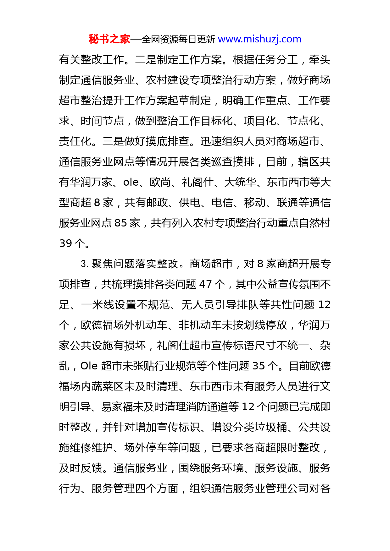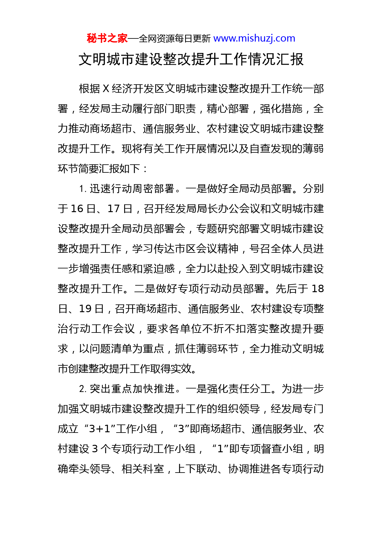 秘书之家—全网资源每日更新www.mishuzj.com文明城市建设整改提升工作情况汇报根据X经济开发区文明城市建设整改提升工作统一部署,经发局主动履行部门职责,精心部署,强化措施,全力推动商场超市、通信服务业、农村建设文明城市建设整改提升工作。现将有关工作开展情况以及自查发现的薄弱环节简要汇报如下:1.迅速行动周密部署。一是做好全局动员部署。分别于16日、17日,召开经发局局长办公会议和文明城市建设整改提升全局动员部署会,专题研究部署文明城市建设整改提升工作,学习传达市区会议精神,号召全体人员进一步增强责任感和紧迫感,全力以赴投入到文明城市建设整改提升工作。二是做好专项行动动员部署。先后于18日、19日,召开商场超市、通信服务业、农村建设专项整治行动工作会议,要求各单位不折不扣落实整改提升要求,以问题清单为重点,抓住薄弱环节,全力推动文明城市创建整改提升工作取得实效。2.突出重点加快推进。一是强化责任分工。为进一步加强文明城市建设整改提升工作的组织领导,经发局专门成立“3+1”工作小组,“3”即商场超市、通信服务业、农村建设3个专项行动工作小组,“1”即专项督查小组,明确牵头领导、相关科室,上下联动、协调推进各专项行动秘书之家—全网资源每日更新www.mishuzj.com有关整改工作。二是制定工作方案。根据任务分工,牵头制定通信服务业、农村建设专项整治行动方案,做好商场超市整治提升工作方案起草制定,明确工作重点、工作要求、时间节点,做到整治工作目标化、项目化、节点化、责任化。三是做好摸底排查。迅速组织人员对商场超市、通信服务业网点等情况开展各类巡查摸排,目前,辖区共有华润万家、ole、欧尚、礼阁仕、大统华、东市西市等大型商超8家,共有邮政、供电、电信、移动、联通等通信服务业网点85家,共有列入农村专项整治行动重点自然村39个。3.聚焦问题落实整改。商场超市,对8家商超开展专项排查,共梳理摸排各类问题47个,其中公益宣传氛围不足、一米线设置不规范、无人员引导排队等共性问题12个,欧德福场外机动车、非机动车未按划线停放,华润万家公共设施有损坏,礼阁仕超市宣传标语尺寸不统一、杂乱,Ole超市未张贴行业规范等个性问题35个。目前欧德福场内蔬菜区未及时清理、东市西市未有服务人员进行文明引导、易家福未及时清理消防通道等12个问题已完成即时整改,并针对增加宣传标识、增设分类垃圾桶、公共设施维修维护、场外停车等问题,已要求各商超限时整改,及时反馈。通信服务业,围绕服务环境、服务设施、服务行为、服务管理四个方面,组织通信服务业管理公司对各秘书之家—全网资源每日更新www.mishuzj.com自网点存在问题开展自查,累计梳理上报问题15个(缺少意见簿、门口停车不规范、缺失公益广告)。针对梳理问题,经发局提出了限期整改措施,要求严格按照要求整改到位。同时,组织人员对邮政东绛支局、华庄邮政营业厅、中国电信东绛营业厅等5个网点开展专项检查,排查出缺少残疾人及老年人等特殊人群优先台席、业务单页海报排放杂乱等共性问题,均已现场要求整改。农村建设专项行动,对辖区涉农社区自然村情况开展摸排,发现部分涉农社区未在显著位置设立文明城市建设宣传内容和村规民约,10条重点河道入河排污口情况不明,华庄街道双茂、周潭社区寿水湾、钱龙桥、周潭小学以及立信大道与具区路口西北侧等部分自然村存在垃圾露天堆放现象,外来蔬菜种植户临时生活点周边环境脏乱差等问题,并通知相关街道社区及时进行整改。下阶段,经发局将重点做好以下四个方面工作:一是加大宣传的力度。针对宣传氛围不浓、宣传标语杂乱等问题,待宣传部门统一发放宣传资料后,增加公益广告、宣传海报覆盖率,不断提高市民对文明城市创建工作的支持率、参与度和满意度,形成文明城市创建的浓厚氛围。二是加大排查的力度。采取明察暗访等形式,进一步加大问题梳理排查,督促各单位、网点列出整改清单,落秘书之家—全网资源每日更新www.mishuzj.com细落实任务。三是加大整改的力度。对在整改发现的问题逐条分析,对无法独立解决的难点问题,及时反馈各相关部门,有效推进问题解决,确保整改问题及时清零,不留空白。四是形成长效管理。把解决问题与建章立制结合起来,在推动化解问题的同时,总结固化形成相应的常态工作机制,从根本上解决问题。