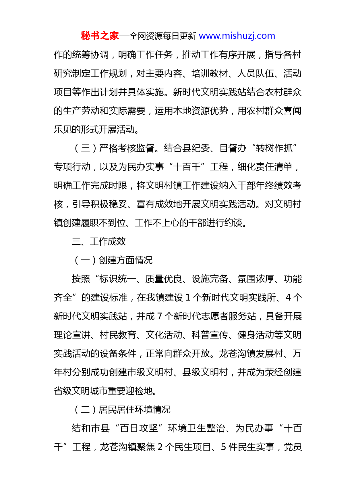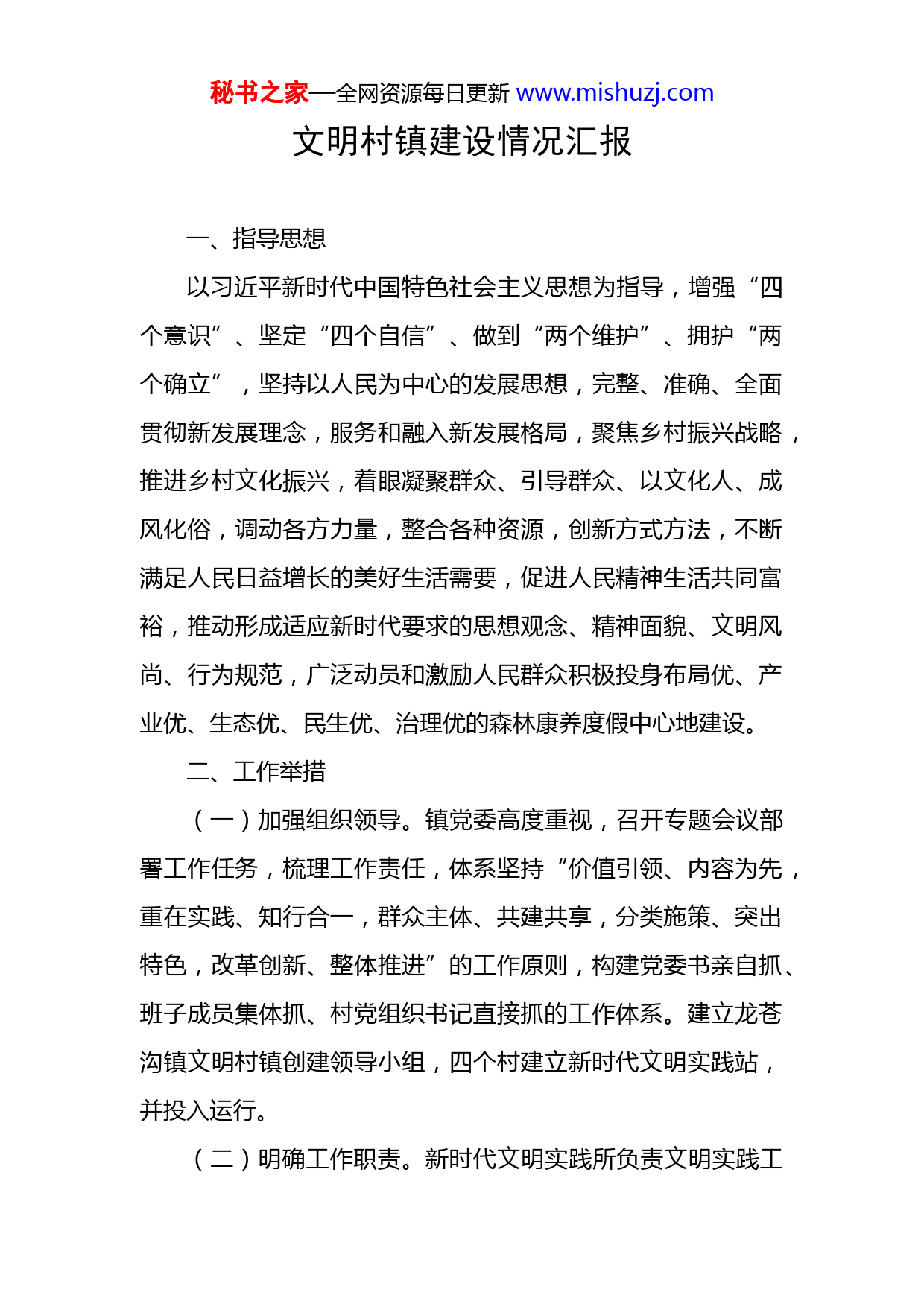 秘书之家—全网资源每日更新www.mishuzj.com文明村镇建设情况汇报一、指导思想以习近平新时代中国特色社会主义思想为指导,增强“四个意识”、坚定“四个自信”、做到“两个维护”、拥护“两个确立”,坚持以人民为中心的发展思想,完整、准确、全面贯彻新发展理念,服务和融入新发展格局,聚焦乡村振兴战略,推进乡村文化振兴,着眼凝聚群众、引导群众、以文化人、成风化俗,调动各方力量,整合各种资源,创新方式方法,不断满足人民日益增长的美好生活需要,促进人民精神生活共同富裕,推动形成适应新时代要求的思想观念、精神面貌、文明风尚、行为规范,广泛动员和激励人民群众积极投身布局优、产业优、生态优、民生优、治理优的森林康养度假中心地建设。二、工作举措(一)加强组织领导。镇党委高度重视,召开专题会议部署工作任务,梳理工作责任,体系坚持“价值引领、内容为先,重在实践、知行合一,群众主体、共建共享,分类施策、突出特色,改革创新、整体推进”的工作原则,构建党委书亲自抓、班子成员集体抓、村党组织书记直接抓的工作体系。建立龙苍沟镇文明村镇创建领导小组,四个村建立新时代文明实践站,并投入运行。(二)明确工作职责。新时代文明实践所负责文明实践工秘书之家—全网资源每日更新www.mishuzj.com作的统筹协调,明确工作任务,推动工作有序开展,指导各村研究制定工作规划,对主要内容、培训教材、人员队伍、活动项目等作出计划并具体实施。新时代文明实践站结合农村群众的生产劳动和实际需要,运用本地资源优势,用农村群众喜闻乐见的形式开展活动。(三)严格考核监督。结合县纪委、目督办“转树作抓”专项行动,以及为民办实事“十百千”工程,细化责任清单,明确工作完成时限,将文明村镇工作建设纳入干部年终绩效考核,引导积极稳妥、富有成效地开展文明实践活动。对文明村镇创建履职不到位、工作不上心的干部进行约谈。三、工作成效(一)创建方面情况按照“标识统一、质量优良、设施完备、氛围浓厚、功能齐全”的建设标准,在我镇建设1个新时代文明实践所、4个新时代文明实践站,并成7个新时代志愿者服务站,具备开展理论宣讲、村民教育、文化活动、科普宣传、健身活动等文明实践活动的设备条件,正常向群众开放。龙苍沟镇发展村、万年村分别成功创建市级文明村、县级文明村,并成为荥经创建省级文明城市重要迎检地。(二)居民居住环境情况结和市县“百日攻坚”环境卫生整治、为民办事“十百千”工程,龙苍沟镇聚焦2个民生项目、5件民生实事,党员秘书之家—全网资源每日更新www.mishuzj.com干部坚持用心、用情解决群众民生痛点、堵点、难点,切实提高群众的幸福感、获得感。2022年龙苍沟镇硬化到7.5公里、黑化道路3.1公里,改造货物集散点1个、完成2个旅游厕所改造提升,新修扩建3个旅游停车场。坚持党员示范干,65家农家乐实现全覆盖门前三清三包,积极发挥新时代文明实践志愿者、熊猫卫生作用,清理河道2条、游步道4.8公里。在万年村、经河村新安装路灯70余盏,新修垃圾池5个;发展村建立旅游康养小医院1个,结合一网打天下网格员体系,对基础设施进行常态化维护。(三)活动载体方面情况以“我们的节日”为主线,在节庆期间组织开展书画摄影展览、文艺演出、专题朗诵、演讲比赛等系列文化活动。通过群众听得懂、记得住、用得好、留得住的方式和内容,既学习又实践,既明理又躬行,高质量常态化开展受欢迎的实践服务活动。建立4个农家书屋、2个儿童之家,增订2000余册种植养殖、科学、儿童、园艺图书,满足群众日常学习、文化活动开展的需要。(四)乡风民风方面情况龙苍沟镇推动镇风民风方面建设,广泛开展社会主义核心价值观宣传教育方面,通过个人自觉参评、邻里之间互评、文明实践小组审核、村两委审批的全方位评选模式,积极树立“龙苍沟镇好人、5好家庭、文明农户”典型,进而在全镇构秘书之家—全网资源每日更新www.mishuzj.com成崇尚先进、学先进、追随先进的良好风尚,逐渐构成“乡风文明”的浓厚氛围。四、文明村镇创建经验总结(一)两级联动,绘就文明实践施工图按照“两级设置、试点先行、城乡统筹、稳步推进”工作思路,成立镇村文明村镇创建两级组织机构,将文明村镇创建建设作为“一把手工程”,形成两级书记亲自抓的工作格局。一是细安排。及时召开相关会议,对新时代文明实践工作进行安排部署,成立领导小组,统一指导、协调推进工作。二是建机制。建立文明实践所(站)规范管理、文化活动、工作内容、职责等机制,推动新时代文明实践工作规范化、制度化。同时,将新时代文明实践工作纳入年终考核,以考核促落实,以督办促实效。(二)多维整合,打造文明实践大矩阵龙苍沟镇坚持以凝聚共识促共建为抓手,以党群服务中心为载体,合力做好新时代文明实践工作。一是强化措施,筑牢阵地。坚持“党委推动、党员带动、党群联动”原则,着力打造立体化新时代文明实践阵地。二是整合资源,建好队伍。依托现有公共文化服务体系,成立1支以主要领导为队长的综合队伍,开展理论宣讲、科普宣传、疫情防控、防汛减灾等文明实践活动。(三)探索创新,传递文明实践好声音秘书之家—全网资源每日更新www.mishuzj.com围绕新时代文明实践“六传六
