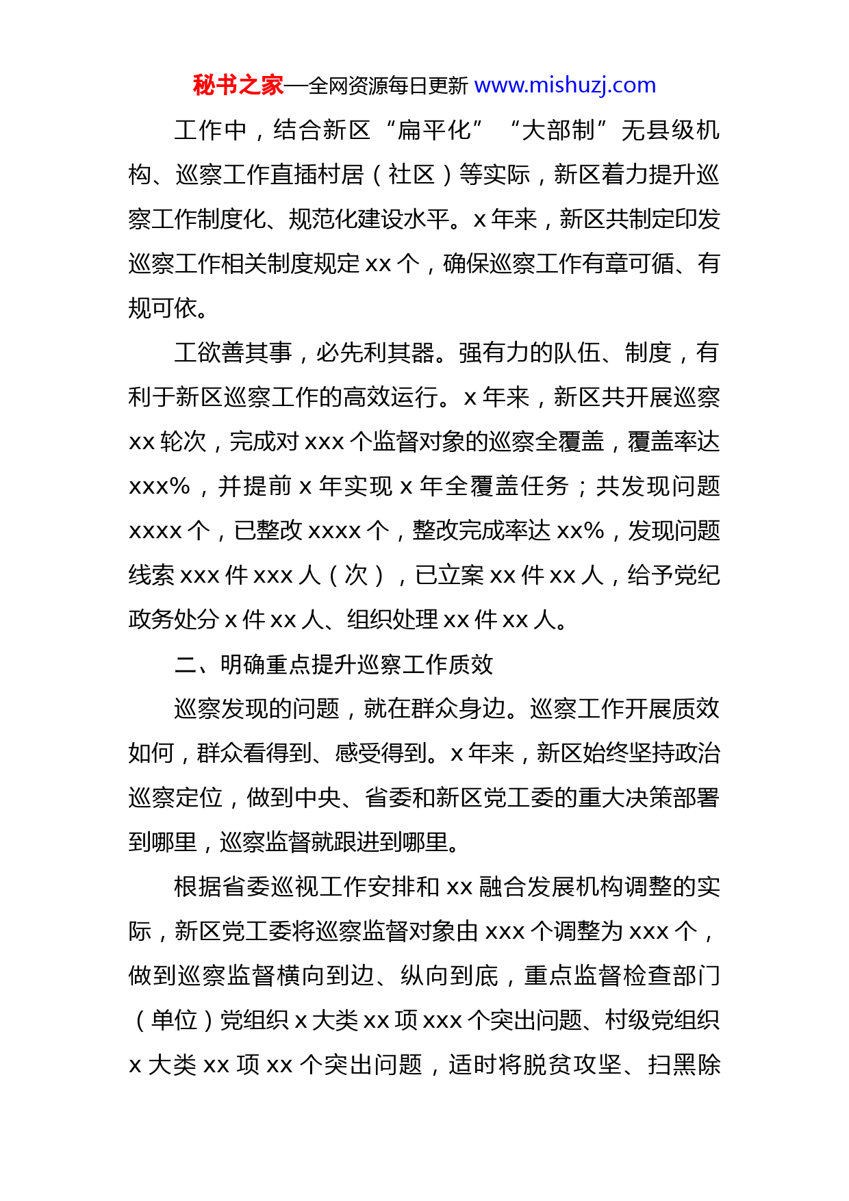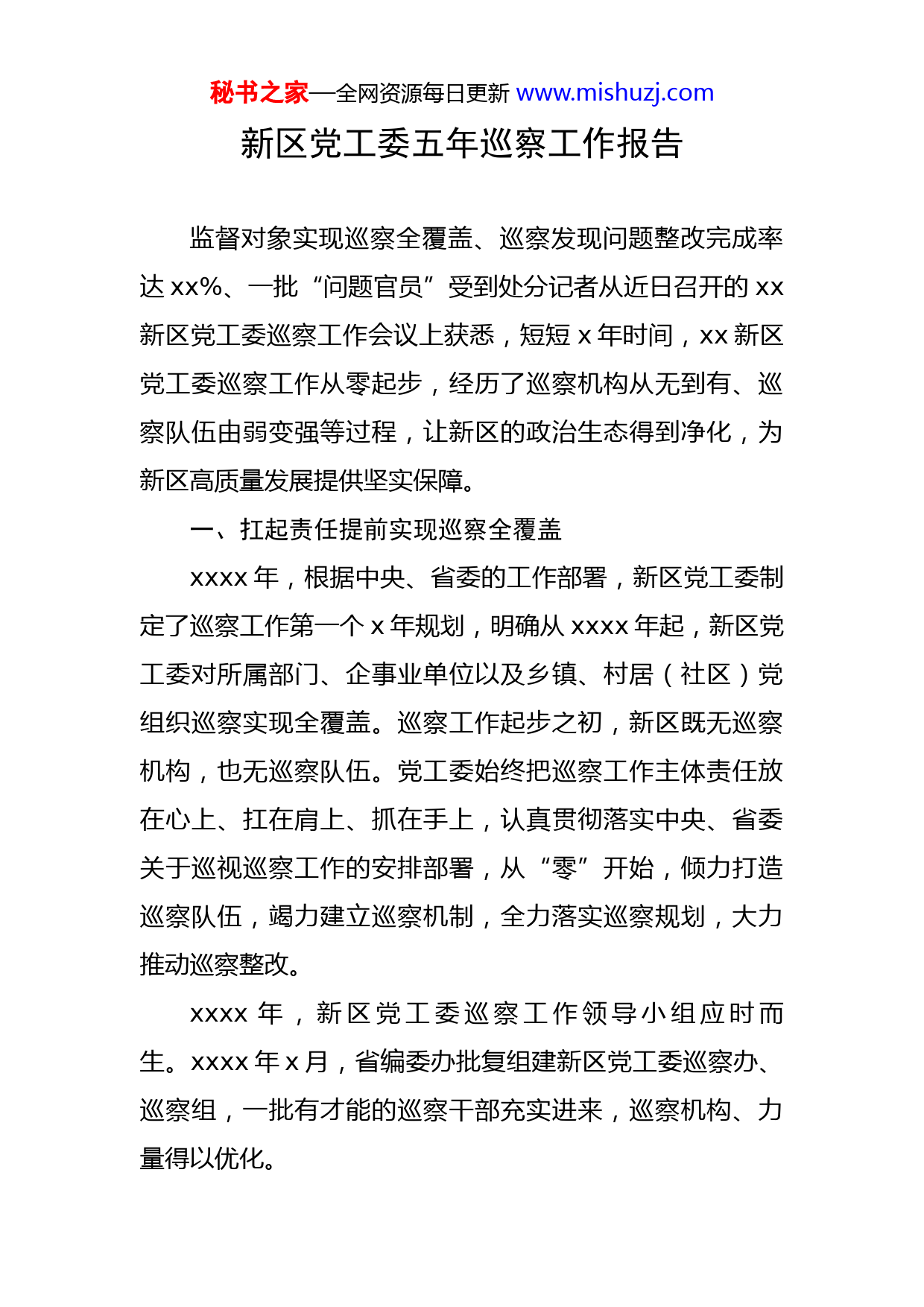 秘书之家—全网资源每日更新www.mishuzj.com新区党工委五年巡察工作报告监督对象实现巡察全覆盖、巡察发现问题整改完成率达xx%、一批“问题官员”受到处分记者从近日召开的xx新区党工委巡察工作会议上获悉,短短x年时间,xx新区党工委巡察工作从零起步,经历了巡察机构从无到有、巡察队伍由弱变强等过程,让新区的政治生态得到净化,为新区高质量发展提供坚实保障。一、扛起责任提前实现巡察全覆盖xxxx年,根据中央、省委的工作部署,新区党工委制定了巡察工作第一个x年规划,明确从xxxx年起,新区党工委对所属部门、企事业单位以及乡镇、村居(社区)党组织巡察实现全覆盖。巡察工作起步之初,新区既无巡察机构,也无巡察队伍。党工委始终把巡察工作主体责任放在心上、扛在肩上、抓在手上,认真贯彻落实中央、省委关于巡视巡察工作的安排部署,从“零”开始,倾力打造巡察队伍,竭力建立巡察机制,全力落实巡察规划,大力推动巡察整改。xxxx年,新区党工委巡察工作领导小组应时而生。xxxx年x月,省编委办批复组建新区党工委巡察办、巡察组,一批有才能的巡察干部充实进来,巡察机构、力量得以优化。秘书之家—全网资源每日更新www.mishuzj.com工作中,结合新区“扁平化”“大部制”无县级机构、巡察工作直插村居(社区)等实际,新区着力提升巡察工作制度化、规范化建设水平。x年来,新区共制定印发巡察工作相关制度规定xx个,确保巡察工作有章可循、有规可依。工欲善其事,必先利其器。强有力的队伍、制度,有利于新区巡察工作的高效运行。x年来,新区共开展巡察xx轮次,完成对xxx个监督对象的巡察全覆盖,覆盖率达xxx%,并提前x年实现x年全覆盖任务;共发现问题xxxx个,已整改xxxx个,整改完成率达xx%,发现问题线索xxx件xxx人(次),已立案xx件xx人,给予党纪政务处分x件xx人、组织处理xx件xx人。二、明确重点提升巡察工作质效巡察发现的问题,就在群众身边。巡察工作开展质效如何,群众看得到、感受得到。x年来,新区始终坚持政治巡察定位,做到中央、省委和新区党工委的重大决策部署到哪里,巡察监督就跟进到哪里。根据省委巡视工作安排和xx融合发展机构调整的实际,新区党工委将巡察监督对象由xxx个调整为xxx个,做到巡察监督横向到边、纵向到底,重点监督检查部门(单位)党组织x大类xx项xxx个突出问题、村级党组织x大类xx项xx个突出问题,适时将脱贫攻坚、扫黑除秘书之家—全网资源每日更新www.mishuzj.com恶、环保督察反馈问题整改、领导干部违规参与茅台酒经营及收送茅台酒问题等xx余项专项监督内容,纳入巡察监督重点。xx等一批腐败分子被查处;中央环保督察反馈问题整改、农村环境脏乱差整治等一批遗留问题得到有效解决;一些部门的公务接待、车辆管理得以规范x年来,新区不断明确监督范围、监督重点,创新方法,提升质效,坚持聚焦被巡察党组织的政治忠诚、政治立场、政治担当,始终坚持发现问题、形成震慑、推动改革、促进发展,发现惩治一批腐败分子,推动解决一批突出问题,达到有形覆盖与有效覆盖的高度统一。三、以巡促治做好巡察“后半篇文章”抓铁有痕,踏石留印。x年来,xx新区坚持紧扣“政治体检”要求,坚持严的主基调不动摇,拧紧巡察整改责任链条,建立巡察成果运用机制,做好巡察整改“后半篇文章”。在严肃巡察反馈问题移交方面,每轮巡察采取集中反馈、单独向被巡察党组织及其主要负责人“双反馈”的方式,通报巡察情况,明确巡察整改要求。同时,整合相关职能部门的力量,把督促整改落实纳入日常监督的重要内容。在强化巡察整改调度方面,坚持常态化调度,自第七秘书之家—全网资源每日更新www.mishuzj.com轮巡察起,每轮巡察集中整改中期、末期均举行巡察整改调度会,了解被巡察党组织的巡察整改进展情况和日常监督部门的履职情况,确保巡察整改按计划有序推进。在完善巡察整改制度体系方面,结合新区实际,归纳总结经验,促进巡察整改任务明确、方向正确、程序规范;积极开展巡察整改质效评估工作调研,制定印发巡察整改质效评估办法、巡察整改日常监督工作暂行规定等,促进建立巡察整改质效评估考核和日常监督机制,确保巡察整改工作取得实效。在开展巡察整改专项监督检查方面,牵头组织开展中央巡视及新区巡察反馈意见整改落实情况的专项监督检查工作x次,党工委第六轮巡察整改情况专项检查x次,协同纪检监察工委对第一至第七轮巡察整改落实情况进行x次监督检查。xxxx年组建巡察整改质效评估组,对第一至第十轮巡察反馈问题整改情况进行质效评估,形成评估报告,确保巡察整改落细落实落到位。