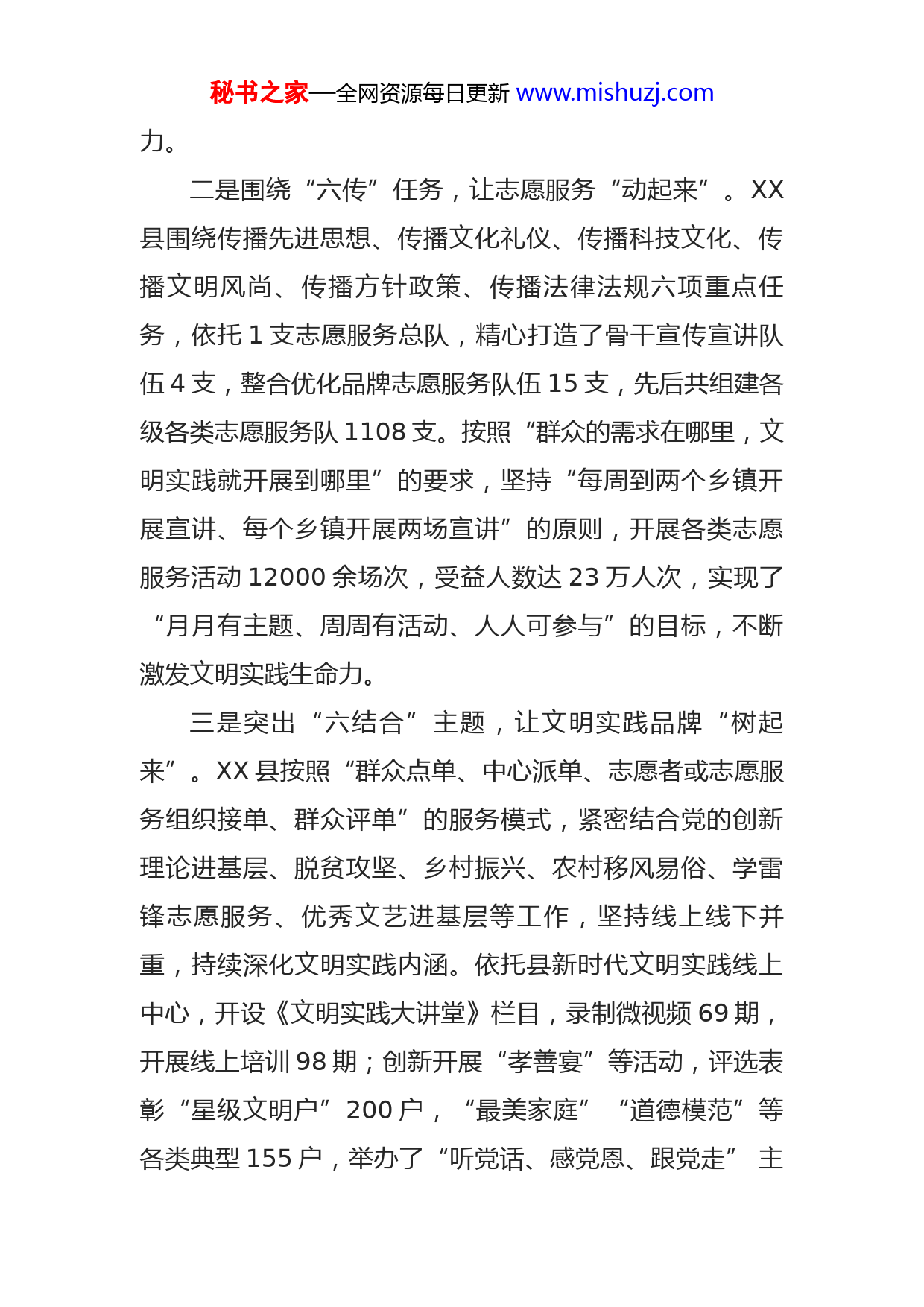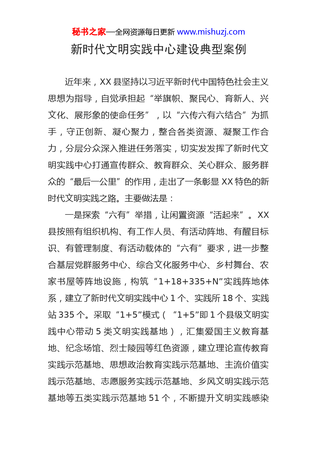 秘书之家—全网资源每日更新www.mishuzj.com新时代文明实践中心建设典型案例近年来,XX县坚持以习近平新时代中国特色社会主义思想为指导,自觉承担起“举旗帜、聚民心、育新人、兴文化、展形象的使命任务”,以“六传六有六结合”为抓手,守正创新、凝心聚力,整合各类资源、凝聚工作合力,分层分众深入推进任务落实,切实发发挥了新时代文明实践中心打通宣传群众、教育群众、关心群众、服务群众的“最后一公里”的作用,走出了一条彰显XX特色的新时代文明实践之路。主要做法是:一是探索“六有”举措,让闲置资源“活起来”。XX县按照有组织机构、有工作人员、有活动阵地、有醒目标识、有管理制度、有活动载体的“六有”要求,进一步整合基层党群服务中心、综合文化服务中心、乡村舞台、农家书屋等阵地设施,构筑“1+18+335+N”实践阵地体系,建立了新时代文明实践中心1个、实践所18个、实践站335个。采取“1+5”模式(“1+5”即1个县级文明实践中心带动5类文明实践基地),汇集爱国主义教育基地、纪念场馆、烈士陵园等红色资源,建立理论宣传教育实践示范基地、思想政治教育实践示范基地、主流价值实践示范基地、志愿服务实践示范基地、乡风文明实践示范基地等五类实践示范基地51个,不断提升文明实践感染秘书之家—全网资源每日更新www.mishuzj.com力。二是围绕“六传”任务,让志愿服务“动起来”。XX县围绕传播先进思想、传播文化礼仪、传播科技文化、传播文明风尚、传播方针政策、传播法律法规六项重点任务,依托1支志愿服务总队,精心打造了骨干宣传宣讲队伍4支,整合优化品牌志愿服务队伍15支,先后共组建各级各类志愿服务队1108支。按照“群众的需求在哪里,文明实践就开展到哪里”的要求,坚持“每周到两个乡镇开展宣讲、每个乡镇开展两场宣讲”的原则,开展各类志愿服务活动12000余场次,受益人数达23万人次,实现了“月月有主题、周周有活动、人人可参与”的目标,不断激发文明实践生命力。三是突出“六结合”主题,让文明实践品牌“树起来”。XX县按照“群众点单、中心派单、志愿者或志愿服务组织接单、群众评单”的服务模式,紧密结合党的创新理论进基层、脱贫攻坚、乡村振兴、农村移风易俗、学雷锋志愿服务、优秀文艺进基层等工作,坚持线上线下并重,持续深化文明实践内涵。依托县新时代文明实践线上中心,开设《文明实践大讲堂》栏目,录制微视频69期,开展线上培训98期;创新开展“孝善宴”等活动,评选表彰“星级文明户”200户,“最美家庭”“道德模范”等各类典型155户,举办了“听党话、感党恩、跟党走”主秘书之家—全网资源每日更新www.mishuzj.com题宣讲活动15场次,举行了“弘扬战疫精神、传承榜样力量”援鄂医务人员先进事迹报告会28场次;成立了由“道德模范”“定西好人”“最美退役军人”等组成的“百姓宣讲队”,以“文明实践大讲堂”“道德讲堂”等为载体,灵活运用“田间讲堂”“课室讲堂”“车间讲堂”等新形式,主动走进机关、乡村、社区、学校、医院、企业等单位,开展政策法规、科技科普、健康知识等政策宣讲活动,不断增强文明实践吸引力。四是实现“六新”目标,让群众幸福指数“高起来”。XX县依托新时代文明实践中心(所、站),积极引导群众充分发挥自身特长,广泛参与志愿服务,让时代新风吹进万家。在全县所有行政村和社区规范设置了《村规民约》,规范落实农村红白事报备承诺制,全年完成红白事报备登记2162起;印发了《XX县移风易俗宣传手册》《XX县文明礼仪常识》2000册。以“征集一条微建议、建立一个微平台、开展一次微志愿、满足一个微心愿、营造一个微环境”为载体,搭建了“留守儿童之家”“日间照料中心”“亲情聊天角”等志愿服务交流服务平台,组织广大志愿者宣传政策法规1280余次,走访慰问困难群众6600余人,化解矛盾纠纷230余起,开展义诊服务12500人次,形成了邻里和睦、相互关爱、守望相助的社会氛围,文明新风得到持续弘扬,农村社会更加和谐,逐秘书之家—全网资源每日更新www.mishuzj.com步把新时代文明实践中心(所、站)打造成为理论传播的新引擎,意识形态的新阵地,文明实践的新抓手,科技培训的新平台,幸福生活的新家园,成风化人的新课堂。