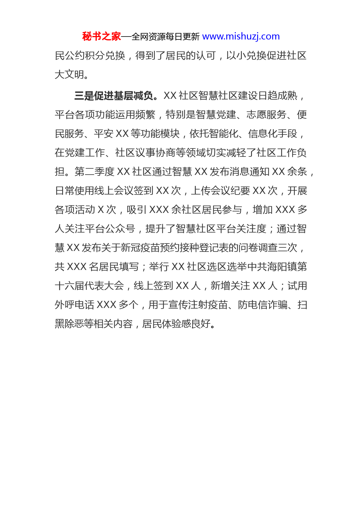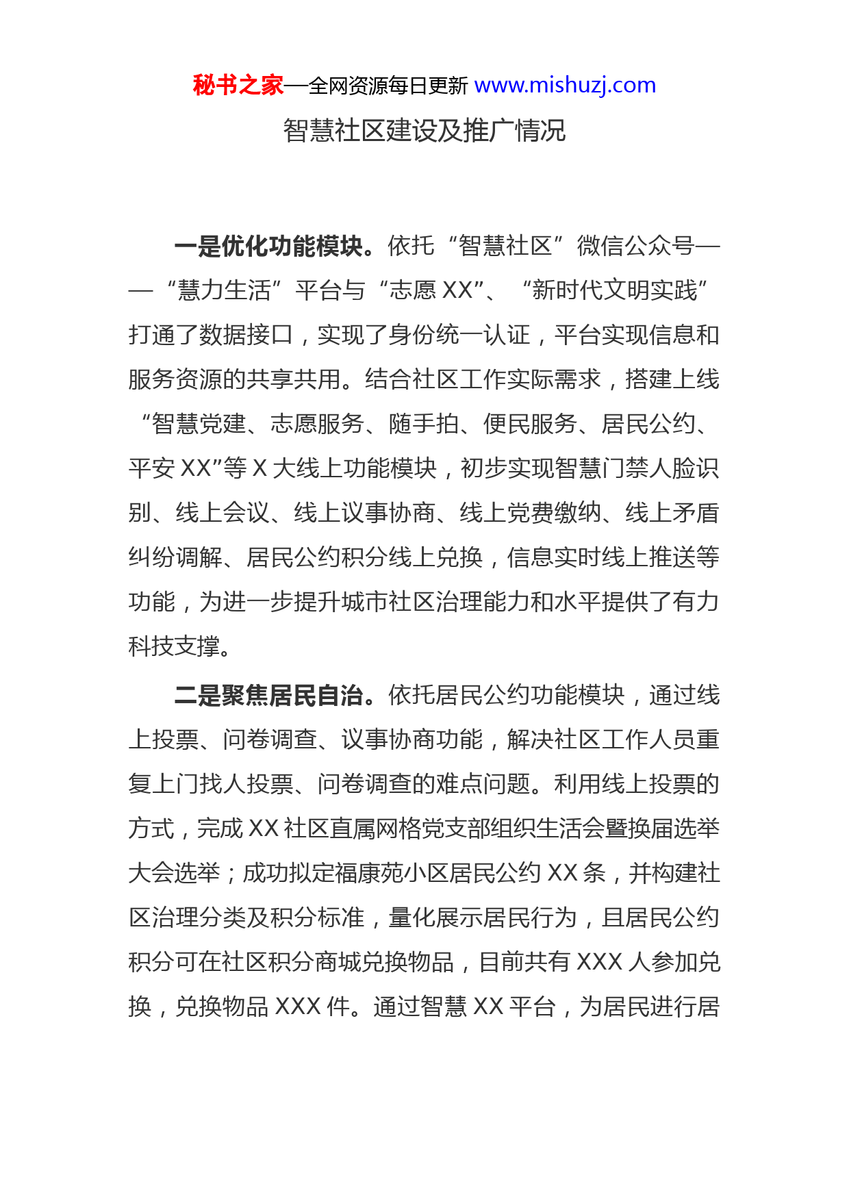 秘书之家—全网资源每日更新www.mishuzj.com智慧社区建设及推广情况一是优化功能模块。依托“智慧社区”微信公众号——“慧力生活”平台与“志愿XX”、“新时代文明实践”打通了数据接口,实现了身份统一认证,平台实现信息和服务资源的共享共用。结合社区工作实际需求,搭建上线“智慧党建、志愿服务、随手拍、便民服务、居民公约、平安XX”等X大线上功能模块,初步实现智慧门禁人脸识别、线上会议、线上议事协商、线上党费缴纳、线上矛盾纠纷调解、居民公约积分线上兑换,信息实时线上推送等功能,为进一步提升城市社区治理能力和水平提供了有力科技支撑。二是聚焦居民自治。依托居民公约功能模块,通过线上投票、问卷调查、议事协商功能,解决社区工作人员重复上门找人投票、问卷调查的难点问题。利用线上投票的方式,完成XX社区直属网格党支部组织生活会暨换届选举大会选举;成功拟定福康苑小区居民公约XX条,并构建社区治理分类及积分标准,量化展示居民行为,且居民公约积分可在社区积分商城兑换物品,目前共有XXX人参加兑换,兑换物品XXX件。通过智慧XX平台,为居民进行居秘书之家—全网资源每日更新www.mishuzj.com民公约积分兑换,得到了居民的认可,以小兑换促进社区大文明。三是促进基层减负。XX社区智慧社区建设日趋成熟,平台各项功能运用频繁,特别是智慧党建、志愿服务、便民服务、平安XX等功能模块,依托智能化、信息化手段,在党建工作、社区议事协商等领域切实减轻了社区工作负担。第二季度XX社区通过智慧XX发布消息通知XX余条,日常使用线上会议签到XX次,上传会议纪要XX次,开展各项活动X次,吸引XXX余社区居民参与,增加XXX多人关注平台公众号,提升了智慧社区平台关注度;通过智慧XX发布关于新冠疫苗预约接种登记表的问卷调查三次,共XXX名居民填写;举行XX社区选区选举中共海阳镇第十六届代表大会,线上签到XX人,新增关注XX人;试用外呼电话XXX多个,用于宣传注射疫苗、防电信诈骗、扫黑除恶等相关内容,居民体验感良好。
