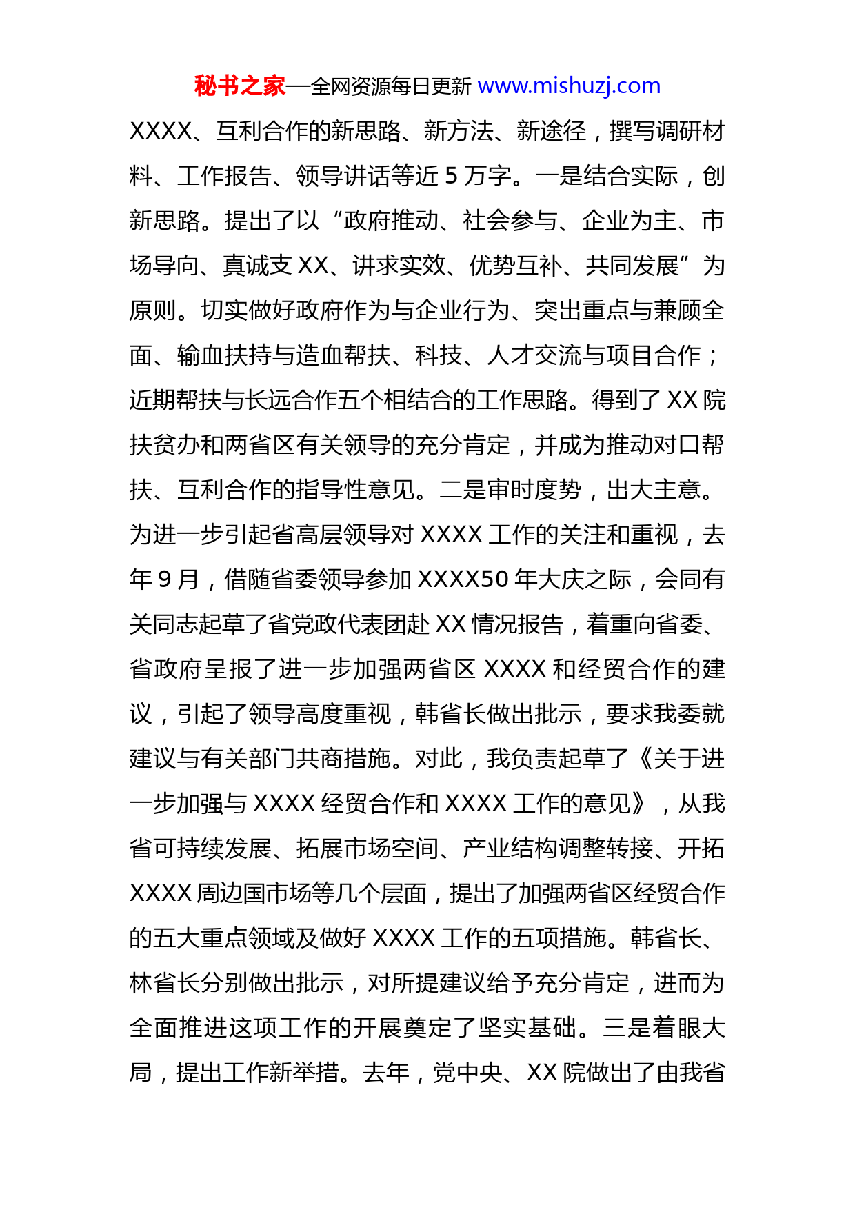 秘书之家—全网资源每日更新www.mishuzj.com机关事业单位处级干部试用期满述职报告各位领导、同志们:X年,我被任命为XX政府驻XX办事处综合业务处处长,XX年调回原经协办任职联络处处长,XX构改革后改任调研员,去年又被任命为XX主任,主要分管XX工作。一年来,我自觉用党员干部的标准严格要求,恪守老老实实做人,勤勤恳恳干事,堂堂正正为人的处事准则,在分管的工作范围内,认真履行职责,潜心谋事、竭力干事、廉洁从事,较圆满地完成了领导交办的各项工作任务。下面我就试用期间的工作情况做一简要汇报,请给予批评指正。一、积极建言献策,当好参谋助手。XX是党中央、XX院赋予我省的一项严肃的政治任务,是事关党和国家工作大局,改革、发展、稳定全局和XXXX对外形象的重要工作。我作为这一工作的组织者、策划者,领导决策的践行者和各方面关系的协调者,深感责任重大。一年来,为做好这项工作,我注意认真学习理解中央有关开展XXXX工作的指示精神和工作要求,潜心领会各级领导意图,用心总结从事这一工作近十年来的经验教训,怀着对贫困群体深厚的情感,不辞辛苦,六赴XXXX,深入XXXX了解群众疾苦和需求,积极探索秘书之家—全网资源每日更新www.mishuzj.comXXXX、互利合作的新思路、新方法、新途径,撰写调研材料、工作报告、领导讲话等近5万字。一是结合实际,创新思路。提出了以“政府推动、社会参与、企业为主、市场导向、真诚支XX、讲求实效、优势互补、共同发展”为原则。切实做好政府作为与企业行为、突出重点与兼顾全面、输血扶持与造血帮扶、科技、人才交流与项目合作;近期帮扶与长远合作五个相结合的工作思路。得到了XX院扶贫办和两省区有关领导的充分肯定,并成为推动对口帮扶、互利合作的指导性意见。二是审时度势,出大主意。为进一步引起省高层领导对XXXX工作的关注和重视,去年9月,借随省委领导参加XXXX50年大庆之际,会同有关同志起草了省党政代表团赴XX情况报告,着重向省委、省政府呈报了进一步加强两省区XXXX和经贸合作的建议,引起了领导高度重视,韩省长做出批示,要求我委就建议与有关部门共商措施。对此,我负责起草了《关于进一步加强与XXXX经贸合作和XXXX工作的意见》,从我省可持续发展、拓展市场空间、产业结构调整转接、开拓XXXX周边国市场等几个层面,提出了加强两省区经贸合作的五大重点领域及做好XXXX工作的五项措施。韩省长、林省长分别做出批示,对所提建议给予充分肯定,进而为全面推进这项工作的开展奠定了坚实基础。三是着眼大局,提出工作新举措。去年,党中央、XX院做出了由我省秘书之家—全网资源每日更新www.mishuzj.com结对帮扶XXXXXX地区XX县,实行以干部支XX为龙头,经济、科技、文化全方位支XX的决定,为贯彻中央的部署,我起草了关于确立我省有关市、大企业与XXXXXX的请示,提出由经济实力较强的三市和三家中央、省属大企业分别承担XXX任务,并依此为平台,推动两省区互利合作的建议,被省委、省政府采纳。这一举措实施仅一年,就筹集到XXX近千万元,实施互利合作项目XXXX多个,赢得了各级领导和XXXX干部群众的高度评价。二、办实事求实效,认真履行职责。我省用于XXXX资金无论数额还是规模都远小于XX的实际投入,与其他东部省市XXXX资金的投入也有一定的差距。为使有限的资金发挥更大效益,起到更好的示范带动作用,产生更强的社会影响力,我注意用心了解XXXX干部群众所想、所盼、所需。把坚持办XXXX最急需的事,办多数人受益的事,办长远起作用的事,作为想问题、提建议、办实事的出发点和落脚点。紧紧围绕当地领导关注的热点、维护社会稳定的重点和影响经济增长的难点,围绕提升XXXX形象,做了一些有益的工作。一是启动了惠及千家万户的民心工程。去年,在委领导的全力支持下,我省投资700万元,采取XX助资金补一点、受益户筹一点,当地政府出一点的办法,启动了第一期农村贫困户危房改建安居工程。为确保把这项得民心、聚民力、秘书之家—全网资源每日更新www.mishuzj.com合民愿的事办好办实,我跑遍了受XX7县14个乡镇的30个受益村,实地了解民意、督促进度,察看质量,经各方协同努力,在短短半年时间内,使2400多个贫困户告别了祖祖辈辈居住的土坯房,实现了几代人梦寐以求的愿望,受益群众从心底发出的共产党好、XXXX人民好的心声,深深感染了所有参观安居点的各级领导,并给予很高的评价。二是实施了拉动XXXX经济发展的亮点工程。XX县是中央确定的由我省选派县委书记任职的试点县,为解决长期困扰该县发展缓慢的难点问题,经多方考察论证,今年我省投入XX助资金1400万元,用于支持工业园区建设,完成了5平方公里内的四纵四横路、管、网等基础设施,现已有近40多家中外企业入住园区,引进资金总额超过18亿元,彻底结束了该县和XX地区无工业园区的历史,成为拉动经济增长的新亮点。对此,XX区党委、政府专门召开现场会,在全区推广这一经验,起到了很好的示范带动作用。三是组织参加了第二届喀交会,进一步提升了我省对外形象。今年6月,按照委领导的指示,我承担了负责组织有关市、企业参加XXXX商品交易会的任务。为确保我省第一次在XXX组织实施的经贸活动园满成功,我主动放弃节假休息日,精心策划,认真筹备,仅在一个月的时间内就完成了方案制定、工作部署、招展布展