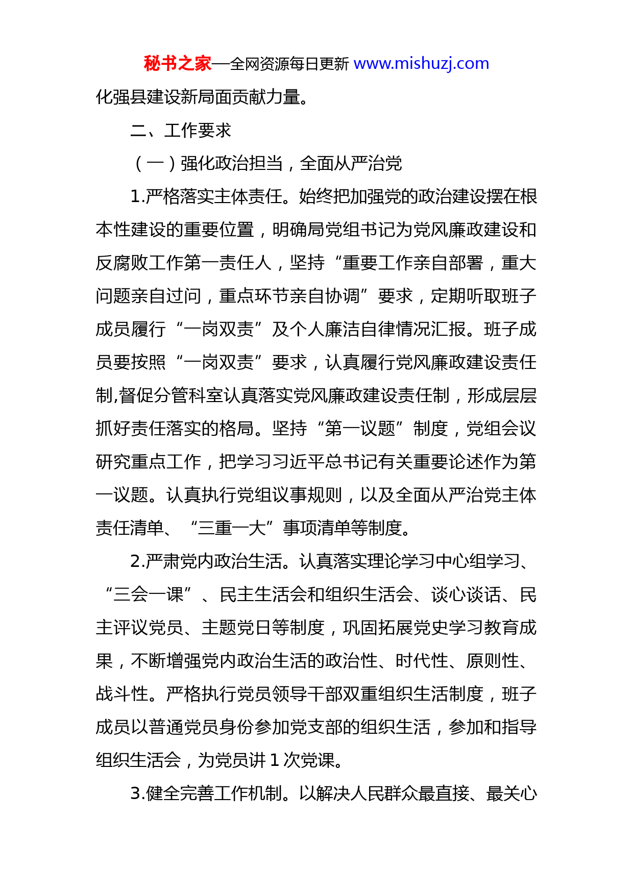 秘书之家—全网资源每日更新www.mishuzj.com2022年机关党风廉政建设和反腐败工作的实施意见2022年是落实省、市党代会精神的开局之年,是实施“十四五”规划的关键之年,是新一届政府班子履职的起步之年,为深入贯彻党的十九大和十九届二中、三中、四中、五中、六中全会精神,深入贯彻落实中央八项规定精神、持之以恒纠治“四风”,进一步加强全局党风廉政建设和反腐败工作,结合我局实际,制定本实施意见。一、指导思想以习近平新时代中国特色社会主义思想为指导,以政治建设为统领,深入贯彻落实党的十九大和十九届二中、三中、四中、五中、六中全会以及习近平总书记系列重要讲话精神,全面落实中纪委十九届六次全会、省纪委十一届七次全会、市纪委十一届七次全会部署要求,不断提高政治判断力、政治执行力、政治领悟力,一刻不停推进党风廉政建设和反腐败工作。严格落实“一岗双责”,压实管党治党政治责任,加强党性锻炼、严肃党内政治生活,严守党的纪律和规矩。持之以恒正风肃纪,强化监督执纪问责,认真贯彻落实中央八项规定及实施细则精神,坚决纠正“四风”问题,推动全面从严治党向纵深发展,为改革与发展提供坚强有力的保障,为全面开创新时代现代秘书之家—全网资源每日更新www.mishuzj.com化强县建设新局面贡献力量。二、工作要求(一)强化政治担当,全面从严治党1.严格落实主体责任。始终把加强党的政治建设摆在根本性建设的重要位置,明确局党组书记为党风廉政建设和反腐败工作第一责任人,坚持“重要工作亲自部署,重大问题亲自过问,重点环节亲自协调”要求,定期听取班子成员履行“一岗双责”及个人廉洁自律情况汇报。班子成员要按照“一岗双责”要求,认真履行党风廉政建设责任制,督促分管科室认真落实党风廉政建设责任制,形成层层抓好责任落实的格局。坚持“第一议题”制度,党组会议研究重点工作,把学习习近平总书记有关重要论述作为第一议题。认真执行党组议事规则,以及全面从严治党主体责任清单、“三重一大”事项清单等制度。2.严肃党内政治生活。认真落实理论学习中心组学习、“三会一课”、民主生活会和组织生活会、谈心谈话、民主评议党员、主题党日等制度,巩固拓展党史学习教育成果,不断增强党内政治生活的政治性、时代性、原则性、战斗性。严格执行党员领导干部双重组织生活制度,班子成员以普通党员身份参加党支部的组织生活,参加和指导组织生活会,为党员讲1次党课。3.健全完善工作机制。以解决人民群众最直接、最关心秘书之家—全网资源每日更新www.mishuzj.com的问题为重点,经常性召开党风廉政建设专题会议,强化工作措施,建立健全工作责任机制,促进各项任务的贯彻落实。牢固树立制度面前没有特权、制度约束没有例外的观念,进一步加强干部监督、廉政风险防控,坚持用制度管权管事管人,靠制度堵塞漏洞。严格执行公务接待、差旅费报销、财务管理等制度,认真落实廉政档案、廉政谈话等廉政风险防控机制。强化制度执行,开展自查自纠,切实增强制度的刚性约束。(二)加强理论武装,筑牢思想防线1.巩固拓展党史学习教育。深入学习贯彻习近平总书记关于党史学习教育的重要论述精神,总结好、巩固好、拓展好党史学习教育成果,从党的百年奋斗历程中汲取智慧和力量。按照上级部署要求,紧密结合我局实际,组织开展好党史学习教育,引导广大党员、干部学史明理、学史增信、学史崇德、学史力行,牢记初心使命、传承红色基因,守正创新、锐意进取,奋力推动在新征程中走在全国前列、创造新的辉煌,以实际行动迎接党的二十大胜利召开。2.建打造硬党支部。严格落实机关党建各项工作要求,以上级党委党建工作检查为契机,分阶段总结党建工作开展情况,梳理汇总资料,及时总结提炼“支部工作法”,积极争创示范党支部。坚持把学习贯彻习近平新时代中国秘书之家—全网资源每日更新www.mishuzj.com特色社会主义思想作为首要政治任务,采取集中学习和个人自学相结合、线上学习和线下学习向结合、规定动作和自选动作相结合,充分利用“学习强国”“灯塔—党建在线”等载体,深入开展特色鲜明、形式多样的学习教育。充分利用红色教育资源优势,年内组织党员开展1次党性、革命传统教育实地参观学习。(三)健全监督机制,持续正风肃纪1.加强廉政风险防控。深化廉政风险点排查,落实防控措施,强化重点环节和关键岗位的监督。常态化开展廉政风险防控自查评估,对发现的问题逐一建立台账,研究和落实改进措施。防范化解重大风险,切实把防范廉政风险与风险有机融合,把廉政风险防控措施嵌入到关键领域和环节中。严格落实中央八项规定及其实施细则,巩固深化形式主义、官僚主义、享乐主义、奢靡之风专项整治,认真开展自查自纠,着力解决“四风”问题。2.强化党内监督。认真落实谈心谈话、述职述廉,领导干部报告个人有关事项等党内监督制度,充分发挥市纪委派驻纪检组全面监督、党员日常监督的作用,加强对党员、干部的日常管理监督,及时了解掌握其思想动态、作风状况、廉洁自律等情况。深化运用“四种形态”,特别是在“第一种形态”上做细做实,把监督执纪挺在前面。认真贯彻党员权利保障条例、党务公开条例,切实保障党秘书之家—全