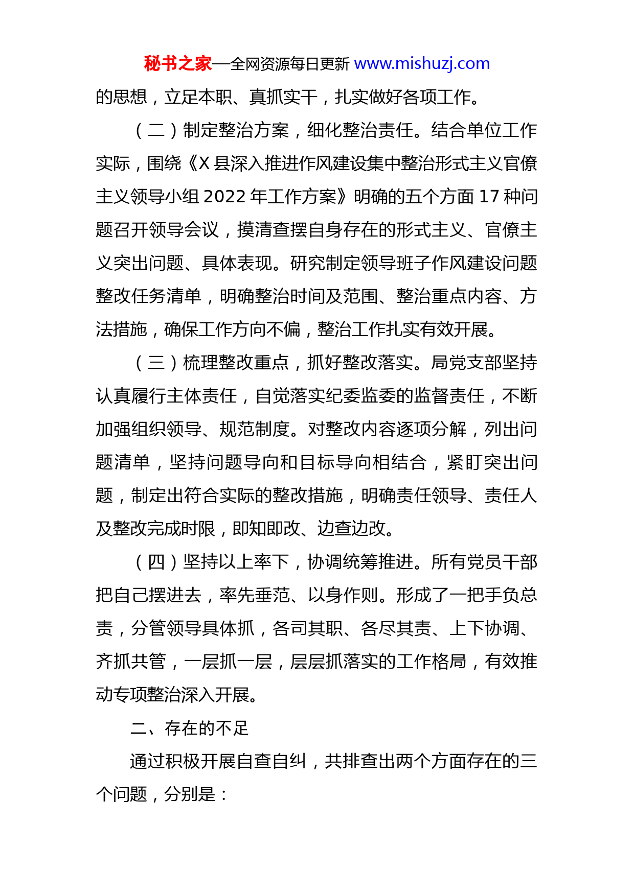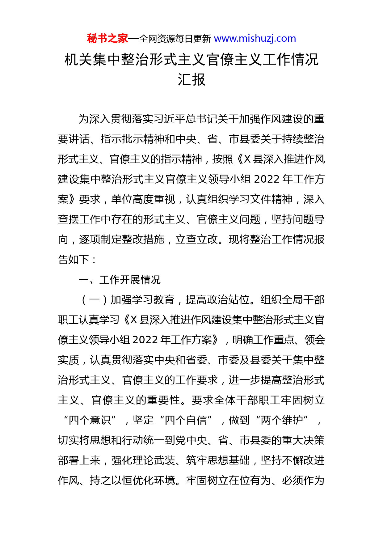秘书之家—全网资源每日更新www.mishuzj.com机关集中整治形式主义官僚主义工作情况汇报为深入贯彻落实习近平总书记关于加强作风建设的重要讲话、指示批示精神和中央、省、市县委关于持续整治形式主义、官僚主义的指示精神,按照《X县深入推进作风建设集中整治形式主义官僚主义领导小组2022年工作方案》要求,单位高度重视,认真组织学习文件精神,深入查摆工作中存在的形式主义、官僚主义问题,坚持问题导向,逐项制定整改措施,立查立改。现将整治工作情况报告如下:一、工作开展情况(一)加强学习教育,提高政治站位。组织全局干部职工认真学习《X县深入推进作风建设集中整治形式主义官僚主义领导小组2022年工作方案》,明确工作重点、领会实质,认真贯彻落实中央和省委、市委及县委关于集中整治形式主义、官僚主义的工作要求,进一步提高整治形式主义、官僚主义的重要性。要求全体干部职工牢固树立“四个意识”,坚定“四个自信”,做到“两个维护”,切实将思想和行动统一到党中央、省、市县委的重大决策部署上来,强化理论武装、筑牢思想基础,坚持不懈改进作风、持之以恒优化环境。牢固树立在位有为、必须作为秘书之家—全网资源每日更新www.mishuzj.com的思想,立足本职、真抓实干,扎实做好各项工作。(二)制定整治方案,细化整治责任。结合单位工作实际,围绕《X县深入推进作风建设集中整治形式主义官僚主义领导小组2022年工作方案》明确的五个方面17种问题召开领导会议,摸清查摆自身存在的形式主义、官僚主义突出问题、具体表现。研究制定领导班子作风建设问题整改任务清单,明确整治时间及范围、整治重点内容、方法措施,确保工作方向不偏,整治工作扎实有效开展。(三)梳理整改重点,抓好整改落实。局党支部坚持认真履行主体责任,自觉落实纪委监委的监督责任,不断加强组织领导、规范制度。对整改内容逐项分解,列出问题清单,坚持问题导向和目标导向相结合,紧盯突出问题,制定出符合实际的整改措施,明确责任领导、责任人及整改完成时限,即知即改、边查边改。(四)坚持以上率下,协调统筹推进。所有党员干部把自己摆进去,率先垂范、以身作则。形成了一把手负总责,分管领导具体抓,各司其职、各尽其责、上下协调、齐抓共管,一层抓一层,层层抓落实的工作格局,有效推动专项整治深入开展。二、存在的不足通过积极开展自查自纠,共排查出两个方面存在的三个问题,分别是:秘书之家—全网资源每日更新www.mishuzj.com(一)在强化正向激励,激发干部主动担当作为方面。一是针对执法办案的精准化专业化实战化专题培训缺乏;二是对优秀年轻干部及青年干部的培养锻炼不足。(二)在抓督查、严整治,切实提高一体化推进的综合功效方面。对党员、干部中存在的“懈怠思想、无为思想、慵懒思想、虚功思想”等作风顽疾需进行重点整治。三、整改措施(一)开展多种形式执法办案专题培训。通过开展执法实务经验交流、执法工作论坛等活动,丰富培训形式和内容,进一步提升执法人员规范文明执法的实操能力,培养执法人员过硬的执法工作作风和执法业务素质。以“人人学办案,人人会办案”为目标,不定期开展现场模拟办案活动,以实践促学习、以实践促提升。(二)加强年轻干部及青年干部的培养锻炼。通过以老带新、岗位锻炼等多种形式,对优秀年轻干部及青年干部交任务、压担子,组织开展各类活动,为他们的成长进步搭建学习提升和实践锻炼平台,全面提高素质和能力。每年通过专题培训、实践、研讨等一系列手段,拓宽学习领域,提高学习深度,确保政治理论水平、业务知识水平、领导管理水平、依法行政水平、沟通协调水平有明显提升。(三)增强对年轻干部及青年干部的培养针对性。根秘书之家—全网资源每日更新www.mishuzj.com据干部本人的经历、知识结构和培养方向,本着“缺什么补什么”的原则,因材施教,增强培养的针对性。着力培养年轻干部及青年干部既能在点上解决难题,又能在面上独立组织开展工作的能力,提升实践能力、专业能力、组织管理能力、综合协调能力,努力打造一支想干事,能干事、干成事的充满活力的城管年轻干部队伍。局党组每年要对培养选拔年轻干部工作进行认真总结,年度考核时,要把培养管理作为干部选拔任用工作的重要内容。(四)加强对机关监督管理。对干部迟到早退、工作生活上要求不严、不注重形象、举止失态、与身份不称等,不仅仅是简单的批评教育,要按照机关制度与干部管理规定严肃处理。坚决让对上对下都实实在在、不玩虚招的干部和清正廉洁、公众形象好的干部得到褒奖和重用;让那些享乐思想严重、热衷于形式主义、脱离群众的干部受到警醒和惩戒。(五)强化干部作风监督和检查。运用好张掖市政务服务网、小微权力监督“一点通”、12345民生服务热线、政民互动、局微信公众号、5612319城管服务热线等平台,从网络渠道收集、受理群众反映党员、干部作风方面的信访举报和问题线索,对发现和收集到的党员、干部作风方面违规违纪问题以及侵害群众利益的人和事一律从实从快处理。秘书之家—全网资源每日更新www.mishuzj.com(六)懒政怠政治理工作与当前重点工作相结合。认真抓好城市治理能力提升行动,强力治脏治堵治违治乱,实现常态化精细管