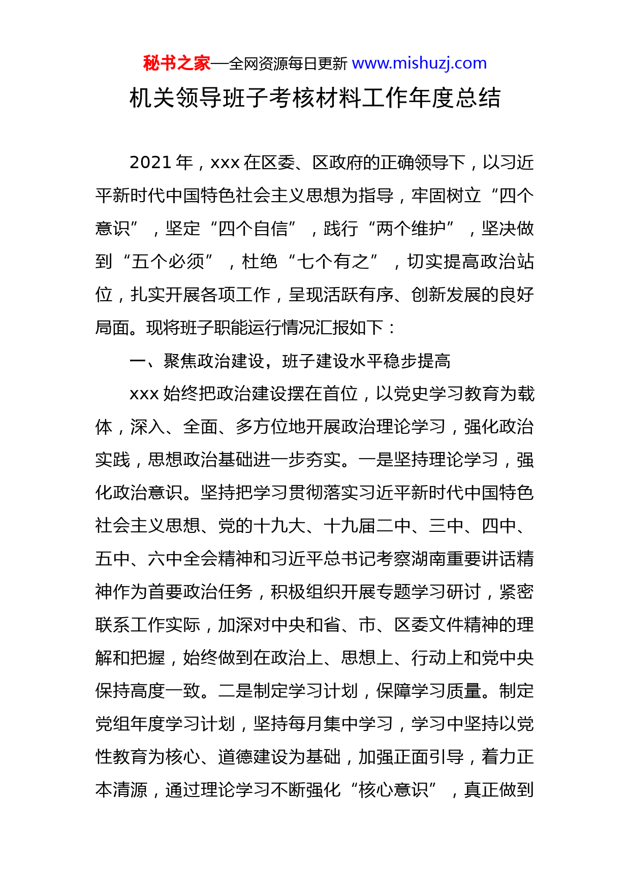 秘书之家—全网资源每日更新www.mishuzj.com机关领导班子考核材料工作年度总结2021年,xxx在区委、区政府的正确领导下,以习近平新时代中国特色社会主义思想为指导,牢固树立“四个意识”,坚定“四个自信”,践行“两个维护”,坚决做到“五个必须”,杜绝“七个有之”,切实提高政治站位,扎实开展各项工作,呈现活跃有序、创新发展的良好局面。现将班子职能运行情况汇报如下:一、聚焦政治建设,班子建设水平稳步提高xxx始终把政治建设摆在首位,以党史学习教育为载体,深入、全面、多方位地开展政治理论学习,强化政治实践,思想政治基础进一步夯实。一是坚持理论学习,强化政治意识。坚持把学习贯彻落实习近平新时代中国特色社会主义思想、党的十九大、十九届二中、三中、四中、五中、六中全会精神和习近平总书记考察湖南重要讲话精神作为首要政治任务,积极组织开展专题学习研讨,紧密联系工作实际,加深对中央和省、市、区委文件精神的理解和把握,始终做到在政治上、思想上、行动上和党中央保持高度一致。二是制定学习计划,保障学习质量。制定党组年度学习计划,坚持每月集中学习,学习中坚持以党性教育为核心、道德建设为基础,加强正面引导,着力正本清源,通过理论学习不断强化“核心意识”,真正做到秘书之家—全网资源每日更新www.mishuzj.com思想上高度认同、政治上坚决维护、组织上自觉服从、行动上紧紧追随。三是创新方式方法,严格组织生活。认真贯彻落实党的组织生活各项制度,严格按要求开展“三会一课”,党组班子成员以普通党员身份参加支部主题党员日活动和支部组织生活会,同时注意通过利用各类活动,督促党员干部对照党章和入党誓词,联系个人实际进行党性分析,强化党员意识、增强党的观念、提高党性修养。一年来,xxx党组严格落实重大问题和个人有关事项的请示报告制度,坚持民主集中制,所有重大事项均由党组集体研究决策。但仍存在xxx等问题,我办已及时按要求完成整改。二、聚焦中心工作,强化责任担当(一)强化意识形态教育。一是强化组织领导。始终把意识形态工作摆在重要位置,坚持做到主要领导负总责,班子成员各负其责。对重大事件、重要情况中的苗头性、倾向性问题,有针对性地进行正面引导,牢牢掌握意识形态工作的领导权、主动权、管理权和话语权。二是狠抓思想引导。坚持把学习贯彻习近平新时代中国特色社会主义思想作为重中之重,坚持不懈地用党的创新理论武装头脑、指导实践,精心组织党史学习教育学习研讨,教育引导全办干职工牢牢把握正确的政治方向,增强思想品德修养,提高办事能力和工作水平。三是做好舆论引导。以秘书之家—全网资源每日更新www.mishuzj.com区委、区政府的决策部署为工作主线,围绕各项中心工作积极做好政策法规的宣传解读工作,坚持正面宣传,把握正确舆论导向。引导教育干部职工不在网络平台发布、转发政治敏感信息或其他有负面影响的信息,引导干职工不信谣、不传谣、不妄议,传递新时代正能量。(二)扎实推进机关党建。一是压实基层党建工作责任。将党史学习教育、落实意识形态工作责任制和中心组学习等纳入基层党建述职评议考核及日常调研督查的重要内容,将党建工作履职情况作为领导班子和党员干部年度考核、述职述廉和民主生活会的重要内容。二是高质量开展党史学习教育。将党史学习教育作为党员教育培训重点任务,制定了实施方案和工作清单,开展了四次专题学习研讨,召开了“学党史、悟思想、办实事、开新局”专题组织生活会。三是切实为民办实事。积极参加街道、社区兼职委员联席会议,为解决社区基层党建工作和小区居民群众反映强烈的重点难点问题出谋划策、出工出力。持续深化“基层吹哨、部门报到”工作,共组织开展8次在职党员进社区活动,xxx人次进小区(社区)开展志愿服务活动。四是规范党员日常管理。全面落实《X区“三会一课”制度实施细则》,继续推行“1+6+N”主题党日模式,结合建党一百周年系列庆祝活动,深入开展“学党史、两重温”主题活动。对全体党员进行积分量化管理,秘书之家—全网资源每日更新www.mishuzj.com将党史学习教育、疫情防控、创文巩卫、扫黑除恶等工作纳入积分管理范围。(三)强化党风廉政建设。一是落实主体责任,始终把政治建设摆在首位。认真研究制定全年党组班子党风廉政建设责任制,明确班子成员、各股室负责人及党员干部在党风廉政建设工作中的主要任务和职责,推动全面从严治党责任落到实处,坚持把“红脸出汗”作为经常性手段,对思想、作风、纪律等方面的苗头性、倾向性问题,采取谈话提醒、诚勉谈活等形式,做到抓早抓小、防微杜渐。二是扎实开展思想教育,筑牢廉政思想防线。始终把加强学习、增强党员党性意识放在重要位置,突出抓好党员干部的职业道德教育和全心全意为人民服务的宗旨教育,增强公仆意识,树立勤政廉洁的良好形象,通过支部主题党日活动、党风廉政专题会议等,重点学习《中国共产党章程》《中华人民共和国监察法》《中共中央、国务院进一步制止党政机关和党政干部经商、办企业的规定》等党纪党规。三是加强党内监督,将从严治党落到实处。积极按相关部门要求完成“互联网+监督”的单位注册激活,安排专职人员负责