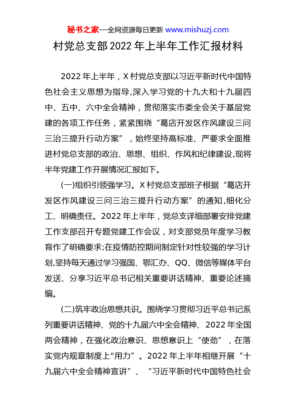 秘书之家—全网资源每日更新www.mishuzj.com村党总支部2022年上半年工作汇报材料2022年上半年,X村党总支部以习近平新时代中国特色社会主义思想为指导,深入学习党的十九大和十九届四中、五中、六中全会精神,贯彻落实市委全会关于基层党建的各项工作任务,紧紧围绕“葛店开发区作风建设三问三治三提升行动方案”,始终坚持高标准、严要求全面推进村党总支部的政治、思想、组织、作风和纪律建设,现将半年党建工作开展情况汇报如下。(一)组织引领强学习。X村党总支部班子根据“葛店开发区作风建设三问三治三提升行动方案”的通知,细化分工、明确责任。2022年上半年,党总支详细部署安排党建工作支部召开专题党建工作会议,对支部党员年度学习教育作了明确要求;在疫情防控期间制定针对性较强的学习计划,坚持每天通过学习强国、鄂汇办、QQ、微信等媒体平台发送、分享习近平总书记相关重要讲话精神、重要论述摘编。(二)筑牢政治思想共识。围绕学习贯彻习近平总书记系列重要讲话精神、党的十九届六中全会精神、2022年全国两会精神,在强化政治意识、思想意识上“使劲”,在落实党内规章制度上"用力”。2022年上半年相继开展“十九届六中全会精神宣讲”、“习近平新时代中国特色社会秘书之家—全网资源每日更新www.mishuzj.com主义思想进基层专题宣讲会”、“我为群众办实事”等活动,把支部政治思想建设工作与意识形态工作有机结合、融汇贯通。(三)抓作风建设树党员形象。持续推进党员正风肃纪整治行动,严格落实中央八项规定精神及省州市实施细则要求,深入开展以案促改警示教育。党支部于5月28日组织全体党员干部集中学习《关于开展粮食购销领域腐败问题专项整治“以案促改”警示教育活动的工作方案》及《葛店开发区“酒杯中的奢靡之风”监督治理工作方案》,深刻地接受了一堂警示教育课,让支部党员干部直观地感受到职务犯罪对国家、对人民、对社会、对家庭的危害,在增强自身预防职务犯罪方面具有“画龙点睛”之效;组织党员干部观看了观看了专题片《零容忍》第二集《打虎拍蝇》,反复筑牢了党员干部“不想贪、不敢贪、不能贪”的拒腐防变思想防线,促进支部党员干部在党纪国法面前的知敬畏、存戒惧、守底线。(四)率先垂范树党旗。新冠肺炎疫情防控期间,支部党员干部积极投身到疫情防控一线,大力推进核酸采样和疫苗接种工作,精准摸排掌握外地返乡人员,严格落实外地返乡人员管理措施,全力保障群众生命财产安全,为村疫情防控作出了突出贡献。(五)压实乡村振兴责任。为巩固脱贫攻坚成果与乡村振秘书之家—全网资源每日更新www.mishuzj.com兴有效衔接,党总支抓实抓细农村人居环境提升和帮扶户思想观念转变工作,在上级党委政府的关系和支持下,我村相继开展清洁乡村、“厕所革命”、“非粮化”问题整改、扶贫基地二期工程等工作,现已取得显著成效,人居环境不断提升,群众爱卫意识不断增强。随着扶贫基地二期工程的推进,就业平台的不断增加,各包保干部加强与帮扶户交流沟通、思想疏导,让帮扶户的思想从“让我做”转变为”我要做”、从“带着干”转变为“主动干”、从“输血”转变为“造血”。2022年,村党总支始终围绕深入学习宣传贯彻习近平新时代中国特色社会主义思想这一主线,严格按照新时代党的建设总要求,牢牢扭住党建工作责任制“牛鼻子”,抓出支部“桥头堡”作用,大力发扬“三牛精神”,推动党建各项任务落地落实。