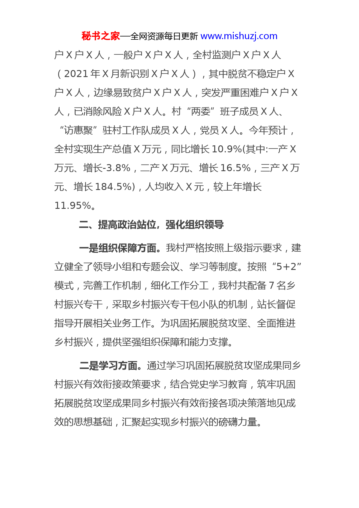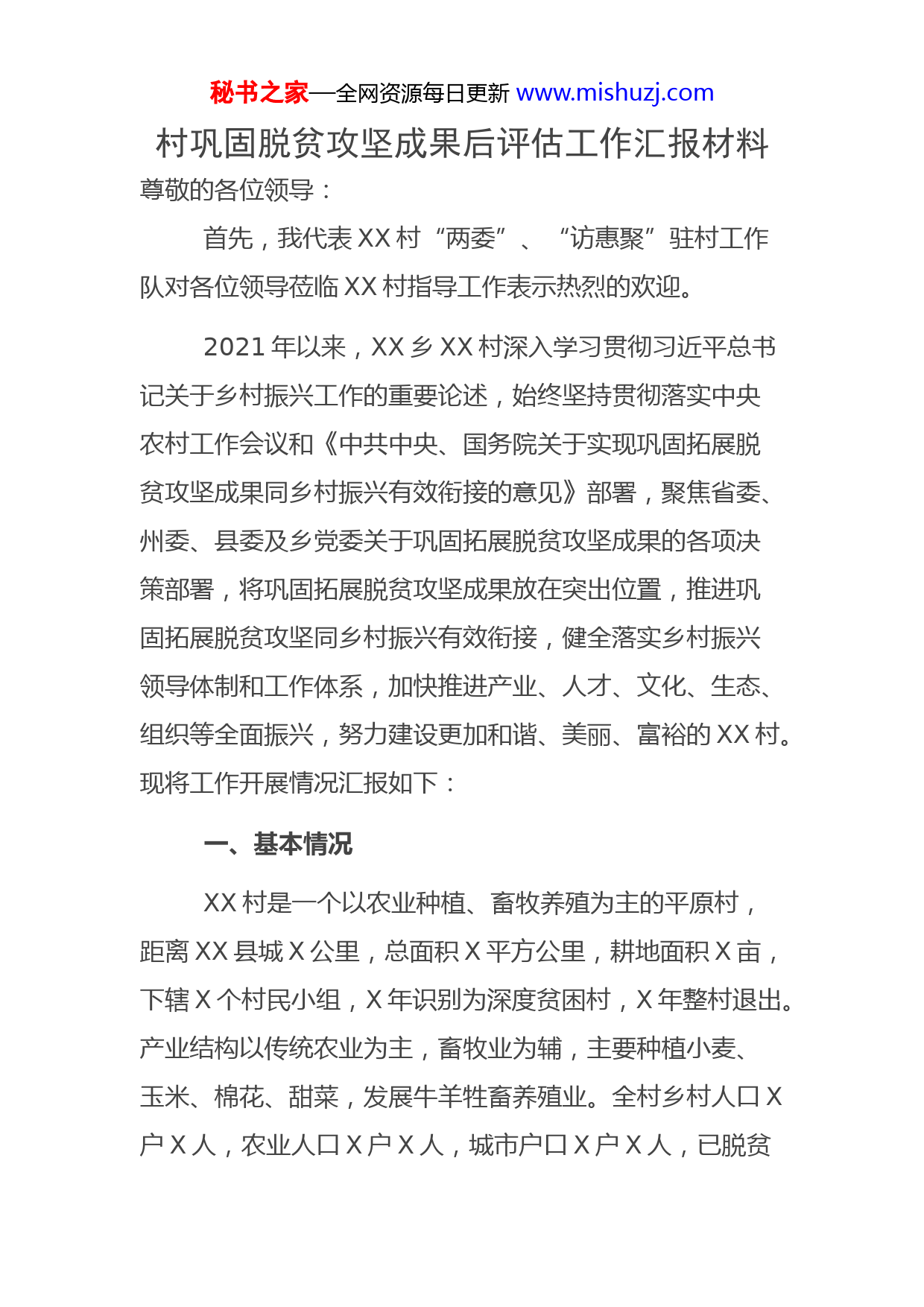秘书之家—全网资源每日更新www.mishuzj.com村巩固脱贫攻坚成果后评估工作汇报材料尊敬的各位领导:首先,我代表XX村“两委”、“访惠聚”驻村工作队对各位领导莅临XX村指导工作表示热烈的欢迎。2021年以来,XX乡XX村深入学习贯彻习近平总书记关于乡村振兴工作的重要论述,始终坚持贯彻落实中央农村工作会议和《中共中央、国务院关于实现巩固拓展脱贫攻坚成果同乡村振兴有效衔接的意见》部署,聚焦省委、州委、县委及乡党委关于巩固拓展脱贫攻坚成果的各项决策部署,将巩固拓展脱贫攻坚成果放在突出位置,推进巩固拓展脱贫攻坚同乡村振兴有效衔接,健全落实乡村振兴领导体制和工作体系,加快推进产业、人才、文化、生态、组织等全面振兴,努力建设更加和谐、美丽、富裕的XX村。现将工作开展情况汇报如下:一、基本情况XX村是一个以农业种植、畜牧养殖为主的平原村,距离XX县城X公里,总面积X平方公里,耕地面积X亩,下辖X个村民小组,X年识别为深度贫困村,X年整村退出。产业结构以传统农业为主,畜牧业为辅,主要种植小麦、玉米、棉花、甜菜,发展牛羊牲畜养殖业。全村乡村人口X户X人,农业人口X户X人,城市户口X户X人,已脱贫秘书之家—全网资源每日更新www.mishuzj.com户X户X人,一般户X户X人,全村监测户X户X人(2021年X月新识别X户X人),其中脱贫不稳定户X户X人,边缘易致贫户X户X人,突发严重困难户X户X人,已消除风险X户X人。村“两委”班子成员X人、“访惠聚”驻村工作队成员X人,党员X人。今年预计,全村实现生产总值X万元,同比增长10.9%(其中:一产X万元、增长-3.8%,二产X万元、增长16.5%,三产X万元、增长184.5%),人均收入X元,较上年增长11.95%。二、提高政治站位,强化组织领导一是组织保障方面。我村严格按照上级指示要求,建立健全了领导小组和专题会议、学习等制度。按照“5+2”模式,完善工作机制,细化工作分工,我村共配备7名乡村振兴专干,采取乡村振兴专干包小队的机制,站长督促指导开展相关业务工作。为巩固拓展脱贫攻坚、全面推进乡村振兴,提供坚强组织保障和能力支撑。二是学习方面。通过学习巩固拓展脱贫攻坚成果同乡村振兴有效衔接政策要求,结合党史学习教育,筑牢巩固拓展脱贫攻坚成果同乡村振兴有效衔接各项决策落地见成效的思想基础,汇聚起实现乡村振兴的磅礴力量。秘书之家—全网资源每日更新www.mishuzj.com三是做好安排部署方面。成立以村第一书记为组长,包村领导、支部书记、村委会主任为副组长,其他村“两委”成员、工作队队员及村各支力量为组员的乡村振兴工作领导小组,定期组织开展巩固脱贫攻坚成果同乡村振兴有效衔接专题学习会、工作部署会,不断提升干部理论学习积极性和主动性,指明工作方向。三、多措并举确保政策落地有效,进一步巩固脱贫攻坚成果(一)建立帮扶机制,确保措施落地以巩固拓展脱贫攻坚成果集中排查为抓手,自今年以来,我村共组织X次防返贫风险摸排,X次收入测算工作,采取逐户过、户户筛、日研判等方式,对全村农村居民基本信息、两不愁三保障和安全饮水、经济收入、劳动力就业等情况进行全覆盖摸排核查,力求摸清底数、精准研判、建立台账、分类施策,制定针对性帮扶措施,并形成工作机制,定期开展入户回访,确保措施落地落实。同时,依托新省脱贫攻坚大数据平台、乡村振兴大数据平台,建立健全防止返贫致贫监测预警和动态帮扶机制,充分利用先进技术手段提升监测准确性,坚持动态监测、实时预警、未贫先防、突贫速扶、常态清零,做到早发现、早干预、秘书之家—全网资源每日更新www.mishuzj.com早帮扶,坚决守住不发生规模性返贫底线。目前,全村X户X年收入信息已采集完成,并制作明白卡。(二)持续巩固提升,拓展脱贫成果1.加大教育扶贫力度,阻断贫困代际传递。一是全面实现学前和义务教育阶段国家通用语言文字教育全覆盖,适龄适学儿童入学率100%。全村义务教育阶段在校学生X名(小学生X名,初中生X名);义务教育阶段全村有X名残疾儿童,其中随班就读X名,送教上门X名。二是全面落实江西援省奖励项目。2021年,全村共计X名大中专及以上学生享受资助,其中助学金X名,新生入学资助X名,雨露计划X名。三是全面落实义务教育及各项教育资助政策,保证学生有学上、上得起学、不辍学。2.加大健康扶贫力度,防止因病致贫返贫。扎实落实好全民免费健康体检、城乡居民基本医疗保险、大病保险、大病救助政策。村卫生室配备X名村医,常用药配备达80余种,切实做到小病不出村,实现家庭医生签约和家庭“小药箱”全覆盖,对X名慢病患者开展慢病签约服务,X名大病患者集中救治。3.加大基础设施建设力度,改善生产生活条件。按照“缺项补项”原则,着力改善全村基础设施条件。目前全秘书之家—全网资源每日更新www.mishuzj.com村“五通七有”全部达标,2013以来全村形成的公益类扶贫项目X个,投入资金X万元。(三)聚心聚责聚力,带动农民增收一是产业发展助增收。在农业可持续发展的道路上,XX村始终在农业生产安全、环保、绿色、高效上着力。2021年力争打造以小麦种植为主要的X亩高产示范田,土地平整X亩。以优化产业结构,辐射带动农民增加收入。二是稳岗就业促增收。1.抓好转移就业工作。截止目前,我村劳动力X人,已就业X人,就业率X%,其中省外就业X人,县外省内就业X人,