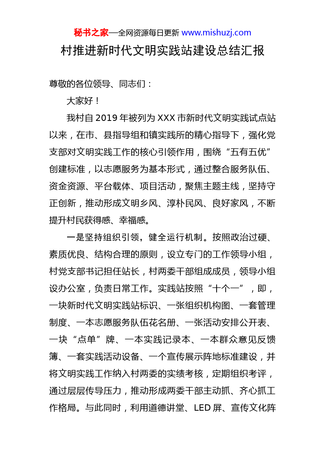 秘书之家—全网资源每日更新www.mishuzj.com村推进新时代文明实践站建设总结汇报尊敬的各位领导、同志们:大家好!我村自2019年被列为XXX市新时代文明实践试点站以来,在市、县指导组和镇实践所的精心指导下,强化党支部对文明实践工作的核心引领作用,围绕“五有五优”创建标准,以志愿服务为基本形式,通过整合服务队伍、资金资源、平台载体、项目活动,聚焦主题主线,坚持守正创新,推动形成文明乡风、淳朴民风、良好家风,不断提升村民获得感、幸福感。一是坚持组织引领,健全运行机制。按照政治过硬、素质优良、结构合理的原则,设立专门的工作领导小组,村党支部书记担任站长,村两委干部组成成员,领导小组设办公室,负责日常工作。实践站按照“十个一”,即,一块新时代文明实践站标识、一张组织机构图、一套管理制度、一本志愿服务队伍花名册、一张活动安排公开表、一块“点单”牌、一本实践记录本、一本群众意见反馈簿、一套实践活动设备、一个宣传展示阵地标准建设,并将文明实践工作纳入村两委的实绩考核,定期组织考评,通过层层传导压力,推动形成两委干部主动抓、齐心抓工作格局。与此同时,利用道德讲堂、LED屏、宣传文化阵秘书之家—全网资源每日更新www.mishuzj.com地等常态开展社会宣传志愿服务活动,并在村公园、广场、文化墙等公共场所制作一批精良的景观式公益广告,营造浓厚宣传氛围,推动党的创新理论深入人心。二是整合各类资源,凝聚服务力量。积极挖掘志愿服务人才,由党员干部、村民代表、群团、乡贤等53人,组建新时代文明实践党员志愿服务队、巾帼护河志愿服务队、巾帼宣讲志愿服务队、环境卫生整治志愿服务队、爱心护航志愿服务队、乡村振兴志愿服务队等6支队伍,紧密结合农村群众实际需要,明确工作机制,为村民提供高质量、常态化、受欢迎的志愿服务。如,我村巾帼宣讲志愿服务队,发动本村腰鼓队、广场舞队60余名妇女队员加入宣讲队伍,组成7支小分队,以小品、快板、舞蹈、诗歌等贴近群众生活的说唱形式,每月常态化深入7个村民小组开展新思想、健康知识、疫情防控、移风易俗等宣讲活动。2019年,通过宣讲队移风易俗宣讲动员,村里的老林家90余岁的老母亲去世,老林没有选择大操大办,在礼仪都做到位的情况下简单安葬了老母亲,既不失传统孝道又做到了由繁化简;村里另一位年轻村民小杨搬家,只是约上几个至亲好友喝茶聊天庆祝来替代大摆宴席,使节俭养德成为乡村新风尚。2021年宣讲队联合县妇联制作的《永远跟党走,巾帼表决心》宣讲视频,把党的新思想送到群众心坎,与镇实践所宣讲队共同创作的《疫情防护我秘书之家—全网资源每日更新www.mishuzj.com来宣》宣讲快板,为XXX村筑起一道防疫墙,受到全村村民的欢迎。三是对接群众需求,丰富实践载体。实践站结合重大节日和各时期工作重点,通过收集群众“点单”需求,精心设计志愿服务项目,确保志愿服务队伍月月有活动,营造浓厚的志愿服务氛围。依托端午、重阳、中秋、春节等传统节日,积极与县实践中心以及镇实践站联动协作,开展不同主题、形式多样的志愿服务活动,为辖区群众特别是空巢老人、残疾人、孤寡老人等特殊群体,提供各类贴心的便民服务;在疫情防控工作中,组织各志愿服务队,配合村两委入户开展防控宣传、返乡人员摸排、疫苗接种动员,助力疫情防控;在人居环境整治工作中,实践站各志愿服务队分成7个小组,对全村环境卫生片区实行网格化包干管理,每家每户悬挂“门前三包”责任牌,组织村民每月开展一次环境卫生清理志愿服务活动,7个小组每月一评比,年终一总评,优秀组由村委会给予奖励,并组织异地参观学习,有效推动了村容村貌的美化优化。通过开展丰富的文明实践活动,有效打通了宣传群众、教育群众、关心群众、服务群众的“最后一米”。自文明实践站成立以来,累计开展大型文化志愿服务活动30余场,其他志愿服务活动150余场,受益群众超10000人次。四是厚植文化底蕴,推动乡风文明。我村历史悠久、秘书之家—全网资源每日更新www.mishuzj.com文化底蕴深厚,实践站充分结合农家书屋、XXX诗社、XX桥、文体广场等本村文化平台,积极打造“文明小城镇·和美XXX村”文明实践文化特色品牌,广泛开展广场舞、地方戏、诗词、书法绘画、剪纸等贴近群众的文体活动,活跃丰富群众文化生活。XXX诗社50余名会员,每年创作编印的诗选,用一首首饱蘸热情反映田间地头、风土人情正能量的诗词引领着文明新风尚。20XX年X月XX日,实践站联合镇实践所、文化馆等开展“不忘初心跟党走砥砺奋进新时代”庆祝中国共产党成立100周年主题活动,村民自主创作了一批主题鲜明、富有特色的歌舞、相声、传子木偶和剪纸非遗文化表演等节目,以歌言志、以乐寄情,展示了村民爱国爱党爱家乡的家国情怀和奋发向上的精神风貌。今年1月12日,为迎接虎年新春,实践站联动镇实践所、县总工会、文化馆、美术馆、博物馆开展“把福带回家·让春节更有年味儿”送福送春联活动,在村里广受好评,营造祥和、喜庆的节日氛围。以文育人、以文化人、淳风化俗,在潜移默化中,带动一部分村民远离了酒场、牌场,滋养了文明新风,推动了乡风文明建设。我村2019年荣获XXX市乡风文明示范村,2020年荣获福建省乡村振兴实绩突出村,2021年荣获