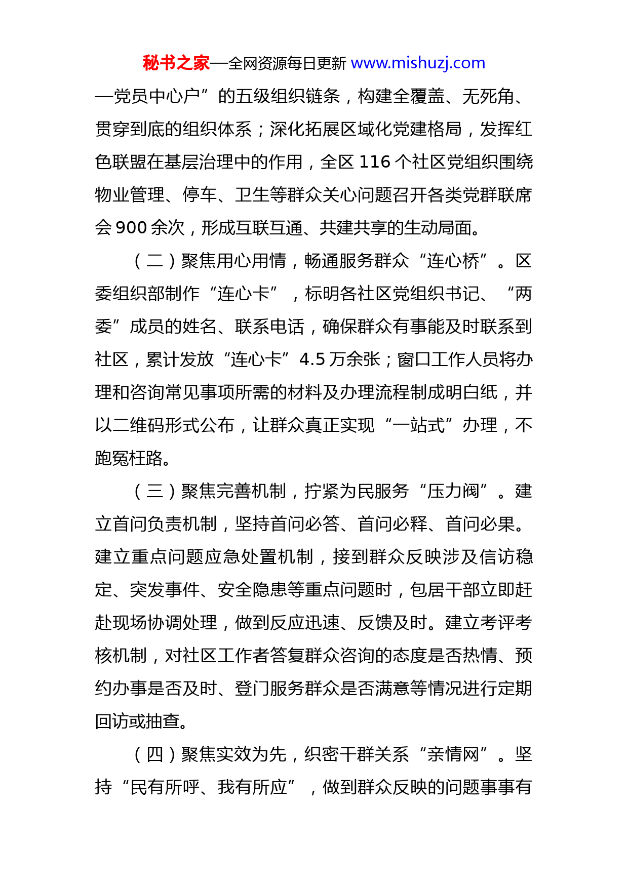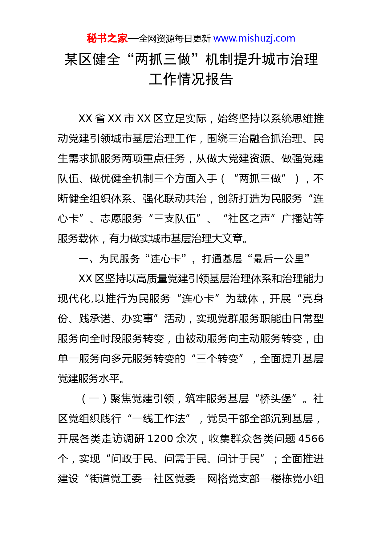 秘书之家—全网资源每日更新www.mishuzj.com某区健全“两抓三做”机制提升城市治理工作情况报告XX省XX市XX区立足实际,始终坚持以系统思维推动党建引领城市基层治理工作,围绕三治融合抓治理、民生需求抓服务两项重点任务,从做大党建资源、做强党建队伍、做优健全机制三个方面入手(“两抓三做”),不断健全组织体系、强化联动共治,创新打造为民服务“连心卡”、志愿服务“三支队伍”、“社区之声”广播站等服务载体,有力做实城市基层治理大文章。一、为民服务“连心卡”,打通基层“最后一公里”XX区坚持以高质量党建引领基层治理体系和治理能力现代化,以推行为民服务“连心卡”为载体,开展“亮身份、践承诺、办实事”活动,实现党群服务职能由日常型服务向全时段服务转变,由被动服务向主动服务转变,由单一服务向多元服务转变的“三个转变”,全面提升基层党建服务水平。(一)聚焦党建引领,筑牢服务基层“桥头堡”。社区党组织践行“一线工作法”,党员干部全部沉到基层,开展各类走访调研1200余次,收集群众各类问题4566个,实现“问政于民、问需于民、问计于民”;全面推进建设“街道党工委—社区党委—网格党支部—楼栋党小组秘书之家—全网资源每日更新www.mishuzj.com—党员中心户”的五级组织链条,构建全覆盖、无死角、贯穿到底的组织体系;深化拓展区域化党建格局,发挥红色联盟在基层治理中的作用,全区116个社区党组织围绕物业管理、停车、卫生等群众关心问题召开各类党群联席会900余次,形成互联互通、共建共享的生动局面。(二)聚焦用心用情,畅通服务群众“连心桥”。区委组织部制作“连心卡”,标明各社区党组织书记、“两委”成员的姓名、联系电话,确保群众有事能及时联系到社区,累计发放“连心卡”4.5万余张;窗口工作人员将办理和咨询常见事项所需的材料及办理流程制成明白纸,并以二维码形式公布,让群众真正实现“一站式”办理,不跑冤枉路。(三)聚焦完善机制,拧紧为民服务“压力阀”。建立首问负责机制,坚持首问必答、首问必释、首问必果。建立重点问题应急处置机制,接到群众反映涉及信访稳定、突发事件、安全隐患等重点问题时,包居干部立即赶赴现场协调处理,做到反应迅速、反馈及时。建立考评考核机制,对社区工作者答复群众咨询的态度是否热情、预约办事是否及时、登门服务群众是否满意等情况进行定期回访或抽查。(四)聚焦实效为先,织密干群关系“亲情网”。坚持“民有所呼、我有所应”,做到群众反映的问题事事有秘书之家—全网资源每日更新www.mishuzj.com回音、件件有落实,通过微信“网格群”等形式覆盖人数近10万人,社区群众主动拨打政策咨询电话4916个,先后帮助群众办理解决低保户申请、公租房廉租房申请、退役军人业务等具体事项2271件。主动帮扶济困,定期上门帮扶,对接生活困难党员群众1075余人(户)。二、“三支队伍”促服务,筑牢基层战斗堡垒为进一步提升社区治理效能,充分发挥基层党组织战斗堡垒和党员先锋模范作用,成立党员突击队、共青团员先锋队、志愿者服务队“三支队伍”,以实际行动服务群众,助力各项重点工作任务。(一)“双报到”吹响集结号。发放“党员志愿服务卡”,号召辖区内65岁以下党员参与志愿服务工作,向全体机关企事业单位党员发出倡议书,发动党员到社区报到并参加社区志愿服务。截至目前,全区8600余名党员响应号召向社区党组织报到,组建“党员突击队”115支。(二)“双助力”当好排头兵。各街道社区对“双报到”在职党员进行统一调度、有序分工,推动群众所需与志愿者所能精准对接、动态对接,根据党员填报的志愿服务项目意向,进行人岗匹配,组建志愿服务小分队,充分发挥党员作用。(三)“双评价”提升积极性。按照“社区评价+群众评价”相结合的方式,由各基层党支部及时、完整、准确秘书之家—全网资源每日更新www.mishuzj.com记录党员到居住地社区参与志愿服务工作开展情况,对在志愿服务中表现好的及时给予表扬,向党员所在党组织进行反馈,发放《关于在职党员参与社区抗疫志愿服务的反馈函》6200余份,确保党员所在党组织了解党员实际表现,以评价反馈激励在职党员参与社区志愿服务的积极性。三、“社区之声”抓宣传,深化党建引领三治融合XX区创新社区服务方式,在全区推行“社区广播站”工作制度,引导基层党组织围绕德治、法治、自治“三治融合”方法,抓好基层治理工作,积极宣传群众、引领群众、发动群众、团结群众,切实做到用身边事引导身边人、用身边人感染周围人,形成邻里守望的良好氛围,促进基层治理水平再上新台阶。(一)传播党建好声音。社区工作人员、各网格党支部党员、共建单位党员以及热心居民积极参与社区广播站工作,通过朗读诗歌、讲述党史、功勋人物介绍等形式,让自学与帮学得到有力实践,红色基因得到有力传承,让红色传播“不掉线”,多形式、多载体传播党的好声音。(二)宣传身边正能量。为更好地传播社区声音,XX区已有35个社区建起了“社区之声”广播站,播报内容涉及社区好人好事、社区评论、党建知识课堂、美文共赏、时政速递等,播报形式新颖,题材丰富,着力打造接地秘书之家—全网资源每日更新www.mishuzj.com气、连民心的移动宣传阵地。(三)打造政策“随身听