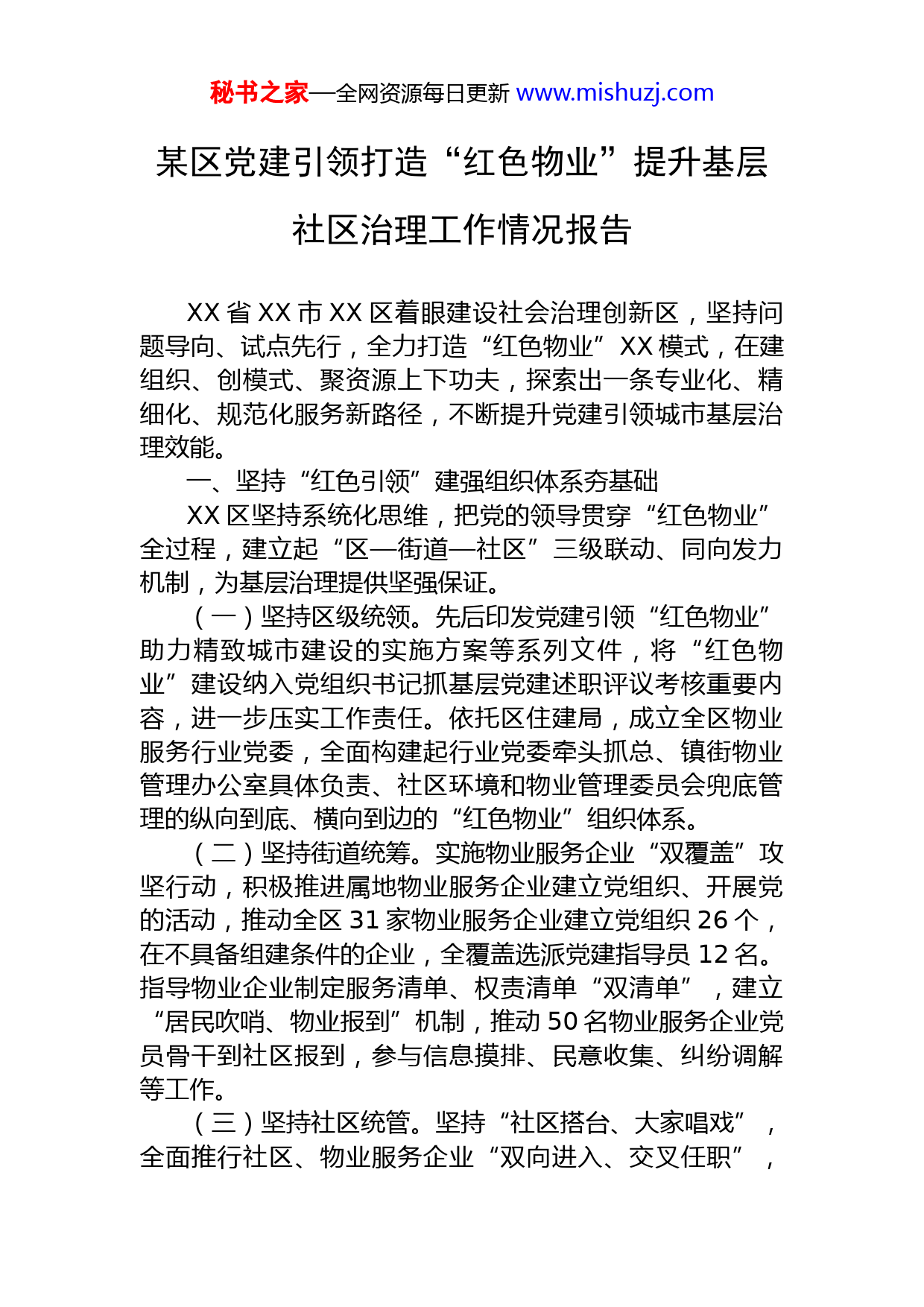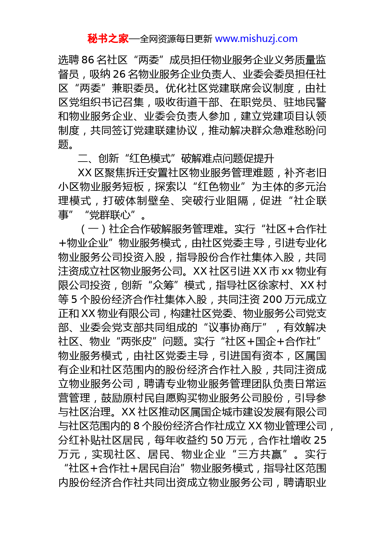 秘书之家—全网资源每日更新www.mishuzj.com某区党建引领打造“红色物业”提升基层社区治理工作情况报告XX省XX市XX区着眼建设社会治理创新区,坚持问题导向、试点先行,全力打造“红色物业”XX模式,在建组织、创模式、聚资源上下功夫,探索出一条专业化、精细化、规范化服务新路径,不断提升党建引领城市基层治理效能。一、坚持“红色引领”建强组织体系夯基础XX区坚持系统化思维,把党的领导贯穿“红色物业”全过程,建立起“区—街道—社区”三级联动、同向发力机制,为基层治理提供坚强保证。(一)坚持区级统领。先后印发党建引领“红色物业”助力精致城市建设的实施方案等系列文件,将“红色物业”建设纳入党组织书记抓基层党建述职评议考核重要内容,进一步压实工作责任。依托区住建局,成立全区物业服务行业党委,全面构建起行业党委牵头抓总、镇街物业管理办公室具体负责、社区环境和物业管理委员会兜底管理的纵向到底、横向到边的“红色物业”组织体系。(二)坚持街道统筹。实施物业服务企业“双覆盖”攻坚行动,积极推进属地物业服务企业建立党组织、开展党的活动,推动全区31家物业服务企业建立党组织26个,在不具备组建条件的企业,全覆盖选派党建指导员12名。指导物业企业制定服务清单、权责清单“双清单”,建立“居民吹哨、物业报到”机制,推动50名物业服务企业党员骨干到社区报到,参与信息摸排、民意收集、纠纷调解等工作。(三)坚持社区统管。坚持“社区搭台、大家唱戏”,全面推行社区、物业服务企业“双向进入、交叉任职”,秘书之家—全网资源每日更新www.mishuzj.com选聘86名社区“两委”成员担任物业服务企业义务质量监督员,吸纳26名物业服务企业负责人、业委会委员担任社区“两委”兼职委员。优化社区党建联席会议制度,由社区党组织书记召集,吸收街道干部、在职党员、驻地民警和物业服务企业、业委会负责人参加,建立党建项目认领制度,共同签订党建联建协议,推动解决群众急难愁盼问题。二、创新“红色模式”破解难点问题促提升XX区聚焦拆迁安置社区物业服务管理难题,补齐老旧小区物业服务短板,探索以“红色物业”为主体的多元治理模式,打破体制壁垒、突破行业阻隔,促进“社企联事”“党群联心”。(一)社企合作破解服务管理难。实行“社区+合作社+物业企业”物业服务模式,由社区党委主导,引进专业化物业服务公司投资入股,指导股份合作社集体入股,共同注资成立社区物业服务公司。XX社区引进XX市xx物业有限公司投资,创新“众筹”模式,指导社区徐家村、XX村等5个股份经济合作社集体入股,共同注资200万元成立正和XX物业有限公司,构建社区党委、物业服务公司党支部、业委会党支部共同组成的“议事协商厅”,有效解决社区、物业“两张皮”问题。实行“社区+国企+合作社”物业服务模式,由社区党委主导,引进国有资本,区属国有企业和社区范围内的股份经济合作社入股,共同注资成立物业服务公司,聘请专业物业服务管理团队负责日常运营管理,鼓励原村民自愿购买物业服务公司股份,引导参与社区治理。XX社区推动区属国企城市建设发展有限公司与社区范围内的8个股份经济合作社成立XX物业管理公司,分红补贴社区居民,每年收益约50万元,合作社增收25万元,实现社区、居民、物业企业“三方共赢”。实行“社区+合作社+居民自治”物业服务模式,指导社区范围内股份经济合作社共同出资成立物业服务公司,聘请职业秘书之家—全网资源每日更新www.mishuzj.com经理人负责日常运营管理。XX家园社区依托“自治”物业服务公司,根据营利金额为参股居民减免部分物业费,为老年人、困难户缴纳物业费,免费为广大居民完善和修缮社区基础设施,小区物业费收缴率由不足50%提升至90%,有效解决社区物业收费难问题。(二)政府兜底破解服务提升难。针对老旧小区物业服务覆盖难题,探索实行街道“兜底打包”模式,将老旧小区纳入社区范围内商业小区物业服务项目。累计改造老旧小区8个,惠及居民1868户,聘请物业服务企业5家,兜底管理小区3个,实现已改造老旧小区专业化物业服务全覆盖。围绕老旧小区“脏乱差”、物业居民矛盾多等难题,开展小区基础提升和安全隐患整治集中行动,做好整修路面、增设垃圾分类装置、畅通小区消防通道等工作,推动老旧小区旧貌换新颜。三、激活“红色资源”实现融合共治提效能XX区坚持以提升民生福祉为目标,将各方资源统筹整合、攥指成拳,实现工作上无缝化衔接、诉求上立体化响应、服务上精细化提升,不断提高居民幸福指数。(一)强化基本保障。制定区级物业服务质量综合评价办法,出台“红色物业”工作标准,细化2大类14小项标准,给予小区业委会相应评价权,赋予社区党组织综合评定权,定期对物业企业进行考核评价,对服务不到位的、安全隐患较多的小区,约谈物业服务企业负责人,及时清理整顿,着力构建奖优罚劣、引进先进、淘汰落后的工作机制。建立物业企业“红黑榜”制度,开展星级企业、星级项目创建活动,将党建工作开展情况纳入星级评价体系打造一支有凝聚力、行动力的物业企业先锋力量。健全物业管理联席会、业主恳谈会和人民调解委员会三方议事管事办事体系,党员示范带头、居民积极跟进,推进解决小区内重要事项、