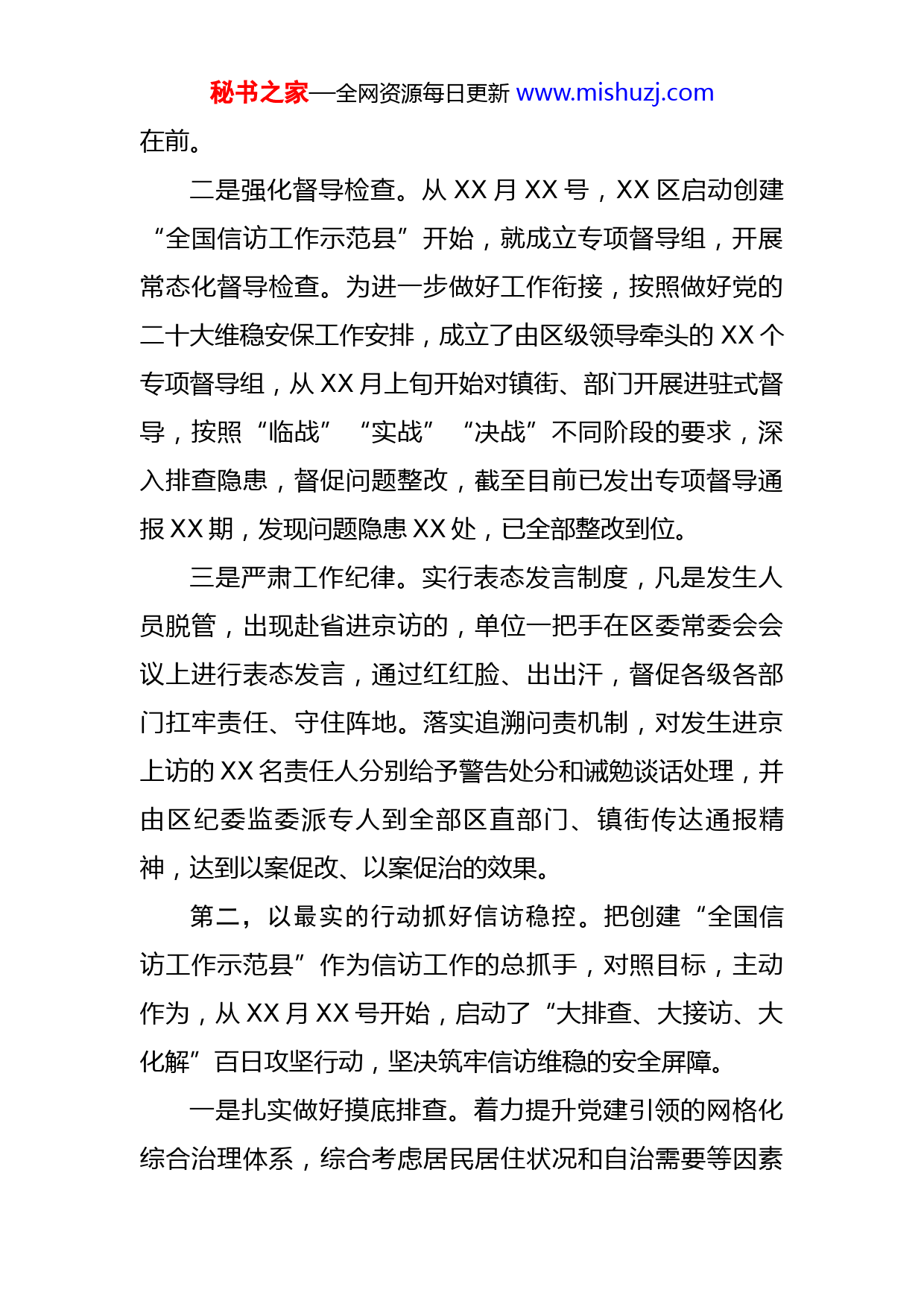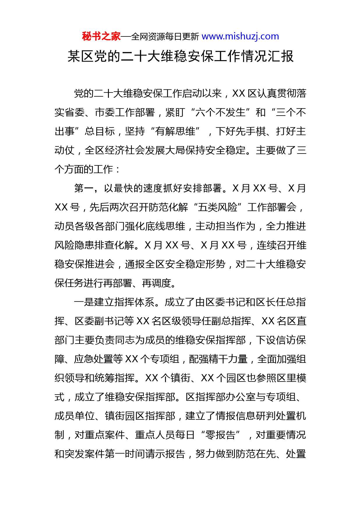 秘书之家—全网资源每日更新www.mishuzj.com某区党的二十大维稳安保工作情况汇报党的二十大维稳安保工作启动以来,XX区认真贯彻落实省委、市委工作部署,紧盯“六个不发生”和“三个不出事”总目标,坚持“有解思维”,下好先手棋、打好主动仗,全区经济社会发展大局保持安全稳定。主要做了三个方面的工作:第一,以最快的速度抓好安排部署。X月XX号、X月XX号,先后两次召开防范化解“五类风险”工作部署会,动员各级各部门强化底线思维,主动担当作为,全力推进风险隐患排查化解。X月XX号、X月XX号,连续召开维稳安保推进会,通报全区安全稳定形势,对二十大维稳安保任务进行再部署、再调度。一是建立指挥体系。成立了由区委书记和区长任总指挥、区委副书记等XX名区级领导任副总指挥、XX名区直部门主要负责同志为成员的维稳安保指挥部,下设信访保障、应急处置等XX个专项组,配强精干力量,全面加强组织领导和统筹指挥。XX个镇街、XX个园区也参照区里模式,成立了维稳安保指挥部。区指挥部办公室与专项组、成员单位、镇街园区指挥部,建立了情报信息研判处置机制,对重点案件、重点人员每日“零报告”,对重要情况和突发案件第一时间请示报告,努力做到防范在先、处置秘书之家—全网资源每日更新www.mishuzj.com在前。二是强化督导检查。从XX月XX号,XX区启动创建“全国信访工作示范县”开始,就成立专项督导组,开展常态化督导检查。为进一步做好工作衔接,按照做好党的二十大维稳安保工作安排,成立了由区级领导牵头的XX个专项督导组,从XX月上旬开始对镇街、部门开展进驻式督导,按照“临战”“实战”“决战”不同阶段的要求,深入排查隐患,督促问题整改,截至目前已发出专项督导通报XX期,发现问题隐患XX处,已全部整改到位。三是严肃工作纪律。实行表态发言制度,凡是发生人员脱管,出现赴省进京访的,单位一把手在区委常委会会议上进行表态发言,通过红红脸、出出汗,督促各级各部门扛牢责任、守住阵地。落实追溯问责机制,对发生进京上访的XX名责任人分别给予警告处分和诫勉谈话处理,并由区纪委监委派专人到全部区直部门、镇街传达通报精神,达到以案促改、以案促治的效果。第二,以最实的行动抓好信访稳控。把创建“全国信访工作示范县”作为信访工作的总抓手,对照目标,主动作为,从XX月XX号开始,启动了“大排查、大接访、大化解”百日攻坚行动,坚决筑牢信访维稳的安全屏障。一是扎实做好摸底排查。着力提升党建引领的网格化综合治理体系,综合考虑居民居住状况和自治需要等因素秘书之家—全网资源每日更新www.mishuzj.com人重塑优化全区基层治理网格,实现多网合一、一网通办,全区城乡网格总数达到XXXX个、规范设置专兼职网格员XXXX名。发挥网格员探头作用,结合开展网格员“敲门问候”活动,对重点群体、重点人员、重点领域,开展全覆盖、拉网式排查摸底,实现横向联动、纵向互动,确保把各类风险点找准找实。对排查梳理的XXXX个信访隐患逐一建立台账,并制定防范化解措施,最大限度地除风险、消隐患。二是扎实做好案件化解。坚持抓早抓小抓了,认真学习贯彻《信访工作条例》,严格落实区、镇两级领导干部公开接访、“首接负责制”等制度,把矛盾化解在初始阶段、消除在萌芽状态,防止增量变存量、新案变积案。严格落实“三到位一处理”和领导干部包案制度,国家交办的XX件重复信访事项已化解XX件,省级交办的XX件已化解XX件,剩余案件已逐一制定了化解计划,确保XX月底前全部化解。同时,XX区自我加压,树立“填窟窿也是发展”的理念,启动了“遗留问题化解”战役,梳理历年来积攒的XXX多项遗留问题,计划每年都化解一批,一年接着一年干,力争五年内全部化解。今年确定的XXXXX、XXXXX厂改制、XXX等14项涉及群众切身利益的遗留问题,由区人大、区政协XXX名副县级领导挂帅包保,实行专班推进,区委每月召开一次调度会议,目秘书之家—全网资源每日更新www.mishuzj.com前,XX项遗留问题全部取得实质性进展,有些有望近期解决。三是扎实做好人员稳控。时刻绷紧“维稳安保工作重点还是管住人”这根弦,全面梳理涉军队退役、涉众投资受损及时消除影响。在《XX新闻》和“XX融媒”客户端上开设,喜迎党的二十大专栏;开展“最美抗疫人”“最美劳动者”“最美村支书”等系列表扬活动,营造喜迎二十大、奋进新时代的浓厚氛围。四是全力抓好疫情防控安全。坚持“外防输入、内防反弹”总策略和“动态清零”总方针不动摇,落实省委“工作部署,累计摸排市外、境外来人XXX万人,“点对点”专车接送火车站、省内机场来人XXX人;组织做好全区核酸检测工作,规划设置“愿检尽检”采样点XXX处,市级储备便民采样小屋XX处,严格落实“36类重点人群”扩围加密检测,开展XXX轮区域全员核酸检测,共XXXX万人次;新建XX集中隔离方舱XXXX间,已启动第二批集中隔离点建设、新增床位XXX张;全区储备集中隔离场所XX处、隔离房间XXXX间。完成XX人员、XXX学生转运隔离和XXX来人分流接驳等任务,有力服务保障了全省、全市疫情防控大局。五是全力抓好安全生产。按照省委省政府安全生产“八抓”XX项创新举措、市委市政府安全生产“六个强秘书之家—全网资源每日更新www.mishuzj.com化”XX项具体措施的要求,深入推进安全生产专项整
