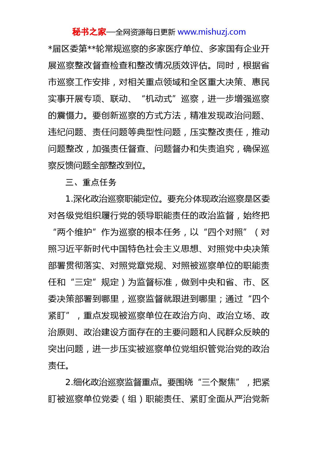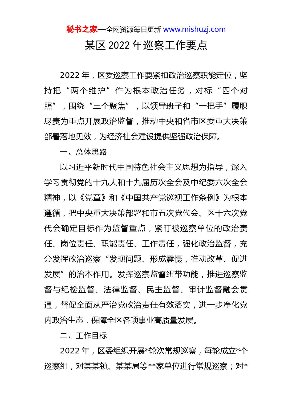秘书之家—全网资源每日更新www.mishuzj.com某区2022年巡察工作要点2022年,区委巡察工作要紧扣政治巡察职能定位,坚持把“两个维护”作为根本政治任务,对标“四个对照”,围绕“三个聚焦”,以领导班子和“一把手”履职尽责为重点开展政治监督,推动中央和省市区委重大决策部署落地见效,为经济社会建设提供坚强政治保障。一、总体思路以习近平新时代中国特色社会主义思想为指导,深入学习贯彻党的十九大和十九届历次全会及中纪委六次全会精神,以《党章》和《中国共产党巡视工作条例》为根本遵循,把中央重大决策部署和市五次党代会、区十六次党代会确定目标作为监督重点,紧盯被巡察单位的政治责任、岗位责任、职能责任、工作责任,强化政治监督,充分发挥政治巡察“发现问题、形成震慑,推动改革、促进发展”的治本作用。发挥巡察监督纽带功能,推进巡察监督与纪检监督、法律监督、民主监督、审计监督融会贯通,督促全面从严治党政治责任有效落实,进一步净化党内政治生态,保障全区各项事业高质量发展。二、工作目标2022年,区委组织开展轮次常规巡察,每轮成立个巡察组,对某某镇、某某局等家单位进行常规巡察;对秘书之家—全网资源每日更新www.mishuzj.com届区委第轮常规巡察的多家医疗单位、多家国有企业开展巡察整改督查检查和整改情况质效评估。同时,根据省市巡察工作安排,对相关重点领域和全区重大决策、惠民实事开展专项、联动、“机动式”巡察,进一步增强巡察的震慑力。要创新巡察的方式方法,精准发现政治问题、违纪问题、责任问题等典型性问题,压实整改责任,推动问题整改,加强责任督查、问题督办和失责追究,确保巡察反馈问题全部整改到位。三、重点任务1.深化政治巡察职能定位。要充分体现政治巡察是区委对各级党组织履行党的领导职能责任的政治监督,始终把“两个维护”作为巡察的根本任务,以“四个对照”(对照习近平新时代中国特色社会主义思想、对照党中央决策部署贯彻落实、对照党章党规、对照被巡察单位的职能责任和“三定”规定)为监督标准,做到中央和省、市、区委决策部署到哪里,巡察监督就跟进到哪里;通过“四个紧盯”,重点发现被巡察单位在政治方向、政治立场、政治原则、政治建设方面存在的主要问题和人民群众反映的突出问题,进一步压实被巡察单位党组织管党治党的政治责任。2.细化政治巡察监督重点。要围绕“三个聚焦”,把紧盯被巡察单位党委(组)职能责任、紧盯全面从严治党新秘书之家—全网资源每日更新www.mishuzj.com阶段的主要矛盾和矛盾的主要方面、紧盯领导班子和关键少数、紧盯人民群众反映强烈的突出问题作为巡察工作的切入点,抓实驻点巡察和巡察反馈问题整改督查检查两个关键环节,力求巡深巡透,把问题找准找实,把责任厘清点明,提高巡察监督的针对性。(1)突出加强对习近平总书记重要讲话指示批示精神和党的重大决策部署落实情况的监督。一是贯彻落实习近平新时代中国特色社会主义思想、总书记视察甘肃时的讲话和对行业领域指示批示精神情况。重点查找对习近平重要讲话精神传达不及时、领导责任落实不到位、工作机制不健全、工作成效不扎实,在贯彻落实中重形不重效,表态多调门高、行动少落实差;政治意识不强,政治纪律和政治规矩执行不到位,请示报告制度执行不严格等问题。二是贯彻落实党中央重大决策部署情况。重点查找党中央关于“三新一高”、落实“十四五规划”、维护国家安全、促进共同富裕、实施乡村振兴战略等重大决策部署打折扣、脱离实际等问题;主要查找市区党代会确定目标推进不力,工作拖拉等问题。三是落实中央八项规定精神和整治“四风”情况。重点查找被巡察党组织不严不实作风问题突出,形式主义、官僚主义问题反弹回潮;文山会海、督查检查考核过多过频、增加基层负担等形式主义问题,以及脱离群众、脱离一线、“衙门作风”等官僚主义秘书之家—全网资源每日更新www.mishuzj.com问题。检查督查考核不注重实际效果,名目繁多、交叉重复、过度留痕、增加下级负担。(2)突出加强对“两个责任”和关键少数的监督。一是坚持和加强党的全面领导的情况。重点查找被巡察党组织和领导干部不全面履行管党治党政治责任,党的政治建设弱化、意识形态责任制落实不到位、选人用人失责失察、权力运行缺乏监督制约等问题。二是担当尽责、为民服务情况。重点查找领导班子成员不主动担当、积极作为,领导干部安于现状、得过且过,不思进取、懒政怠政,患得患失、消极避事,“为了不出事,宁可不干事”;不深入基层联系群众,全面客观掌握基层和一线情况,漠视群众利益和疾苦,对群众反映强烈的问题无动于衷、消极应付,对群众提出的合理诉求推诿扯皮、冷硬横推,态度简单粗暴、激化群众矛盾等问题。三是三资管理和工程项目方面的廉洁情况。重点查找领导干部不遵守廉洁从政纪律,利用职权或影响力干预或操纵项目招投标、资金使用、资源分配等事项,搞内幕交易、权钱交易,牟取私利;各类财政资金使用管理混乱,虚列账目,挪用截留财政资金,违规举债,虚报工程套取国家补贴;工程项目建设和大宗物资采购监管不力,未经集体研究决策随意增加预算、擅改规划,不搞招投标、拆分规避招投