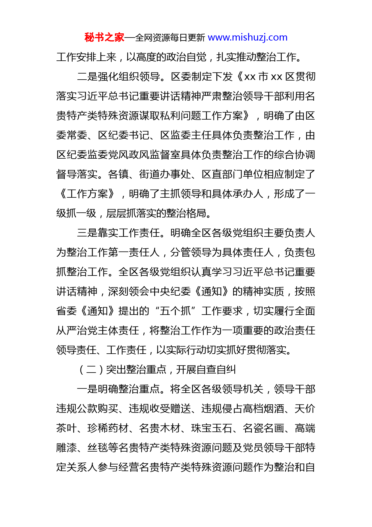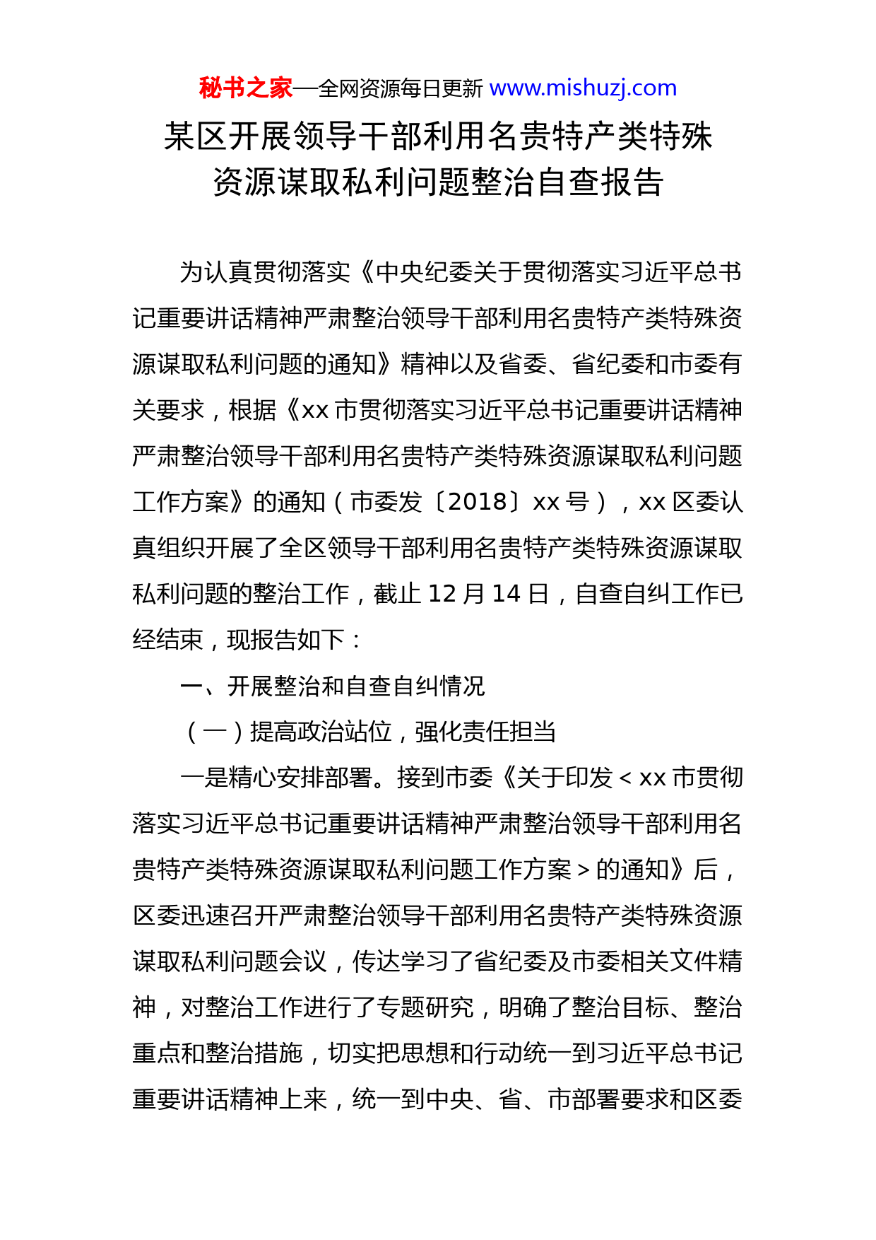秘书之家—全网资源每日更新www.mishuzj.com某区开展领导干部利用名贵特产类特殊资源谋取私利问题整治自查报告为认真贯彻落实《中央纪委关于贯彻落实习近平总书记重要讲话精神严肃整治领导干部利用名贵特产类特殊资源谋取私利问题的通知》精神以及省委、省纪委和市委有关要求,根据《xx市贯彻落实习近平总书记重要讲话精神严肃整治领导干部利用名贵特产类特殊资源谋取私利问题工作方案》的通知(市委发〔2018〕xx号),xx区委认真组织开展了全区领导干部利用名贵特产类特殊资源谋取私利问题的整治工作,截止12月14日,自查自纠工作已经结束,现报告如下:一、开展整治和自查自纠情况(一)提高政治站位,强化责任担当一是精心安排部署。接到市委《关于印发<xx市贯彻落实习近平总书记重要讲话精神严肃整治领导干部利用名贵特产类特殊资源谋取私利问题工作方案>的通知》后,区委迅速召开严肃整治领导干部利用名贵特产类特殊资源谋取私利问题会议,传达学习了省纪委及市委相关文件精神,对整治工作进行了专题研究,明确了整治目标、整治重点和整治措施,切实把思想和行动统一到习近平总书记重要讲话精神上来,统一到中央、省、市部署要求和区委秘书之家—全网资源每日更新www.mishuzj.com工作安排上来,以高度的政治自觉,扎实推动整治工作。二是强化组织领导。区委制定下发《xx市xx区贯彻落实习近平总书记重要讲话精神严肃整治领导干部利用名贵特产类特殊资源谋取私利问题工作方案》,明确了由区委常委、区纪委书记、区监委主任具体负责整治工作,由区纪委监委党风政风监督室具体负责整治工作的综合协调督导落实。各镇、街道办事处、区直部门单位相应制定了《工作方案》,明确了主抓领导和具体承办人,形成了一级抓一级,层层抓落实的整治格局。三是靠实工作责任。明确全区各级党组织主要负责人为整治工作第一责任人,分管领导为具体责任人,负责包抓整治工作。全区各级党组织认真学习习近平总书记重要讲话精神,深刻领会中央纪委《通知》的精神实质,按照省委《通知》提出的“五个抓”工作要求,切实履行全面从严治党主体责任,将整治工作作为一项重要的政治责任领导责任、工作责任,以实际行动切实抓好贯彻落实。(二)突出整治重点,开展自查自纠一是明确整治重点。将全区各级领导机关,领导干部违规公款购买、违规收受赠送、违规侵占高档烟酒、天价茶叶、珍稀药材、名贵木材、珠宝玉石、名瓷名画、高端雕漆、丝毯等名贵特产类特殊资源问题及党员领导干部特定关系人参与经营名贵特产类特殊资源问题作为整治和自秘书之家—全网资源每日更新www.mishuzj.com查自纠的工作重点,扎实推动整治工作。二是深入开展自查自纠。12月5日,接到市纪委转发《中共xx省纪委办公厅关于在整治领导干部利用名贵特产类特殊资源谋取私利问题中落实“五个抓”要求的通知》的电话通知后,区委对相关工作进行了安排,全区各级领导机关、领导干部围绕“违规公款购买、违规收送、违规占用、违规插手干预或参与经营的问题”,及时带头开展自查自纠,认真查找存在的问题,如实填写自查报告表,并向党组织作出郑重承诺。通过亲力亲为抓好整改落实,带头自查自纠,切实发挥表率引领作用,并把整治工作与正在开展的各类重点工作结合起来,高质量推动整治工作取得实效。截止目前,未发现领导干部利用名贵特产类特殊资源谋取私利的问题。三是加大抽查检查力度。12月12日开始,区纪委监委抽调纪检、审计、工商、税务、食品药品监管、商务、文化、林业等部门人员组成检查组,通过查阅账目、调取营业信息、税务发票等方式,对全区各级各部门开展整治情况和全区相关商业部门经营名贵特产情况进行了抽查检查。截止目前,未发现领导干部利用名贵特产类特殊资源谋取私利的问题和特定关系人参与经营名贵特产类特殊资源的问题。二、存在的问题及下一步工作打算秘书之家—全网资源每日更新www.mishuzj.com虽然全区的整治工作正在有序开展,但还是存在个别单位对整治工作重视不够,贯彻执行上级决策部署不到位的问题。下一步,全区各级党组织和党员领导干部将进一步认真贯彻落实《通知》要求,抓住“关键少数”,突出工作重点,靠实责任担当,扎实开展整治。一是将自查自纠贯穿到整治工作始终,查找突出问题,完善工作台账,推动问题整改。二是加强监督检查,严肃执纪问责,对于以名贵特产类特殊资源伪装成新样式的各种“四风”顽疾保持“零容忍”“露头就打”的高压态势,对自查自纠搞形式、走过场的党组织,一律严肃问责,并对查出的典型案例进行通报曝光,充分发挥警示教育作用。三是深入分析问题根源和发生规律,针对规范此类特殊资源生产经营秩序、斩断利益链条提出有针对性的措施,堵塞漏洞、建立制度,促进减遏并举、标本兼治。