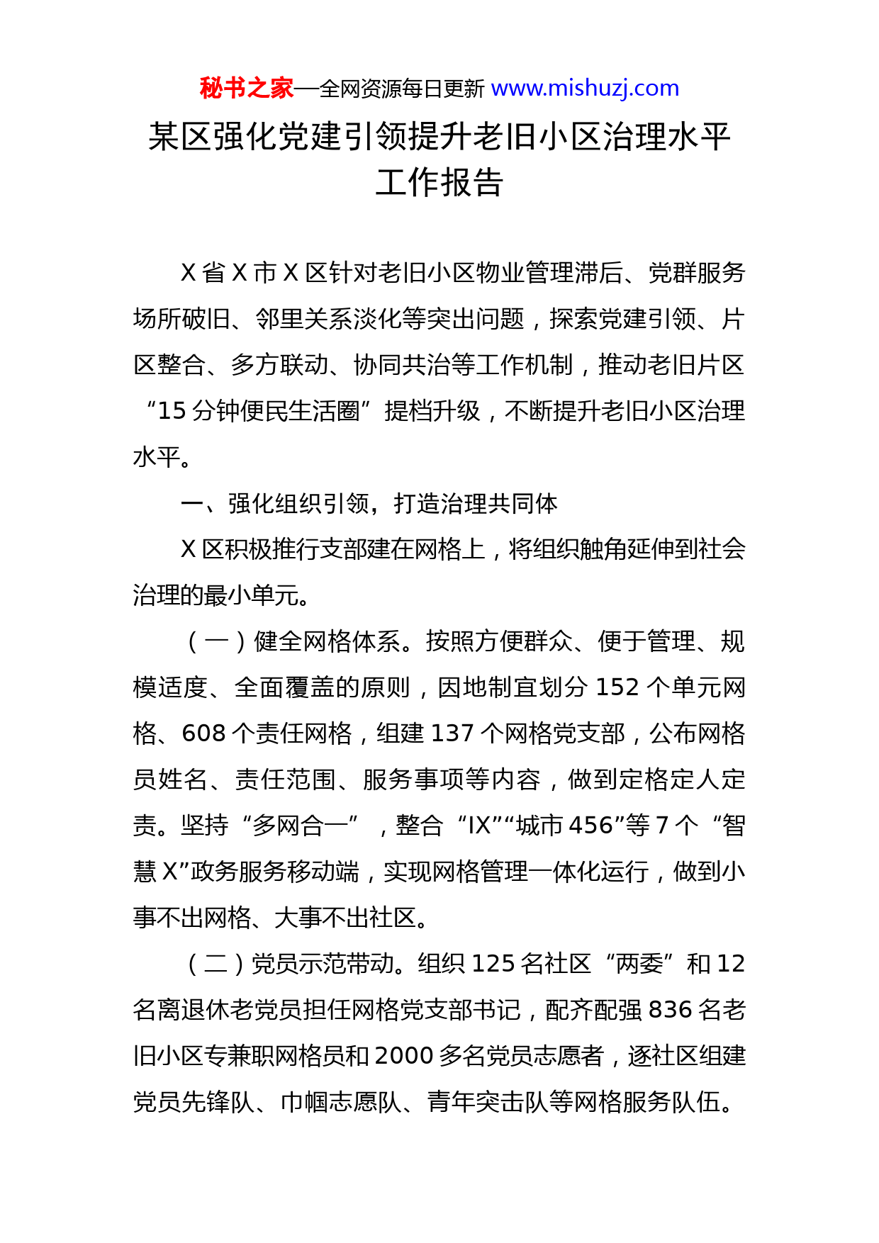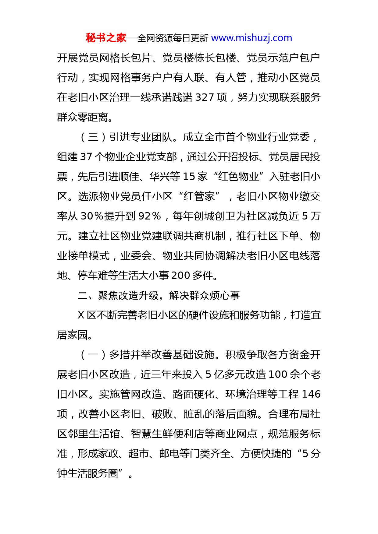 秘书之家—全网资源每日更新www.mishuzj.com某区强化党建引领提升老旧小区治理水平工作报告X省X市X区针对老旧小区物业管理滞后、党群服务场所破旧、邻里关系淡化等突出问题,探索党建引领、片区整合、多方联动、协同共治等工作机制,推动老旧片区“15分钟便民生活圈”提档升级,不断提升老旧小区治理水平。一、强化组织引领,打造治理共同体X区积极推行支部建在网格上,将组织触角延伸到社会治理的最小单元。(一)健全网格体系。按照方便群众、便于管理、规模适度、全面覆盖的原则,因地制宜划分152个单元网格、608个责任网格,组建137个网格党支部,公布网格员姓名、责任范围、服务事项等内容,做到定格定人定责。坚持“多网合一”,整合“IX”“城市456”等7个“智慧X”政务服务移动端,实现网格管理一体化运行,做到小事不出网格、大事不出社区。(二)党员示范带动。组织125名社区“两委”和12名离退休老党员担任网格党支部书记,配齐配强836名老旧小区专兼职网格员和2000多名党员志愿者,逐社区组建党员先锋队、巾帼志愿队、青年突击队等网格服务队伍。秘书之家—全网资源每日更新www.mishuzj.com开展党员网格长包片、党员楼栋长包楼、党员示范户包户行动,实现网格事务户户有人联、有人管,推动小区党员在老旧小区治理一线承诺践诺327项,努力实现联系服务群众零距离。(三)引进专业团队。成立全市首个物业行业党委,组建37个物业企业党支部,通过公开招投标、党员居民投票,先后引进顺佳、华兴等15家“红色物业”入驻老旧小区。选派物业党员任小区“红管家”,老旧小区物业缴交率从30%提升到92%,每年创城创卫为社区减负近5万元。建立社区物业党建联调共商机制,推行社区下单、物业接单模式,业委会、物业共同协调解决老旧小区电线落地、停车难等生活大小事200多件。二、聚焦改造升级,解决群众烦心事X区不断完善老旧小区的硬件设施和服务功能,打造宜居家园。(一)多措并举改善基础设施。积极争取各方资金开展老旧小区改造,近三年来投入5亿多元改造100余个老旧小区。实施管网改造、路面硬化、环境治理等工程146项,改善小区老旧、破败、脏乱的落后面貌。合理布局社区邻里生活馆、智慧生鲜便利店等商业网点,规范服务标准,形成家政、超市、邮电等门类齐全、方便快捷的“5分钟生活服务圈”。秘书之家—全网资源每日更新www.mishuzj.com(二)“拆墙并院”打破空间屏障。按照墙体相近、成本最适原则,打通78个零散老旧小区实现连片管理,涉及建筑面积136万平方米、居民26000余户、住宅楼房237栋。70多户“党员示范户”先后带头拆除自家储藏间、车库,让出活动空间,与居民结对入户500多家,劝说邻里清退圈占绿地、消防通道,腾出1000多平方米公共场所,有效解决老旧小区“墙中有墙、院中有院”等问题。(三)集约共享提升服务质效。先后腾挪使用闲置活动场馆2万多平方米,集约整合老旧小区周边的邻里广场、夹层通道、户外驿站等100多个零散阵地,打造16个复合型社区党群服务中心,升级建设养老服务设施36家、卫生服务站点52个。推进“智慧红点社区”建设,设立205个政务服务自助服务点和便民服务代办点,引导市、区两级下沉服务事项327项,实现生活大小事“就近办”。三、凝聚治理合力,搭建邻里连心桥X区组织多元力量融入老旧小区治理,形成人人都是参与者的良好氛围。(一)推动力量下沉。落实“双报到”制度,推动53家区直单位党组织和2000多名在职党员到小区报到服务,帮助化解环境脏乱差、高空抛物等急难愁盼问题800余秘书之家—全网资源每日更新www.mishuzj.com件。结合“百名科局长”和“百名警长”进百居等活动,组建阳光议事厅、小区恳谈会等议事平台120多个,协调解决信访纠纷等问题270多条。按照“一室多用”原则,协调派出所、司法、民政、卫健等部门下沉社区成立轮值中心,为居民提供法律援助、低保优抚等面对面服务。(二)开展志愿活动。发动小区党员、教师、新就业群体等热心人士,组建厝边帮帮团、新就业群体巡逻队等志愿服务队289支,依托居民点单、社区派单、党员接单机制,为群众提供教育卫生、诉求化解等精准式服务341次。分区归类打造老人日间照料服务中心、长者食堂以及青少年活动中心、儿童之家等124个“老少乐”服务阵地,定期开展“向日葵”成长计划、“耆老”服务计划,累计服务小区困难儿童、孤寡老人等6200多人次。(三)深化邻里互助。建立“党员议事会”“邻里议事厅”,坚持群众事群众议群众定,将议事会开到院落家门口,妥善解决了小区停车难、飞线落地等烦心事120多件。发动社区书画社、南音社等群众组织,采取书画展、南音表演等群众喜闻乐见的活动形式,结合传统习俗节日常态化举办54场“邻里节”系列活动,每年春节送春联、元宵搓汤圆、重阳敬老会,弘扬传统、和睦邻里。常态化举办长者生日宴、健康科普巡讲等特色邻里活动2000多场次,引导居民走出小家、融入大家。