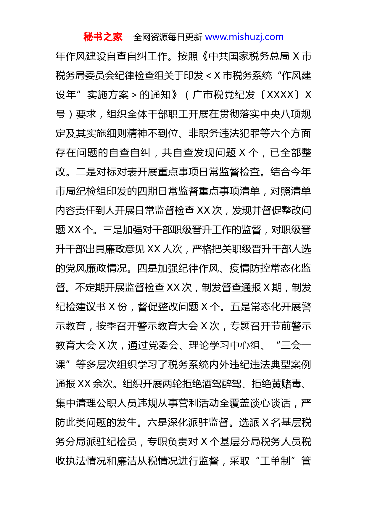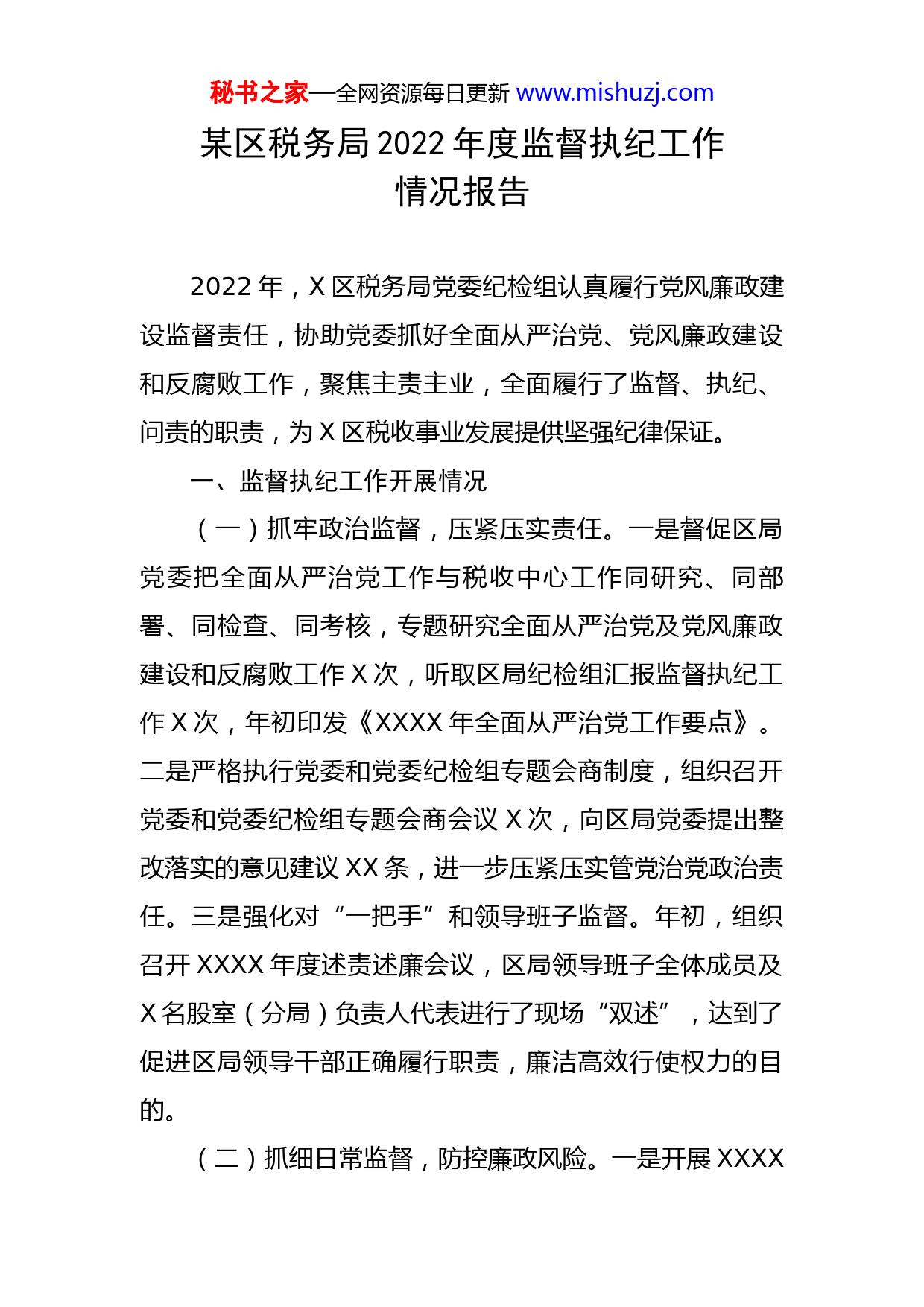 秘书之家—全网资源每日更新www.mishuzj.com某区税务局2022年度监督执纪工作情况报告2022年,X区税务局党委纪检组认真履行党风廉政建设监督责任,协助党委抓好全面从严治党、党风廉政建设和反腐败工作,聚焦主责主业,全面履行了监督、执纪、问责的职责,为X区税收事业发展提供坚强纪律保证。一、监督执纪工作开展情况(一)抓牢政治监督,压紧压实责任。一是督促区局党委把全面从严治党工作与税收中心工作同研究、同部署、同检查、同考核,专题研究全面从严治党及党风廉政建设和反腐败工作X次,听取区局纪检组汇报监督执纪工作X次,年初印发《XXXX年全面从严治党工作要点》。二是严格执行党委和党委纪检组专题会商制度,组织召开党委和党委纪检组专题会商会议X次,向区局党委提出整改落实的意见建议XX条,进一步压紧压实管党治党政治责任。三是强化对“一把手”和领导班子监督。年初,组织召开XXXX年度述责述廉会议,区局领导班子全体成员及X名股室(分局)负责人代表进行了现场“双述”,达到了促进区局领导干部正确履行职责,廉洁高效行使权力的目的。(二)抓细日常监督,防控廉政风险。一是开展XXXX秘书之家—全网资源每日更新www.mishuzj.com年作风建设自查自纠工作。按照《中共国家税务总局X市税务局委员会纪律检查组关于印发<X市税务系统“作风建设年”实施方案>的通知》(广市税党纪发〔XXXX〕X号)要求,组织全体干部职工开展在贯彻落实中央八项规定及其实施细则精神不到位、非职务违法犯罪等六个方面存在问题的自查自纠,共自查发现问题X个,已全部整改。二是对标对表开展重点事项日常监督检查。结合今年市局纪检组印发的四期日常监督重点事项清单,对照清单内容责任到人开展日常监督检查XX次,发现并督促整改问题XX个。三是加强对干部职级晋升工作的监督,对职级晋升干部出具廉政意见XX人次,严格把关职级晋升干部人选的党风廉政情况。四是加强纪律作风、疫情防控常态化监督。不定期开展监督检查XX次,制发督查通报X期,制发纪检建议书X份,督促整改问题X个。五是常态化开展警示教育,按季召开警示教育大会X次,专题召开节前警示教育大会X次,通过党委会、理论学习中心组、“三会一课”等多层次组织学习了税务系统内外违纪违法典型案例通报XX余次。组织开展两轮拒绝酒驾醉驾、拒绝黄赌毒、集中清理公职人员违规从事营利活动全覆盖谈心谈话,严防此类问题的发生。六是深化派驻监督。选派X名基层税务分局派驻纪检员,专职负责对X个基层分局税务人员税收执法情况和廉洁从税情况进行监督,采取“工单制”管秘书之家—全网资源每日更新www.mishuzj.com理,组织派驻纪检员参加纪检业务视频培训X次,制发《派驻纪检员重点工作事项派工单》XX期,明确监督内容、监督标准和完成时限,充分发挥派驻监督的探头作用。(三)抓实重点监督,促进工作落实。一是扎实开展退税减税工作监督检查。推动局党委担负主体责任,落实班子成员分片包干责任制,成立退税减税政策落实工作领导小组及工作办,明确权责分工,先后召开党委会、局务会、工作例会等XX余次,研究推进退税减税工作。督促各相关业务部门积极主动履责、减税办各工作组加强协调配合。牵头开展监督检查XX次,发现并整改问题X个,核查回复市局发布留抵退税疑点数据X条,督促缴回不应退而退或多退留抵退税X户次,共计XX万元。二是加强对全电发票上线推广监督。成立“全电发票”上线试点工作监督检查领导小组,对照《全电发票开票上线重点工作任务表》采取明察暗访、实地走访等方式对全电发票上线工作进行监督,推动成立发票电子化改革(金税四期)工作领导小组,党委班子按照局领导分片包干安排,深入基层分局、大厅、业务股室和相关企业等靠前指挥,开展督导和走访XX余户次。督促主责部门开展对内业务培训X场XXX人次,对外纳税辅导X场XXX人次。三是监督落实五项专项整治。配合税政二股核实省局下发XX条数据,其中秘书之家—全网资源每日更新www.mishuzj.com应补税共X条数据,应补契税X条X元,个人所得税X条X元,均已追缴入库。配合法制股核查下发的现金税费征缴疑点数据X条,存在问题X条(发票或税票联次不齐的X条,少征车购税XX条,超量发放现金票证XX条),均已整改追责到位。参与核实违规调整纳税信用等级办理增值税留抵退税疑点数据X条,经核实均不存在违规调整信用等级办理增值税留抵退税行为。配合征管开展代开发票综合治理,不存在违规代开发票的情形。组织开展集中清理公职人员违规从事营利活动全覆盖谈心谈话,签订承诺书,填写自查表,没有发现干部职工存在违规从事营利活动的情况。(四)抓严案件办理,增强震慑效应。一是深化一案双查工作。充分利用好、严格执行好一案双查联席会议机制,坚持每季度召集法制、纳服、征管等成员单位召开会议X次,集中头脑风暴,从稽查案件深挖案源,最终确定某案件存在风险疑点X个并向市局汇报了疑点线索;从不动产登记涉税风险深挖案源,对税政二股移交的XX条疑点数据按照一案双查的工作要求开展了再梳理,最终确定风险疑点X条,对移交资料中未收集到的证据资料,组织人力到建设路办公区、不动产中心等多处资料存放处复制档案,最终确定了疑点数据实际初核和复审人员。经向市局党委纪检组请