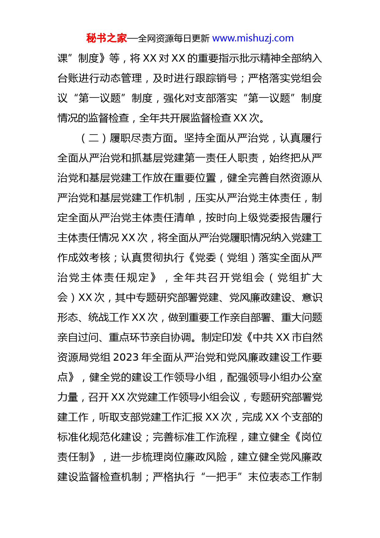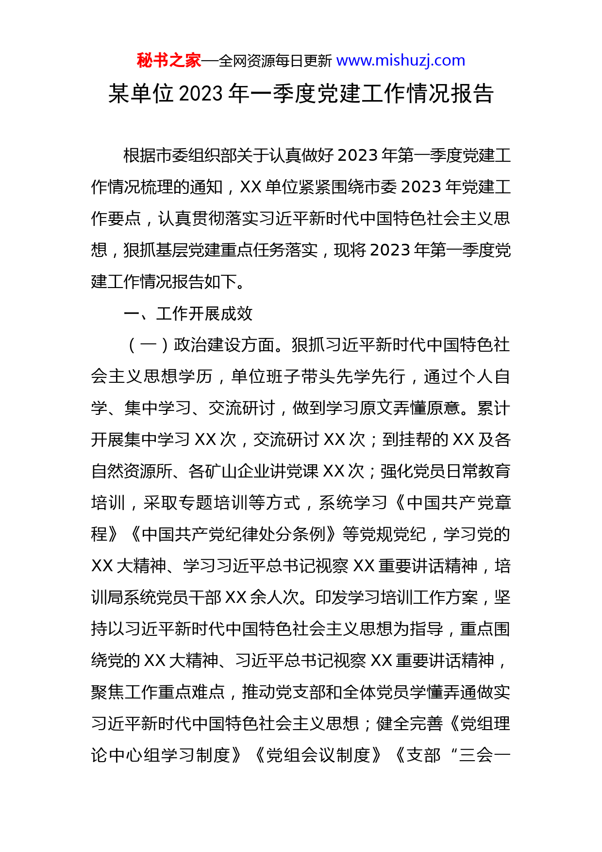 秘书之家—全网资源每日更新www.mishuzj.com某单位2023年一季度党建工作情况报告根据市委组织部关于认真做好2023年第一季度党建工作情况梳理的通知,XX单位紧紧围绕市委2023年党建工作要点,认真贯彻落实习近平新时代中国特色社会主义思想,狠抓基层党建重点任务落实,现将2023年第一季度党建工作情况报告如下。一、工作开展成效(一)政治建设方面。狠抓习近平新时代中国特色社会主义思想学历,单位班子带头先学先行,通过个人自学、集中学习、交流研讨,做到学习原文弄懂原意。累计开展集中学习XX次,交流研讨XX次;到挂帮的XX及各自然资源所、各矿山企业讲党课XX次;强化党员日常教育培训,采取专题培训等方式,系统学习《中国共产党章程》《中国共产党纪律处分条例》等党规党纪,学习党的XX大精神、学习习近平总书记视察XX重要讲话精神,培训局系统党员干部XX余人次。印发学习培训工作方案,坚持以习近平新时代中国特色社会主义思想为指导,重点围绕党的XX大精神、习近平总书记视察XX重要讲话精神,聚焦工作重点难点,推动党支部和全体党员学懂弄通做实习近平新时代中国特色社会主义思想;健全完善《党组理论中心组学习制度》《党组会议制度》《支部“三会一秘书之家—全网资源每日更新www.mishuzj.com课”制度》等,将XX对XX的重要指示批示精神全部纳入台账进行动态管理,及时进行跟踪销号;严格落实党组会议“第一议题”制度,强化对支部落实“第一议题”制度情况的监督检查,全年共开展监督检查XX次。(二)履职尽责方面。坚持全面从严治党,认真履行全面从严治党和抓基层党建第一责任人职责,始终把从严治党和基层党建工作放在重要位置,健全完善自然资源从严治党和基层党建工作机制,压实从严治党主体责任,制定全面从严治党主体责任清单,按时向上级党委报告履行主体责任情况XX次,将全面从严治党履职情况纳入党建工作成效考核;认真贯彻执行《党委(党组)落实全面从严治党主体责任规定》,全年共召开党组会(党组扩大会)XX次,其中专题研究部署党建、党风廉政建设、意识形态、统战工作XX次,做到重要工作亲自部署、重大问题亲自过问、重点环节亲自协调。制定印发《中共XX市自然资源局党组2023年全面从严治党和党风廉政建设工作要点》,健全党的建设工作领导小组,配强领导小组办公室力量,召开XX次党建工作领导小组会议,专题研究部署党建工作,听取支部党建工作汇报XX次,完成XX个支部的标准化规范化建设;完善标准工作流程,建立健全《岗位责任制》,进一步梳理岗位廉政风险,建立健全党风廉政建设监督检查机制;严格执行“一把手”末位表态工作制秘书之家—全网资源每日更新www.mishuzj.com和“三重一大”集体决策制度。深入贯彻《中国共产党支部工作条例(试行)》及XX省实施意见和市实施方案,推进党支部标准化规范化建设全面达标;贯彻落实《中国共产党党员教育管理工作条例》,抓好自身学习及党组班子成员、党员的集中培训和集体学习,认真落实学时制度,实现党员教育工作全覆盖。充分发挥党支部教育管理党员的职责作用,督促落实“三会一课”、主题党日、民主评议党员、领导干部双重组织生活等制度,及时开展新党员入党宣誓、党员重温入党誓词、过政治生日、政治家访、革命传统教育等活动;坚持把政治标准放在首位,严格发展党员程序,动员XX名思想政治素质较高的同志向党组织递交入党申请书,入党积极分子转为发展对象XX名,预备党员转为正式党员XX名。(三)责任落实方面。整治形式主义、官僚主义突出问题负面清单,持续开展监督检查和警示提醒,坚决纠正不担当、不作为、乱作为、假作为等问题,引导全体党员干部履职尽责、真抓实干。组织作风建设“三整治五提升”专项行动,认真落实中央八项规定及其实施细则精神和省委、市委有关要求,紧盯中秋、国庆、元旦等重要节点,及时警示约谈和通报曝光典型案例,严防“四风”反弹回潮。认真落实中央、省、市关于为基层减压减负措施,主动回应基层和群众关切,推动“政策红利”落实到秘书之家—全网资源每日更新www.mishuzj.com基层。持续完善监督管理机制,强化日常监督,注重抓早抓小,持续整治群众身边的腐败和不正之风。结合自然资源工作实际,加强党风廉政教育,筑牢不敢腐、不能腐、不想腐思想防线,盯牢重点领域,加强风险防控和监督。坚持标本兼治、惩防并举,持之以恒抓好党风廉政建设工作,全年召开XX次党组专题会议研究部署党风廉政建设工作。二、存在的问题(一)党建工作创新性不足。对支部创新方面的一些先进典型和特色经验培育提升的力度还不够大,复制推广的面还不够宽,缺少创新意识和手段。(二)理论武装水平不高。理论学习局限于对党的文件、规章制度以及领导讲话精神等内容进行字面上传达学习,对内涵理解不够深入,联系工作不够,理论指导实践效果不明显。(三)思想政治引导不足。局机关比较注重业务考核等硬性指标建设,但在组织建设上投入精力不够,组织作用发挥不到位,对党建工作研究缺乏创造性,习惯依老经验决策、按部就班办事。(四)深入群众有差距。扑下身子走基层访民情察民意不够,听取群众意见建议、解决群众遇到的困难问题不秘书之家—全网资源每日更新www.mishuzj.com够,有等待和观望地方出台相应具