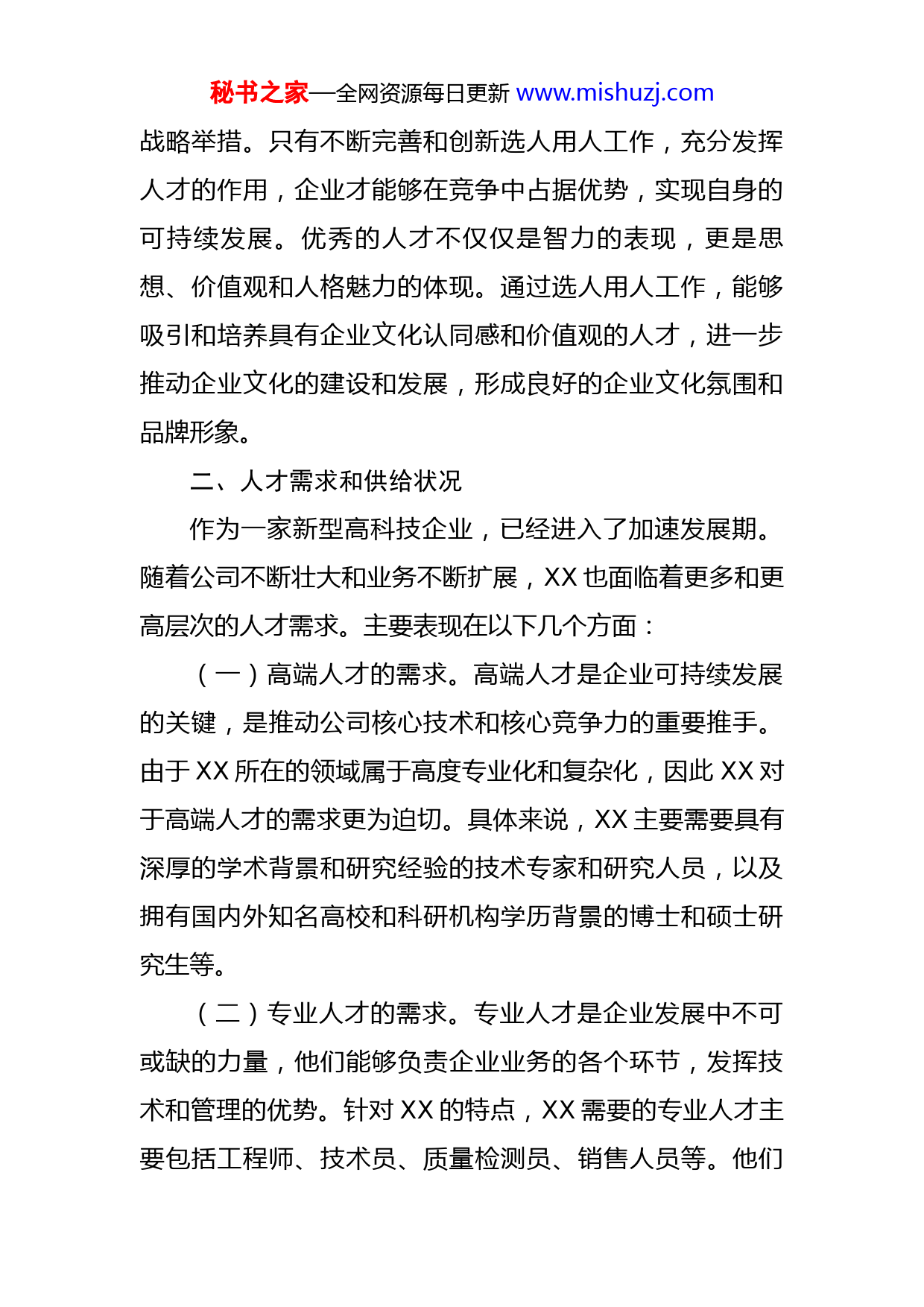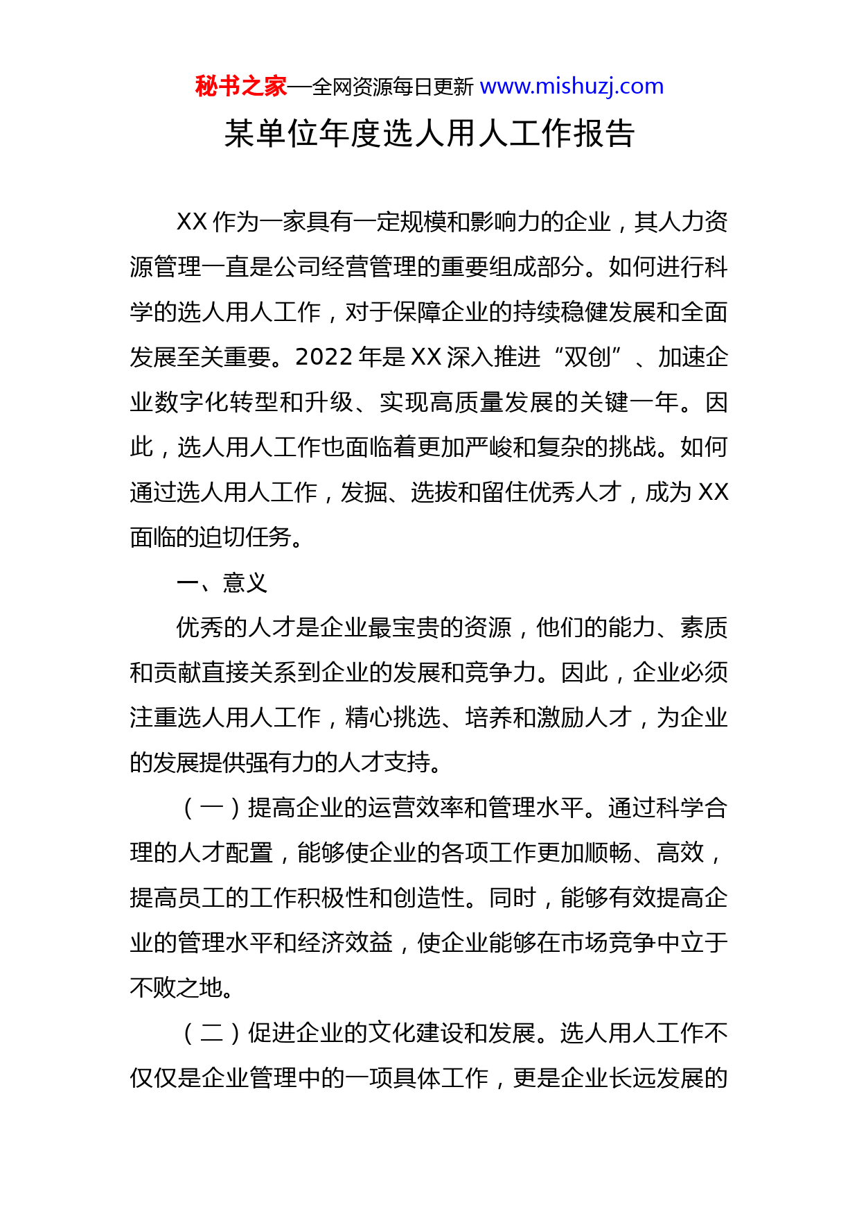秘书之家—全网资源每日更新www.mishuzj.com某单位年度选人用人工作报告XX作为一家具有一定规模和影响力的企业,其人力资源管理一直是公司经营管理的重要组成部分。如何进行科学的选人用人工作,对于保障企业的持续稳健发展和全面发展至关重要。2022年是XX深入推进“双创”、加速企业数字化转型和升级、实现高质量发展的关键一年。因此,选人用人工作也面临着更加严峻和复杂的挑战。如何通过选人用人工作,发掘、选拔和留住优秀人才,成为XX面临的迫切任务。一、意义优秀的人才是企业最宝贵的资源,他们的能力、素质和贡献直接关系到企业的发展和竞争力。因此,企业必须注重选人用人工作,精心挑选、培养和激励人才,为企业的发展提供强有力的人才支持。(一)提高企业的运营效率和管理水平。通过科学合理的人才配置,能够使企业的各项工作更加顺畅、高效,提高员工的工作积极性和创造性。同时,能够有效提高企业的管理水平和经济效益,使企业能够在市场竞争中立于不败之地。(二)促进企业的文化建设和发展。选人用人工作不仅仅是企业管理中的一项具体工作,更是企业长远发展的秘书之家—全网资源每日更新www.mishuzj.com战略举措。只有不断完善和创新选人用人工作,充分发挥人才的作用,企业才能够在竞争中占据优势,实现自身的可持续发展。优秀的人才不仅仅是智力的表现,更是思想、价值观和人格魅力的体现。通过选人用人工作,能够吸引和培养具有企业文化认同感和价值观的人才,进一步推动企业文化的建设和发展,形成良好的企业文化氛围和品牌形象。二、人才需求和供给状况作为一家新型高科技企业,已经进入了加速发展期。随着公司不断壮大和业务不断扩展,XX也面临着更多和更高层次的人才需求。主要表现在以下几个方面:(一)高端人才的需求。高端人才是企业可持续发展的关键,是推动公司核心技术和核心竞争力的重要推手。由于XX所在的领域属于高度专业化和复杂化,因此XX对于高端人才的需求更为迫切。具体来说,XX主要需要具有深厚的学术背景和研究经验的技术专家和研究人员,以及拥有国内外知名高校和科研机构学历背景的博士和硕士研究生等。(二)专业人才的需求。专业人才是企业发展中不可或缺的力量,他们能够负责企业业务的各个环节,发挥技术和管理的优势。针对XX的特点,XX需要的专业人才主要包括工程师、技术员、质量检测员、销售人员等。他们秘书之家—全网资源每日更新www.mishuzj.com需要具备相关专业技能和较强的实践经验。(三)管理人才的需求。管理人才是企业管理和战略制定的中坚力量,他们能够负责企业的人力资源、财务、市场等方面的工作。在XX发展的过程中,需要具备较高管理水平的人才,能够负责企业的各项管理工作,包括人力资源管理、财务管理、市场营销管理等。三、实践措施公司通过一系列的人力资源办法和规定的出台,拥有了一批专业技能精湛、具有创新精神和团队合作能力的优秀员工,员工的工作积极性和创造性不断提高,企业的经济效益不断增加,企业文化和品牌形象得到了进一步的提升。(一)建立了科学的选拔机制和流程。在人才选拔过程中,采用了多种评估手段,包括笔试、面试、岗位测试、综合评估等,全面了解候选人的知识、技能、能力、素质等方面,并针对不同岗位的需求,制定不同的选拔标准和流程,确保选拔出最适合岗位的人才。(二)注重人才培养和激励。对于新入职员工,XX开展了系统的培训计划,包括专业技能培训、管理能力培养、职业素养提升等方面。同时,通过建立激励机制,包括薪酬激励、晋升机制、荣誉奖励等方面,激发员工的工作热情和创造力,增强员工的归属感和忠诚度。秘书之家—全网资源每日更新www.mishuzj.com(三)加强人才管理和流动。XX注重建立健全的人才管理体系,制定了详细的人才管理政策和流程,包括员工晋升、人才储备、绩效管理、人才流动等方面,实现员工和企业共同发展。同时,通过适当的内部人才流动和外部招聘,使得企业的人才储备更加丰富、多元化。(四)加强对员工的关心和服务。XX注重员工的健康、安全和福利,建立了完善的员工关爱机制,包括健康体检、员工保险、职业安全等方面,提高员工的幸福感和满意度。四、存在问题和不足在选人用人工作中取得的成效和进步是显而易见的,但存在的问题也不容忽视,需要不断加强和改进,以适应快速变化的市场和社会环境,为企业的可持续发展注入源源不断的动力和活力。(一)人才培养计划的实施有待加强。虽然XX制定了完善的人才培养计划,但在实施过程中存在一定的滞后和不足,需要加强人才培训的质量和效果监控,确保人才培训计划的实施效果达到预期目标。(二)位职责和招聘标准的匹配度需要进一步提高。在选人用人过程中,XX需要更加准确地把握不同岗位的职责和要求,以确保招聘的人才符合岗位需求和企业发展的战略方向。秘书之家—全网资源每日更新www.mishuzj.com(三)员工福利待遇需要进一步提高。虽然XX在员工福利方面已经有了一定的投入和改善,但还需要进一步加大力度,提高员工薪资和福利待遇,以提高员工的幸福感和满意度,增强员工的归属感和忠诚度。五、选人用人工作计划(一)招聘计划为满足企业的人才需求,XX计划在2023年通过多种方式开展招聘活动。