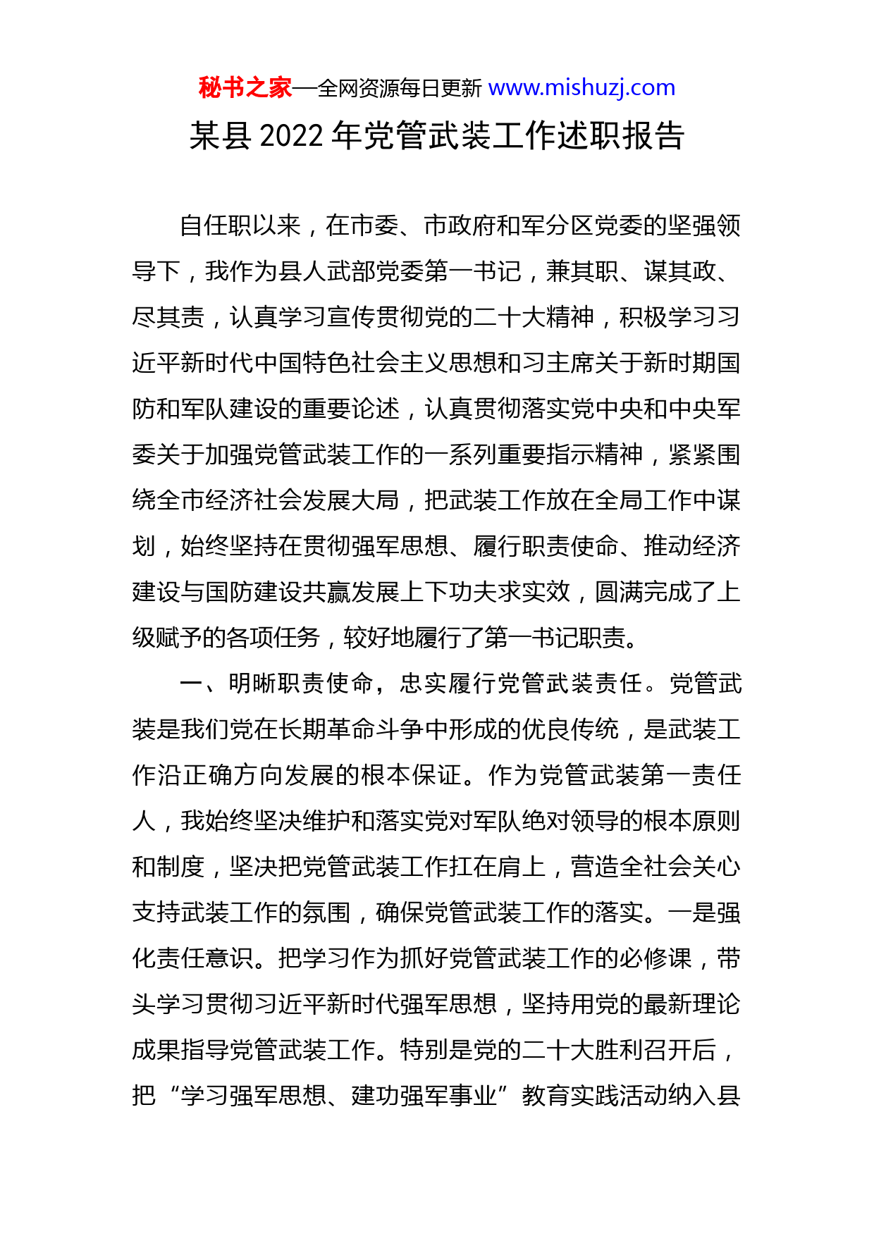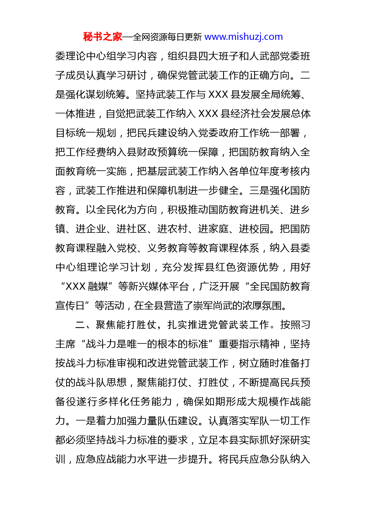 秘书之家—全网资源每日更新www.mishuzj.com某县2022年党管武装工作述职报告自任职以来,在市委、市政府和军分区党委的坚强领导下,我作为县人武部党委第一书记,兼其职、谋其政、尽其责,认真学习宣传贯彻党的二十大精神,积极学习习近平新时代中国特色社会主义思想和习主席关于新时期国防和军队建设的重要论述,认真贯彻落实党中央和中央军委关于加强党管武装工作的一系列重要指示精神,紧紧围绕全市经济社会发展大局,把武装工作放在全局工作中谋划,始终坚持在贯彻强军思想、履行职责使命、推动经济建设与国防建设共赢发展上下功夫求实效,圆满完成了上级赋予的各项任务,较好地履行了第一书记职责。一、明晰职责使命,忠实履行党管武装责任。党管武装是我们党在长期革命斗争中形成的优良传统,是武装工作沿正确方向发展的根本保证。作为党管武装第一责任人,我始终坚决维护和落实党对军队绝对领导的根本原则和制度,坚决把党管武装工作扛在肩上,营造全社会关心支持武装工作的氛围,确保党管武装工作的落实。一是强化责任意识。把学习作为抓好党管武装工作的必修课,带头学习贯彻习近平新时代强军思想,坚持用党的最新理论成果指导党管武装工作。特别是党的二十大胜利召开后,把“学习强军思想、建功强军事业”教育实践活动纳入县秘书之家—全网资源每日更新www.mishuzj.com委理论中心组学习内容,组织县四大班子和人武部党委班子成员认真学习研讨,确保党管武装工作的正确方向。二是强化谋划统筹。坚持武装工作与XXX县发展全局统筹、一体推进,自觉把武装工作纳入XXX县经济社会发展总体目标统一规划,把民兵建设纳入党委政府工作统一部署,把工作经费纳入县财政预算统一保障,把国防教育纳入全面教育统一实施,把基层武装工作纳入各单位年度考核内容,武装工作推进和保障机制进一步健全。三是强化国防教育。以全民化为方向,积极推动国防教育进机关、进乡镇、进企业、进社区、进农村、进家庭、进校园。把国防教育课程融入党校、义务教育等教育课程体系,纳入县委中心组理论学习计划,充分发挥县红色资源优势,用好“XXX融媒”等新兴媒体平台,广泛开展“全民国防教育宣传日”等活动,在全县营造了崇军尚武的浓厚氛围。二、聚焦能打胜仗,扎实推进党管武装工作。按照习主席“战斗力是唯一的根本的标准”重要指示精神,坚持按战斗力标准审视和改进党管武装工作,树立随时准备打仗的战斗队思想,聚焦能打仗、打胜仗,不断提高民兵预备役遂行多样化任务能力,确保如期形成大规模作战能力。一是着力加强力量队伍建设。认真落实军队一切工作都必须坚持战斗力标准的要求,立足本县实际抓好深研实训,应急应战能力水平进一步提升。将民兵应急分队纳入秘书之家—全网资源每日更新www.mishuzj.com全县应急指挥体系,有效提升了全市应急处突综合水平,民兵应急分队成为急时应急、战时应战的拳头力量。特别是在XXX县疫情防控工作中,全年共出动民兵XXX人次投入防疫战线,执行消洗、安保、隔离人员运输等工作,在疫情防控中发挥了巨大作用。二是着力加强基层基础建设。坚持固本强基,扎实推进基层正规化建设,不断夯实国防后备力量的根基。在财政十分紧张的情况下,足额保障征兵工作、民兵队伍建设、国防教育等专项经费;每年向各基层武装部拨付专项经费保障武装工作。在编制指数有限的情况下,为全县配备专职武装干部,全力为专武干部成长开辟渠道,为全县武装工作注入新鲜血液。三是着力强化国防动员保障。以提高新兵质量为核心,全面摸排、精准动员,今年全年报名参军XXXX名,择优选拔XXX名兵员,其中大学生比例达XX%,兵员结构大幅优化。高质量完成民兵训练、学生军训、专武干部集训等任务,把重大演训活动作为摔打锤炼民兵队伍、检验提高国防动员支前能力的有利契机,大幅提高国防动员队伍遂行作战能力。扎实开展国防动员潜力调查,及时调整领导小组及办公室成员,加强经济动员、科技动员、信息动员、交通战备、人民防空协调配合,全面完成潜力数据调查工作,为实战化国防动员和潜力征集奠定了基础。三、倾情拥军优属,巩固军政军民团结局面。贯彻落秘书之家—全网资源每日更新www.mishuzj.com实好习主席强调的“尽最大努力帮助广大官兵解决好各种实际问题”的要求,坚持用足政策、用足感情、用足智慧,倾心尽力、特事特办,把支持部队改革、服务国防建设的职责落实到具体工作中,以双拥模范城市创建为抓手,从经费保障、优抚安置、选拔干部等工作入手,营造了军地和谐共荣、互促互进的浓厚氛围。一是重视浓厚国防文化建设。深化全民国防建设,建好国防教育讲师团,推进县乡两级党政机关过军事日,组织人员到县民兵训练基地接受军事训练。发挥好武装部“联接军地的桥梁”“走在乡间的解放军”“永远不走的工作队”作用,借助军委训管部帮建优势,依托八一爱民小学,创建剑门关少年军校,不断夯实人人爱国防、建国防、献国防的强大思想根基。二是全面落实优抚安置政策。克服党政机关、事业编制紧缩等困难,积极安置军转干部和转业士官。同时,为促进退役士兵安置和就业,组织退役士兵参加职业技能培训、举办退役军人专场招聘会,退役军人就业率大幅度提高