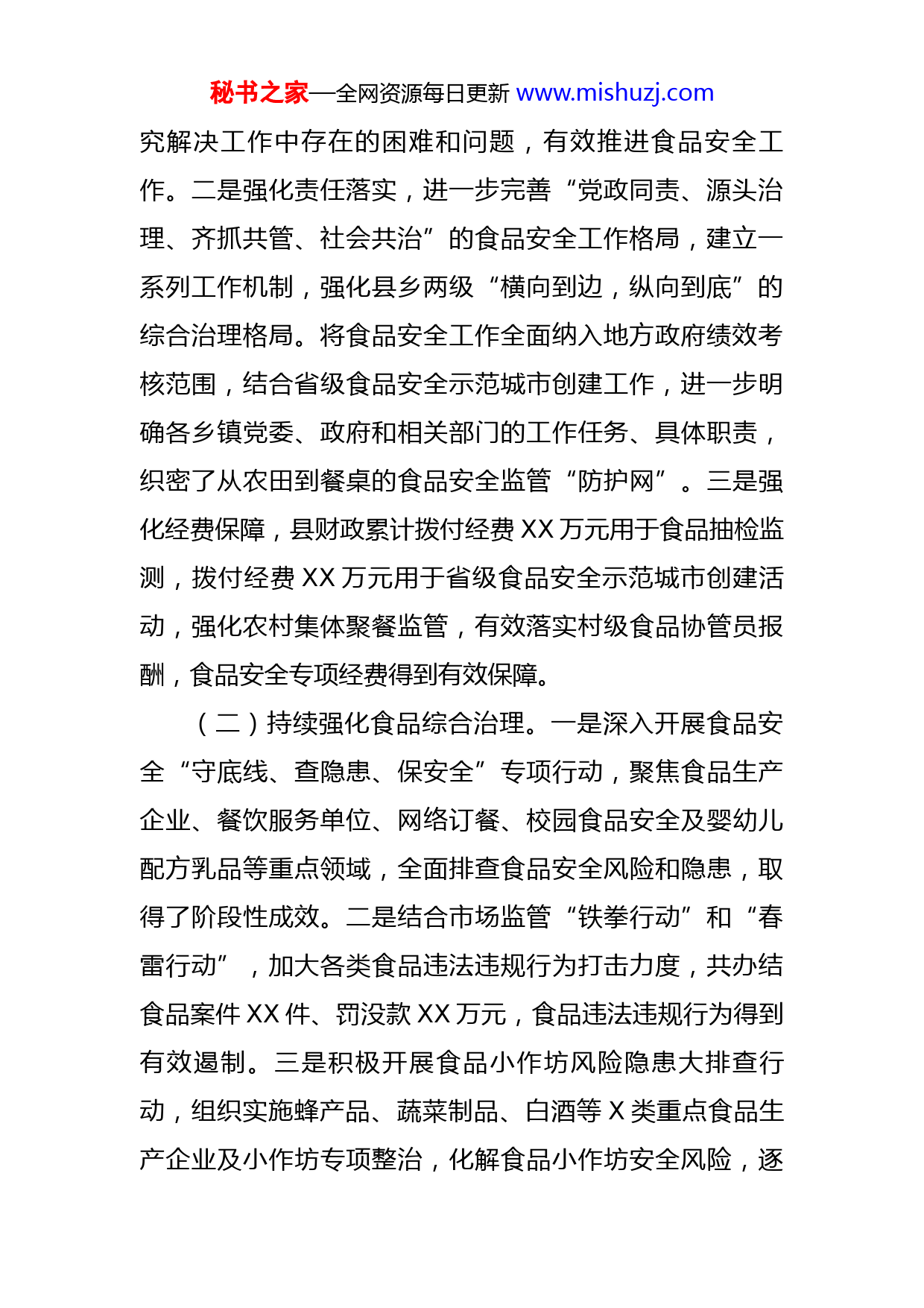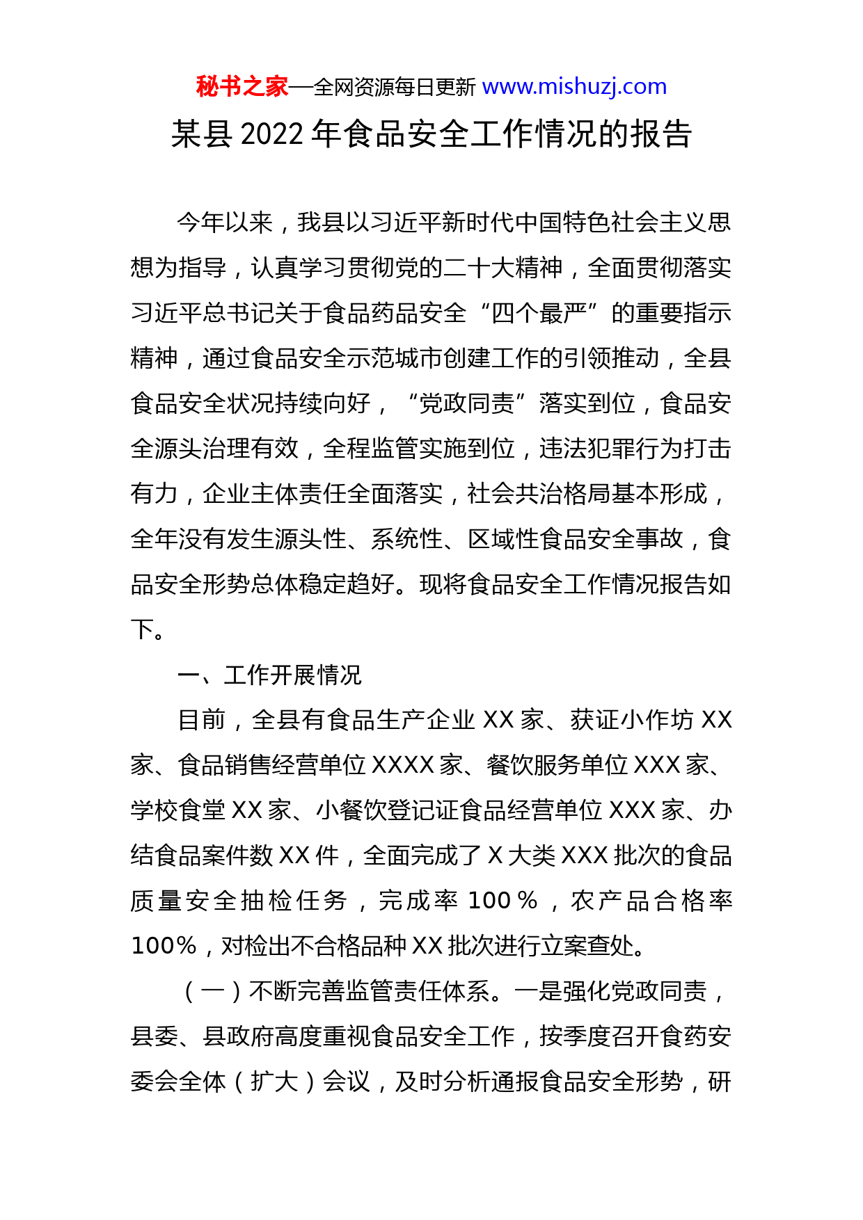 秘书之家—全网资源每日更新www.mishuzj.com某县2022年食品安全工作情况的报告今年以来,我县以习近平新时代中国特色社会主义思想为指导,认真学习贯彻党的二十大精神,全面贯彻落实习近平总书记关于食品药品安全“四个最严”的重要指示精神,通过食品安全示范城市创建工作的引领推动,全县食品安全状况持续向好,“党政同责”落实到位,食品安全源头治理有效,全程监管实施到位,违法犯罪行为打击有力,企业主体责任全面落实,社会共治格局基本形成,全年没有发生源头性、系统性、区域性食品安全事故,食品安全形势总体稳定趋好。现将食品安全工作情况报告如下。一、工作开展情况目前,全县有食品生产企业XX家、获证小作坊XX家、食品销售经营单位XXXX家、餐饮服务单位XXX家、学校食堂XX家、小餐饮登记证食品经营单位XXX家、办结食品案件数XX件,全面完成了X大类XXX批次的食品质量安全抽检任务,完成率100%,农产品合格率100%,对检出不合格品种XX批次进行立案查处。(一)不断完善监管责任体系。一是强化党政同责,县委、县政府高度重视食品安全工作,按季度召开食药安委会全体(扩大)会议,及时分析通报食品安全形势,研秘书之家—全网资源每日更新www.mishuzj.com究解决工作中存在的困难和问题,有效推进食品安全工作。二是强化责任落实,进一步完善“党政同责、源头治理、齐抓共管、社会共治”的食品安全工作格局,建立一系列工作机制,强化县乡两级“横向到边,纵向到底”的综合治理格局。将食品安全工作全面纳入地方政府绩效考核范围,结合省级食品安全示范城市创建工作,进一步明确各乡镇党委、政府和相关部门的工作任务、具体职责,织密了从农田到餐桌的食品安全监管“防护网”。三是强化经费保障,县财政累计拨付经费XX万元用于食品抽检监测,拨付经费XX万元用于省级食品安全示范城市创建活动,强化农村集体聚餐监管,有效落实村级食品协管员报酬,食品安全专项经费得到有效保障。(二)持续强化食品综合治理。一是深入开展食品安全“守底线、查隐患、保安全”专项行动,聚焦食品生产企业、餐饮服务单位、网络订餐、校园食品安全及婴幼儿配方乳品等重点领域,全面排查食品安全风险和隐患,取得了阶段性成效。二是结合市场监管“铁拳行动”和“春雷行动”,加大各类食品违法违规行为打击力度,共办结食品案件XX件、罚没款XX万元,食品违法违规行为得到有效遏制。三是积极开展食品小作坊风险隐患大排查行动,组织实施蜂产品、蔬菜制品、白酒等X类重点食品生产企业及小作坊专项整治,化解食品小作坊安全风险,逐秘书之家—全网资源每日更新www.mishuzj.com步形成食品小作坊行业长效监管机制。四是开展农村假冒伪劣食品专项整治行动,收缴假冒伪劣食品XXXX多公斤,查处假冒伪劣食品XX件、罚款X万元。五是全面落实地方党政领导干部食品安全包保责任制,完成食品企业主体分级XXXX户,落实XXX名包保干部与XXXX户食品企业的层级对应工作,完成率达100%。(三)有序推进食品智慧监管。一是开展“食品生产监管能力建设年”活动,督促企业严格落实食品安全主体责任,全县食品生产企业监督抽考企业覆盖率100%,合格率100%,有效提升了企业食品安全管理能力。二是全面推进“互联网+智慧监管”建设,共接入“透明车间”XX家、“阳光仓储”XX家、“明厨亮灶”XXX家。三是深入推进重点食品生产企业产品电子追溯体系建设,全县食品生产企业追溯平台应用率稳定在XX%以上,基本实现了“顺向可追踪、逆向可溯源、风险可管控、公众可查询”。四是对XXXX户餐饮企业开展了网上巡查和风险等级评定,其中A级XXX家、B级XXX家、C级XX家、D级X家。(四)提升食品安全监管能力。一是加强食品生产经营企业疫情常态化监管,严格落实食品生产经营单位疫情防控主体责任。二是扎实开展省级食品安全示范城市创建活动,逐条逐项按标准落实创建任务,确保创建工作深入秘书之家—全网资源每日更新www.mishuzj.com推进。三是完成中考、高考等重大活动期间食品安全保障工作,确保全县重大活动、重大会议期间的食品安全。四是开展农村集体聚餐备案管理,报告登记XX家、流动厨师登记XX个、聚餐人数XXXX人,全年农村集体聚餐没有发生食品安全事件。五是推进文明用餐和反食品浪费监管,开展“杜绝餐饮浪费、厉行勤俭节约”宣传教育活动X场次,发放张贴倡议书XXXX份。六是强化餐饮业油烟污染问题整改,餐饮服务单位检查覆盖率达到XX%。七是加强餐饮企业许可监督管理,按要求对不再经营和小于XX平米的XXX户餐饮单位办理了注销和换证手续。八是严格规范外卖配送,实行封签配送制度,查处网络餐饮违法违规案件X起、罚款X万元。九是加强校园食品安全监管,开展了春秋季开学校园及周边食品安全专项检查,全力排查小饭桌食品安全风险隐患,发现问题XX条,存在风险隐患的XX家餐饮单位均按期完成整改。(五)深入开展食品检验检测。一是开展了食品“你点我检、你送我检”快速检测活动,出动快检车XX台次,检测食品XXX余个品种、XXX余批次,农产品合格率达100%。二是完成食品快速检测任务XXXX批次,完成率XXX%,超额完成了食品快速检测任务,其中政府检测室完成XXXX批次,完成率XXX%;企业检测室完成XXXX批次,完成率XXX%;检测车完成XXXX批次,完成率秘书之家—全网资