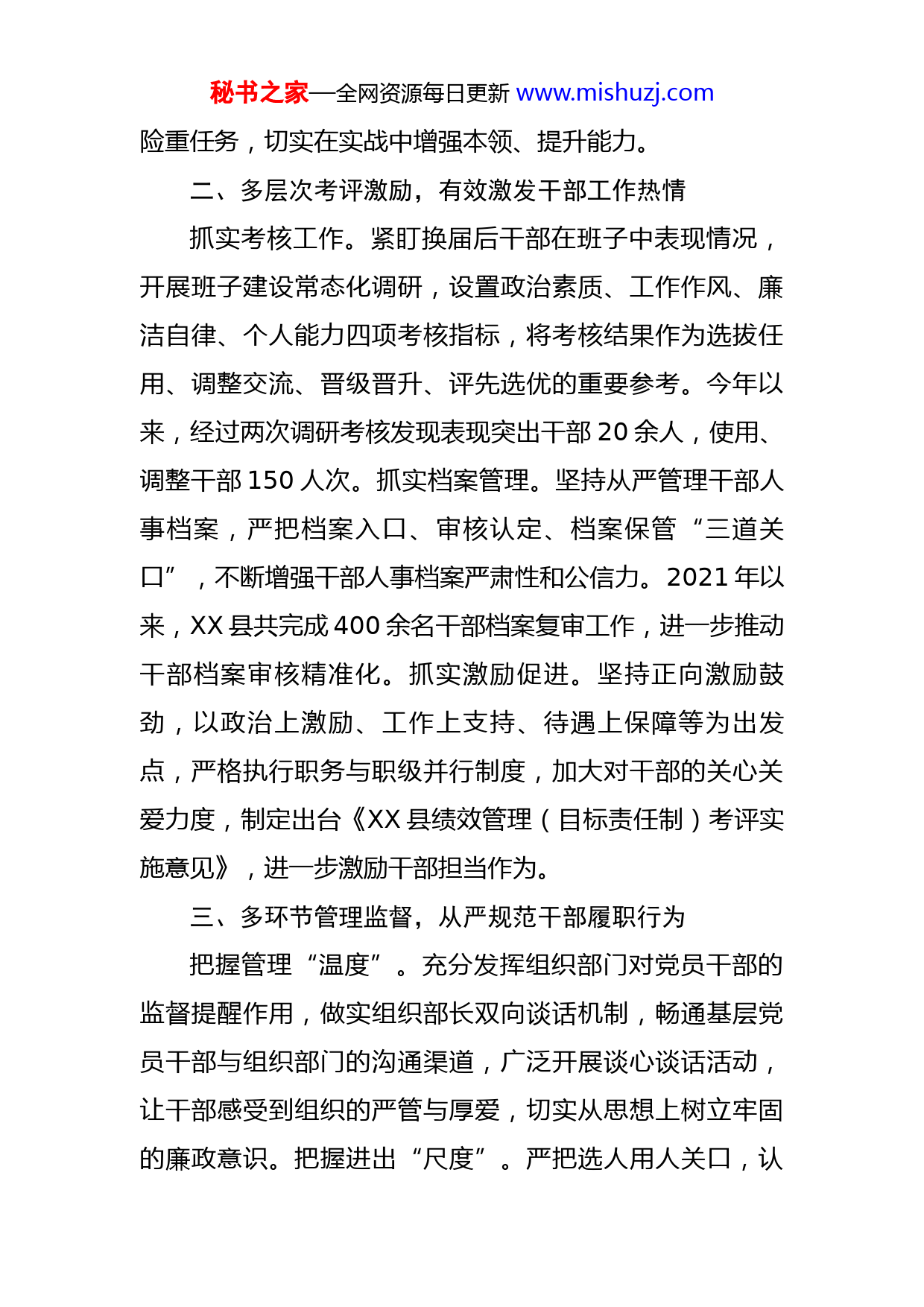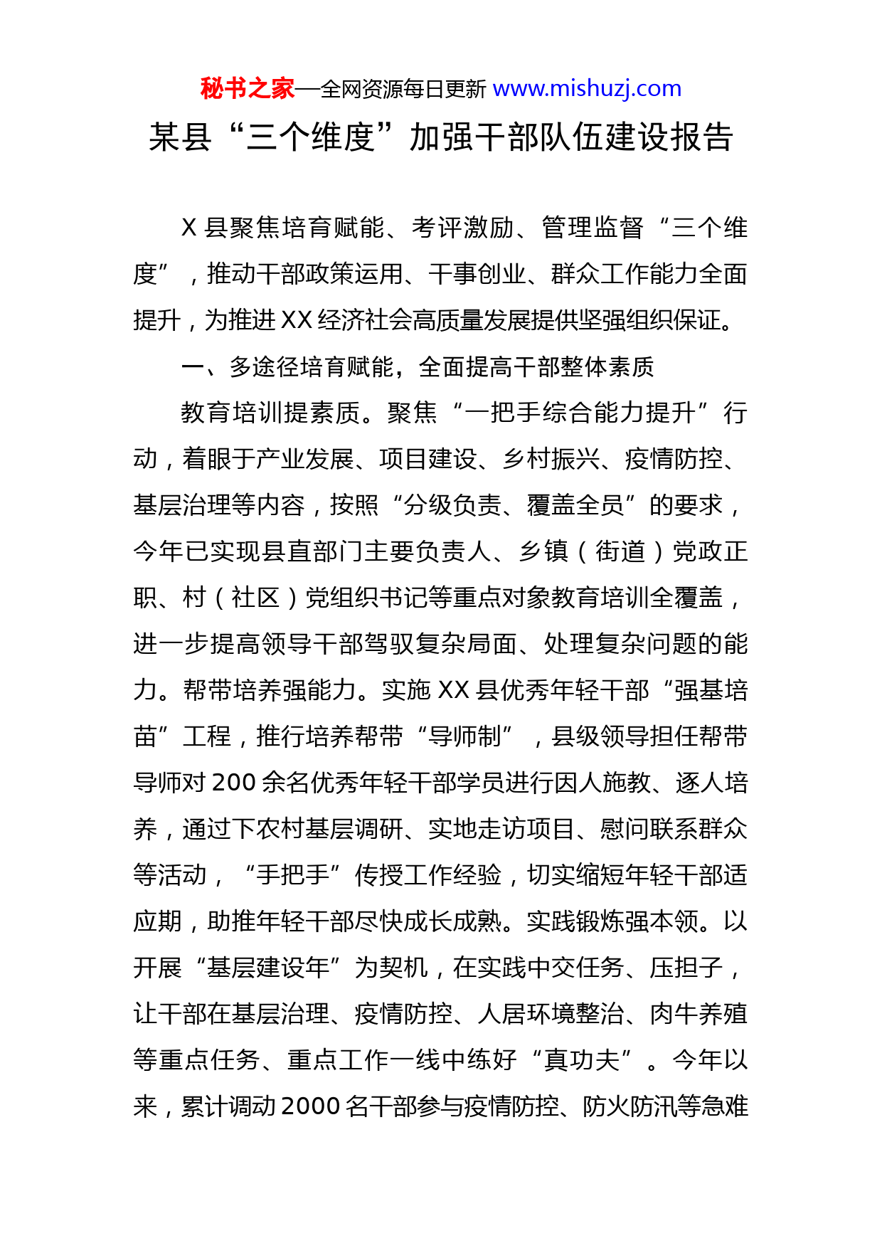 秘书之家—全网资源每日更新www.mishuzj.com某县“三个维度”加强干部队伍建设报告X县聚焦培育赋能、考评激励、管理监督“三个维度”,推动干部政策运用、干事创业、群众工作能力全面提升,为推进XX经济社会高质量发展提供坚强组织保证。一、多途径培育赋能,全面提高干部整体素质教育培训提素质。聚焦“一把手综合能力提升”行动,着眼于产业发展、项目建设、乡村振兴、疫情防控、基层治理等内容,按照“分级负责、覆盖全员”的要求,今年已实现县直部门主要负责人、乡镇(街道)党政正职、村(社区)党组织书记等重点对象教育培训全覆盖,进一步提高领导干部驾驭复杂局面、处理复杂问题的能力。帮带培养强能力。实施XX县优秀年轻干部“强基培苗”工程,推行培养帮带“导师制”,县级领导担任帮带导师对200余名优秀年轻干部学员进行因人施教、逐人培养,通过下农村基层调研、实地走访项目、慰问联系群众等活动,“手把手”传授工作经验,切实缩短年轻干部适应期,助推年轻干部尽快成长成熟。实践锻炼强本领。以开展“基层建设年”为契机,在实践中交任务、压担子,让干部在基层治理、疫情防控、人居环境整治、肉牛养殖等重点任务、重点工作一线中练好“真功夫”。今年以来,累计调动2000名干部参与疫情防控、防火防汛等急难秘书之家—全网资源每日更新www.mishuzj.com险重任务,切实在实战中增强本领、提升能力。二、多层次考评激励,有效激发干部工作热情抓实考核工作。紧盯换届后干部在班子中表现情况,开展班子建设常态化调研,设置政治素质、工作作风、廉洁自律、个人能力四项考核指标,将考核结果作为选拔任用、调整交流、晋级晋升、评先选优的重要参考。今年以来,经过两次调研考核发现表现突出干部20余人,使用、调整干部150人次。抓实档案管理。坚持从严管理干部人事档案,严把档案入口、审核认定、档案保管“三道关口”,不断增强干部人事档案严肃性和公信力。2021年以来,XX县共完成400余名干部档案复审工作,进一步推动干部档案审核精准化。抓实激励促进。坚持正向激励鼓劲,以政治上激励、工作上支持、待遇上保障等为出发点,严格执行职务与职级并行制度,加大对干部的关心关爱力度,制定出台《XX县绩效管理(目标责任制)考评实施意见》,进一步激励干部担当作为。三、多环节管理监督,从严规范干部履职行为把握管理“温度”。充分发挥组织部门对党员干部的监督提醒作用,做实组织部长双向谈话机制,畅通基层党员干部与组织部门的沟通渠道,广泛开展谈心谈话活动,让干部感受到组织的严管与厚爱,切实从思想上树立牢固的廉政意识。把握进出“尺度”。严把选人用人关口,认秘书之家—全网资源每日更新www.mishuzj.com真落实考察对象干部档案必审、个人有关事项报告必核、纪检监察机关意见必听、线索具体的信访举报必查要求,坚决防止干部“带病提拔”。把握监管“深度”。注重加强“八小时以外”监督管理,全面了解掌握领导干部个人及家庭成员婚丧嫁娶、乔迁新居、子女升学以及重大节假日期间廉洁自律情况,促进监督内容由“工作圈”向“生活圈”“社交圈”延伸扩展,有效预防干部“微腐败”。