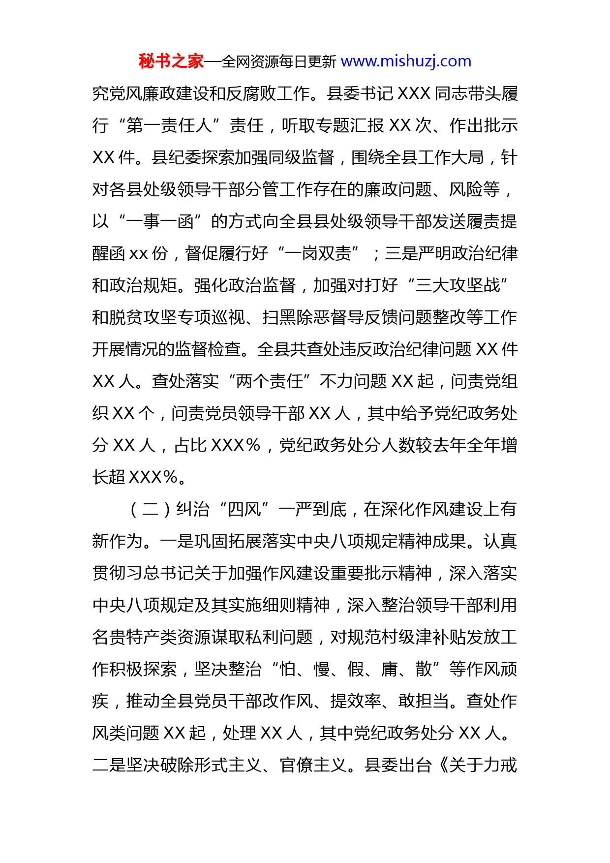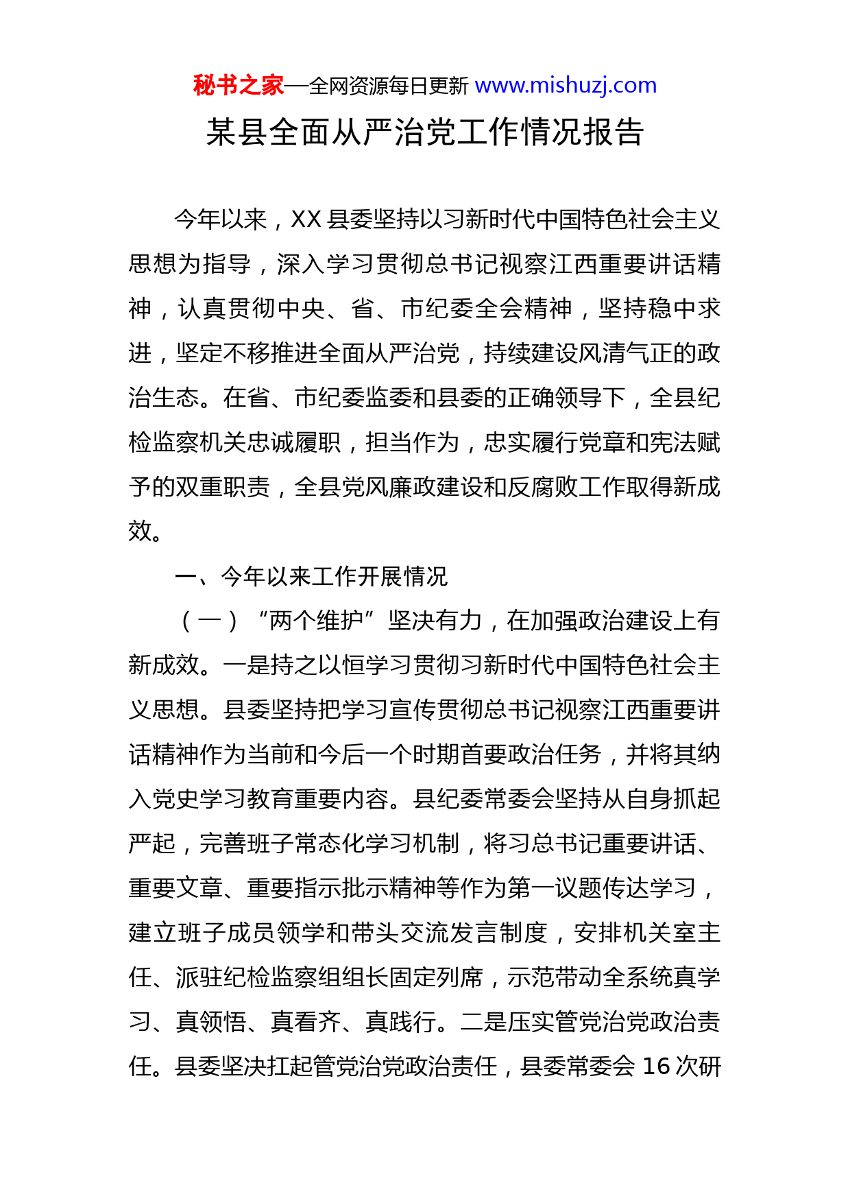 秘书之家—全网资源每日更新www.mishuzj.com某县全面从严治党工作情况报告今年以来,XX县委坚持以习新时代中国特色社会主义思想为指导,深入学习贯彻总书记视察江西重要讲话精神,认真贯彻中央、省、市纪委全会精神,坚持稳中求进,坚定不移推进全面从严治党,持续建设风清气正的政治生态。在省、市纪委监委和县委的正确领导下,全县纪检监察机关忠诚履职,担当作为,忠实履行党章和宪法赋予的双重职责,全县党风廉政建设和反腐败工作取得新成效。一、今年以来工作开展情况(一)“两个维护”坚决有力,在加强政治建设上有新成效。一是持之以恒学习贯彻习新时代中国特色社会主义思想。县委坚持把学习宣传贯彻总书记视察江西重要讲话精神作为当前和今后一个时期首要政治任务,并将其纳入党史学习教育重要内容。县纪委常委会坚持从自身抓起严起,完善班子常态化学习机制,将习总书记重要讲话、重要文章、重要指示批示精神等作为第一议题传达学习,建立班子成员领学和带头交流发言制度,安排机关室主任、派驻纪检监察组组长固定列席,示范带动全系统真学习、真领悟、真看齐、真践行。二是压实管党治党政治责任。县委坚决扛起管党治党政治责任,县委常委会16次研秘书之家—全网资源每日更新www.mishuzj.com究党风廉政建设和反腐败工作。县委书记XXX同志带头履行“第一责任人”责任,听取专题汇报XX次、作出批示XX件。县纪委探索加强同级监督,围绕全县工作大局,针对各县处级领导干部分管工作存在的廉政问题、风险等,以“一事一函”的方式向全县县处级领导干部发送履责提醒函xx份,督促履行好“一岗双责”;三是严明政治纪律和政治规矩。强化政治监督,加强对打好“三大攻坚战”和脱贫攻坚专项巡视、扫黑除恶督导反馈问题整改等工作开展情况的监督检查。全县共查处违反政治纪律问题XX件XX人。查处落实“两个责任”不力问题XX起,问责党组织XX个,问责党员领导干部XX人,其中给予党纪政务处分XX人,占比XXX%,党纪政务处分人数较去年全年增长超XXX%。(二)纠治“四风”一严到底,在深化作风建设上有新作为。一是巩固拓展落实中央八项规定精神成果。认真贯彻习总书记关于加强作风建设重要批示精神,深入落实中央八项规定及其实施细则精神,深入整治领导干部利用名贵特产类资源谋取私利问题,对规范村级津补贴发放工作积极探索,坚决整治“怕、慢、假、庸、散”等作风顽疾,推动全县党员干部改作风、提效率、敢担当。查处作风类问题XX起,处理XX人,其中党纪政务处分XX人。二是坚决破除形式主义、官僚主义。县委出台《关于力戒秘书之家—全网资源每日更新www.mishuzj.com形式主义为基层减负的若干措施》《关于进一步统筹规范监督检查考核工作的通知》等破除形式主义的制度性文件。县纪委以落实省委作风建设专项巡视反馈共性问题整改为契机,督促组织、人社等部门规范了“一票否决”“签订责任状”等事项、督促民政等部门全面整治了村级组织活动场所“挂牌热”“挂牌多”的问题、督促宣传部门对不规范宣传标语开展了集中清理,等等。全县共查处形式主义、官僚主义问题XX起,处理XX人,其中党纪政务处分XX人。三是全力以赴护航脱贫攻坚。持续深化扶贫领域腐败和作风问题专项治理,查处问题XX起,处理XX人。其中,给予党纪政务处分XX人,通报XX起XX人。对扶贫领域案件开展质量检查并进行提级审核,提高监督执纪问责精准度。同时,为营造干事创业良好环境,坚持“三个区分开来”,积极开展不实举报澄清正名和容错减责免责工作,公开澄清不实举报XX起XX人,激励干部担当作为。(三)“三项改革”齐头并进,在完善监督体系上有新进展。一是深化国家监察体制改革。制定出台县纪委监委“三定方案”,完成内设机构和人员配置调整优化。推动监察职能向基层延伸。出台特约监察员工作办法,聘请第一届县监委特约监察员XX人,推动监察机关依法接受民主监督、社会监督、舆论监督。二是巩固巡察机构改革成秘书之家—全网资源每日更新www.mishuzj.com果。持续深化政治巡察,完成两轮常规巡察,共巡察XX个党组织,发现问题XXX个,移交线索XX件,全覆盖率达XXX%。通过专项督查和巡察“回头看”的方式,完成巡察问题整改监督检查全覆盖,移交线索XX件。召开“以巡促改”工作推进会,通报共性突出问题,部署未巡先改、再查再改。研究制定《巡察整改落实工作实施办法(试行)》《做深做实巡察整改工作机制》,探索建立了以“落实+指导+联系+监督”为主要内容的整改“四方联动”责任体系和工作机制,合力做好巡察“后半篇文章”。该项工作在全省首创,得到上级肯定。三是稳步推进派驻机构改革。全面完成县纪委监委派驻机构改革,面向全县XX个单位派驻XX个综合纪检监察组。选优配强XX名干部到县纪委监委派驻机构工作。出台《县纪委县监委派驻机构改革的实施方案》,着力实现派驻监督职能优化协同高效。(四)惩治腐败坚定不移,在一体推进“三不”上有新突破。一是保持惩治腐败高压态势。今年以来,全县纪检监察机关处置线索XXX件,立案XX件,结案XX件,党纪政务处分xX人。运用把握“四种形态”更加合理、精准,运用第一种形态处理XX人,占比XXX%,运用第二种形态处理XX人,占比XXX%。招聘组建一支高素质专业化看护队
