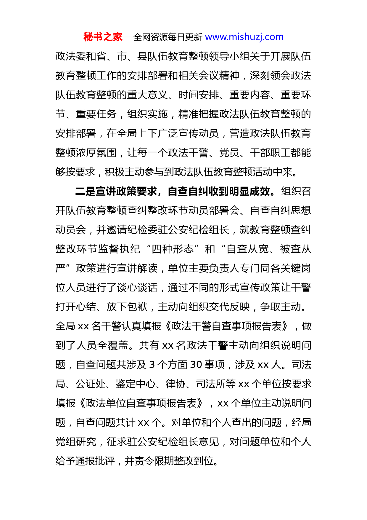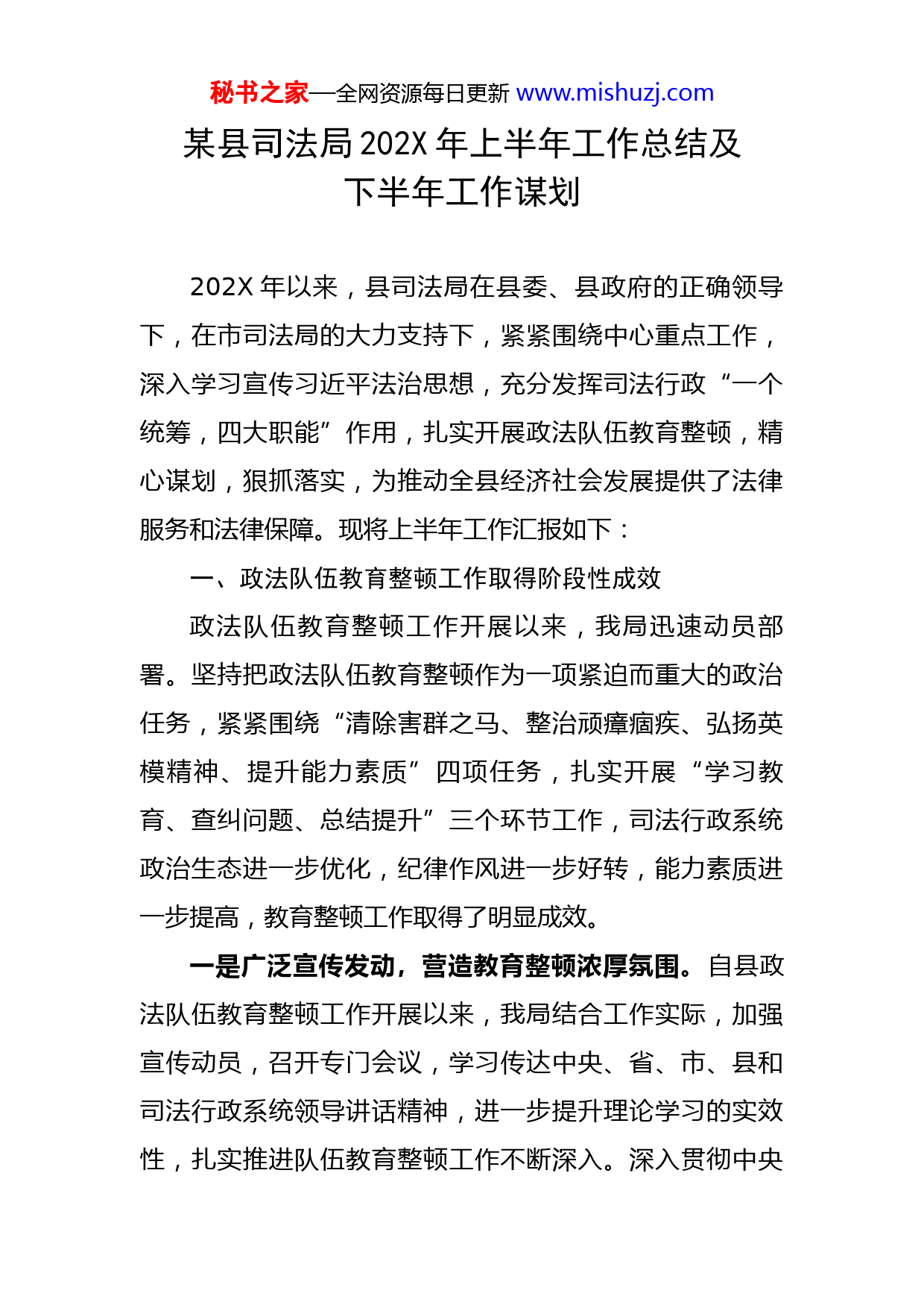 秘书之家—全网资源每日更新www.mishuzj.com某县司法局202X年上半年工作总结及下半年工作谋划202X年以来,县司法局在县委、县政府的正确领导下,在市司法局的大力支持下,紧紧围绕中心重点工作,深入学习宣传习近平法治思想,充分发挥司法行政“一个统筹,四大职能”作用,扎实开展政法队伍教育整顿,精心谋划,狠抓落实,为推动全县经济社会发展提供了法律服务和法律保障。现将上半年工作汇报如下:一、政法队伍教育整顿工作取得阶段性成效政法队伍教育整顿工作开展以来,我局迅速动员部署。坚持把政法队伍教育整顿作为一项紧迫而重大的政治任务,紧紧围绕“清除害群之马、整治顽瘴痼疾、弘扬英模精神、提升能力素质”四项任务,扎实开展“学习教育、查纠问题、总结提升”三个环节工作,司法行政系统政治生态进一步优化,纪律作风进一步好转,能力素质进一步提高,教育整顿工作取得了明显成效。一是广泛宣传发动,营造教育整顿浓厚氛围。自县政法队伍教育整顿工作开展以来,我局结合工作实际,加强宣传动员,召开专门会议,学习传达中央、省、市、县和司法行政系统领导讲话精神,进一步提升理论学习的实效性,扎实推进队伍教育整顿工作不断深入。深入贯彻中央秘书之家—全网资源每日更新www.mishuzj.com政法委和省、市、县队伍教育整顿领导小组关于开展队伍教育整顿工作的安排部署和相关会议精神,深刻领会政法队伍教育整顿的重大意义、时间安排、重要内容、重要环节、重要任务,组织实施,精准把握政法队伍教育整顿的安排部署,在全局上下广泛宣传动员,营造政法队伍教育整顿浓厚氛围,让每一个政法干警、党员、干部职工都能够按要求,积极主动参与到政法队伍教育整顿活动中来。二是宣讲政策要求,自查自纠收到明显成效。组织召开队伍教育整顿查纠整改环节动员部署会、自查自纠思想动员会,并邀请纪检委驻公安纪检组长,就教育整顿查纠整改环节监督执纪“四种形态”和“自查从宽、被查从严”政策进行宣讲解读,单位主要负责人专门同各关键岗位人员进行了谈心谈话,通过不同的形式宣传政策让干警打开心结、放下包袱,主动向组织交代反映,争取主动。全局xx名干警认真填报《政法干警自查事项报告表》,做到了人员全覆盖。共有xx名政法干警主动向组织说明问题,自查问题共涉及3个方面30事项,涉及xx人。司法局、公证处、鉴定中心、律协、司法所等xx个单位按要求填报《政法单位自查事项报告表》,xx个单位主动说明问题,自查问题共计xx个。对单位和个人查出的问题,经局党组研究,征求驻公安纪检组长意见,对问题单位和个人给予通报批评,并责令限期整改到位。秘书之家—全网资源每日更新www.mishuzj.com三是加大整改力度,顽瘴痼疾得到有效整治。制定了《xx县司法行政系统顽瘴痼疾专项整治实施方案》,成立了顽瘴痼疾专项整治领导小组,根据本单位“6+N”顽瘴痼疾具体问题梳理情况,研究制定了11项整改措施。通过自查自纠、组织“七查”和开门搞整顿等途径认真排查顽瘴痼疾并分类建立工作台账。共排查出单位和个人顽瘴痼疾问题xx条,已全部整改到位。完善常态长效机制,建立健全领导干部防止干预司法“三个规定”、律师管理考核等7个方面9项规章制度。民主生活会、座谈会提出xx条意见建议。同时,将顽瘴痼疾问题清单、整治效果和监督方式向社会公开,接受人民群众监督。四是大力推进办实事活动,进一步提升司法行政服务能力水平。根据中央省市便民服务措施要求,多次召开党组会议,研究谋划了办实事内容,并定期调度,督导催办确保办实事,切实将教育整顿转化为工作实效,提高了为民办实事的能力和实效。截至当前,共计制定“我为群众办实事”具体举措24项。组建法律服务服务团1个,深入xx工业园区、11家企业开展法治宣传7场次,为企业出具法律意见书5份,为企业解答法律咨询25条。深入市场、社区、广场、学校等地开展法治宣传xx场次,发放宣传资料9000份。通过现场、电话、网上调解各类纠纷xx起,其中没有涉企矛盾纠纷,疑难纠纷xx起。办理法律援助案秘书之家—全网资源每日更新www.mishuzj.com件xx起,其中农民工讨薪(劳动争议)案件xx件,涉及农民工xx人,为受援人挽回经济损失xx余万元。通过开通绿色通道,为困难企业和群众减公证免费用xx元。提供上门办理公证事项xx件、节假日延时服务xx次。在保证鉴定质量前提下缩短鉴定时间,出具鉴定意见xx份。为困难群众减免鉴定费用xx元。受理群众反映的问题xx件,解决了xx件,陆续推出便民利民举措xx项,主动为群众办实事办好事xx件,群众满意xx件,基本满意xx件,群众满意度为99%,推动队伍教育整顿为群众办实事工作走深走实。二、扎实推进依法治县工作一是认真落实市委依法治市办《关于做好法治调研工作的通知》,及时向市委依法治市办法治督察和调研处报送了xx县法治调研工作题目,谋划以《xx县公共法律服务体系建设在基层矛盾纠纷化解中的特点和作用》为题目,积极开展我县相关法治调研工作。二是贯彻落实市委依法治市办《关于进一步规范和加强全面依法治市信息工作的通知》,研究制定并下发了我县相关通知,督促各乡镇、县直各单位建立法治信息报送机制。目前已向市委依法治市办报送法治建设信息8篇。三是参照xx市司法局《202X年司法行