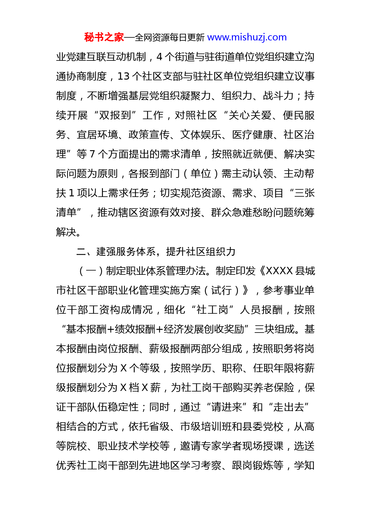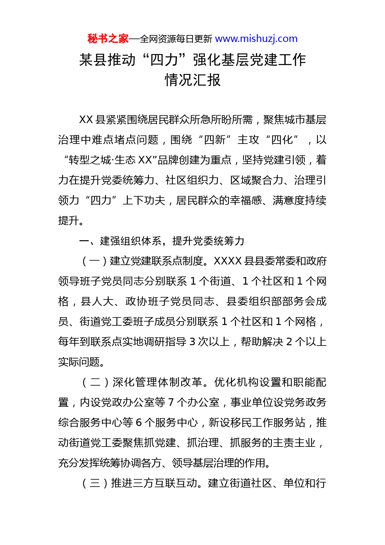 秘书之家—全网资源每日更新www.mishuzj.com某县推动“四力”强化基层党建工作情况汇报XX县紧紧围绕居民群众所急所盼所需,聚焦城市基层治理中难点堵点问题,围绕“四新”主攻“四化”,以“转型之城·生态XX”品牌创建为重点,坚持党建引领,着力在提升党委统筹力、社区组织力、区域聚合力、治理引领力“四力”上下功夫,居民群众的幸福感、满意度持续提升。一、建强组织体系,提升党委统筹力(一)建立党建联系点制度。XXXX县县委常委和政府领导班子党员同志分别联系1个街道、1个社区和1个网格,县人大、政协班子党员同志、县委组织部部务会成员、街道党工委班子成员分别联系1个社区和1个网格,每年到联系点实地调研指导3次以上,帮助解决2个以上实际问题。(二)深化管理体制改革。优化机构设置和职能配置,内设党政办公室等7个办公室,事业单位设党务政务综合服务中心等6个服务中心,新设移民工作服务站,推动街道党工委聚焦抓党建、抓治理、抓服务的主责主业,充分发挥统筹协调各方、领导基层治理的作用。(三)推进三方互联互动。建立街道社区、单位和行秘书之家—全网资源每日更新www.mishuzj.com业党建互联互动机制,4个街道与驻街道单位党组织建立沟通协商制度,13个社区支部与驻社区单位党组织建立议事制度,不断增强基层党组织凝聚力、组织力、战斗力;持续开展“双报到”工作,对照社区“关心关爱、便民服务、宜居环境、政策宣传、文体娱乐、医疗健康、社区治理”等7个方面提出的需求清单,按照就近就便、解决实际问题为原则,各报到部门(单位)需主动认领、主动帮扶1项以上需求任务;切实规范资源、需求、项目“三张清单”,推动辖区资源有效对接、群众急难愁盼问题统筹解决。二、建强服务体系,提升社区组织力(一)制定职业体系管理办法。制定印发《XXXX县城市社区干部职业化管理实施方案(试行)》,参考事业单位干部工资构成情况,细化“社工岗”人员报酬,按照“基本报酬+绩效报酬+经济发展创收奖励”三块组成。基本报酬由岗位报酬、薪级报酬两部分组成,按照职务将岗位报酬划分为X个等级,按照学历、职称、任职年限将薪级报酬划分为X档X薪,为社工岗干部购买养老保险,保证干部队伍稳定性;同时,通过“请进来”和“走出去”相结合的方式,依托省级、市级培训班和县委党校,从高等院校、职业技术学校等,邀请专家学者现场授课,选送优秀社工岗干部到先进地区学习考察、跟岗锻炼等,学知秘书之家—全网资源每日更新www.mishuzj.com识、长才干;鼓励和引导“社工岗”干部提升个人学历层次,鼓励参加成人教育、自学考试、函授学习等,提升学历;针对中专、大专、本科及以上学历的社工,县财政分别给予不低于50%、60%、70%的学费补贴;通过建立健全与岗位等级序列和绩效考评挂钩的动态薪资报酬体系,全县“一肩挑”社区专职工作者正职最高薪酬可达每月XX元,最低薪酬为每月XX元,一般社区专职工作者最高薪酬可达每月XX元,最低薪酬为每月X元;及时下拨社区工作运转经费,确保每个社区运转经费在每年X万元以上,社区服务经费在每年X万元以上。(二)推进智慧社区建设。坚持党建引领,优化社区职能,盘活社区资源,持续打造智慧社区,强化视频监控、周界防范、智能停车、火灾报警、高空抛物等智能防控系统建设,推广赋能智慧社区综治信息系统,着力构建“政府引导、社会参与、居民XX、智慧运用”的社区服务创新模式,提升社区工作智慧化、便利化、集约化发展水平。(三)推行“网格化”管理模式。根据安置点规模情况,动员素质较好的人员,特别是党员担任楼栋长、片区长,实行楼栋长、党小组组长“一肩挑”,做好群众的日常联系服务工作;构建起搬迁点党组织和群众XX组织负责抓总,楼长负责抓片区,楼层小组长负责抓楼层的工作机秘书之家—全网资源每日更新www.mishuzj.com制,构建了社区、网格、单元、楼栋四级管理体系,确保事事有人管,群众事务有人办;13个城市社区共划分网格64个、配备120个楼栋长,建立网格党小组64个,全部由社区党组织成员或党员骨干兼任网格党小组组长,配备网格员79人。三、建强治理体系,提升区域聚合力(一)推进党群服务中心提质升级。XXXX县紧贴居民需求,将社区党群服务中心作为宣传党的主张、贯彻党的决定、加强党建引领基层治理的坚强战斗堡垒,建设有固定活动场所、有党群服务大厅、有统一规范的名称及标识、有文化体育活动场地、有风格统一的组织架构、有多功能会议室、有接待谈心室、有图书阅览室、有服务办事指南、有公示宣传栏或主题教育展示厅的“十有”社区党群服务中心。(二)整合资源,下沉执法力量。在街道设置综合行政执法大队并核定一定事业编制数,整合县级执法部门派驻街道力量,统一以街道名义进行综合执法;放权赋能,提升管理成效,全面取消4个街道招商引资和协税护税任务,赋予街道党工委对上级部门派驻机构负责人的人事考核,以及城市规划建议、公共事务综合管理等权力,提升街道治理的水平和成效。(三)促进文明活动创建提质增效。成立志愿服务总秘书之家—全网资源每日更新www.mishuzj.com队,下设理论宣讲、惠民富民、时代风尚、文艺体育、教育医疗志愿服务队,分别由街道党工委、街道办班子成员任队长,动员和整合社区党员、群众、社