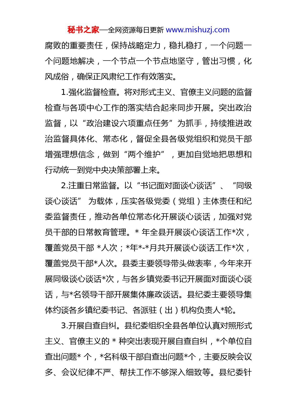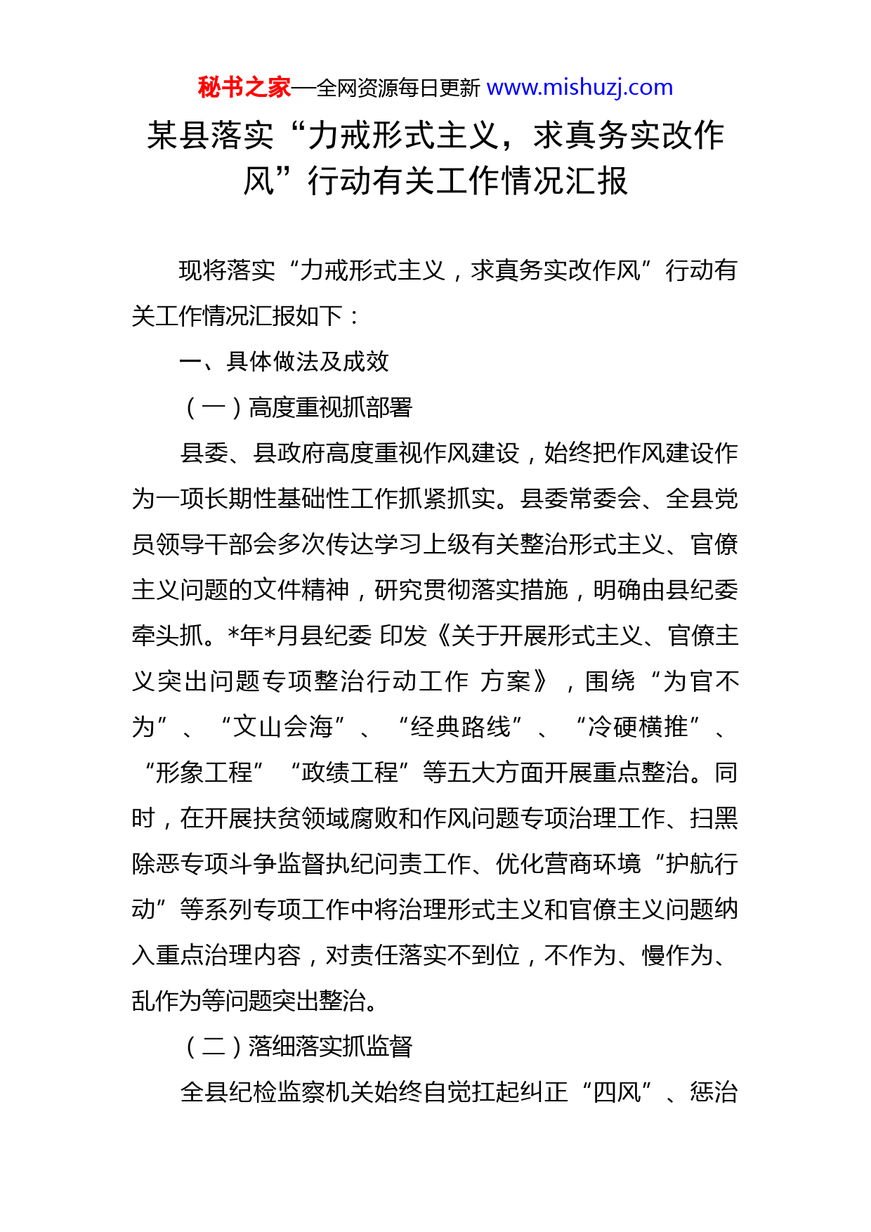 秘书之家—全网资源每日更新www.mishuzj.com某县落实“力戒形式主义,求真务实改作风”行动有关工作情况汇报现将落实“力戒形式主义,求真务实改作风”行动有关工作情况汇报如下:一、具体做法及成效(一)高度重视抓部署县委、县政府高度重视作风建设,始终把作风建设作为一项长期性基础性工作抓紧抓实。县委常委会、全县党员领导干部会多次传达学习上级有关整治形式主义、官僚主义问题的文件精神,研究贯彻落实措施,明确由县纪委牵头抓。年月县纪委印发《关于开展形式主义、官僚主义突出问题专项整治行动工作方案》,围绕“为官不为”、“文山会海”、“经典路线”、“冷硬横推”、“形象工程”“政绩工程”等五大方面开展重点整治。同时,在开展扶贫领域腐败和作风问题专项治理工作、扫黑除恶专项斗争监督执纪问责工作、优化营商环境“护航行动”等系列专项工作中将治理形式主义和官僚主义问题纳入重点治理内容,对责任落实不到位,不作为、慢作为、乱作为等问题突出整治。(二)落细落实抓监督全县纪检监察机关始终自觉扛起纠正“四风”、惩治秘书之家—全网资源每日更新www.mishuzj.com腐败的重要责任,保持战略定力,稳扎稳打,一个问题一个问题地解决,一个节点一个节点地坚守,管出习惯,化风成俗,确保正风肃纪工作有效落实。1.强化监督检查。将对形式主义、官僚主义问题的监督检查与各项中心工作的落实结合起来同步开展。突出政治监督,以“政治建设六项重点任务”为抓手,持续推进政治监督具体化、常态化,督促全县各级党组织和党员干部增强理想信念,做到“两个维护”,更加自觉地把思想和行动统一到党中央决策部署上来。2.注重日常监督。以“书记面对面谈心谈话”、“同级谈心谈话”为载体,压实各级党委(党组)主体责任和纪委监督责任,推动各单位常态化开展谈心谈话,加强对党员干部的日常教育管理。年全县开展谈心谈话工作次,覆盖党员干部人次;年-月共开展谈心谈话工作次,覆盖党员干部人次。县委主要领导带头做表率,今年来开展同级谈心谈话次,与各乡镇党委书记开展面对面谈心谈话,与名领导干部开展集体廉政谈话。县纪委主要领导集体约谈各乡镇纪委书记、各派驻(出)机构负责人轮。3.开展自查自纠。县纪委组织全县各单位认真对照形式主义、官僚主义的种突出表现开展自查自纠,个单位自查出问题个,名科级干部自查出问题个,主要反映会议多、会议纪律不严、帮扶工作不够深入细致等。县纪委针秘书之家—全网资源每日更新www.mishuzj.com对这些问题督促各单位进行整改。4.强化巡察监督。发挥巡察的政治“显微镜”“探照灯”作用,紧盯党内政治生活规范化、群众身边腐败和作风问题、涉黑涉恶问题、形式主义官僚主义和上级巡视整改落实情况。年来共开展两轮巡察,对个乡镇、个县直单位、个县管企业和个村(社区)党组织开展巡察,发现形式主义、官僚主义问题个,督促立行立改个,提出整改意见建议条。同时从已经开展的七轮巡察发现问题中梳理出一批共性问题,制定方案要求全县各级各单位主动对号入座开展“未巡先改”,推动问题整改从被动向主动转变,从局部到全局拓展。(三)重拳打击强震慑县纪委紧盯乡村振兴、“飓风行动”清理整治、优化营商环境等各级党委政府重大决策部署贯彻执行情况,对发现存在的不作为、慢作为、乱作为等突出问题严肃追责问责。年全县共立案查处形式主义、官僚主义问题件,占总案件数的.%,其中涉及科级干部件。年-月共立案查处形式主义、官僚主义问题件,占总案件数的.%,其中涉及科级干部件;另外有名科级干部因工作不严不实受到诫勉谈话。从目前查处的情况看,形式主义、官僚主义问题主要集中在项目验收“走过场”,工作“不作为慢作为”等领域,如年水利部门在实施人饮工程项目时存秘书之家—全网资源每日更新www.mishuzj.com在部分项目“被完工”,项目实施与验收等环节存在工作失职失责、作风不严不实等问题,包括单位原主要领导和分管领导在内的名领导干部被处分。此外,住建、财政、扶贫等部门也有一批干部因作风不严不实被立案查处。又如年查处的县委统战部干部施善南没有认真落实脱贫攻坚帮扶责任,对帮扶工作不重视,行动不积极,没有按照要求入户采集数据和开展帮扶工作,经所在单位一再教育,仍无改善,受到党内严重警告处分。再如叫安镇综治办副主任覃海静对镇政府安排其复查信访事项拖延不办,将本要求一个月时限内办理完成的复查工作搁置长达个多月没有开展相关工作,导致信访人多次重复上访,受到党内警告处分。(四)以案促改筑防线县纪委高度重视强化党员干部思想教育工作,发挥预防教育,治病挽救的作用,以开展警示教育为载体,积极推动新时代作风建设“以案促改”专项工作。今年来我委共印发案例通报期,转发上级通报文件期,督促各单位利用典型案例开展警示教育工作,全县共开展警示教育次。县纪委领导到年以来问题突出、班子成员被立案查处的个单位与单位领导班子开展集体廉政谈话,其中纪委主要领导与个单位班子成员开展集体谈话。谈话既严肃指出问题又殷切寄予鼓励,有效促进严管和厚爱相结秘书之家—全网资源每日更新www.mishuzj.com合。同时督促单位党委(党组)切实履行从严治党主