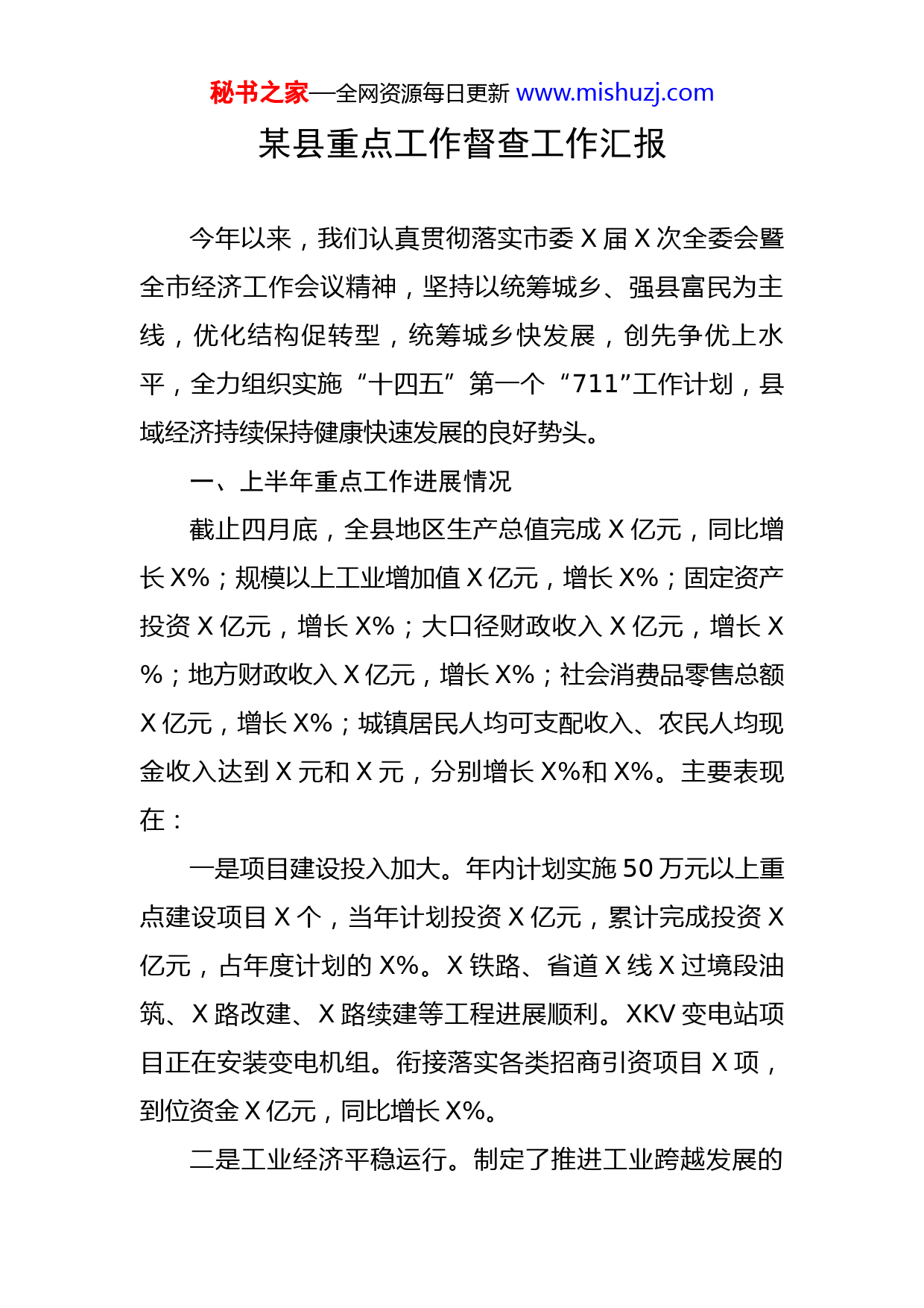 秘书之家—全网资源每日更新www.mishuzj.com某县重点工作督查工作汇报今年以来,我们认真贯彻落实市委X届X次全委会暨全市经济工作会议精神,坚持以统筹城乡、强县富民为主线,优化结构促转型,统筹城乡快发展,创先争优上水平,全力组织实施“十四五”第一个“711”工作计划,县域经济持续保持健康快速发展的良好势头。一、上半年重点工作进展情况截止四月底,全县地区生产总值完成X亿元,同比增长X%;规模以上工业增加值X亿元,增长X%;固定资产投资X亿元,增长X%;大口径财政收入X亿元,增长X%;地方财政收入X亿元,增长X%;社会消费品零售总额X亿元,增长X%;城镇居民人均可支配收入、农民人均现金收入达到X元和X元,分别增长X%和X%。主要表现在:一是项目建设投入加大。年内计划实施50万元以上重点建设项目X个,当年计划投资X亿元,累计完成投资X亿元,占年度计划的X%。X铁路、省道X线X过境段油筑、X路改建、X路续建等工程进展顺利。XKV变电站项目正在安装变电机组。衔接落实各类招商引资项目X项,到位资金X亿元,同比增长X%。二是工业经济平稳运行。制定了推进工业跨越发展的秘书之家—全网资源每日更新www.mishuzj.com实施意见,列支X万元发展基金支持工业发展。实施重点建设项目22个,当年计划投资X亿元,目前完成X亿元。X三是新农村建设创新突破。创新开展生产发展示范村、生活宽裕示范村、乡风文明示范村、村容整洁示范村和管理民主示范村“五村联创”活动,调动和鼓励不同发展类型和层次村社分步推进新农村建设。这一活动的提出和开展,受到了省市的充分肯定,原省委副书记X作了重要批示,省委农办在《X农村工作》和《X农村要情》上,全文刊登了我县开展“五村联创”活动的实施方案、考评办法和经验做法。以此为统领,我们坚持建办园区、开发产业、整合项目资金,将以工促农资金比例由上年财政支出的X%提高到了X%,达到X万元,深度推进新农村建设。X个旧村改造及X个省列、X个县列整村推进项目完成投资X万元。农村沼气、安全饮水、村道硬化等X个重点农业项目完成投资X亿元。全县牛饲养量达到X万头,出栏X万头。新植核桃2万亩、补植1万亩。推广种植地膜川芎6224亩,药材面积达到X万亩。四是城镇建设提质扩容。县城扩建“338”工程完成投资X亿元。X生态园续建、X延伸拓建等项目进展良好。X套新建廉租房全部开工建设。西城区控制性规划和城市道路、供热、绿地等专项规划通过评审。列支X万元专项资秘书之家—全网资源每日更新www.mishuzj.com金扶持小城镇建设,X个重点小城镇建设项目开工X项,完成投资X亿元。五是旅游三产稳步发展。编制完成了《X县旅游产业发展总体规划》和《X景区修建性详细规划》。总投资X万元的X项旅游产业综合开发工程,累计完成投资X万元。X景区综合开发、军工主题体验园等项目进展顺利。举办了中国摄影大师走进X采风活动,X旅游的对外影响力不断扩大,商贸流通、餐饮服务等第三产业发展活力进一步增强。六是民生工程进展顺利。投资X亿元的X迁建、职教中心迁建、X小学新建等X个教育基础设施建设工程完成投资X亿元。投资X亿元的县医院迁建工程完成投资X万元。城镇新增就业X人,下岗失业人员实现再就业X人。新农保参保率达到X%,新农合参合率达到X%。城乡低保、救灾救济等惠民政策全面落实。七是社会大局和谐稳定。紧密联系实际,积极创新实践,取得了阶段性成效。在最近召开的全省社会管理创新综合试点工作座谈会上交流了试点工作经验。在第X次全国法制宣传教育工作会议上,我县被评为全国法制宣传教育先进县”。出台了建立健全重大事项社会稳定风险评估化解机制意见和实施办法,对城镇建设领域的X个项目和移民搬迁等X个民生工程进行了社会稳定风险评估。加强秘书之家—全网资源每日更新www.mishuzj.com重要生产资料价格监测,全县市场物价基本稳定。不断加大矿山、道路交通、食品药品等重点领域专项整治力度,安全生产形势总体平稳。八是党的建设不断加强。结合党员冬训和“X”创评,在农村党员群众中广泛开展了以爱国主义、思想道德、法律知识为主要内容的集中教育活动,有效提升了农村党员和农民的素质。继续开展干部作风整顿活动,组织实施了工程建设领域突出问题专项治理、灾后重建和扩大内需项目建设情况专项检查,加大了工程建设全领域的监督检查。二、存在问题和下一步打算总我们虽然取得了阶段性成效,但与市委、市政府的要求相比,仍存在一些差距和不足。主要是解放思想还不深入,项目进展还不平衡;规模以上工业增加值、财政收入等指标增速有所回落;县上规划实施的项目多、投资大,资金压力非常大。针对这些问题,我们将严格按照这次会议精神,再聚力量,狠抓落实,确保全面超额完成年度各项目标任务,向市委、市政府交一份满意的答卷。一是确保完成任务指标。全面对照年初计划目标,切实加强监测调度,抓好财政收入均衡入库,加快财政支出进度,确保各项经济指标超额完成任务。二是全力加快项目建设。把抓项目、保投资作为重中之重,严格落实县级领导秘书之家—全网资源每日更新www.mishuzj.com包抓和部门帮建责任制,全力加快重点项目工程进度。三是扎实推进产业开发。在推进工业跨越发展上,抓紧修订完善“X”实施意见,在新农村建设上,