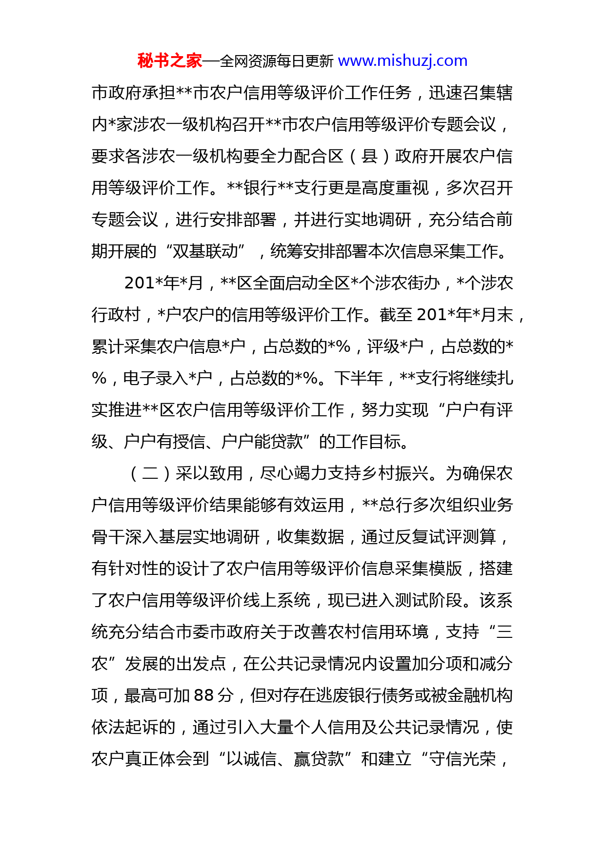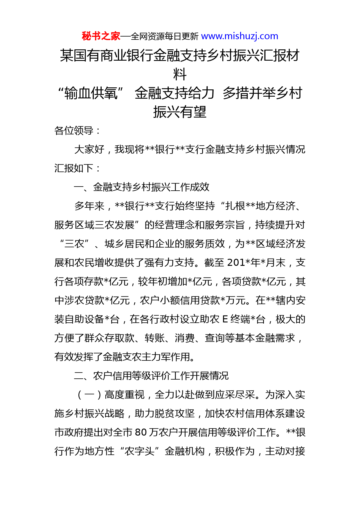 秘书之家—全网资源每日更新www.mishuzj.com某国有商业银行金融支持乡村振兴汇报材料“输血供氧”金融支持给力多措并举乡村振兴有望各位领导:大家好,我现将银行支行金融支持乡村振兴情况汇报如下:一、金融支持乡村振兴工作成效多年来,银行支行始终坚持“扎根地方经济、服务区域三农发展”的经营理念和服务宗旨,持续提升对“三农”、城乡居民和企业的服务质效,为区域经济发展和农民增收提供了强有力支持。截至201年月末,支行各项存款亿元,较年初增加亿元,各项贷款亿元,其中涉农贷款亿元,农户小额信用贷款万元。在辖内安装自助设备台,在各行政村设立助农E终端台,极大的方便了群众存取款、转账、消费、查询等基本金融需求,有效发挥了金融支农主力军作用。二、农户信用等级评价工作开展情况(一)高度重视,全力以赴做到应采尽采。为深入实施乡村振兴战略,助力脱贫攻坚,加快农村信用体系建设市政府提出对全市80万农户开展信用等级评价工作。银行作为地方性“农字头”金融机构,积极作为,主动对接秘书之家—全网资源每日更新www.mishuzj.com市政府承担市农户信用等级评价工作任务,迅速召集辖内家涉农一级机构召开市农户信用等级评价专题会议,要求各涉农一级机构要全力配合区(县)政府开展农户信用等级评价工作。银行支行更是高度重视,多次召开专题会议,进行安排部署,并进行实地调研,充分结合前期开展的“双基联动”,统筹安排部署本次信息采集工作。201年月,区全面启动全区个涉农街办,个涉农行政村,户农户的信用等级评价工作。截至201年月末,累计采集农户信息户,占总数的%,评级户,占总数的%,电子录入户,占总数的%。下半年,支行将继续扎实推进区农户信用等级评价工作,努力实现“户户有评级、户户有授信、户户能贷款”的工作目标。(二)采以致用,尽心竭力支持乡村振兴。为确保农户信用等级评价结果能够有效运用,总行多次组织业务骨干深入基层实地调研,收集数据,通过反复试评测算,有针对性的设计了农户信用等级评价信息采集模版,搭建了农户信用等级评价线上系统,现已进入测试阶段。该系统充分结合市委市政府关于改善农村信用环境,支持“三农”发展的出发点,在公共记录情况内设置加分项和减分项,最高可加88分,但对存在逃废银行债务或被金融机构依法起诉的,通过引入大量个人信用及公共记录情况,使农户真正体会到“以诚信、赢贷款”和建立“守信光荣,秘书之家—全网资源每日更新www.mishuzj.com失信寸步难行”的信用观念,珍爱个人信用记录,遵守公共秩序。系统上线后,农户信用等级根据不同分值划分为至五个级别,不同信用等级的农户有相应的授信额度,当农户需要用信时,可通过手机客户端或携带个人身份证在营业柜台即可办理,均可享受贷款资金优先、利率优惠、信用额度提高等多项优惠政策。可以说,农户信用等级评价系统为有效解决农户贷款难的问题,增强“三农”可持续发展提供探索思路,是有效推进农村信用体系建设,实现美丽乡村和营造良好农村发展环境的有效举措之一。市农户信用等级评价系统建设工作由银行和云计算有限责任公司共同开发,目前,该系统已搭建完成,正在进行系统优化,预计下半年正式上线运行。三、存在问题及工作建议一是作为省属地方金融机构,银行支行为支持区域经济发展,降低辖内农户和企业融资成本责无旁贷,我支行计划对贷款利率进行下调,但由于自身资金成本较高在条件成熟下,希望人民银行在支农再贷款、支小再贷款方面给予一定的支持,使银行支行有能力、有力量更好的为支持区域经济发展做出更大的贡献。二是在农户信用等级评价采集过程中,由于农户打工外出情况较多,家里只剩老人和小孩,还有部分农户对此项工作配合意愿不高、导致现阶段采集工作进展缓慢。下秘书之家—全网资源每日更新www.mishuzj.com一步,我行将继续进行农户信息采集、评价,齐心协力将农户信用等级评价做实、做优。四、下半年工作计划下半年,我支行将紧紧围绕区委区政府及人民银行支行各项战略方针的政策指引及经济发展导向,以农户信用等级评价工作为契机,以实施乡村振兴战略、改善营商环境为抓手,持续加大对农户、居民、小微企业的服务力度,全力满足农户经营、居民生活消费、企业生产经营等资金需求,努力做出特色、做出品牌,共同为区乡村振兴发展贡献更大的力量。
