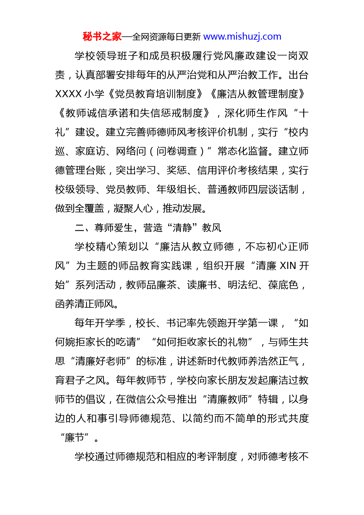秘书之家—全网资源每日更新www.mishuzj.com某小学清廉学校建设综述X小学自创建“清廉学校”以来,一直秉承“以清为美,以廉为荣”的创廉理念,依托课堂、课后服务课程、艺术特色活动等载体,从学校管理者、教师、学生三大工作主体着手,开展了丰富多样的廉教活动。学校主要努力打造政风清明、校风清净、教风清正、学风清新的新时代廉洁文化。一、作风改进,奏响“清明”政风学校党总支认真贯彻党中央和习近平总书记关于教育的重要论述和党建要求,落实省、市、区委和教育局党委部署的各项工作,从叠“加”六艺八德、精“减”事务流程、“倍”增服务成效、消“除”校园问题四个方面入手打造“博梅党建加减乘除工作法”的党建品牌,扎实开展并统筹推进各项工作,以行动诠释“博梅党建”的责任担当。学校党政联席会议集体决策“三重一大”并严格落实公开制度。通过教代会、校务委员会、班子扩大会等途径让广大教师参与学校管理。坚持每月班子会议邀请党员教师列席的议事制度,实现与学校行政直接对话,进行有效监督;每学期征集“博梅发展金点子”,让每一位教师都为学校发展献计献策。秘书之家—全网资源每日更新www.mishuzj.com学校领导班子和成员积极履行党风廉政建设一岗双责,认真部署安排每年的从严治党和从严治教工作。出台XXXX小学《党员教育培训制度》《廉洁从教管理制度》《教师诚信承诺和失信惩戒制度》,深化师生作风“十礼”建设。建立完善师德师风考核评价机制,实行“校内巡、家庭访、网络问(问卷调查)”常态化监督。建立师德管理台账,突出学习、奖惩、信用评价考核结果,实行校级领导、党员教师、年级组长、普通教师四层谈话制,做到全覆盖,凝聚人心,推动发展。二、尊师爱生,营造“清静”教风学校精心策划以“廉洁从教立师德,不忘初心正师风”为主题的师品教育实践课,组织开展“清廉XIN开始”系列活动,教师品廉茶、读廉书、明法纪、葆底色,函养清正师风。每年开学季,校长、书记率先领跑开学第一课,“如何婉拒家长的吃请”“如何拒收家长的礼物”,与师生共思“清廉好老师”的标准,讲述新时代教师养浩然正气,育君子之风。每年教师节,学校向家长朋友发起廉洁过教师节的倡议,在微信公众号推出“清廉教师”特辑,以身边的人和事引导师德规范、以简约而不简单的形式共度“廉节”。学校通过师德规范和相应的考评制度,对师德考核不秘书之家—全网资源每日更新www.mishuzj.com合格的教师坚决实行“一票否决”。针对行政管理,学校提出:小微权力进清单,清单之外无权力。出台《XXXX小学小微权力清单》,在教职工聘用、干部任用、年度考核、职称评定、资金使用、物品采购等各项权力的运行上,明确了每项职权的名称、内容、依据、办理流程、办理时限、责任人等,做到环环有记录、全程受监督、责任可追溯。三、润泽心田,落实“清正“校风学校充分发挥文化育人功能,着力让校园内每一栋建筑“说话”。校园文化建设围绕“知书达礼”校训,突出学校“礼文化”特色,各楼栋以“礼”命名,如学校综合楼名为“和礼楼”,校园主题雕塑“知书达礼”以及“至圣先师”孔子像。除此之外,学校积极打造清廉“文化走廊”“文化墙”“一班一品”等特色阵地,定期更新宣传栏里的清廉标语、展厅里的清廉书法作品、教学楼走廊的清廉故事;学生自办的清廉主题黑板报、班级文化墙上的清廉标语等;班级专门设立清廉文化图书角,不断更新清廉类书籍,让清廉之风浸润校园。四、落实双减,培育“清新”学风我校把建设清廉学校作为推动教育高质量发展的重要抓手,从学生的思想实际和心理需求出发,开展了“登山”、“劳动赋能”等一系列“崇德尚廉”活动,把清廉秘书之家—全网资源每日更新www.mishuzj.com教育融入学校德育全过程,引导学生从小培养清廉习惯、清廉作风。在今后的创建活动中,XX学校将会一如既往地以镌刻廉洁、倡导廉洁、奉行廉洁,更深入的开展学廉、倡廉、创廉活动!