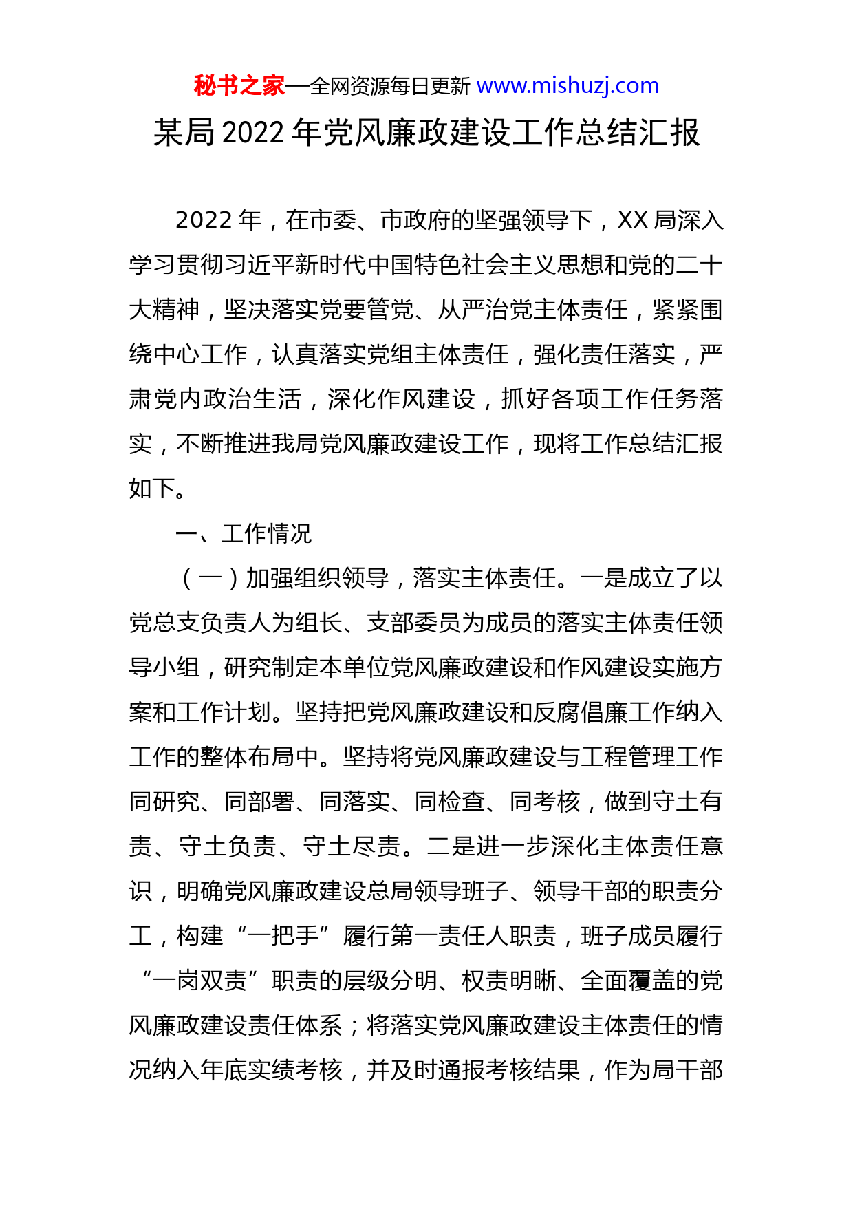 秘书之家—全网资源每日更新www.mishuzj.com某局2022年党风廉政建设工作总结汇报2022年,在市委、市政府的坚强领导下,XX局深入学习贯彻习近平新时代中国特色社会主义思想和党的二十大精神,坚决落实党要管党、从严治党主体责任,紧紧围绕中心工作,认真落实党组主体责任,强化责任落实,严肃党内政治生活,深化作风建设,抓好各项工作任务落实,不断推进我局党风廉政建设工作,现将工作总结汇报如下。一、工作情况(一)加强组织领导,落实主体责任。一是成立了以党总支负责人为组长、支部委员为成员的落实主体责任领导小组,研究制定本单位党风廉政建设和作风建设实施方案和工作计划。坚持把党风廉政建设和反腐倡廉工作纳入工作的整体布局中。坚持将党风廉政建设与工程管理工作同研究、同部署、同落实、同检查、同考核,做到守土有责、守土负责、守土尽责。二是进一步深化主体责任意识,明确党风廉政建设总局领导班子、领导干部的职责分工,构建“一把手”履行第一责任人职责,班子成员履行“一岗双责”职责的层级分明、权责明晰、全面覆盖的党风廉政建设责任体系;将落实党风廉政建设主体责任的情况纳入年底实绩考核,并及时通报考核结果,作为局干部秘书之家—全网资源每日更新www.mishuzj.com表彰奖励、考察考核、行政问责、责任追究的重要依据。三是加强支部班子建设。我们把选好支部书记、配强专职党务干部作为增强基层党组织战斗力的主要环节来抓,根据工作需要,定期学习政治理论和业务知识。规范机关党组织工作制度。坚持落实“一岗双责”制,健全党员目标管理、“三会一课”、民主生活会、民主评议党员工作、党费收缴等多项制度。按要求实施了“党务公开”制度,将党费收缴、党员发展等各项工作按时公开,自觉接受全体党员的监督。(二)加强政治学习,筑牢政治定力。一是把学习贯彻习近平新时代中国特色社会主义思想和党的二十大精神作为政治学习的首要任务抓实抓好。坚持多形式做好政治理论学习,做到结合实际学、带着问题学,把自己摆进去、找差距、明方向、理思路、谋举措,在学思践悟中不断深化思想认识、提高政治站位。二是党员干部集中学习和自学相结合学习《中国共产党章程》、《廉政准则》、《中国共产党党组工作条例》《中国共产党党内法规条例》等党章党规,坚持每周五为集中学习日,采取定任务学、参观教育基地、观看警示教育片、座谈交流等多种形式,强化学习效果。2022年共学习有关党风廉政建设的内容10次。9月8日,召开整治问题专项工作动员会,传达了市委的相关精神、重要性和下一步的工作安排。开展党秘书之家—全网资源每日更新www.mishuzj.com员活动日10次,并把其作为党支部“三会一课”和党员学习教育的重要内容。三是创新学习模式。精心制作“学习提醒”图片,组织调动全体干部职工利用“学习强国”等学习平台掌握当前新形势、新任务、新举措、新发展、新要求,并不定期对学习情况进行统计通报;通过“学习讲堂”。干部职工结合岗位职责、工作实际、经验做法等情况,自定主题轮流讲课,调动全局干部职工参学积极性,增强学习实效。(三)加强廉政教育,筑牢思想防线。一是在单位中建立了服务承诺制、限时办结制、责任追究制等一系列工作机制,并加大工作督查力度,确保政令畅通顺达、服务全面到位。强化责任意识,党组书记要履行“第一责任人”责任,党组成员带头履职尽责,严守政治纪律、政治规矩。将意识形态工作纳入党组重要议事日程。加强意识形态工作责任制及贯彻落实意识形态工作决策部署,2022年我局党组书记组织召开意识形态工作会议及网络意识形态工作会各2次。二是加强示范教育、警示教育和岗位教育,加强廉洁从政规定和党纪政纪教育。以专项行动为契机,积极转变作风,密切联系实际。深化机关作风建设,加强工作作风建设。认真落实中央关于改进工作作风、密切联系群众、中央“八项规定”等各项规章制度,进一步严格控制经费支出,严格执行公车“三不准”规定,坚决秘书之家—全网资源每日更新www.mishuzj.com禁止奢侈浪费行为。三是领导干部自觉遵守党风廉政建设和反腐败工作的各项规定,坚持勤政清廉为本,以身作则,率先垂范,带头按照党员领导干部廉洁自律的有关规定严格要求自己,要求配偶及子女,做到不该说的不说,不该做的不做,不该吃的不吃,不该拿的不拿,不该去的地方不去,有力地维护了班子整体形象,起到了很好的示范带动作用。(四)加强源头防腐,规范权力运行。一是坚持和落实民主集中制。完善领导干部民主生活会制度,强化班子内部的相互监督作用,凡涉及重大决策、重大事项安排和大额度资金的使用,均通过局党组集体讨论决定,推动权力公开透明阳光运行。二是认真落实党风廉政建设的各项规定。认真制定并落实领导干部述廉制度、责任追究制度、诫勉谈话制度、“三重一大”等重要事项集体决策制度等规章制度。三是严肃党内政治生活,开展批评与自我批评。加强对领导干部履职用权的监督,认真落实党内监督和领导干部个人有关事项报告制度。强化监督检查,抓好日常和专项工作的落实。推进党务、政务公开工作。将社会关注的事项在单位党务、政务公示栏进行了公告公示,并指定专人负责。二、