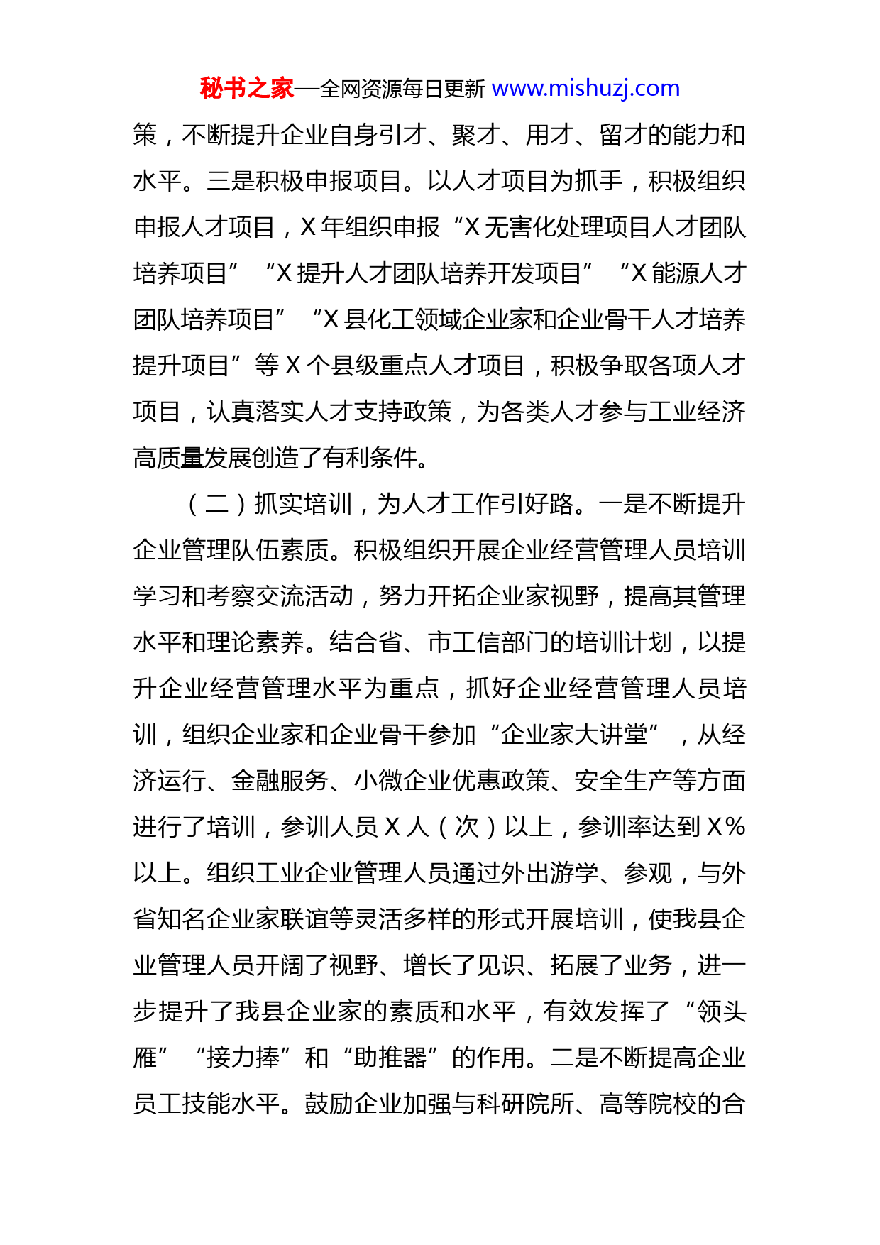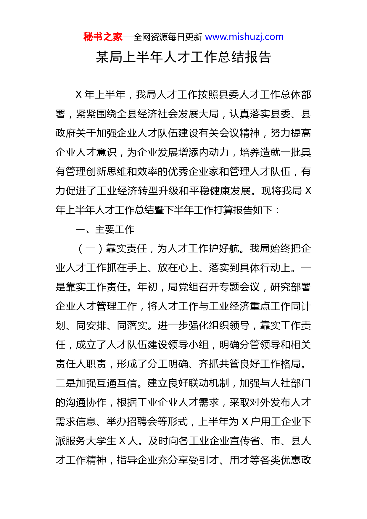 秘书之家—全网资源每日更新www.mishuzj.com某局上半年人才工作总结报告X年上半年,我局人才工作按照县委人才工作总体部署,紧紧围绕全县经济社会发展大局,认真落实县委、县政府关于加强企业人才队伍建设有关会议精神,努力提高企业人才意识,为企业发展增添内动力,培养造就一批具有管理创新思维和效率的优秀企业家和管理人才队伍,有力促进了工业经济转型升级和平稳健康发展。现将我局X年上半年人才工作总结暨下半年工作打算报告如下:一、主要工作(一)靠实责任,为人才工作护好航。我局始终把企业人才工作抓在手上、放在心上、落实到具体行动上。一是靠实工作责任。年初,局党组召开专题会议,研究部署企业人才管理工作,将人才工作与工业经济重点工作同计划、同安排、同落实。进一步强化组织领导,靠实工作责任,成立了人才队伍建设领导小组,明确分管领导和相关责任人职责,形成了分工明确、齐抓共管良好工作格局。二是加强互通互信。建立良好联动机制,加强与人社部门的沟通协作,根据工业企业人才需求,采取对外发布人才需求信息、举办招聘会等形式,上半年为X户用工企业下派服务大学生X人。及时向各工业企业宣传省、市、县人才工作精神,指导企业充分享受引才、用才等各类优惠政秘书之家—全网资源每日更新www.mishuzj.com策,不断提升企业自身引才、聚才、用才、留才的能力和水平。三是积极申报项目。以人才项目为抓手,积极组织申报人才项目,X年组织申报“X无害化处理项目人才团队培养项目”“X提升人才团队培养开发项目”“X能源人才团队培养项目”“X县化工领域企业家和企业骨干人才培养提升项目”等X个县级重点人才项目,积极争取各项人才项目,认真落实人才支持政策,为各类人才参与工业经济高质量发展创造了有利条件。(二)抓实培训,为人才工作引好路。一是不断提升企业管理队伍素质。积极组织开展企业经营管理人员培训学习和考察交流活动,努力开拓企业家视野,提高其管理水平和理论素养。结合省、市工信部门的培训计划,以提升企业经营管理水平为重点,抓好企业经营管理人员培训,组织企业家和企业骨干参加“企业家大讲堂”,从经济运行、金融服务、小微企业优惠政策、安全生产等方面进行了培训,参训人员X人(次)以上,参训率达到X%以上。组织工业企业管理人员通过外出游学、参观,与外省知名企业家联谊等灵活多样的形式开展培训,使我县企业管理人员开阔了视野、增长了见识、拓展了业务,进一步提升了我县企业家的素质和水平,有效发挥了“领头雁”“接力捧”和“助推器”的作用。二是不断提高企业员工技能水平。鼓励企业加强与科研院所、高等院校的合秘书之家—全网资源每日更新www.mishuzj.com作,采取项目合作、开展培训指导等方式柔性引才。目前已有X户工业企业柔性引进聘用人才共计X人,其中外籍专家X人。指导企业加大岗位培训、技能培训、继续教育培训和学历教育,使之成为晋升职务和提高工资待遇的重要条件。支持企业建立员工培训中心,对在岗职工自主开展职业技能培训,不断提升其业务能力水平。三是抓好企业人才职称评审。加强与市县人社部门的配合,积极做好企业人才职称评审工作,加大宣传力度,提升服务水平,开展企业专业技术人员继续教育培训,组建了工业企业市内有效中级专家评审委员会,有力促进了企业职工参与职称评审的积极性和主动性评审,X年上半年评审市内有效职称X人,其中初级职称X人,中级职称X人。工业企业累计取得专业技术职称的人员共计X人,其中:初级职称X人,中级职称X人,高级职称X人(副高级X人,正高级X人),推荐X同志为X省领军人才,工业领域推荐评选市管拔尖人才X人,县管拔尖人才X人。中小企业人才评价政策“绿色通道”进一步畅通。(三)创新机制,为人才工作搭好台。一是加强企业技术创新主体培育,注重人才引领作用。努力推动工业企业进一步完善技术创新体系,提高企业技术创新能力,为专业技术人员创新发展提供平台。X年在企业家的积极配合和申报下,培育申报省级技术创新示范企业X户,省级工秘书之家—全网资源每日更新www.mishuzj.com业设计中心X户,省级专精特新企业X户,专精特新小巨人企业X户,推荐兴农牧业参加省工业优秀新产品的评选。至目前工业企业已认定省级技术创新示范企业X家,省级技术中心X家、省级设计中心X家,市级技术中心X家,“专精特新”企业X家。通过技术中心、设计中心的申报评定,充分发挥了企业技术带头人的引领作用。二是依托中小企业服务平台,提升人才服务水平。申报国家级中小企业公共示范平台X户。推荐申报省级生产性服务业示范企业X户。至目前,认定省级基地X个,省级中小企业服务平台X个。积极发挥平台、基地的承载和吸引作用,帮助企业家开展企业员工培训,培养创新人才。目前X等平台服务企业达到X户次。今年以来,依托我县X、X、X培训、职业中专等学校平台,以现场会和实地演练的形式举办岗前培训班?X场(次)X人。为县内企业家日常培训提供了良好载体,为企业家学习交流提供即时性、个性化、全天候平台。三是优化人才服务环境,不断激发企业人才活力。积极宣传落实《X县鼓励非公有制企业引进人才办法》等人才激励政策,不断提高企业引进人才的力度。以人才项目为依托,不断
