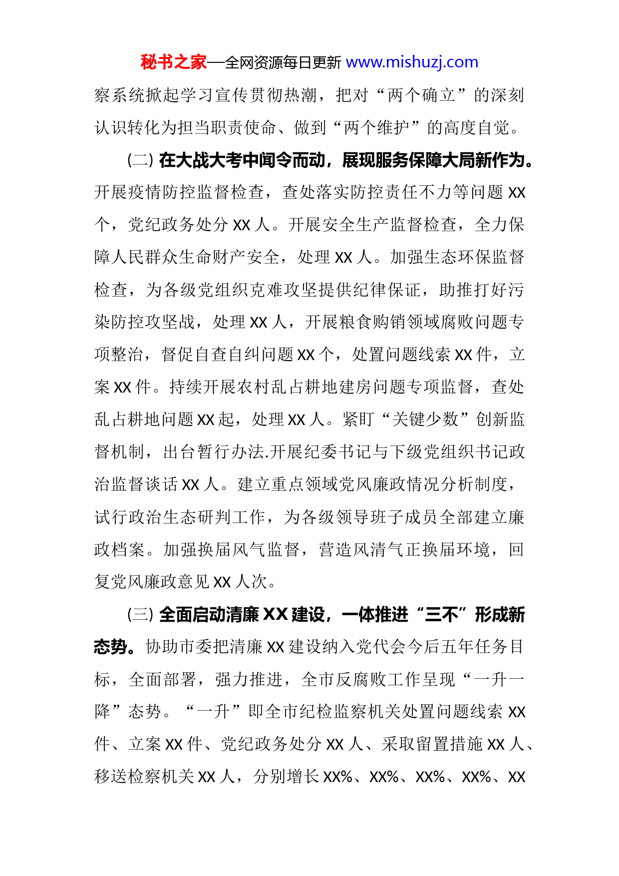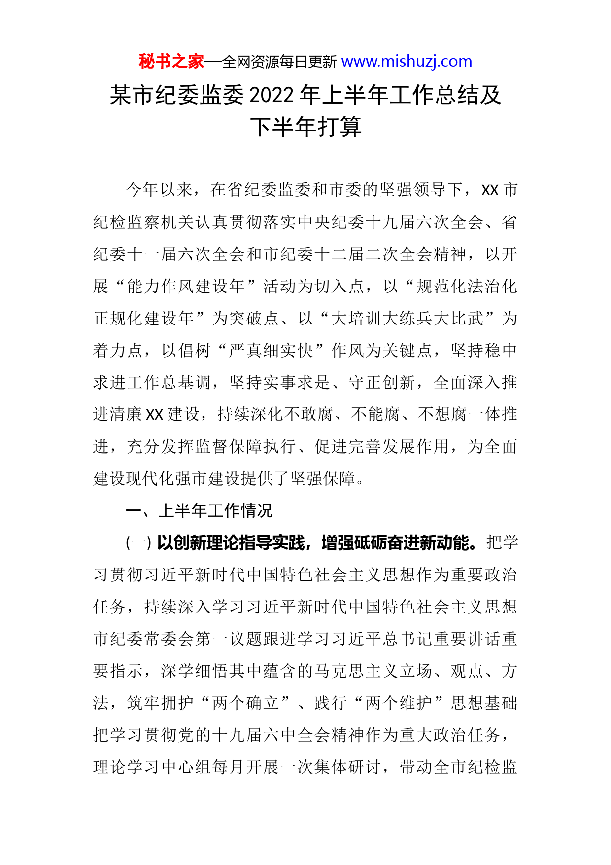 秘书之家—全网资源每日更新www.mishuzj.com某市纪委监委2022年上半年工作总结及下半年打算今年以来,在省纪委监委和市委的坚强领导下,XX市纪检监察机关认真贯彻落实中央纪委十九届六次全会、省纪委十一届六次全会和市纪委十二届二次全会精神,以开展“能力作风建设年”活动为切入点,以“规范化法治化正规化建设年”为突破点、以“大培训大练兵大比武”为着力点,以倡树“严真细实快”作风为关键点,坚持稳中求进工作总基调,坚持实事求是、守正创新,全面深入推进清廉XX建设,持续深化不敢腐、不能腐、不想腐一体推进,充分发挥监督保障执行、促进完善发展作用,为全面建设现代化强市建设提供了坚强保障。一、上半年工作情况(一)以创新理论指导实践,增强砥砺奋进新动能。把学习贯彻习近平新时代中国特色社会主义思想作为重要政治任务,持续深入学习习近平新时代中国特色社会主义思想市纪委常委会第一议题跟进学习习近平总书记重要讲话重要指示,深学细悟其中蕴含的马克思主义立场、观点、方法,筑牢拥护“两个确立”、践行“两个维护”思想基础把学习贯彻党的十九届六中全会精神作为重大政治任务,理论学习中心组每月开展一次集体研讨,带动全市纪检监秘书之家—全网资源每日更新www.mishuzj.com察系统掀起学习宣传贯彻热潮,把对“两个确立”的深刻认识转化为担当职责使命、做到“两个维护”的高度自觉。(二)在大战大考中闻令而动,展现服务保障大局新作为。开展疫情防控监督检查,查处落实防控责任不力等问题XX个,党纪政务处分XX人。开展安全生产监督检查,全力保障人民群众生命财产安全,处理XX人。加强生态环保监督检查,为各级党组织克难攻坚提供纪律保证,助推打好污染防控攻坚战,处理XX人,开展粮食购销领域腐败问题专项整治,督促自查自纠问题XX个,处置问题线索XX件,立案XX件。持续开展农村乱占耕地建房问题专项监督,查处乱占耕地问题XX起,处理XX人。紧盯“关键少数”创新监督机制,出台暂行办法.开展纪委书记与下级党组织书记政治监督谈话XX人。建立重点领域党风廉政情况分析制度,试行政治生态研判工作,为各级领导班子成员全部建立廉政档案。加强换届风气监督,营造风清气正换届环境,回复党风廉政意见XX人次。(三)全面启动清廉XX建设,一体推进“三不”形成新态势。协助市委把清廉XX建设纳入党代会今后五年任务目标,全面部署,强力推进,全市反腐败工作呈现“一升一降”态势。“一升”即全市纪检监察机关处置问题线索XX件、立案XX件、党纪政务处分XX人、采取留置措施XX人、移送检察机关XX人,分别增长XX%、XX%、XX%、XX%、XX秘书之家—全网资源每日更新www.mishuzj.com%。“一降”即受理群众举报、业务内检举控告分别下降XX、XX%,重复举报占比下降XX%。完善以案促改机制,通过剖析案件、检视问题、建章立制,建立从查办案件到促进治理的完整链条。深入开展行政执法领域以案促改,组织市直XX个行政执法单位开展警示教育XX次,建立健全制度XX个。召开全市领导干部以案促改警示教育大会,全市各级党员干部以XX典型案例为反面教材,深入开展为期一个月的以案促改,在全市形成强烈震慑。全市各级各单位全面启动清廉XX建设,扎实推进廉洁机关、廉洁医院、廉洁学校、廉洁企业、廉洁家庭、廉洁乡村、廉洁社区,着力营造廉荣贪耻的社会氛围。(四)多措并举纠治“四风”,作风建设谱写新篇章。探索纠治“四风”新途径。建成“四风”问题监督平台,比对核查疑似问题线索XX条,以“数字赋能”为纠治“四风”提供新动能。聚焦职工餐厅、“内部小灶”吃公函”等问题开展专项整治,查处违反中央八项规定精神案件XX起,党纪政务处分XX人,重锤连敲,释放“越往后执纪越严”的强烈信号。开展营商环境干部作风突出问题专项整治,聚焦工作作风、市场环境、政务服务、监管执法、政商关系等方面问题,明察暗访,强化监督,完善制度,督促整改,处理党员干部XX人,通报曝光典型案例XX起,督促重点部门、重点岗位整改问题XX个,出台惠企措施XX个。秘书之家—全网资源每日更新www.mishuzj.com开展“访百企·解难题”活动,共走访企业XX家,推动解决问题XX个。开展“能力作风建设年”活动,围绕提升“七种能力”、锻造“七种作风”,压实党委(党组)主体责任,强化纪检监察机关监督责任,夯实职能部门监管责任,实现同频共振、同向发力。出台深化作风建设二十条措施,筛选XX起党员干部不作为慢作为乱作为和违反六大纪律典型案例印制汇编,向全市党员干部发放XX万本,以身边事警示教育身边人。(五)关注民生维护民利,基层全面从严治党呈现新气象。紧扣脱贫攻坚与乡村振兴有效衔接强化监督,深入开展扶贫领域腐败和作风问题专项治理回头看”、巩固脱贫成果反馈问题整改情况专项监督,严查乡村振兴领域腐败和作风问题XX起,处理XX人。围绕“急难愁盼”整治群众身边腐败,对粮食购销、社保基金管理、营商环境、校园食品安全等工作开展专项监督,查处群众身边腐败和作风问题XX起,处理XX人。打造“廉洁乡村建设工作平台”,运用信息化手段实现全市村务监督全覆盖。探索“三资”提级监督新途径,建立警示预防、协同监督、动态调整、长效保障机制,织密小微权力运行监督防护网。(六)增强监督协同性有效性,